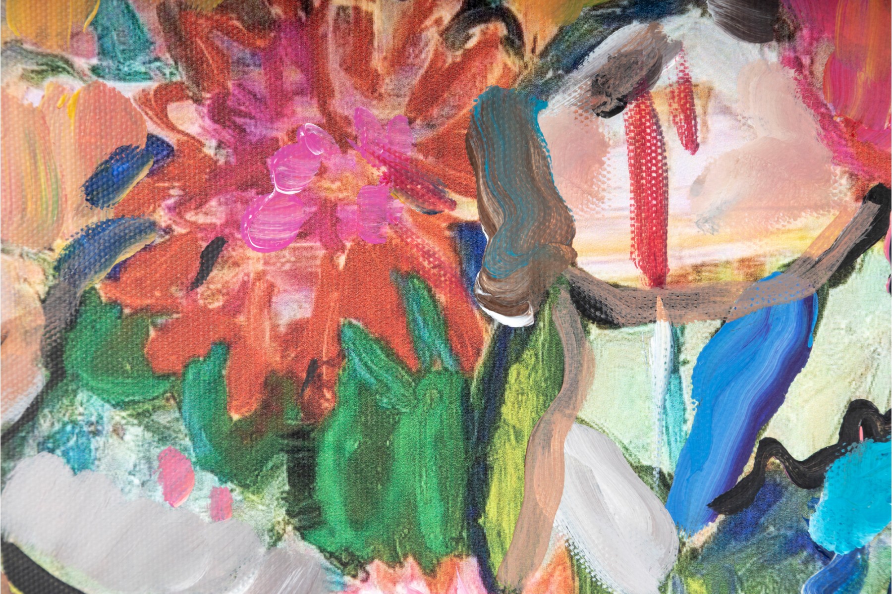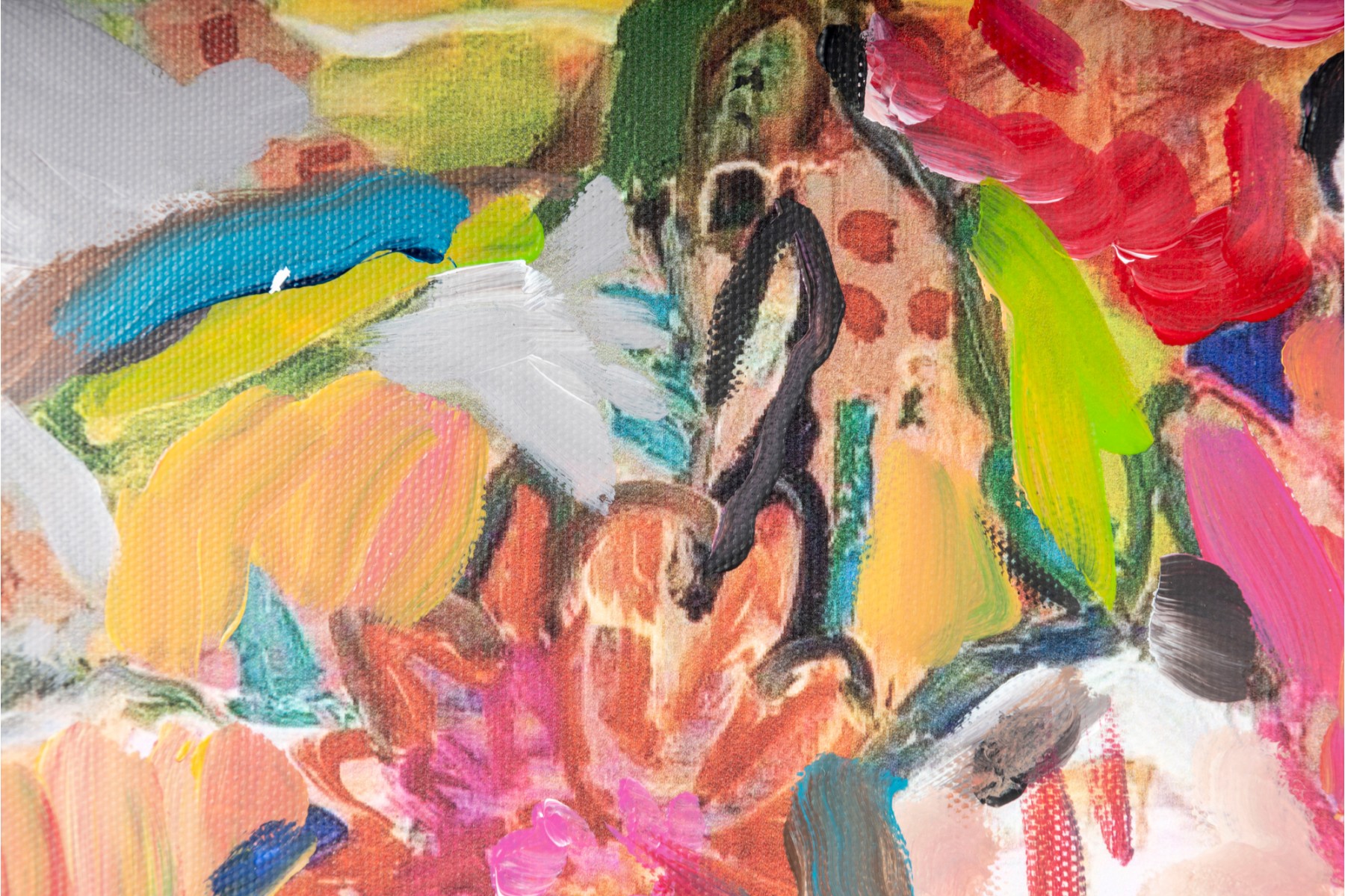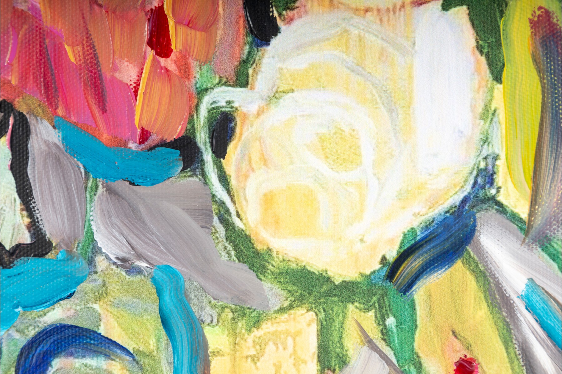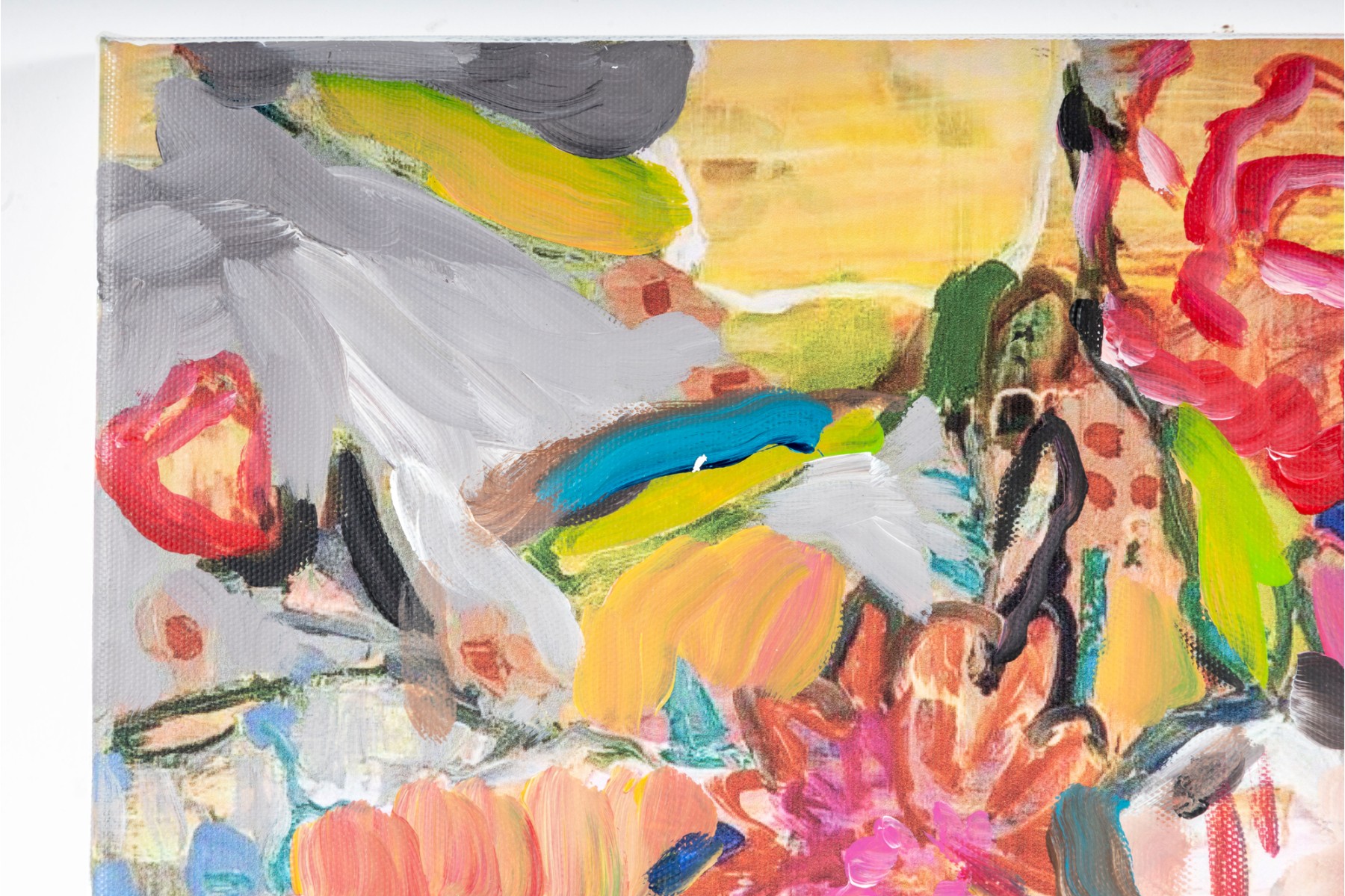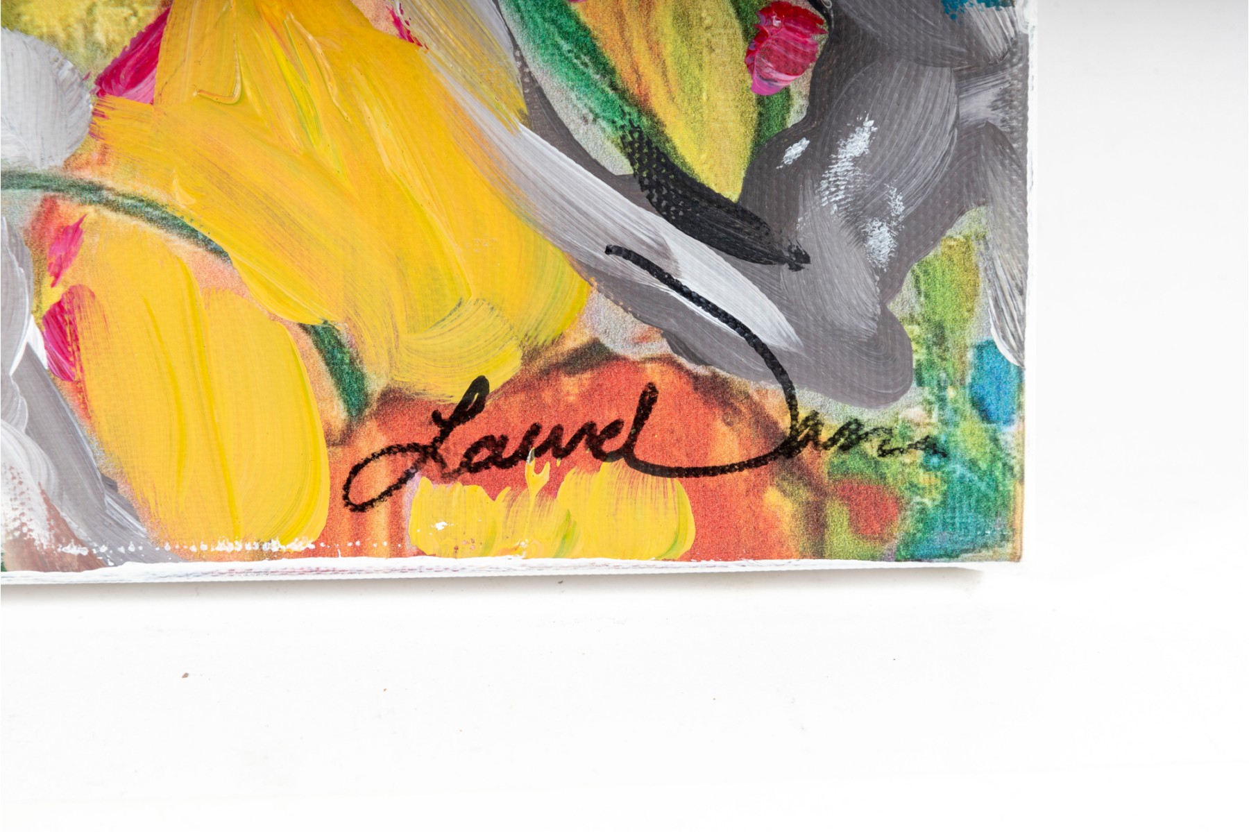 Laura Davis (American [NC], 20th C.) original acrylic on canvas painting entitled, "French Garden" showcasing a vibrant setting of flowers run thick with acrylic brush strokes. The piece is unframed, signed on canvas and en verso.