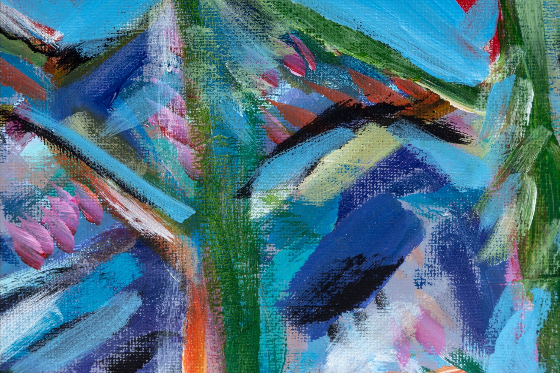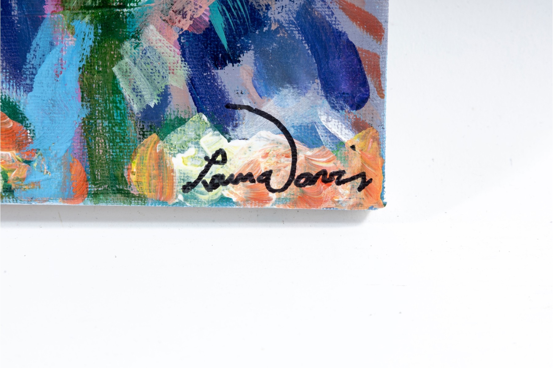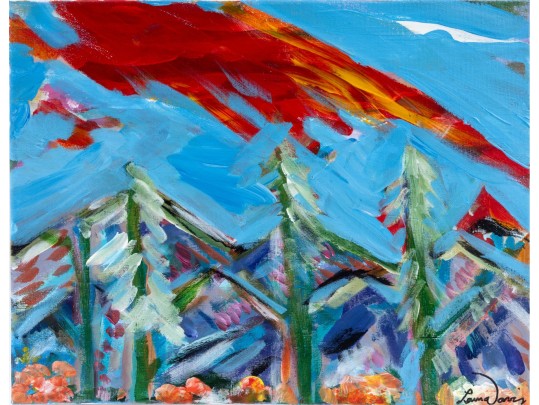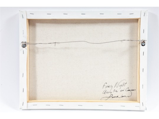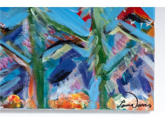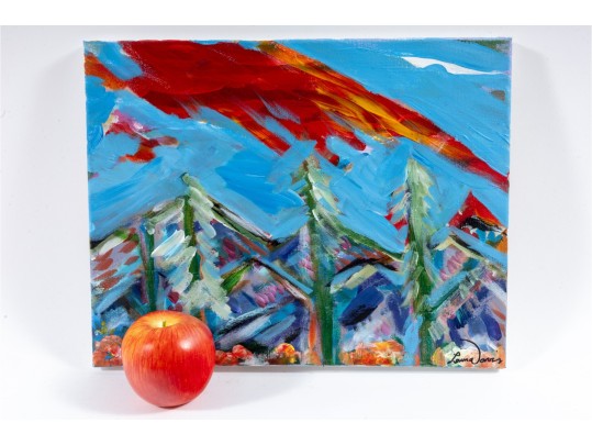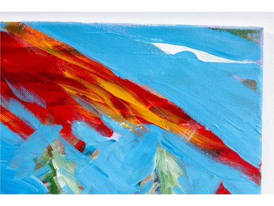 Laura Davis (American [NC], 21st C.) acrylic on canvas landscape painting entitled, "Fiery Night" which displays a mountainous landscape composed of polychrome brush strokes. Signed in lower right and en verso. Laura Davis' works have been showcased in galleries nationwide and abroad.