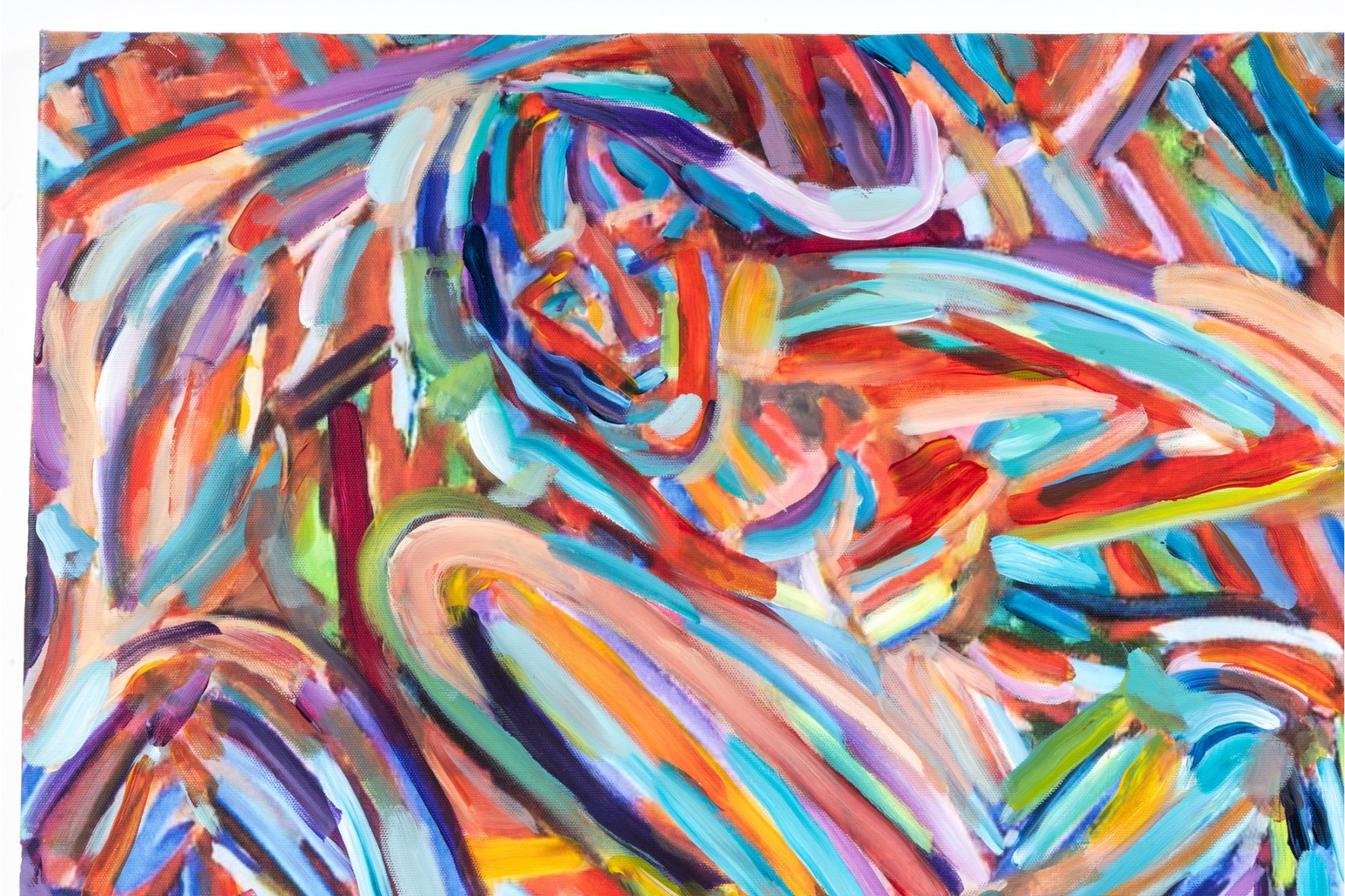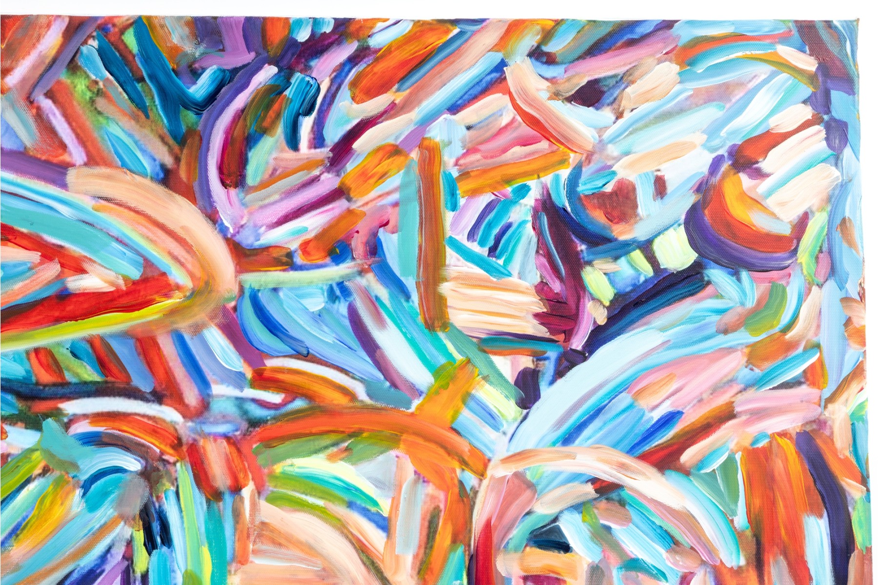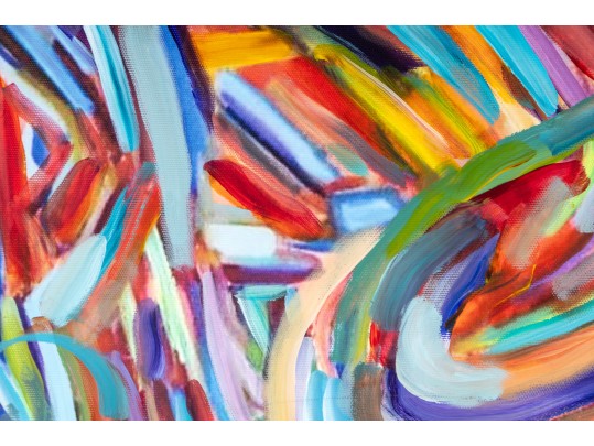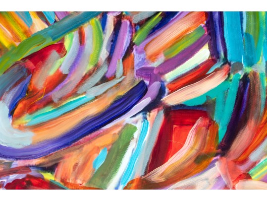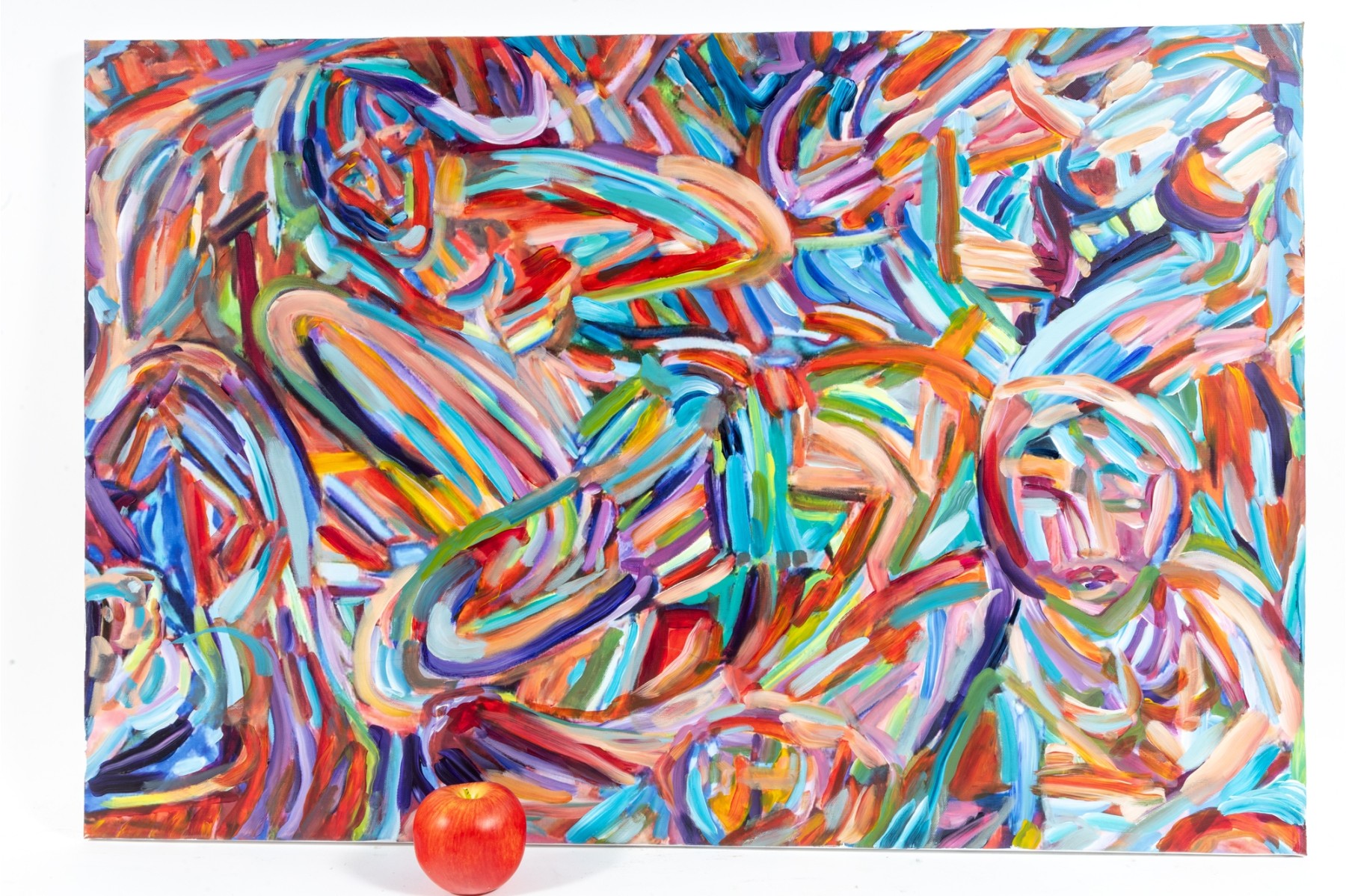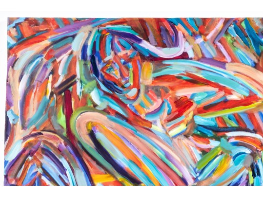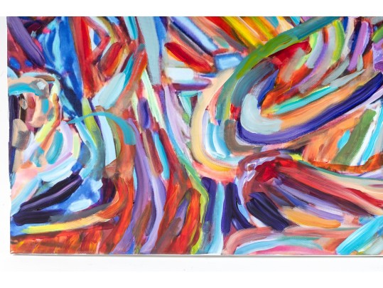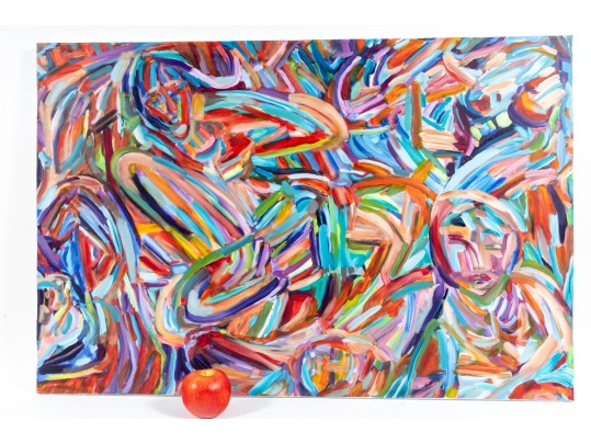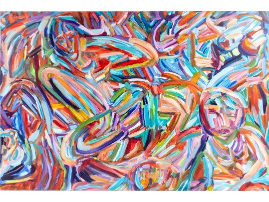 A beautiful composition of colors encapsulating vague forms and abstract figures -- bodies, faces, all in vibrant tones of acrylic. Titled, "Kiss Kiss" by local North Carolina artist Laura Davis, whom's works have been showcased in galleries nationwide and abroad. The painting is presented unframed on stretched canvas, ready to hang.