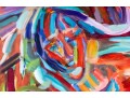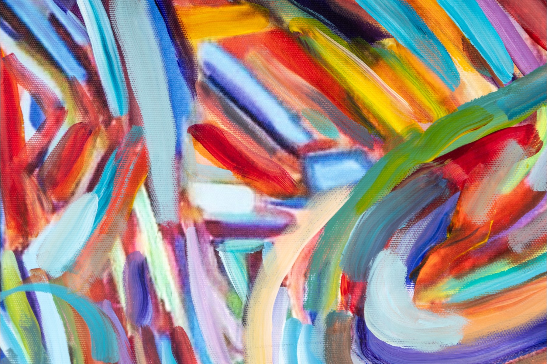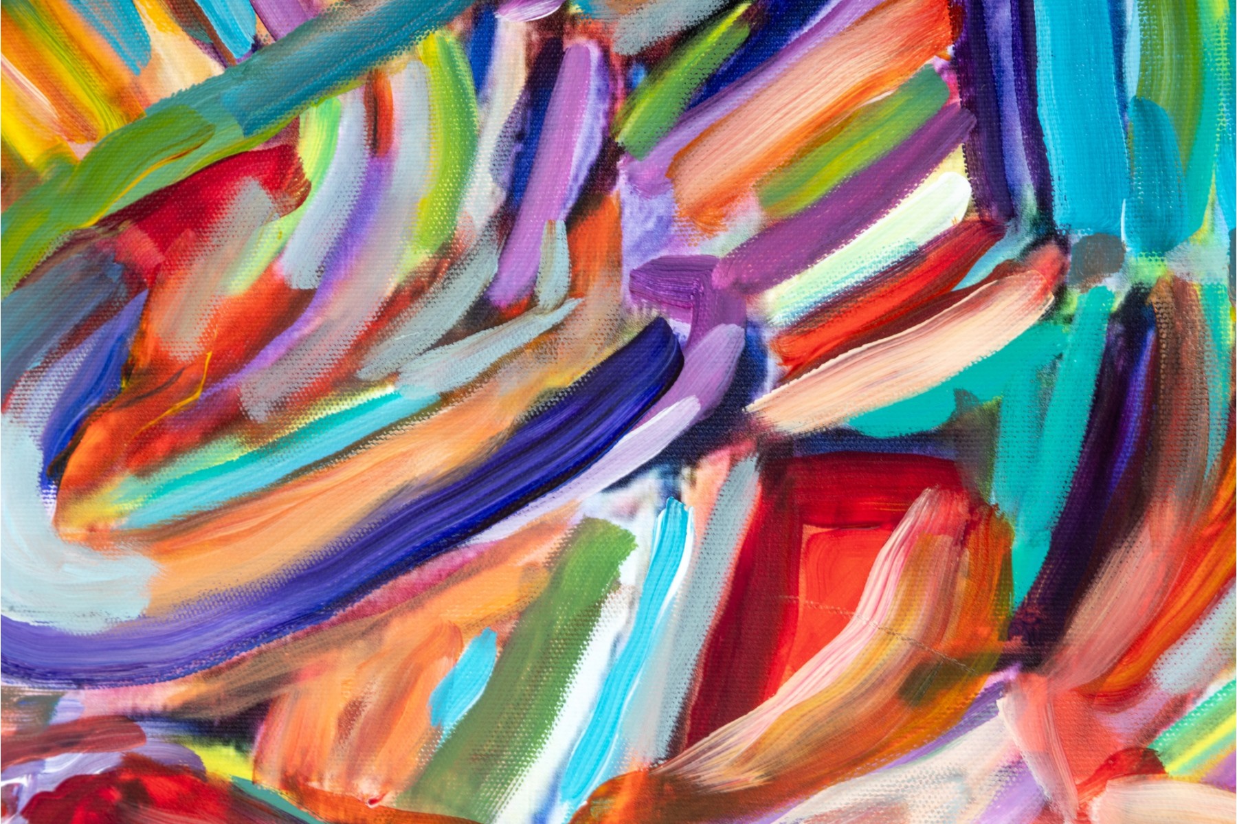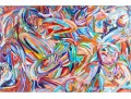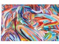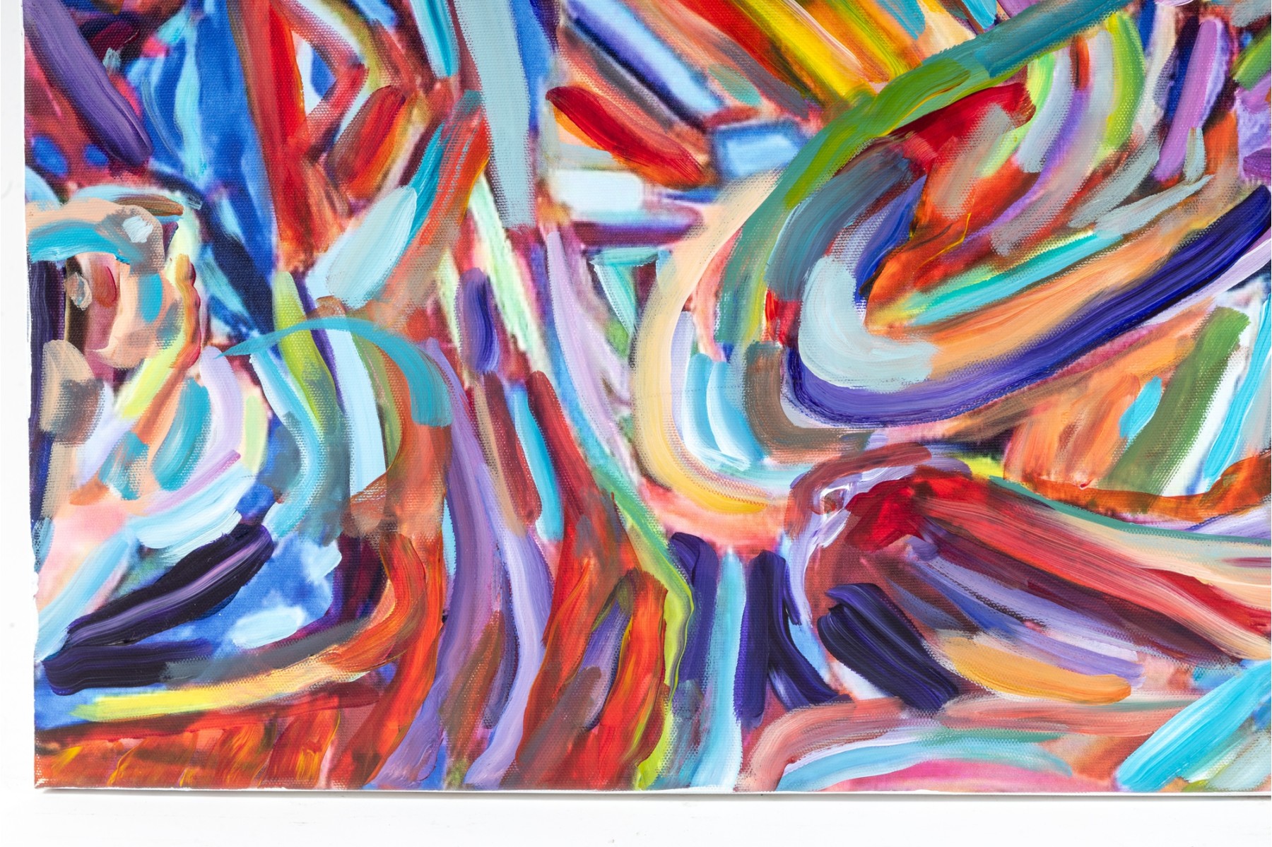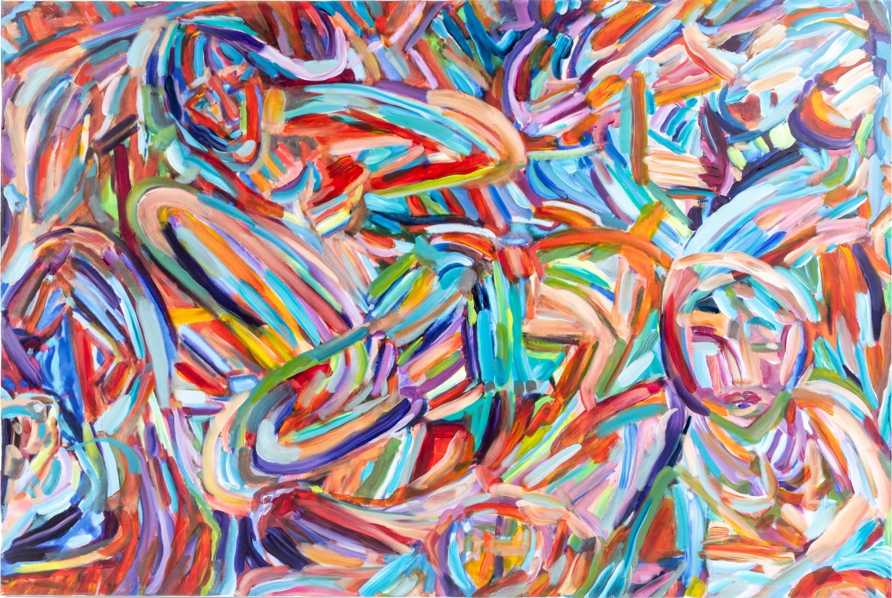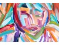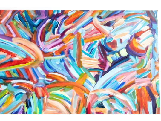 A beautiful composition of colors encapsulating vague forms and abstract figures -- bodies, faces, all in vibrant tones of acrylic. Titled, "Kiss Kiss" by local North Carolina artist Laura Davis, whom's works have been showcased in galleries nationwide and abroad. The painting is presented unframed on stretched canvas, ready to hang.