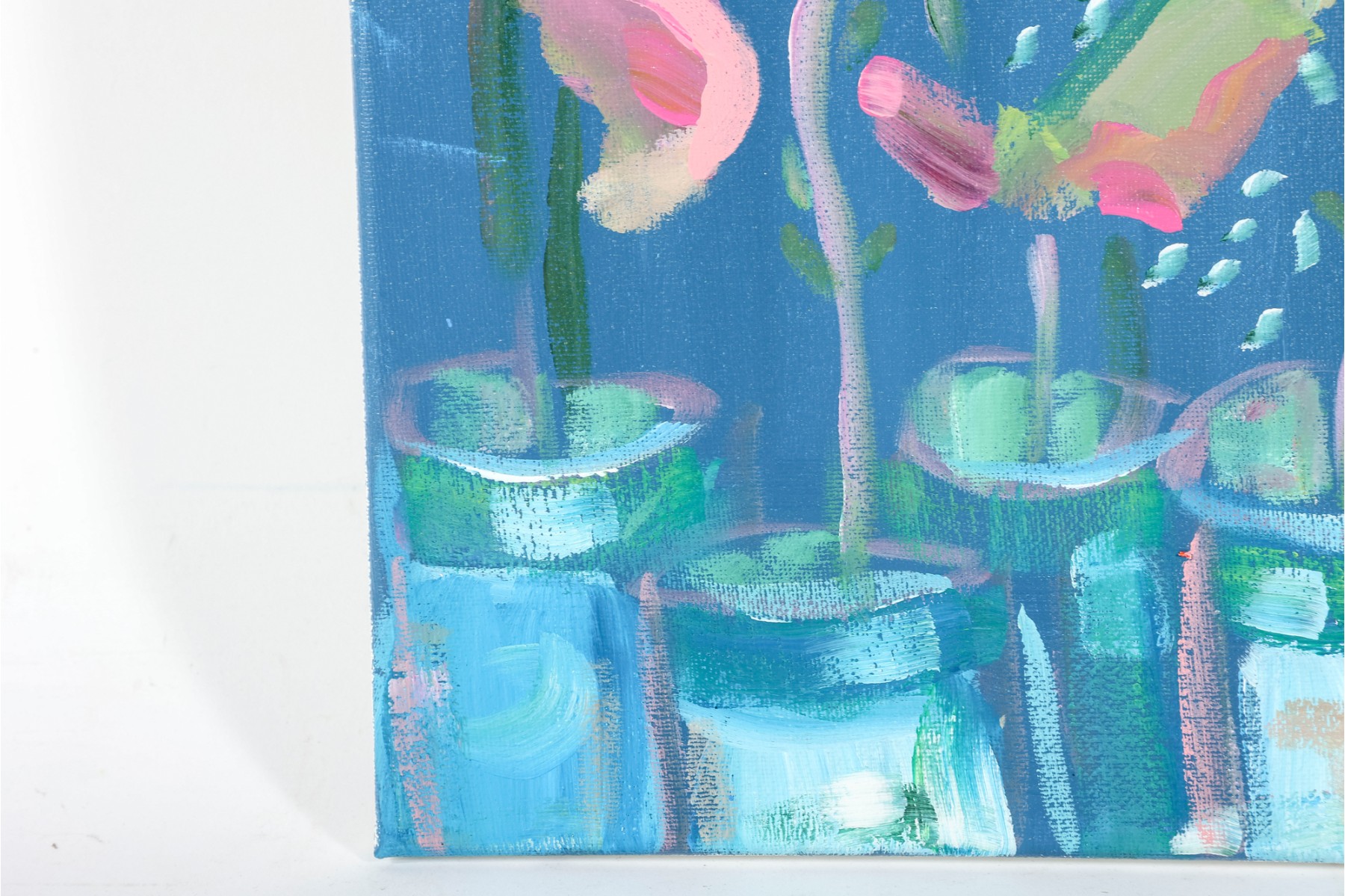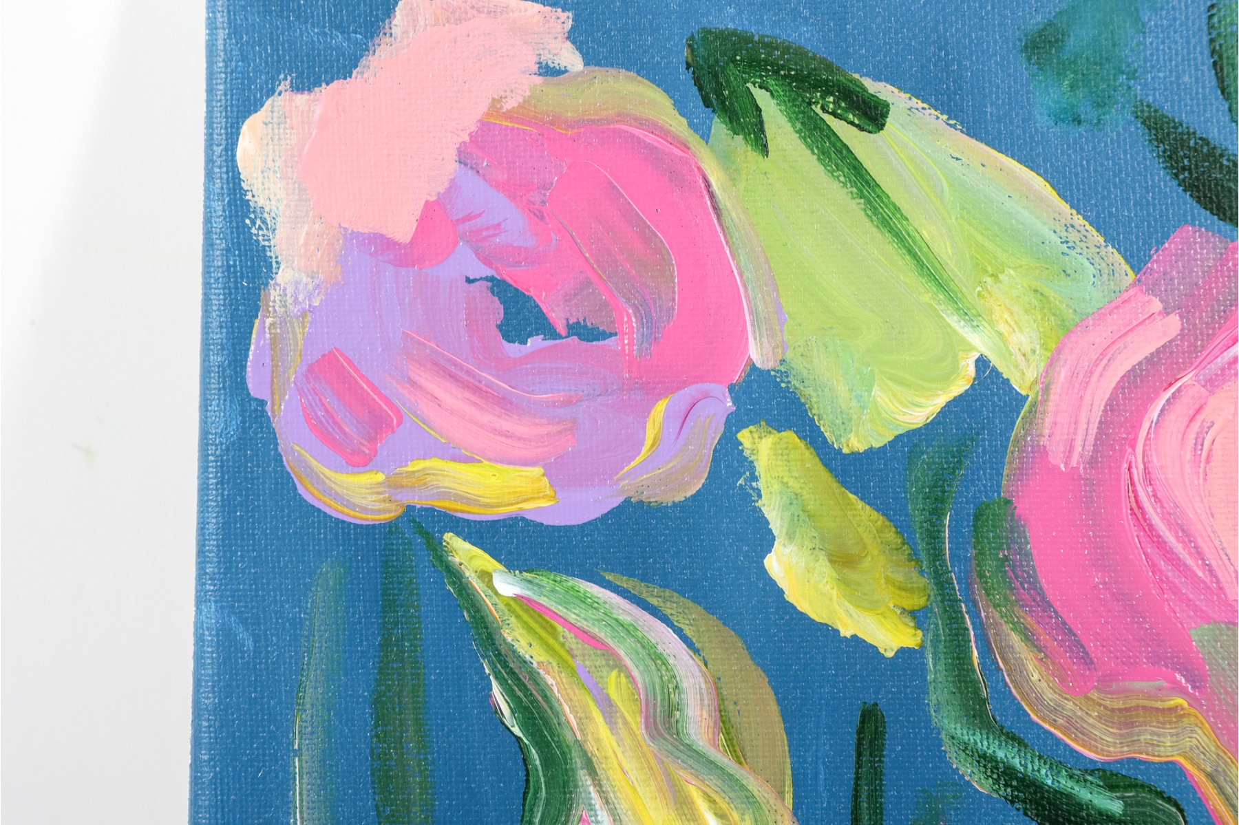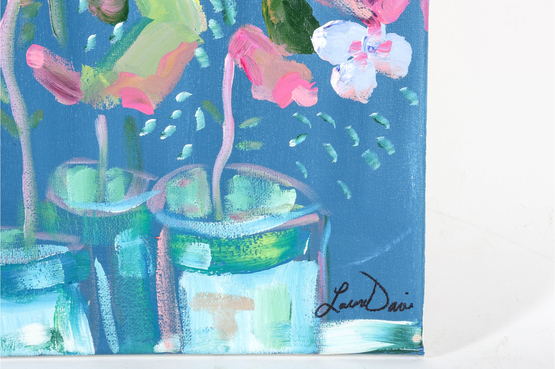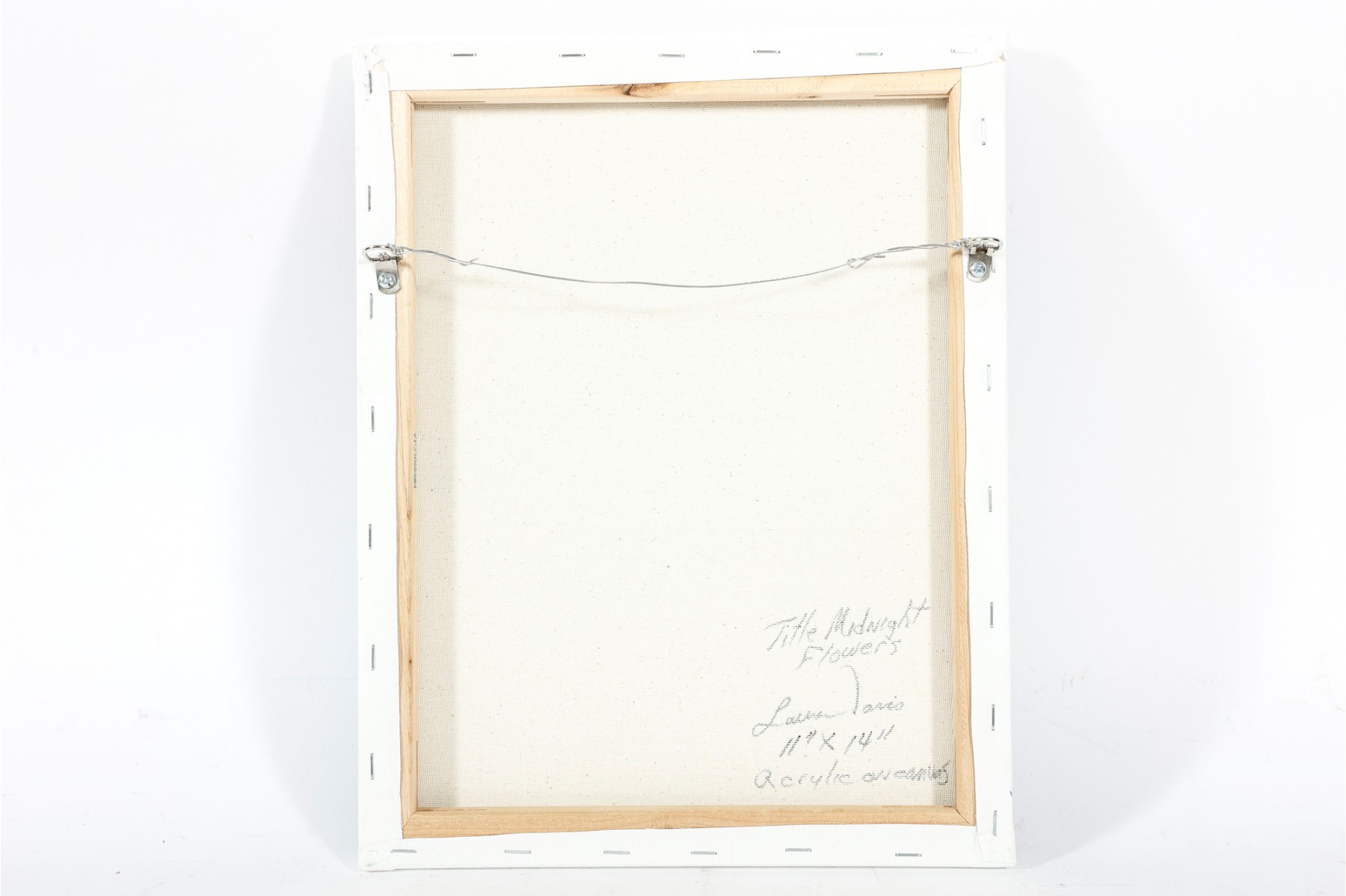A small acrylic on stretched canvas painting entitled, "Midnight Flowers" by local artist Laura Davis (American [NC], 21st C.). The artwork depicts a vibrant polychrome still-life of flowers with a background in navy. Signed on bottom right corner & en verso in ink. Unframed.
