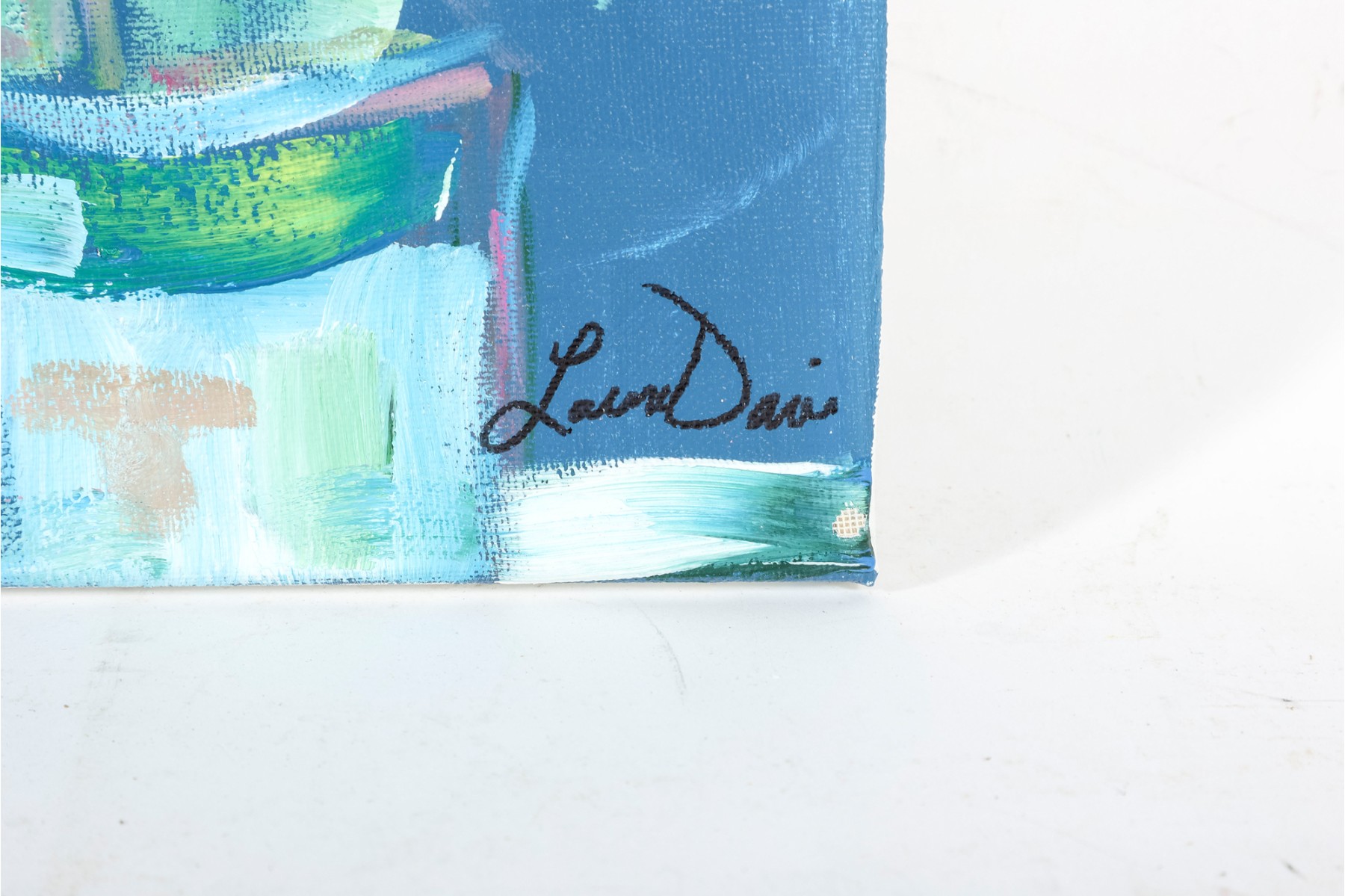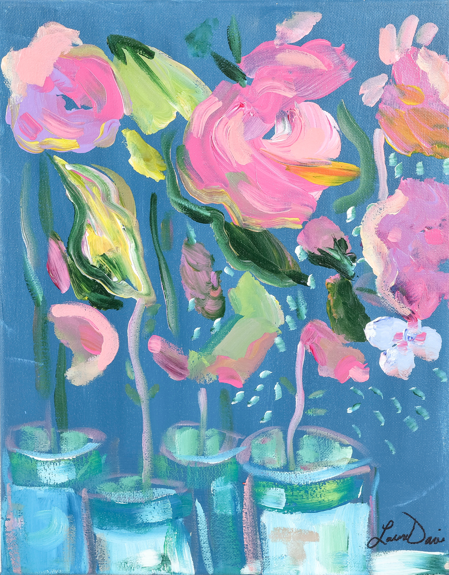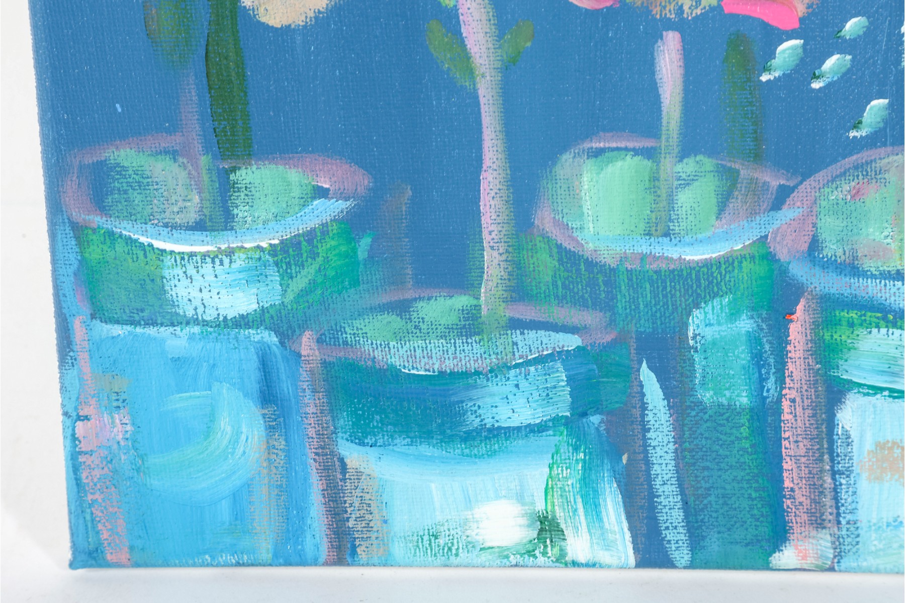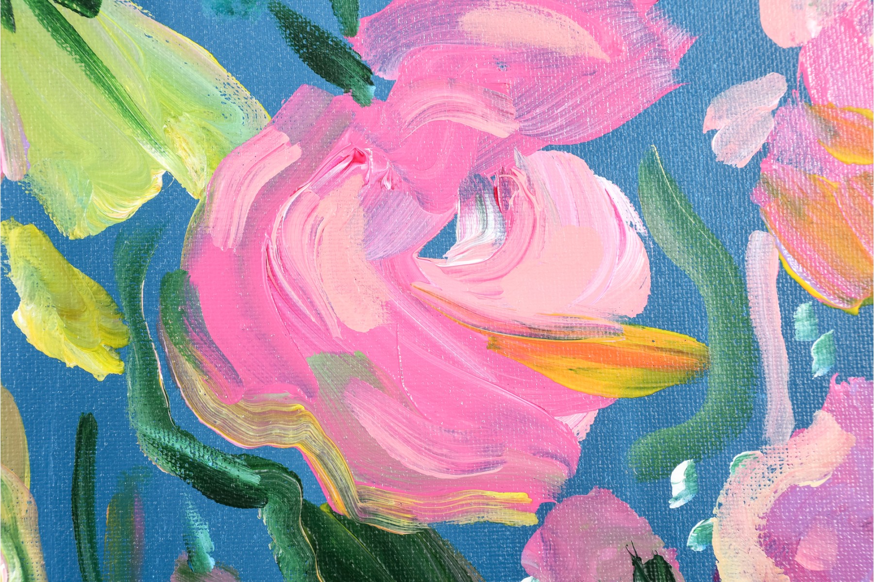 A small acrylic on stretched canvas painting entitled, "Midnight Flowers" by local artist Laura Davis (American [NC], 21st C.). The artwork depicts a vibrant polychrome still-life of flowers with a background in navy. Signed on bottom right corner & en verso in ink. Unframed.