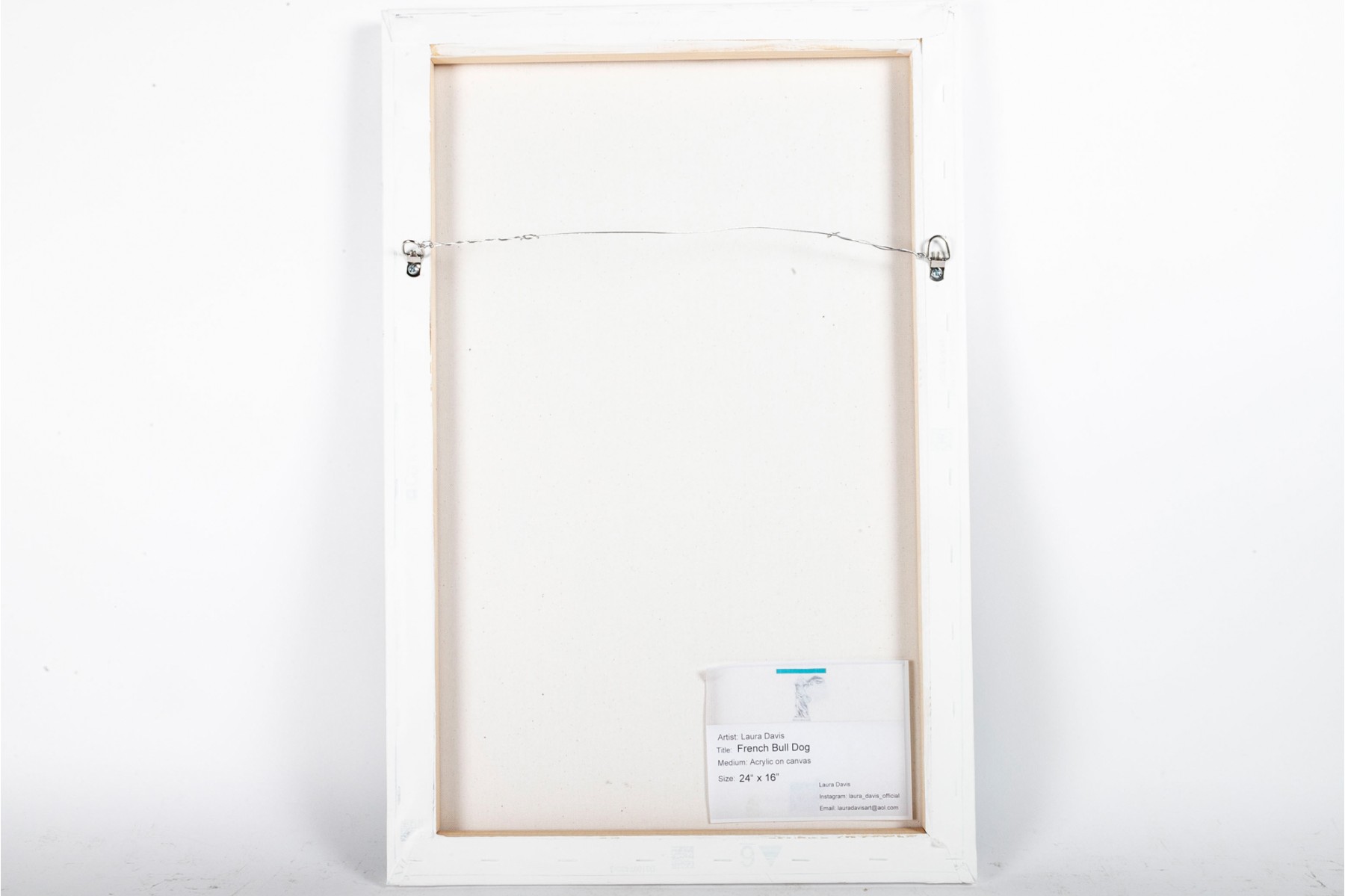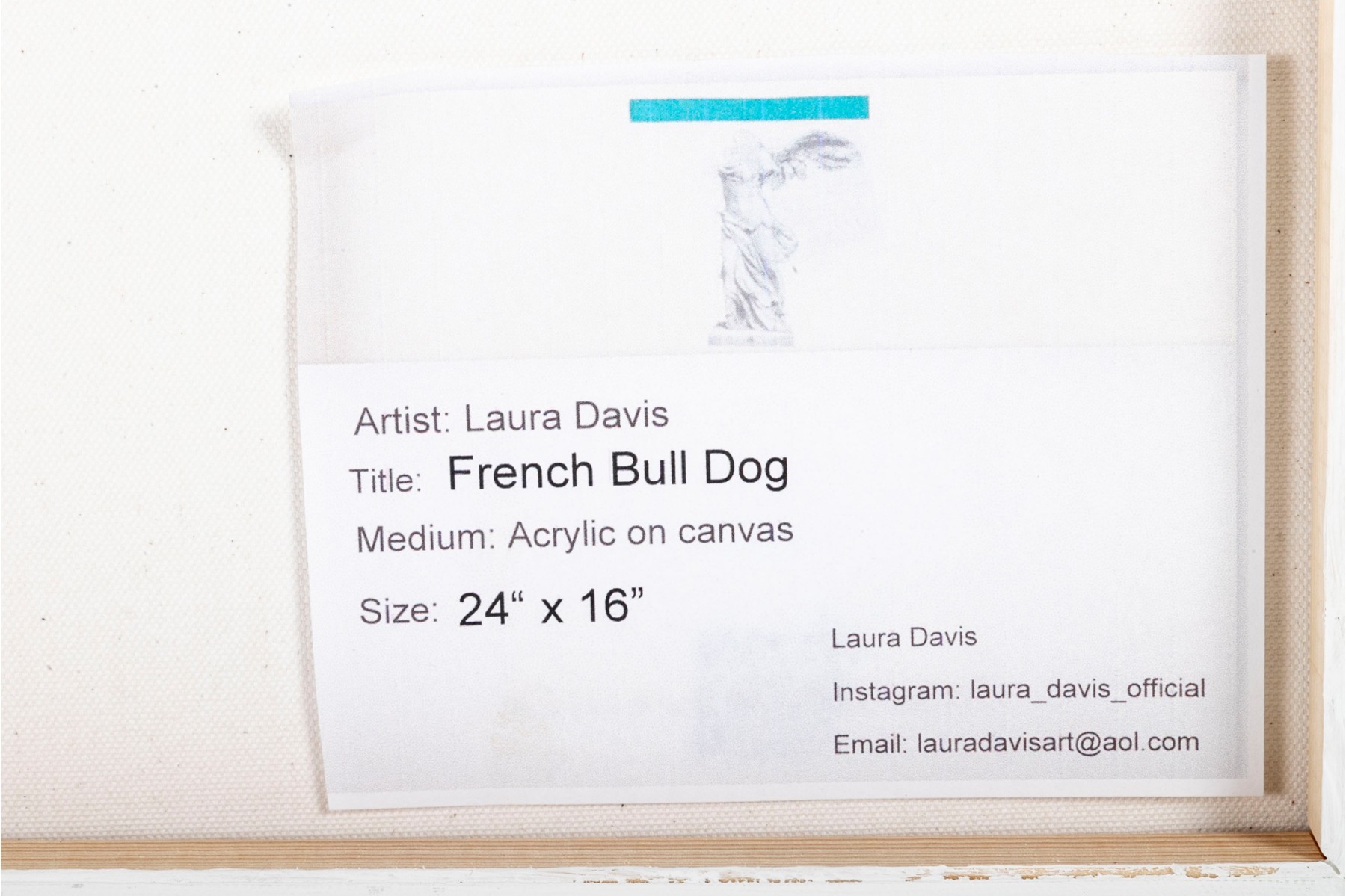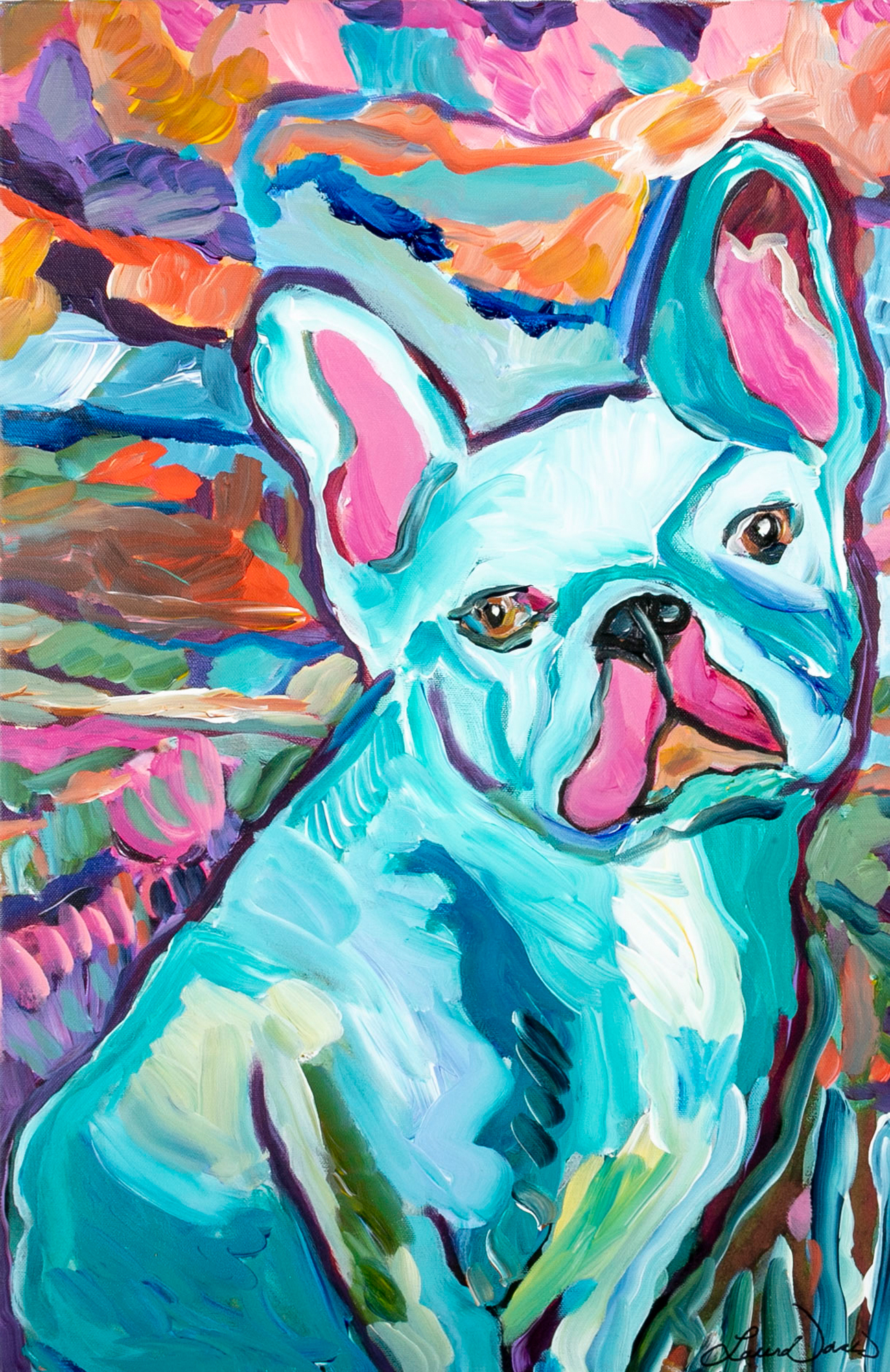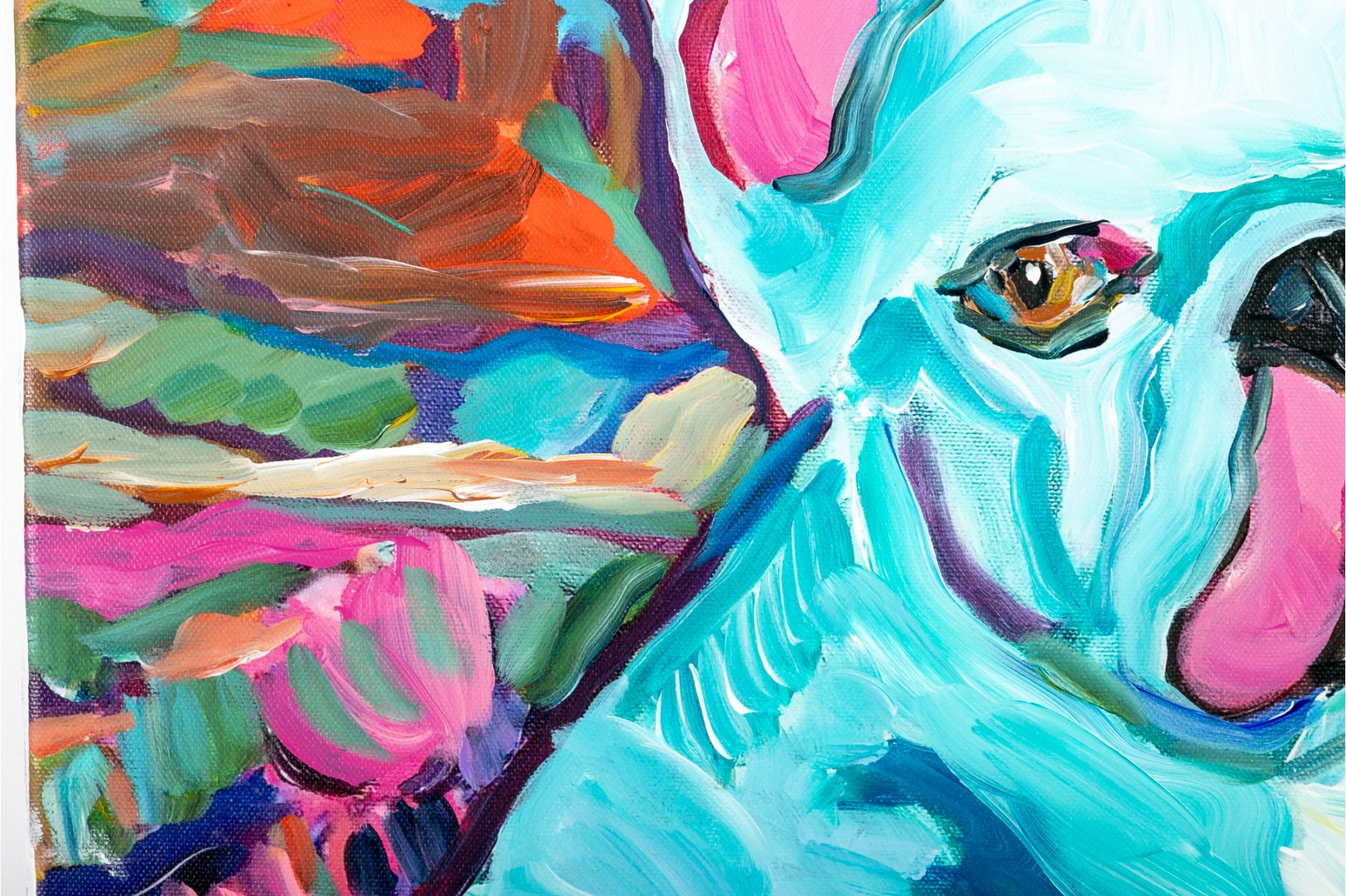 Laura Davis (American [NC], b. 1954) "French Bull Dog" acrylic on canvas depicting a cute aqua-blue dot with big pink ears standing against a gestural and vibrant background of staccato pink, orange, blue, and purple. Signed lower right, with a leaflet affixed to the back providing additional information. The canvas is mounted to a stretcher, unframed.
