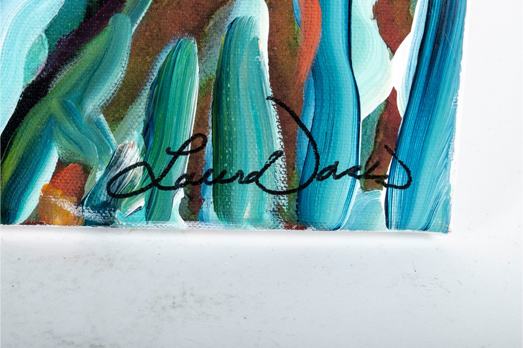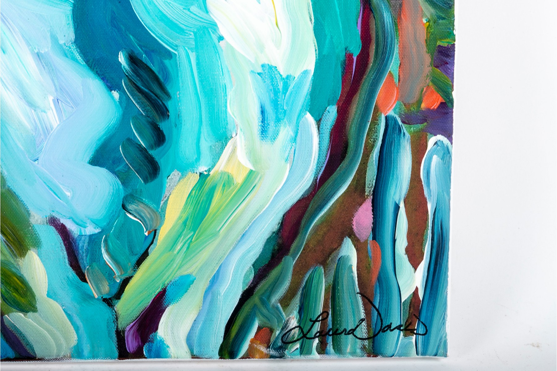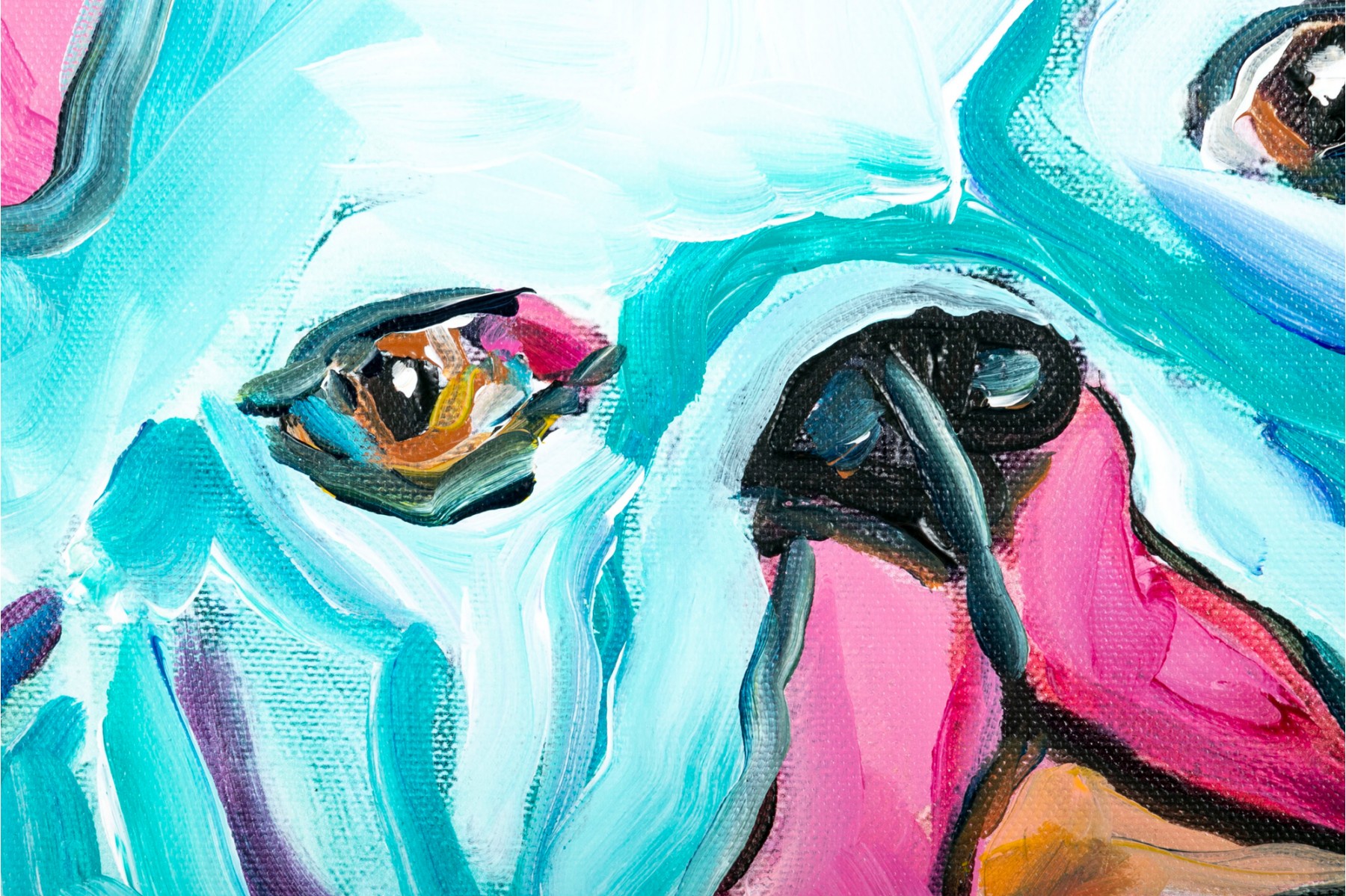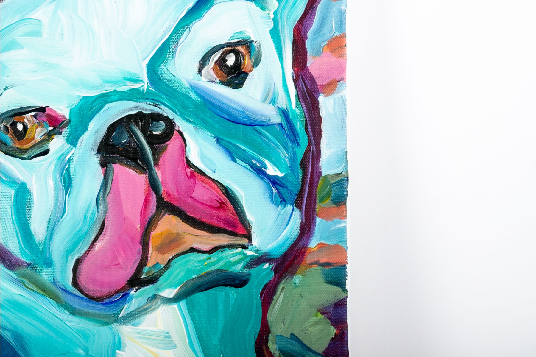 Laura Davis (American [NC], b. 1954) "French Bull Dog" acrylic on canvas depicting a cute aqua-blue dot with big pink ears standing against a gestural and vibrant background of staccato pink, orange, blue, and purple. Signed lower right, with a leaflet affixed to the back providing additional information. The canvas is mounted to a stretcher, unframed.