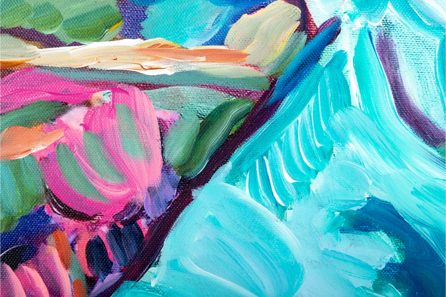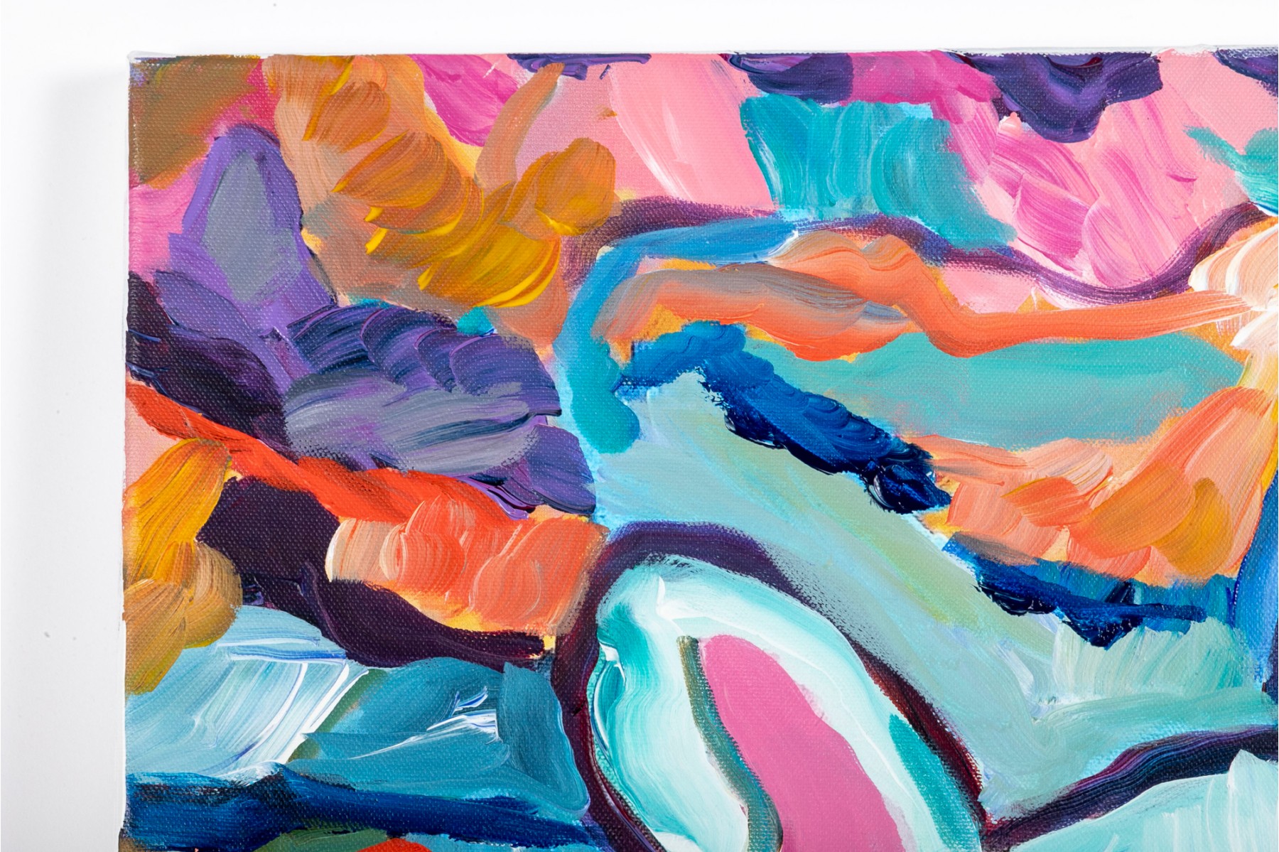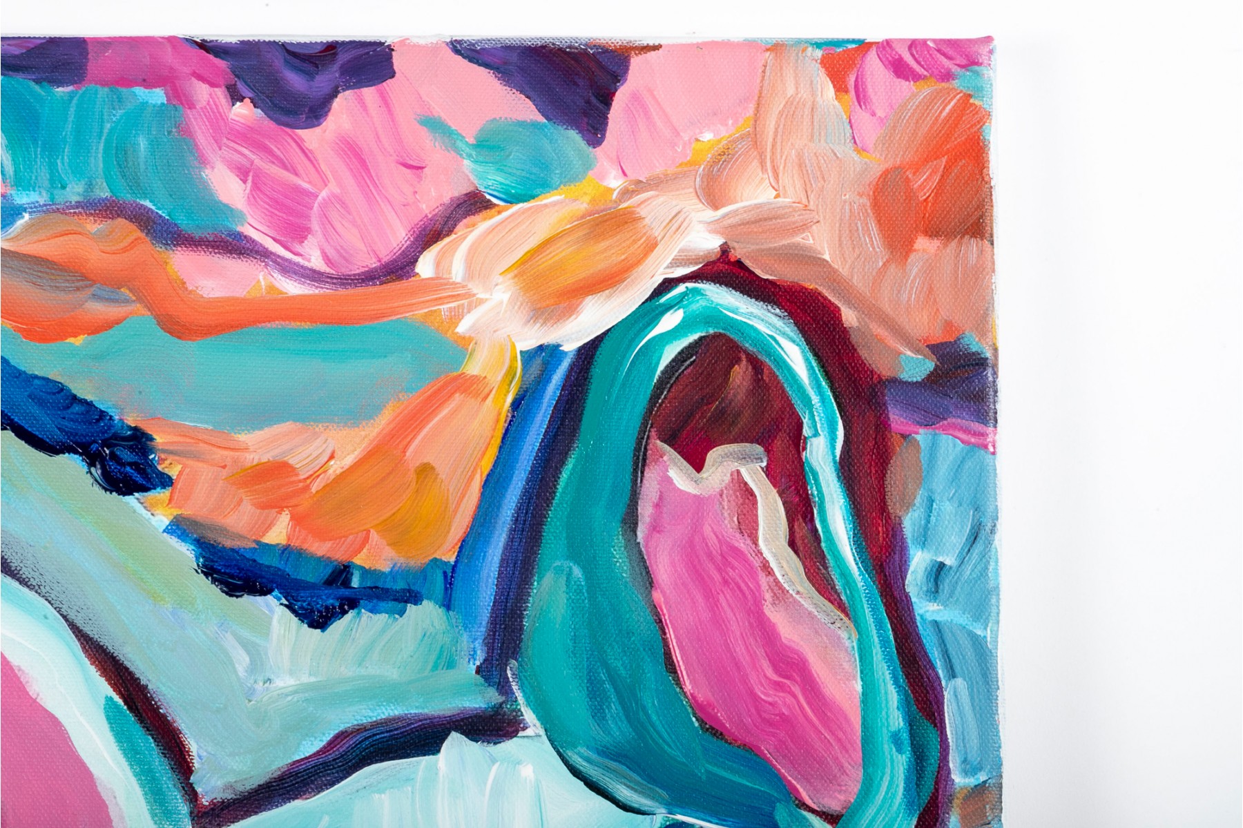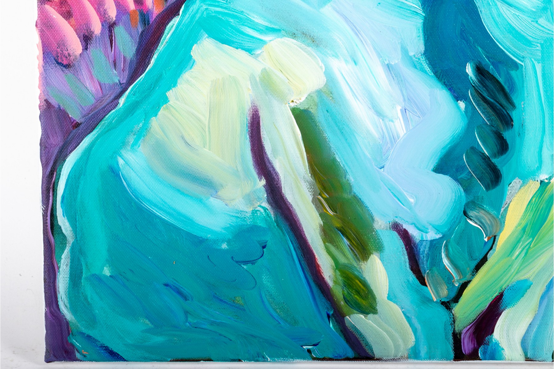 Laura Davis (American [NC], b. 1954) "French Bull Dog" acrylic on canvas depicting a cute aqua-blue dot with big pink ears standing against a gestural and vibrant background of staccato pink, orange, blue, and purple. Signed lower right, with a leaflet affixed to the back providing additional information. The canvas is mounted to a stretcher, unframed.