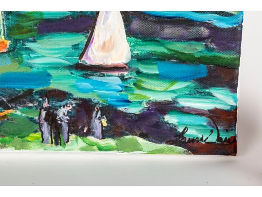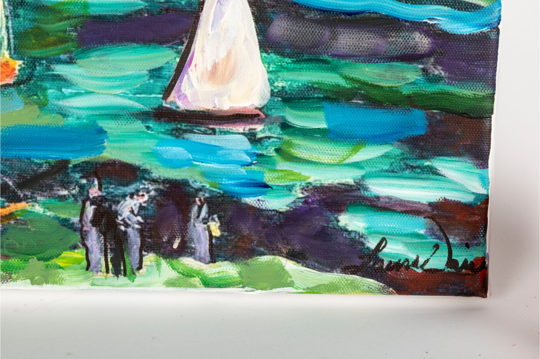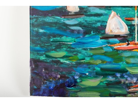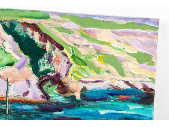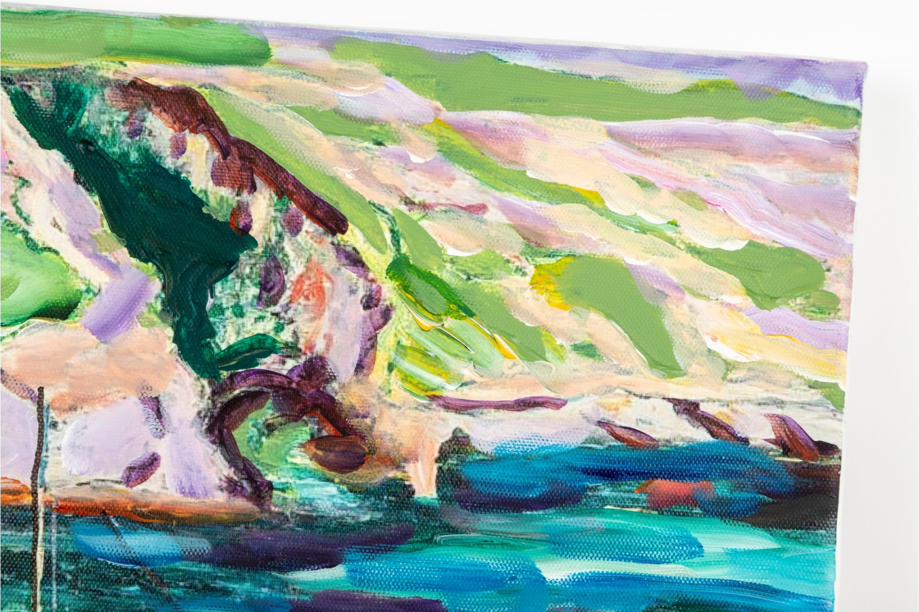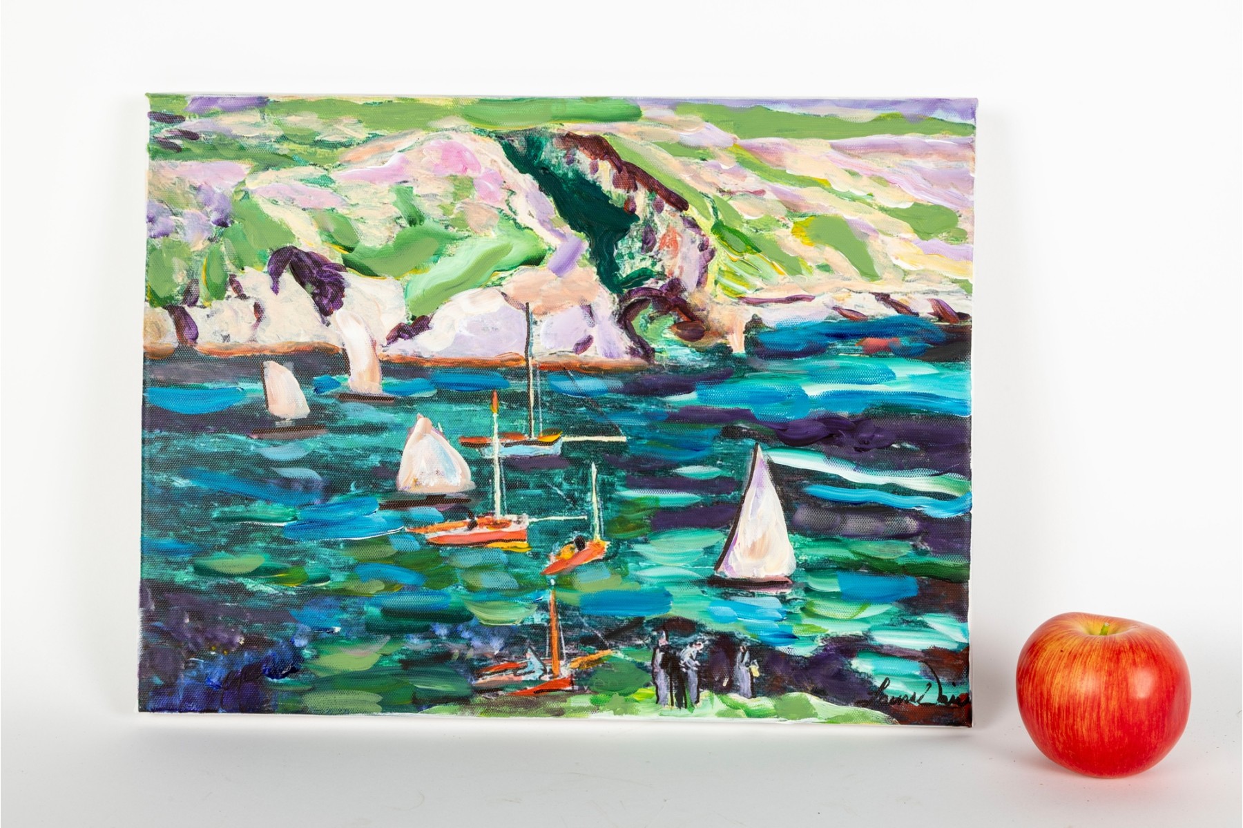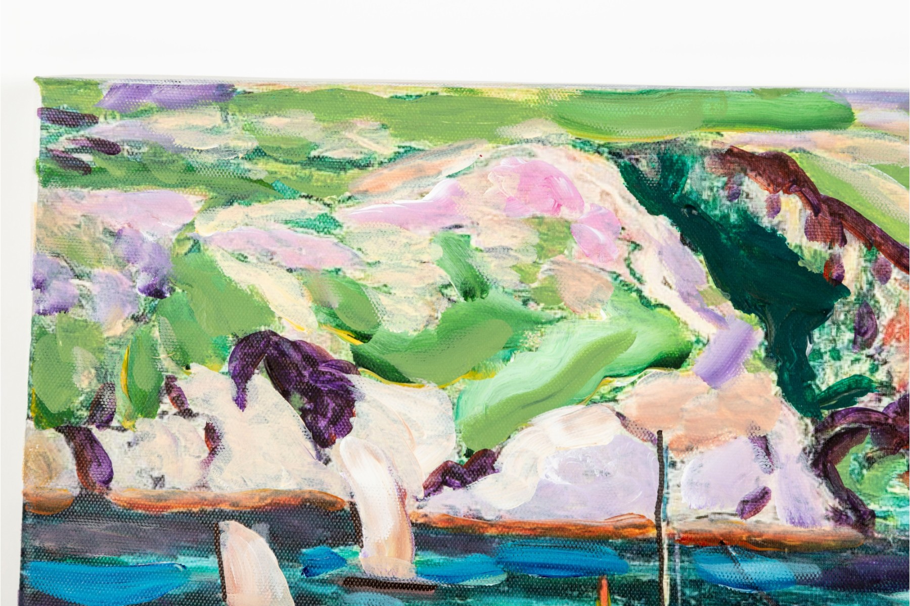 Laura Davis (American [NC], b. 1954) "Fine Art Painting: à Port Goulphar Belle Ile En Mer After Maxime Maufra Bateaux" acrylic painting on canvas depicting a vibrant impressionist scene of boats on colorful green, blue, and purple water along a green, pink, and yellow hill. Signed lower right and affixed with a label to the verso with additional information. The canvas is mounted to a stretcher, unframed.