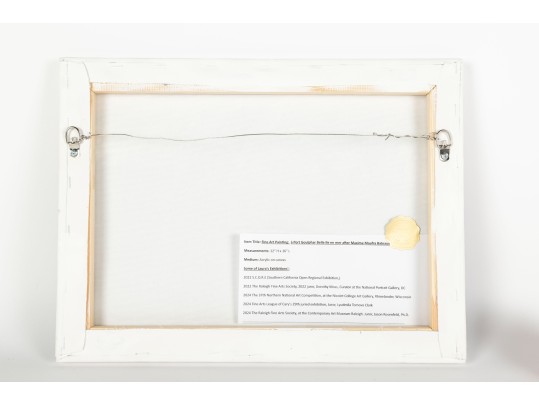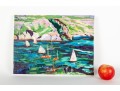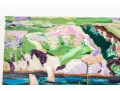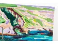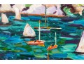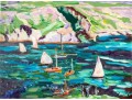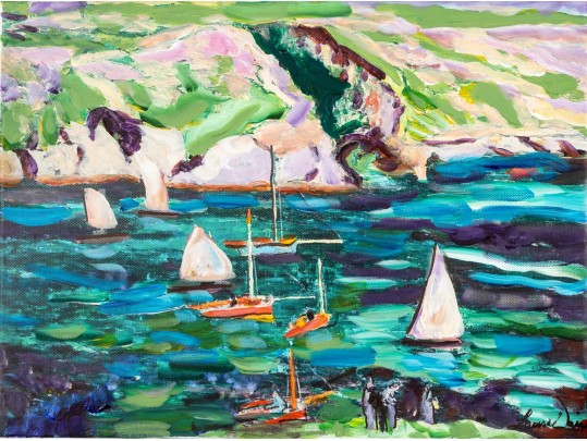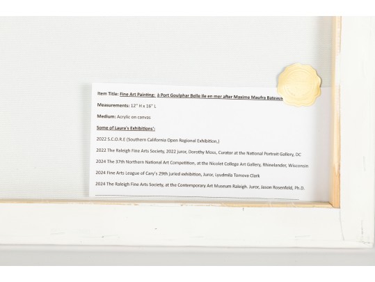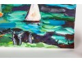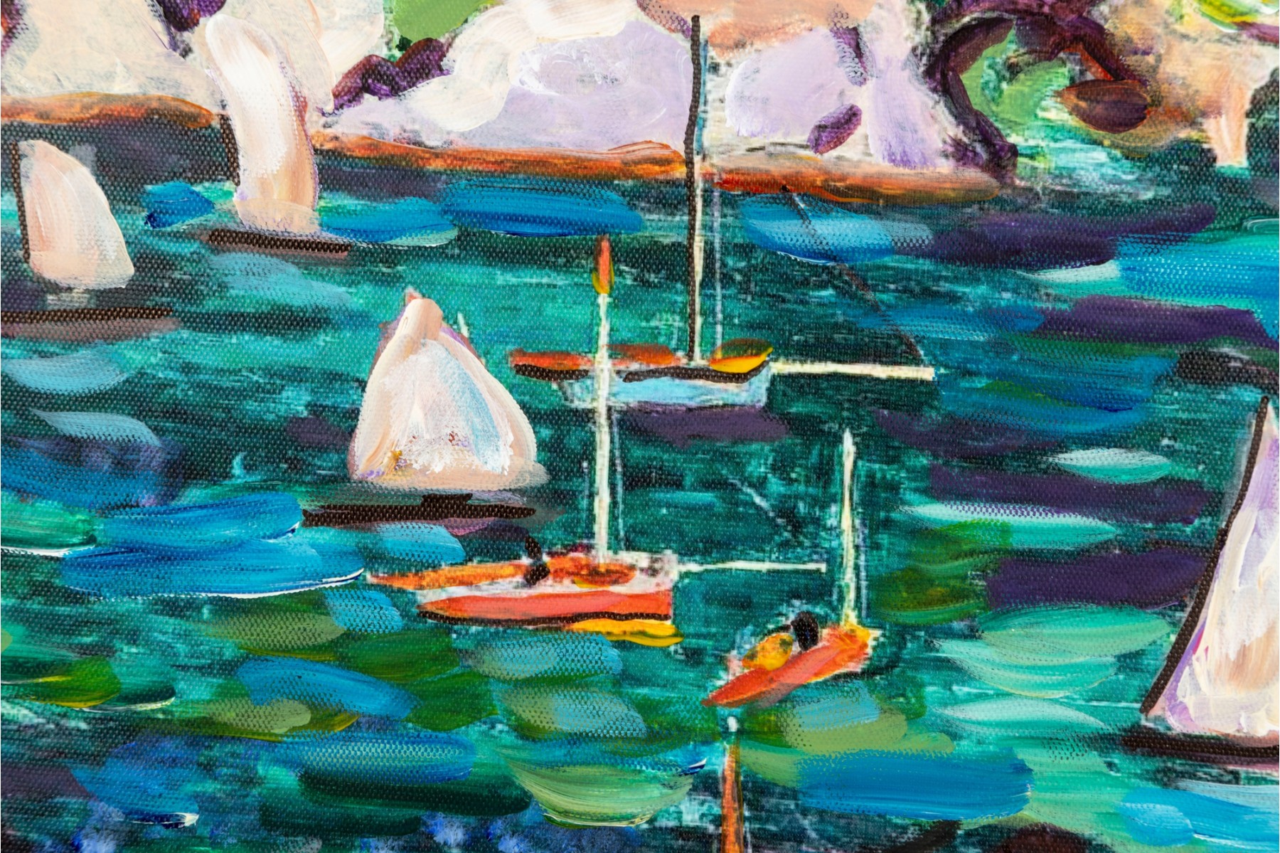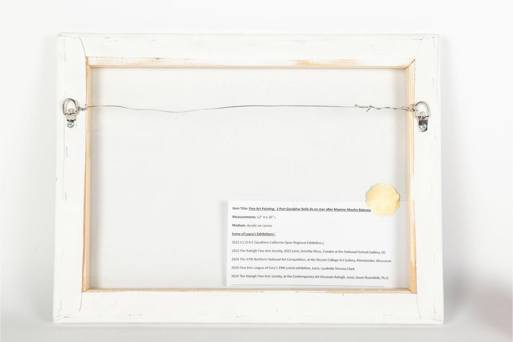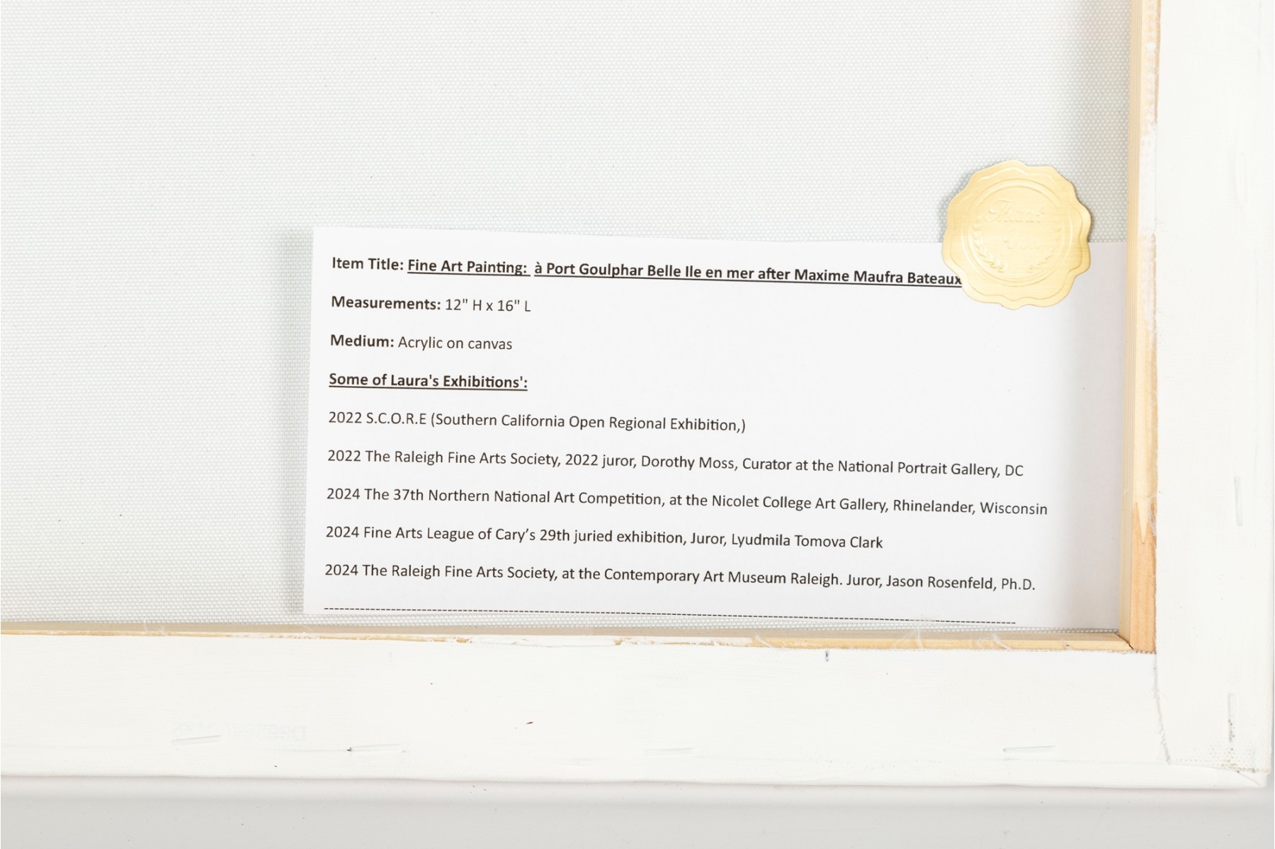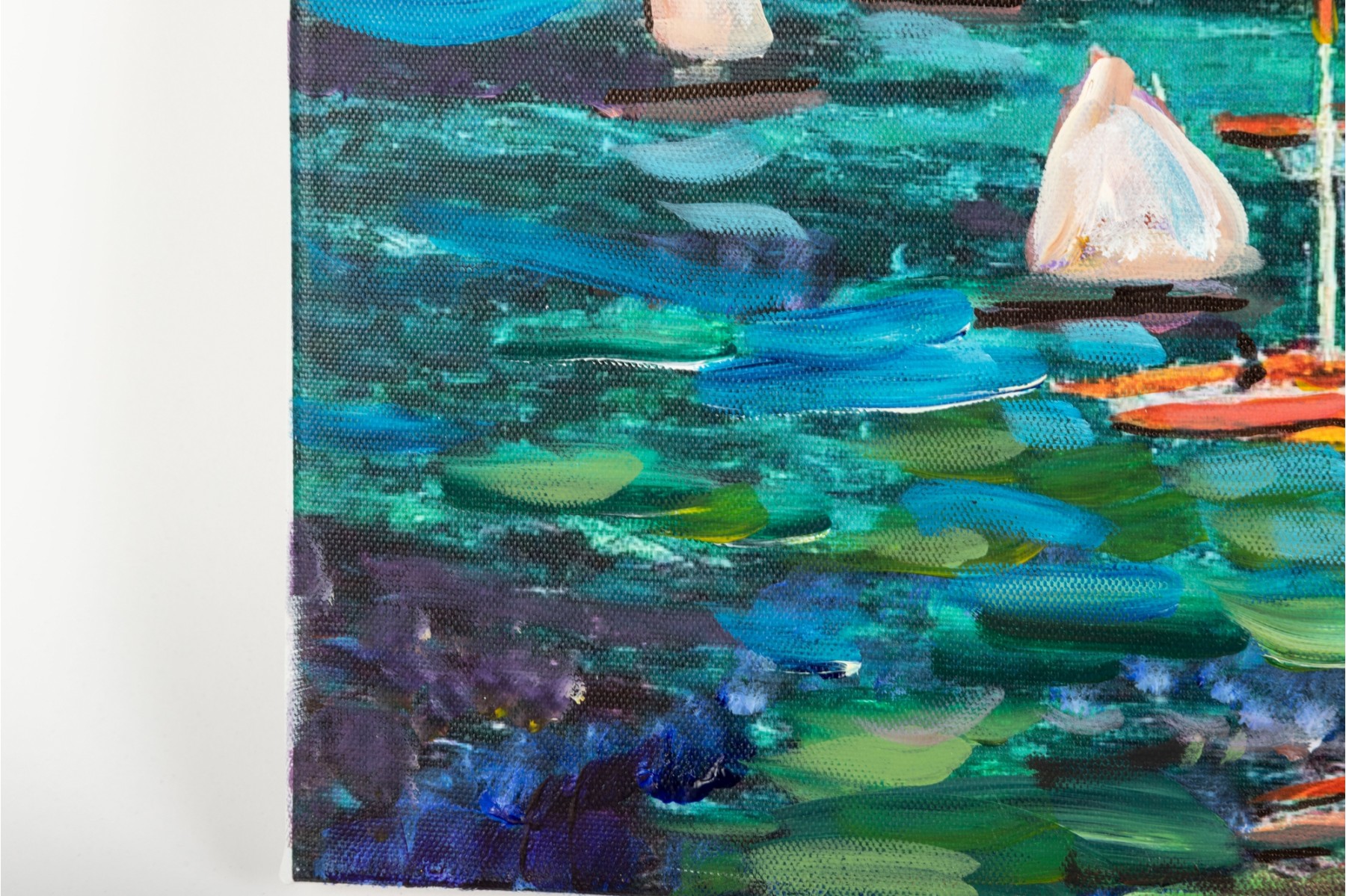 Laura Davis (American [NC], b. 1954) "Fine Art Painting: à Port Goulphar Belle Ile En Mer After Maxime Maufra Bateaux" acrylic painting on canvas depicting a vibrant impressionist scene of boats on colorful green, blue, and purple water along a green, pink, and yellow hill. Signed lower right and affixed with a label to the verso with additional information. The canvas is mounted to a stretcher, unframed.
