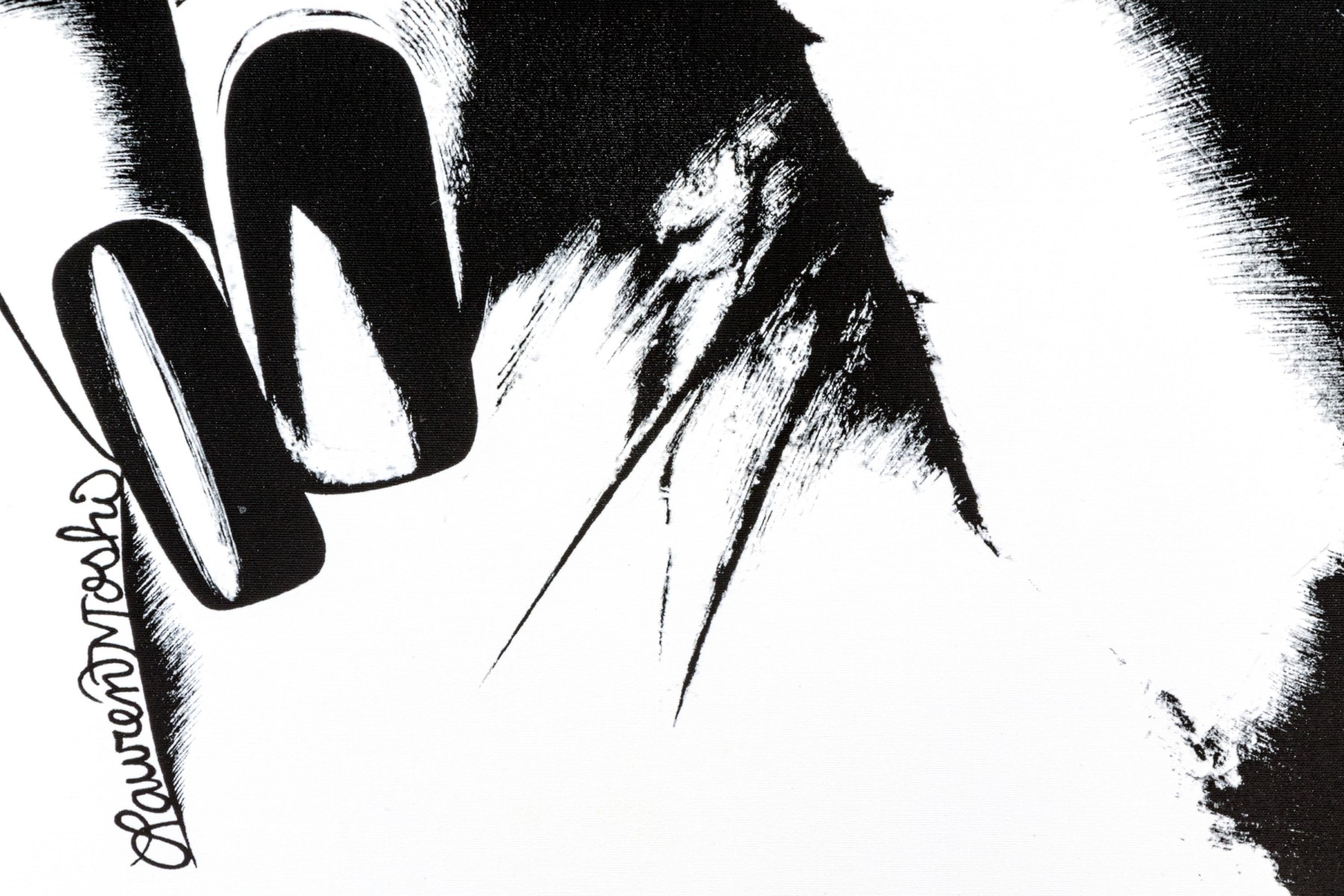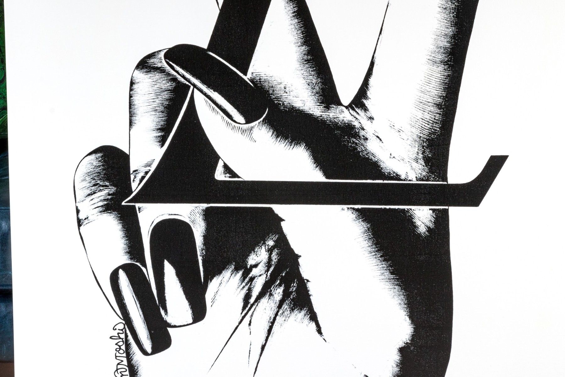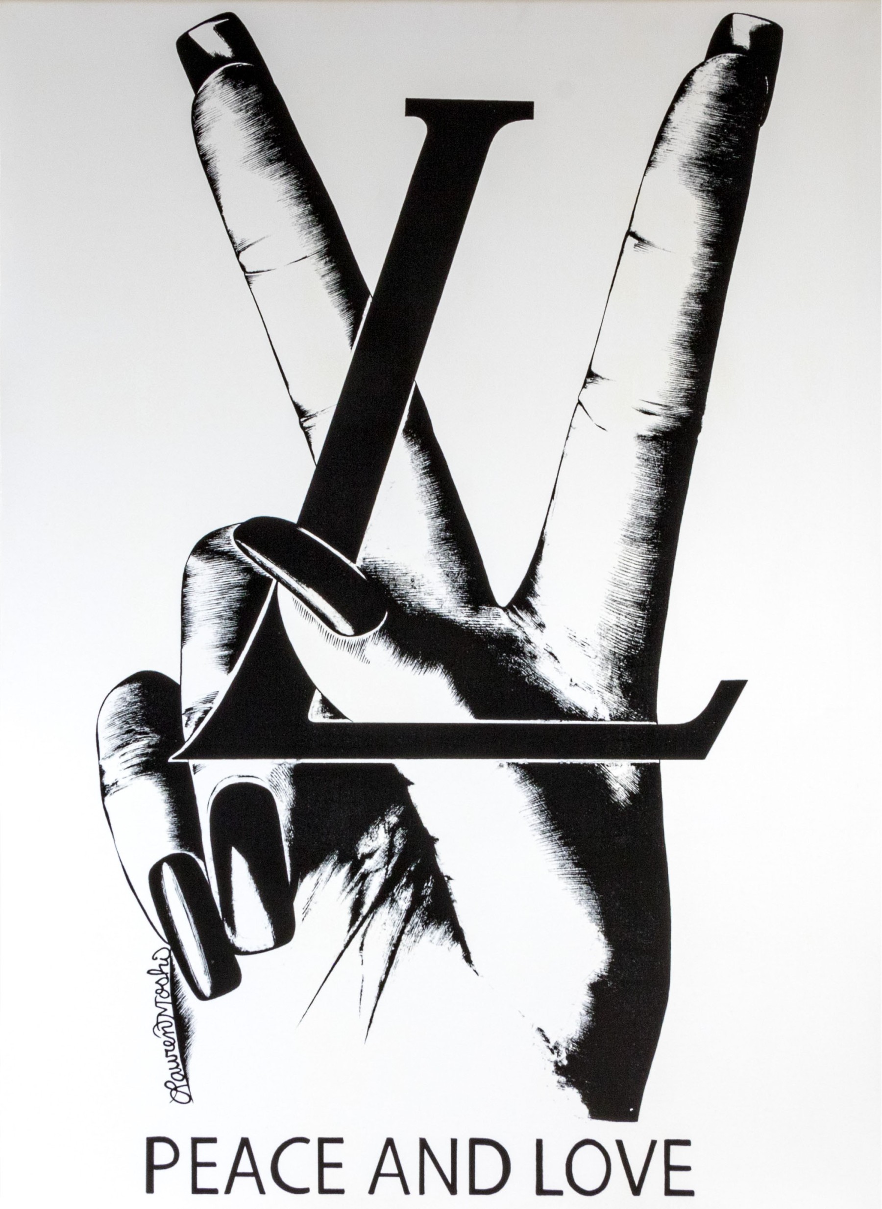 Painted in black and white with decorative peace sign and a stylized "L" between the hands fingers.