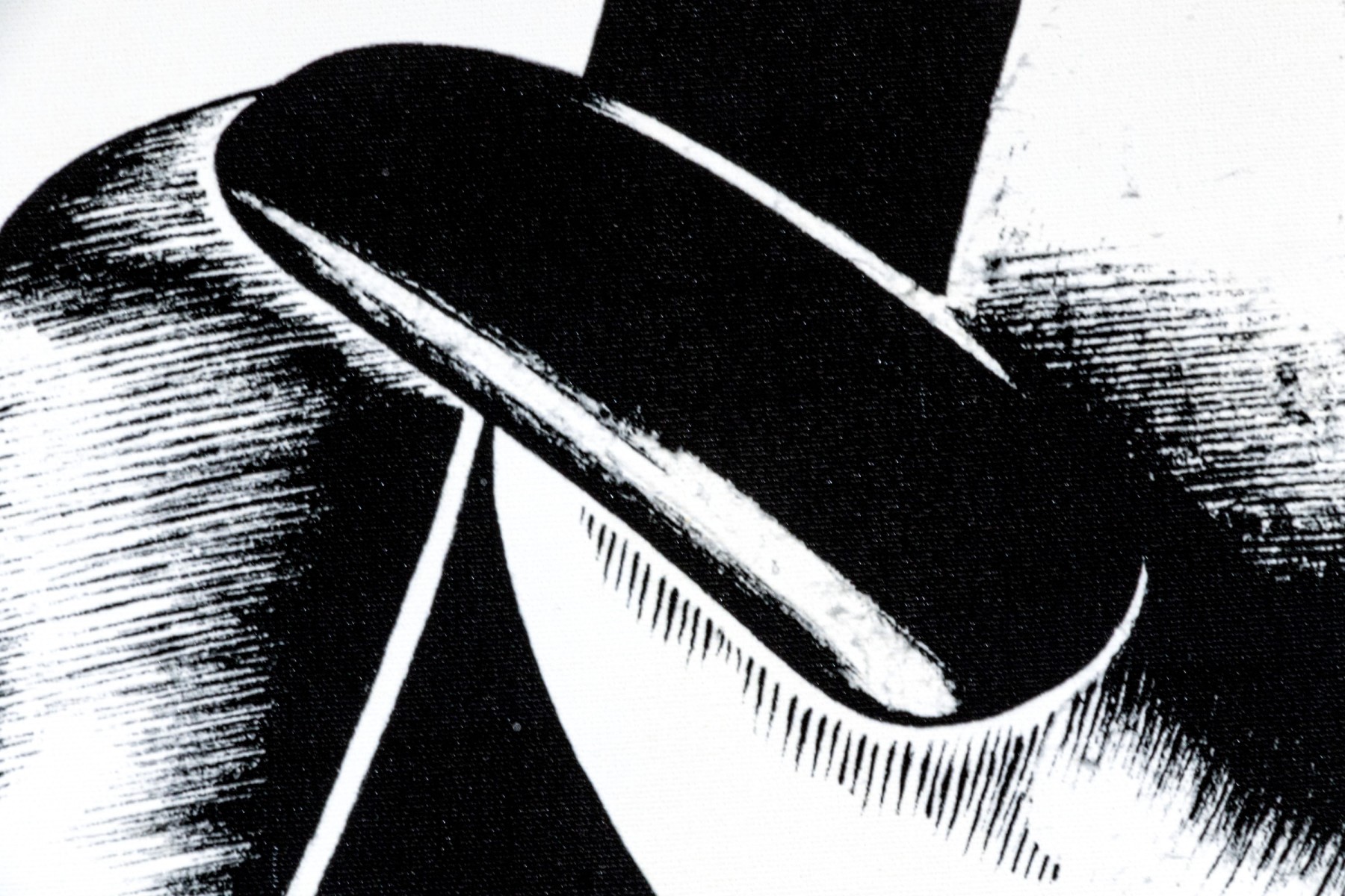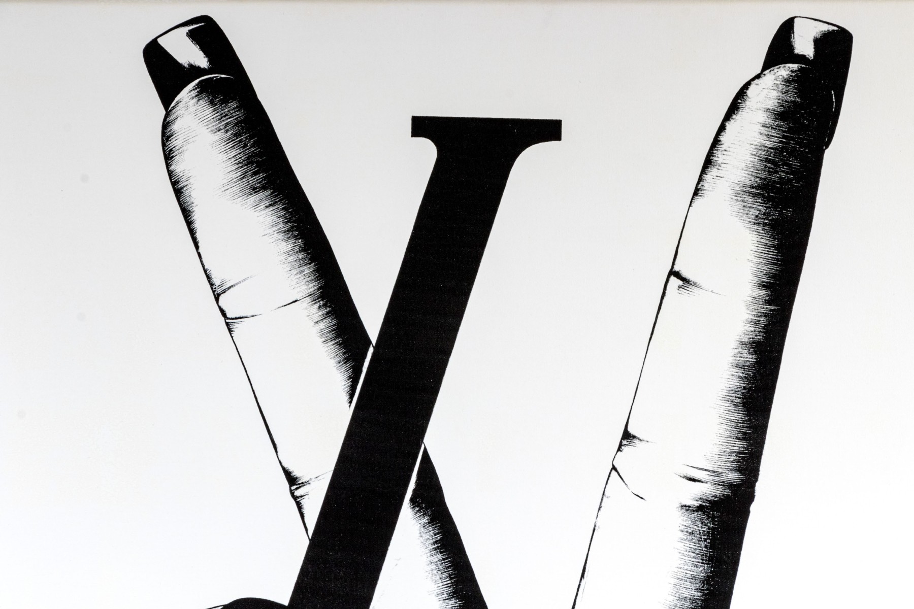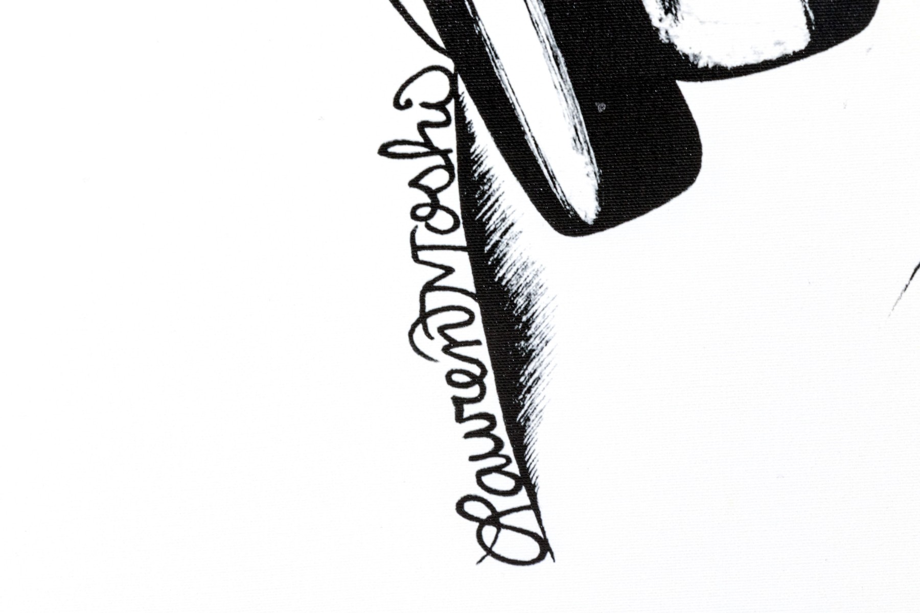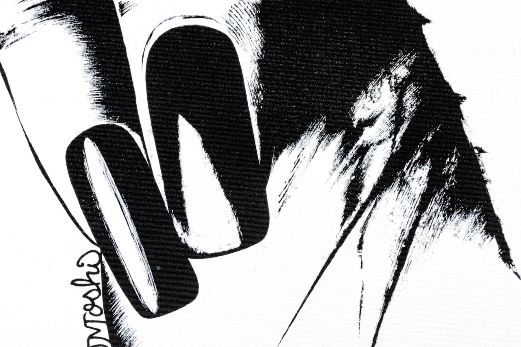 Painted in black and white with decorative peace sign and a stylized "L" between the hands fingers.
