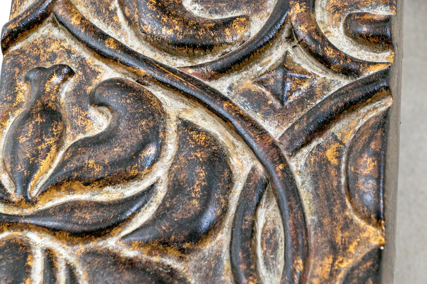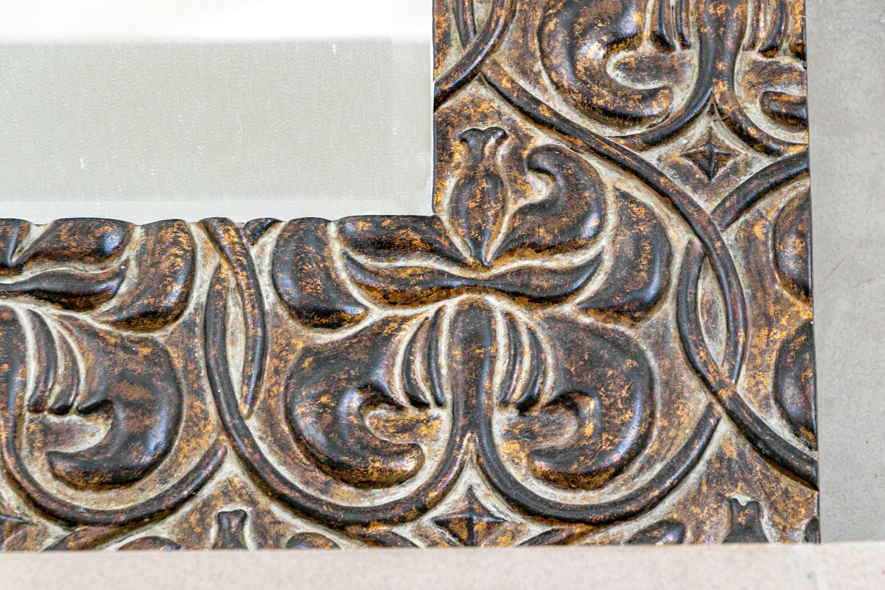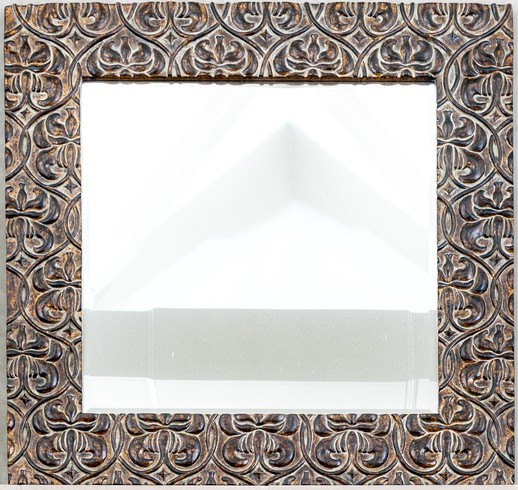 A gorgeous square beveled mirror in a frame with stylish rustic and elegant relief depicting branching foliage surrounded by intertwining navette vines in an oil rubbed gilt patinaed finish.