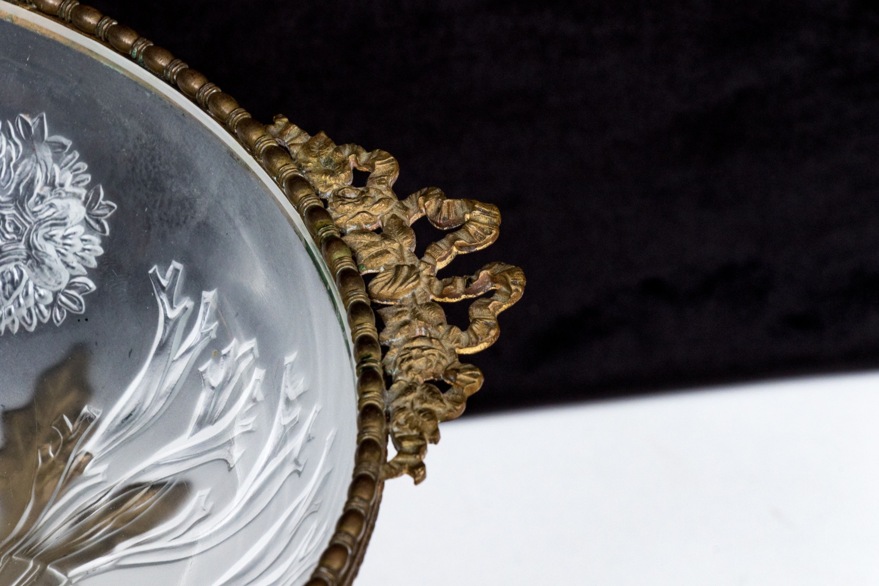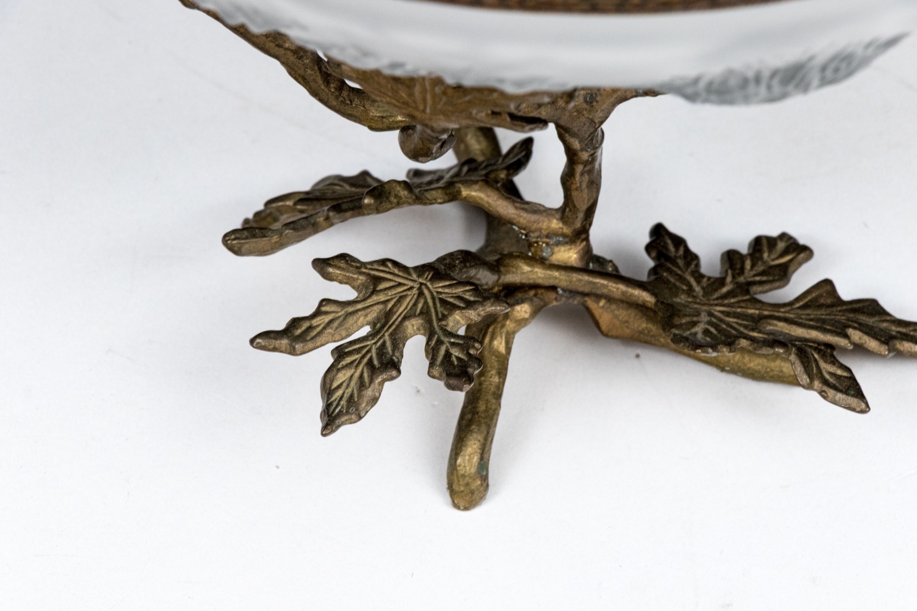 Standing on a faux bois gilt metal branch and leaf form support the moulded glass bowl with maritime motifs including shells, seagrass and more, has brass and gilt metal mount to rim and ribbon form handles.