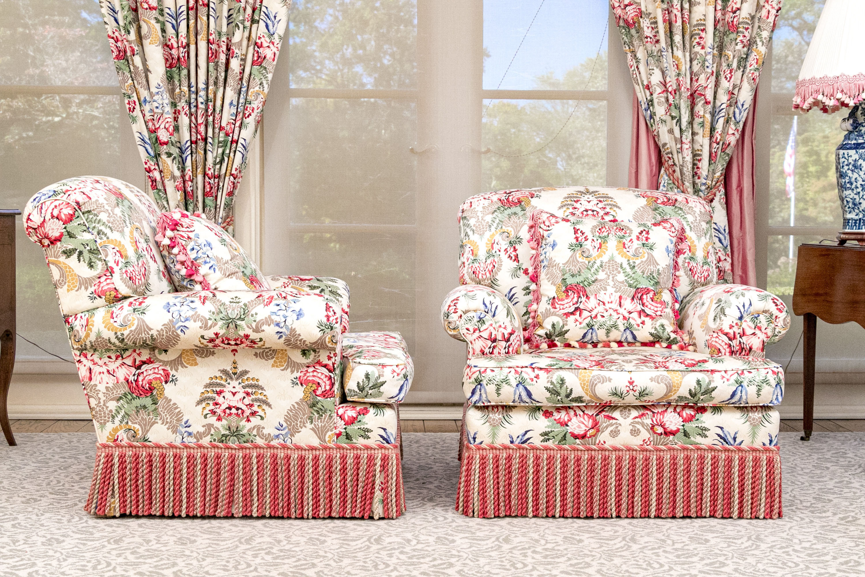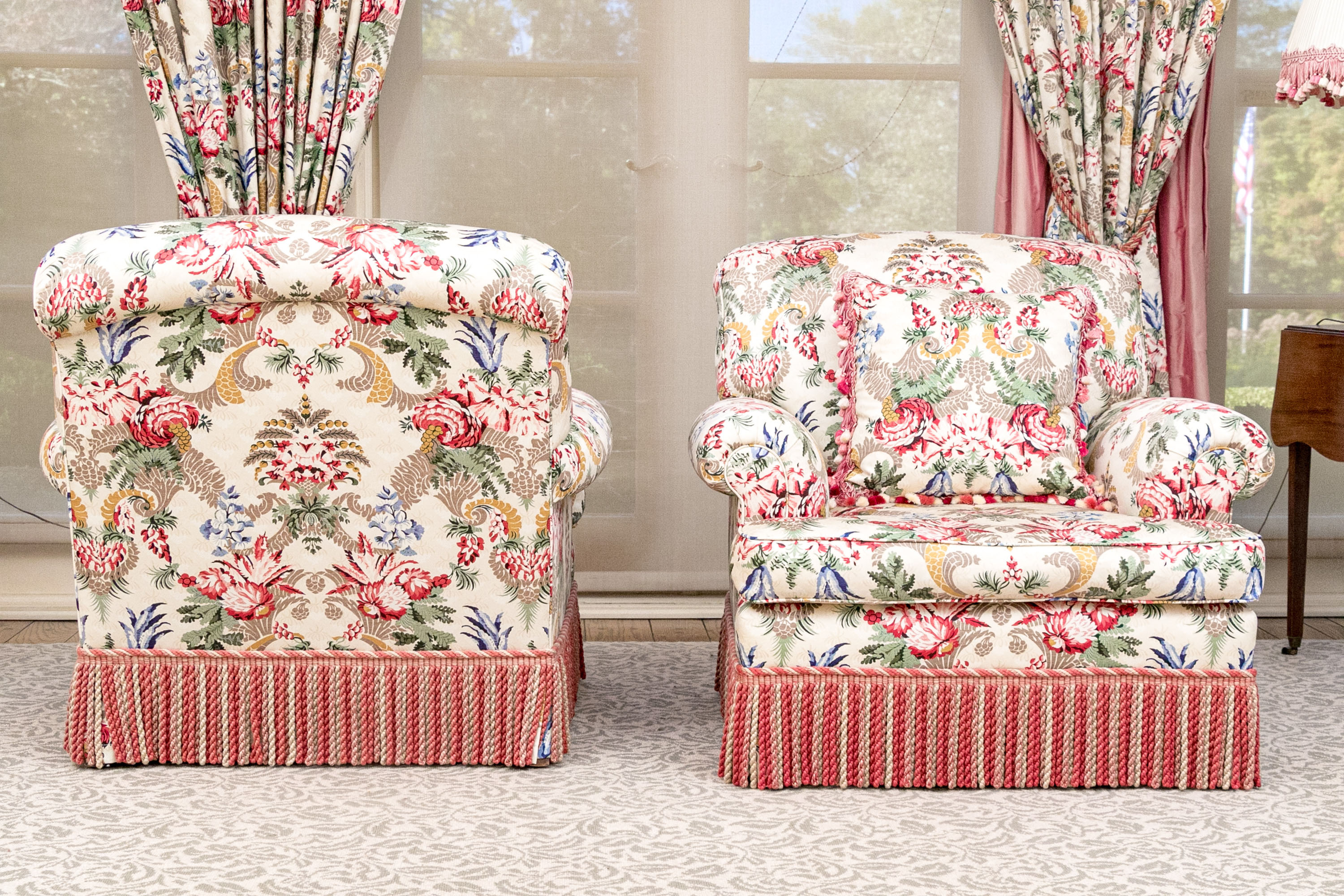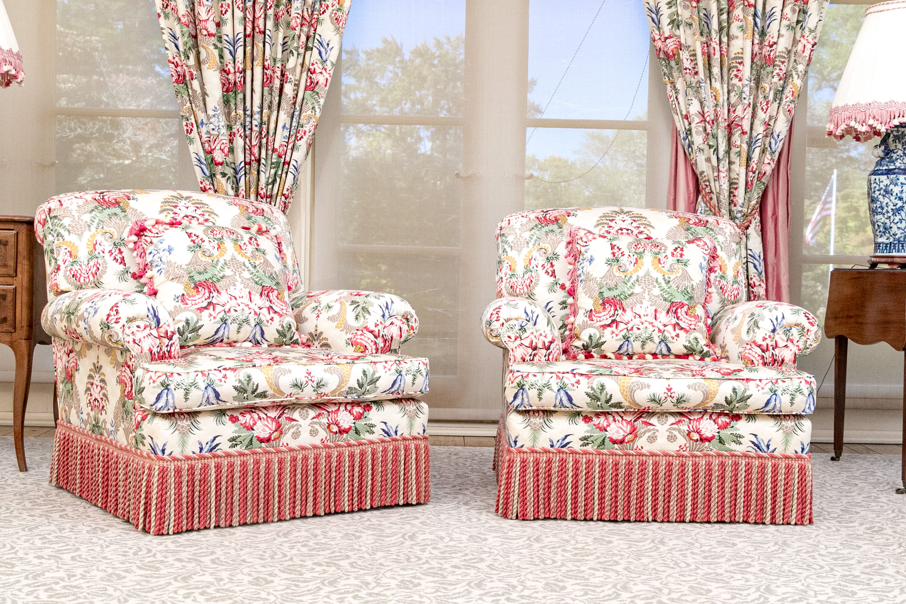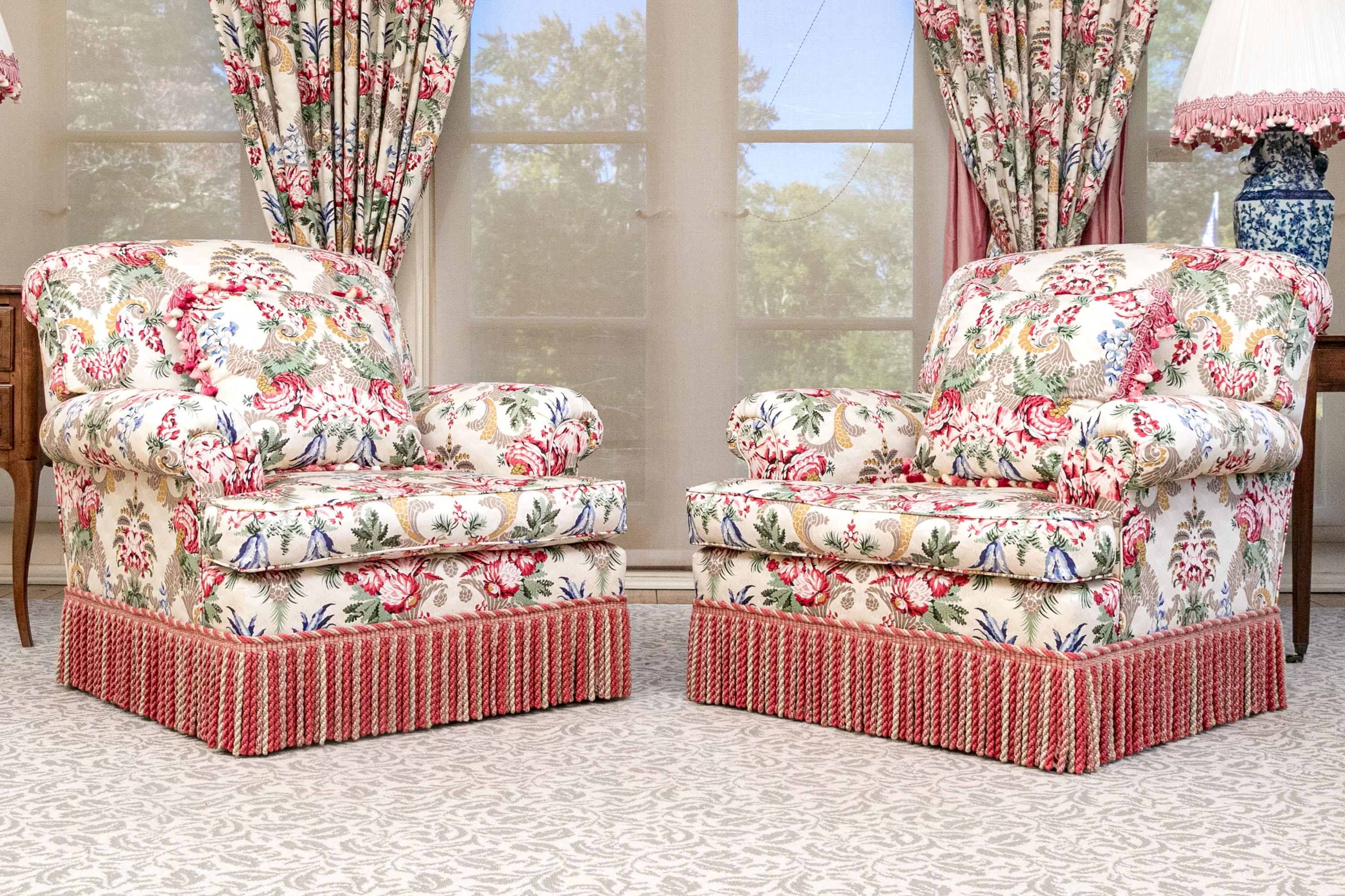 A distinguished pair of lounge armchairs boasting oversized backs, rolled arms, and loose seat cushions. Upholstered in cream with bold and elegant designs of symmetrical foliage in yellow, taupe, red, and blue. The chairs are finished with handsome red and taupe bullion fringe skirts concealing the legs.