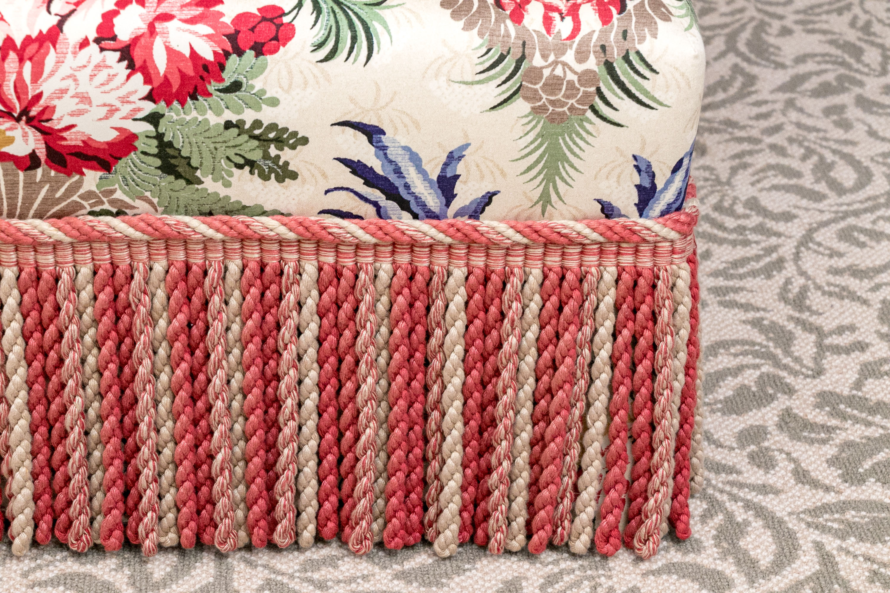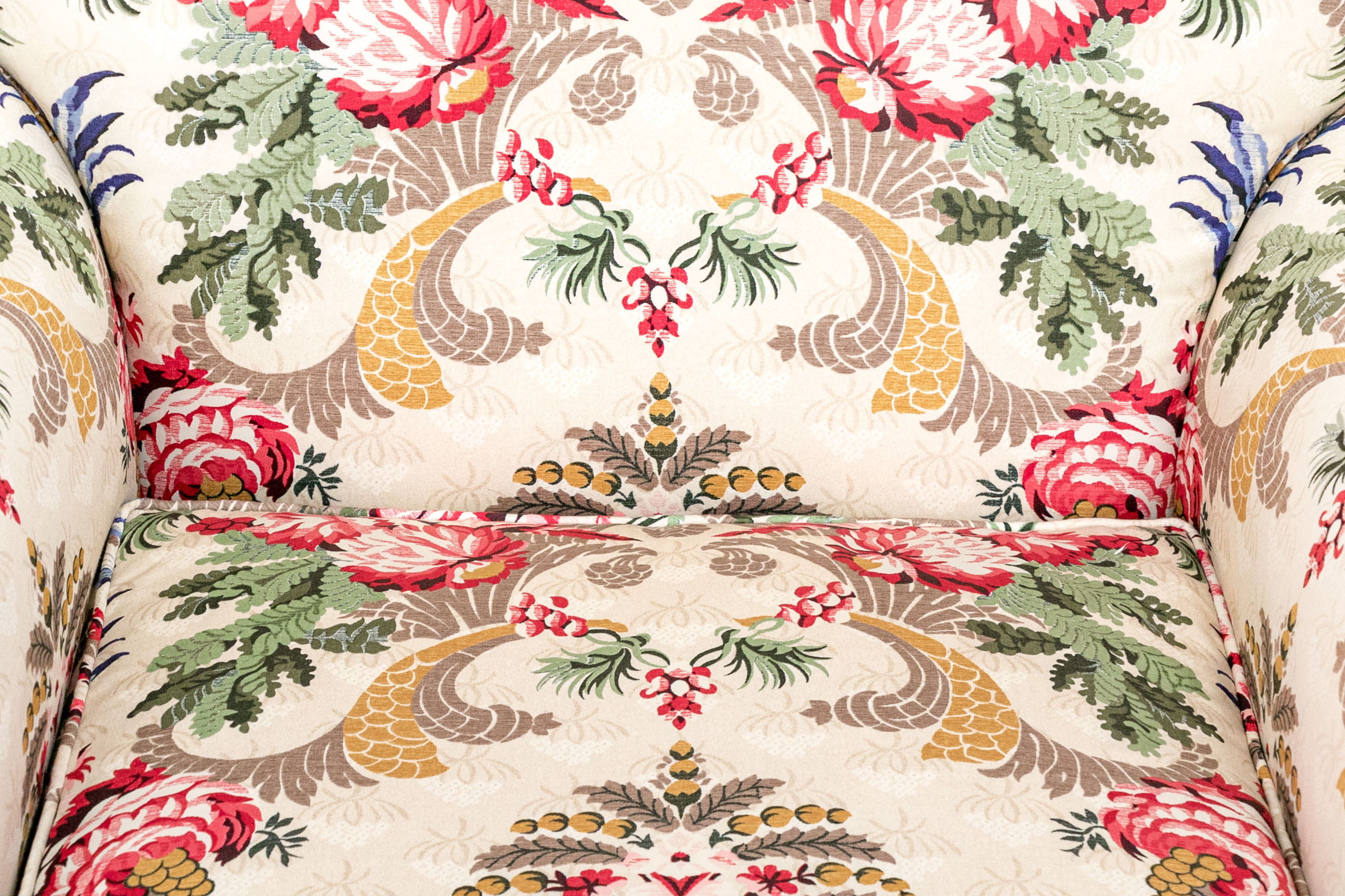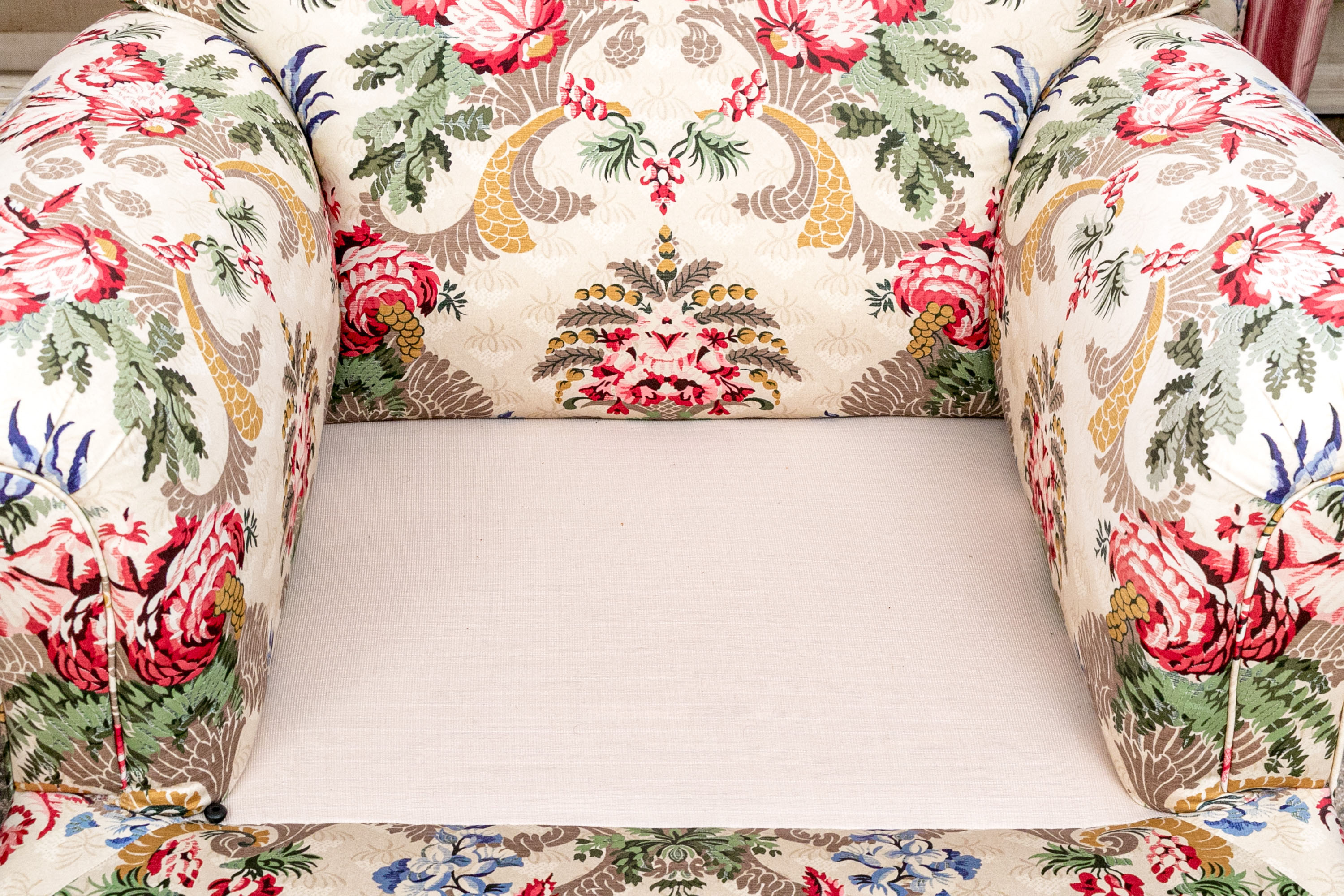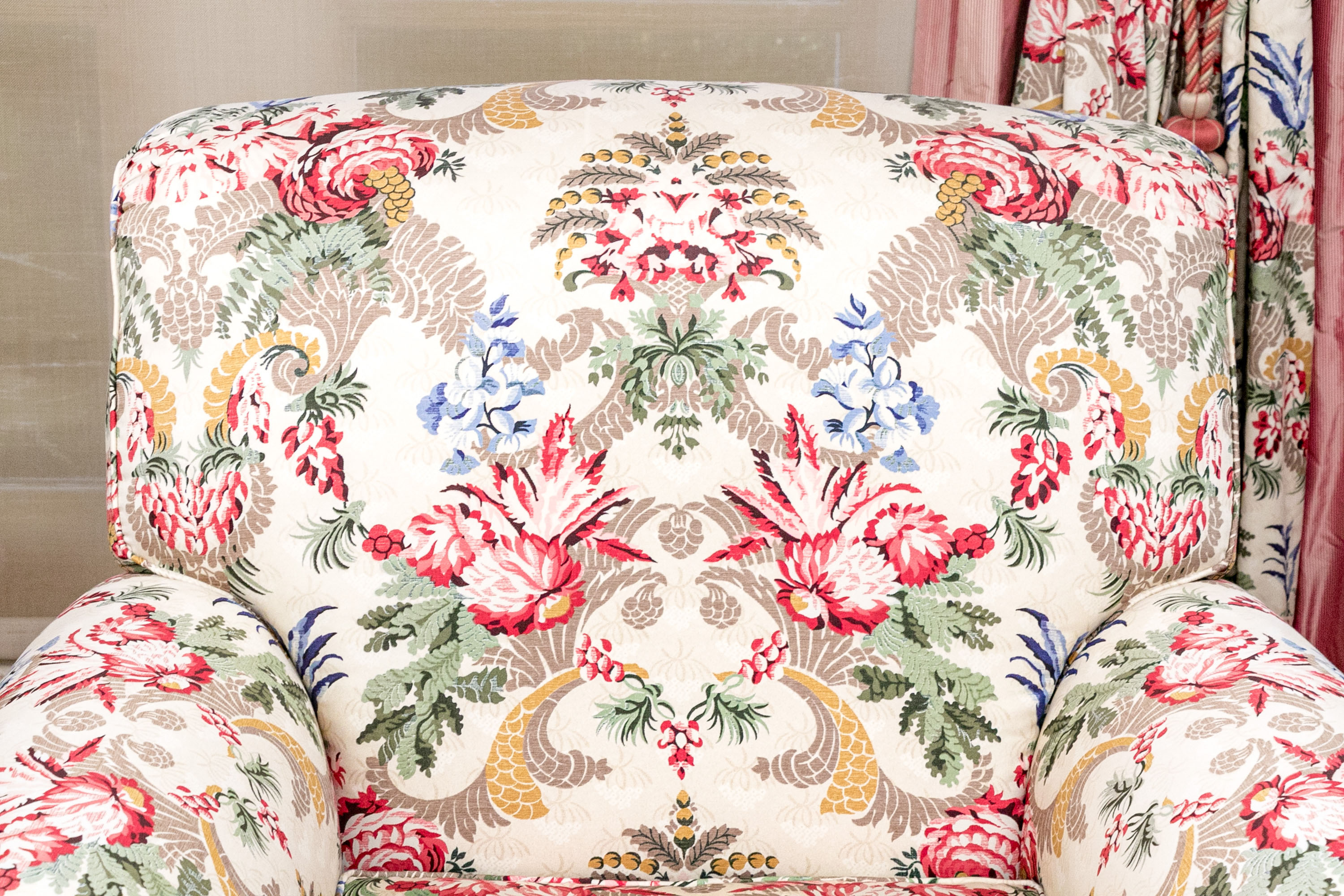 A distinguished pair of lounge armchairs boasting oversized backs, rolled arms, and loose seat cushions. Upholstered in cream with bold and elegant designs of symmetrical foliage in yellow, taupe, red, and blue. The chairs are finished with handsome red and taupe bullion fringe skirts concealing the legs.