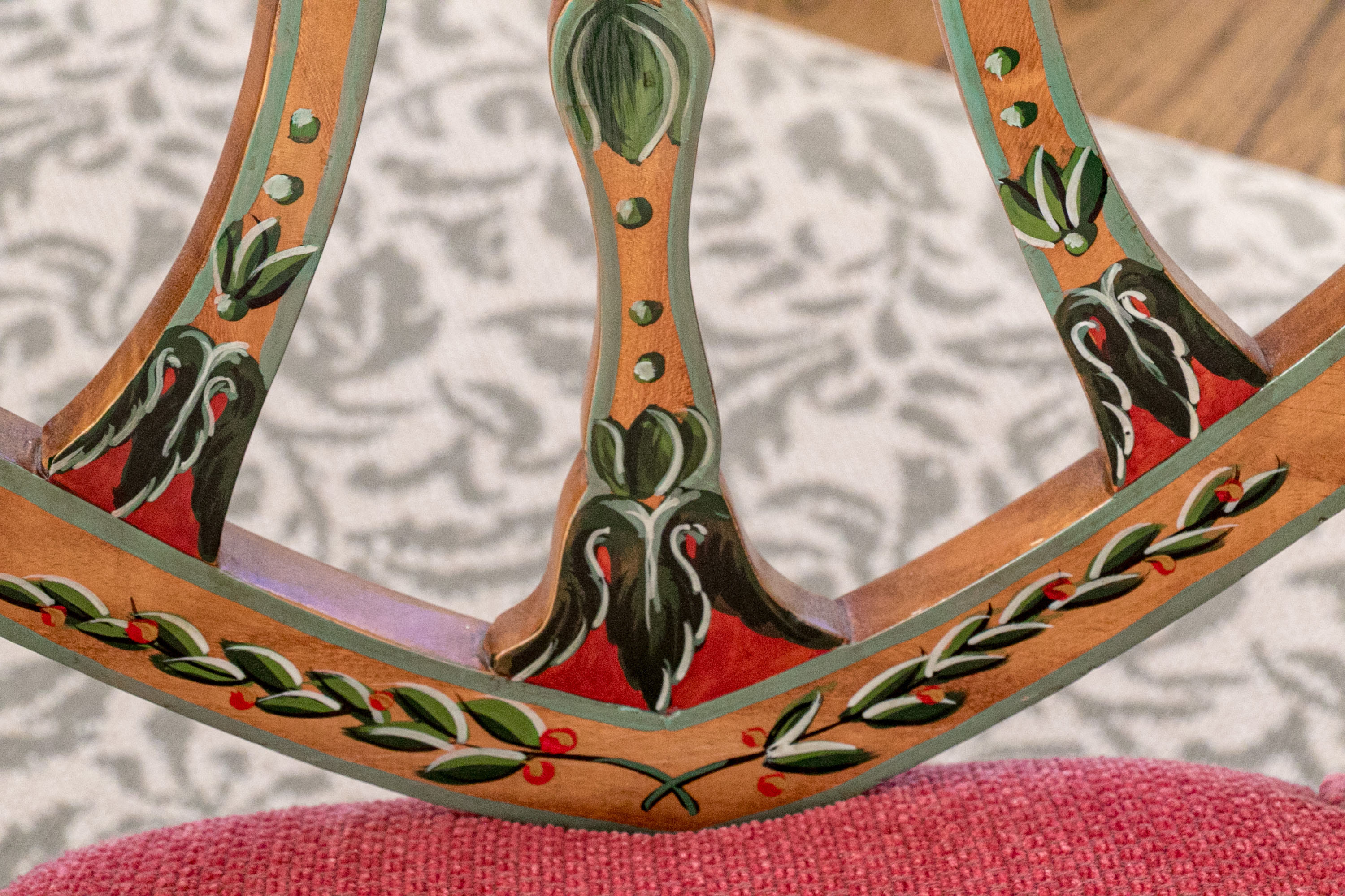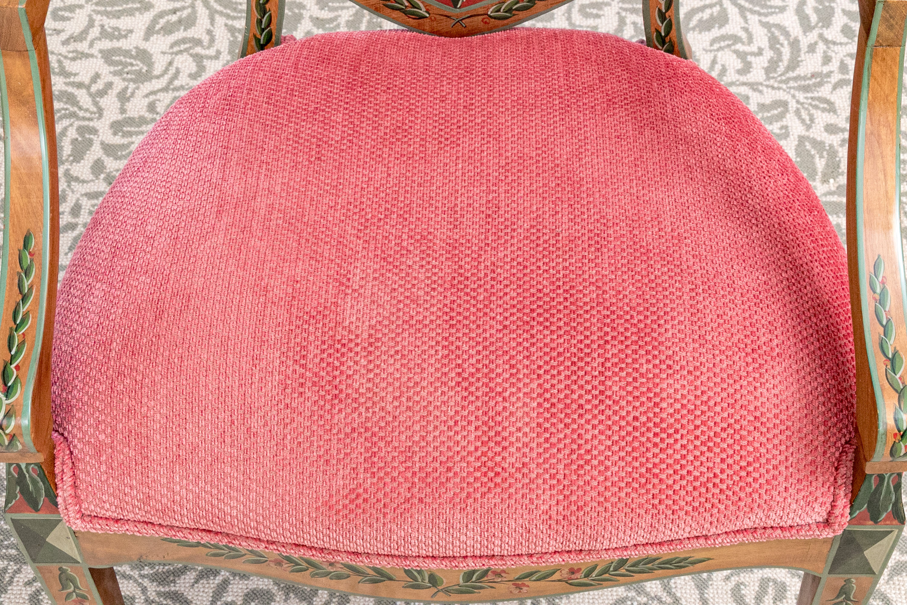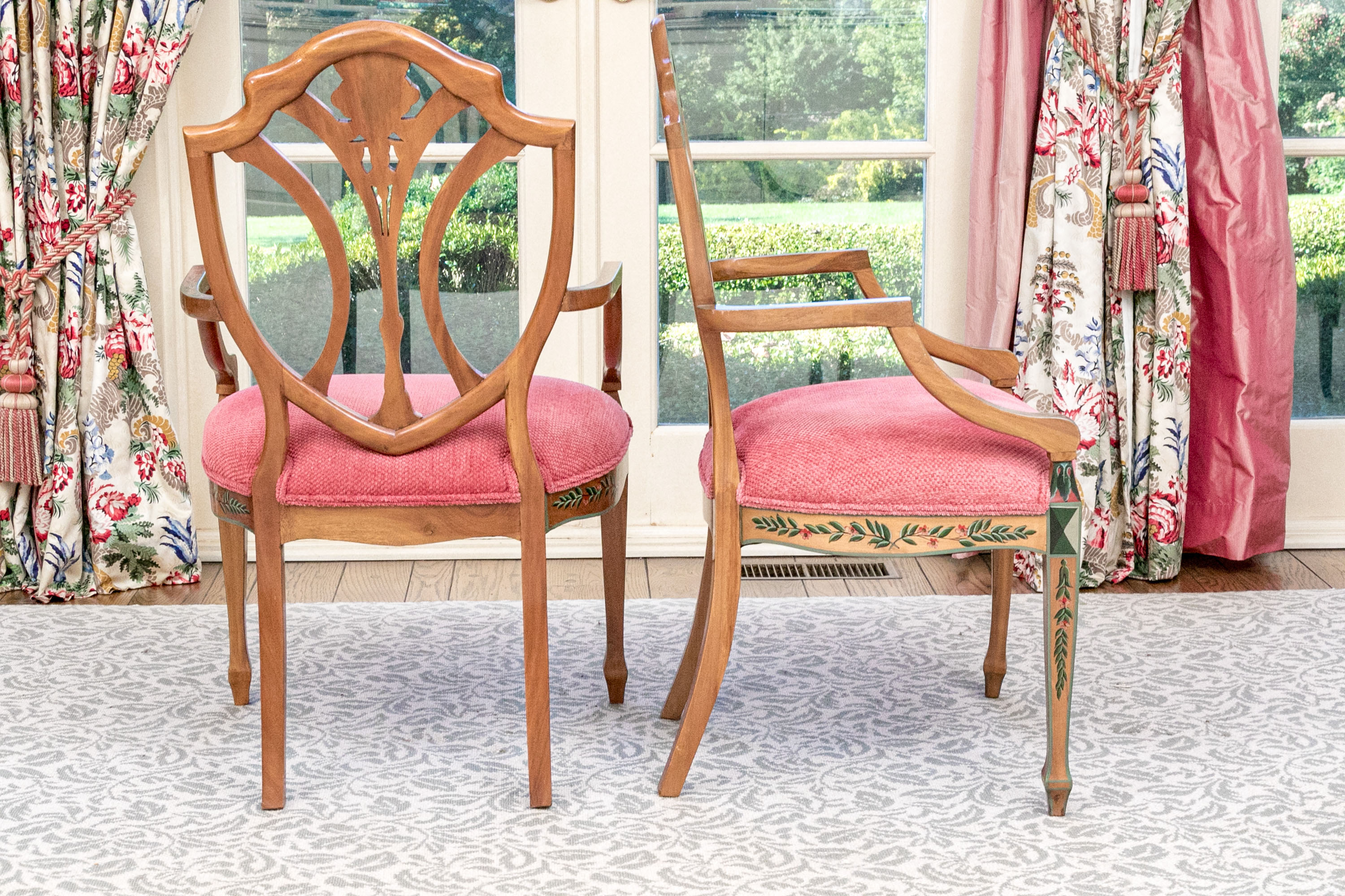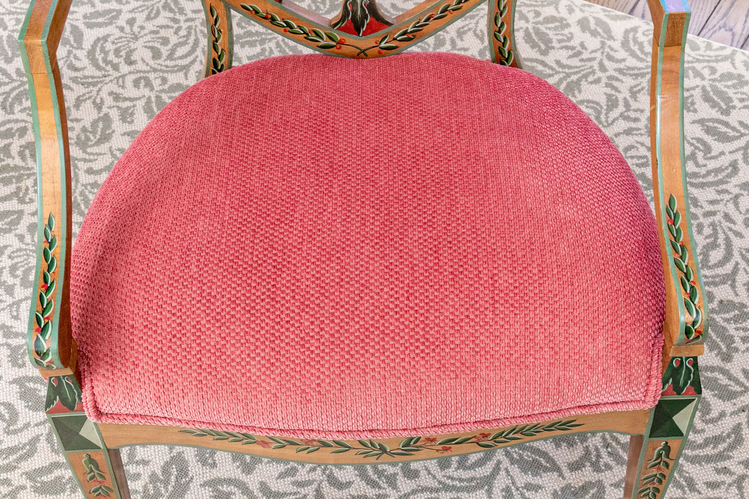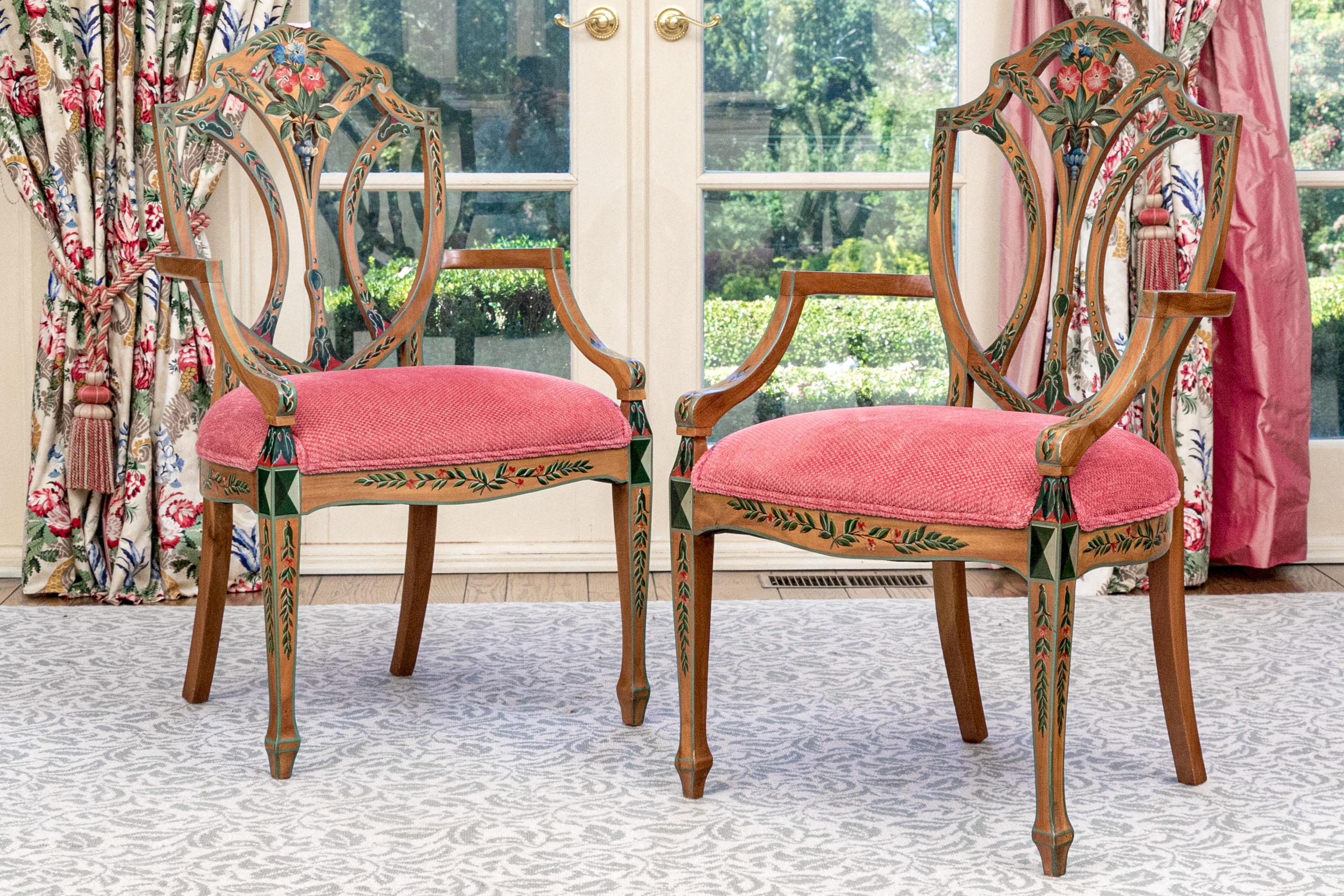 A lavish and elegant pair of Edwardian style painted satinwood shield back armchairs with custom upholstered seats.