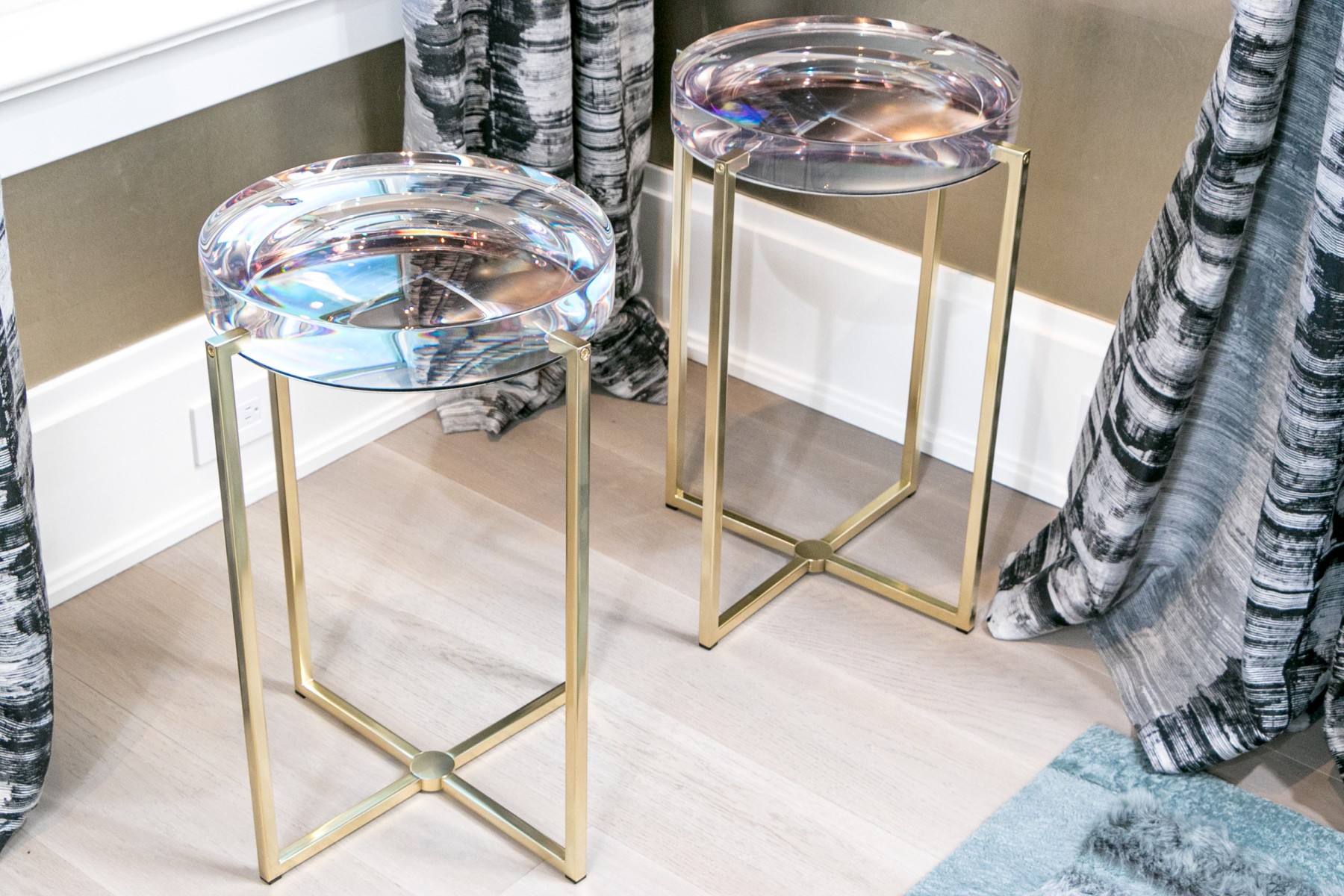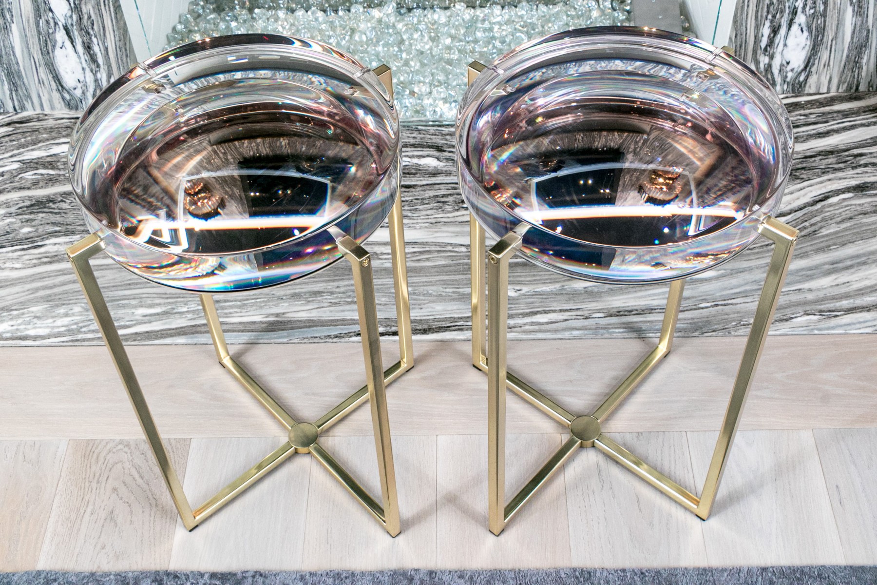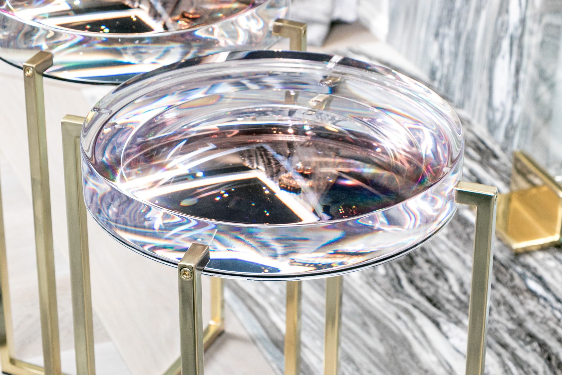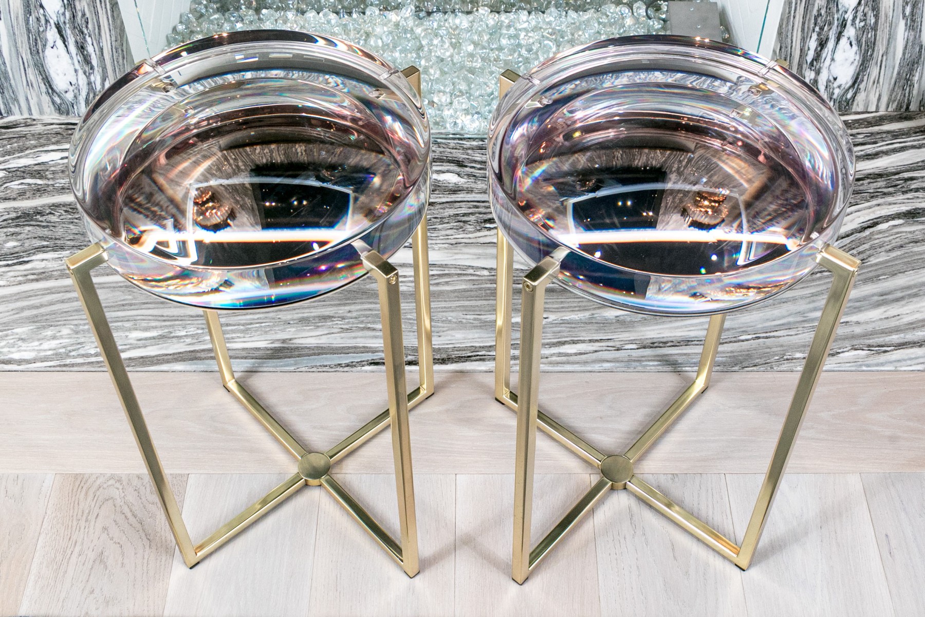 Supported by brass-finished bases, the thick clear resin tops of these McCollin Bryan "Lens" tables captivate with their optical allure. Combining contemporary elegance with functional artistry, these tables are a standout addition to any modern space. Perfect for those who appreciate innovative design and stylish sophistication.