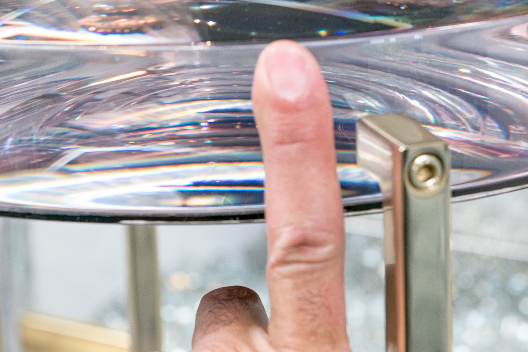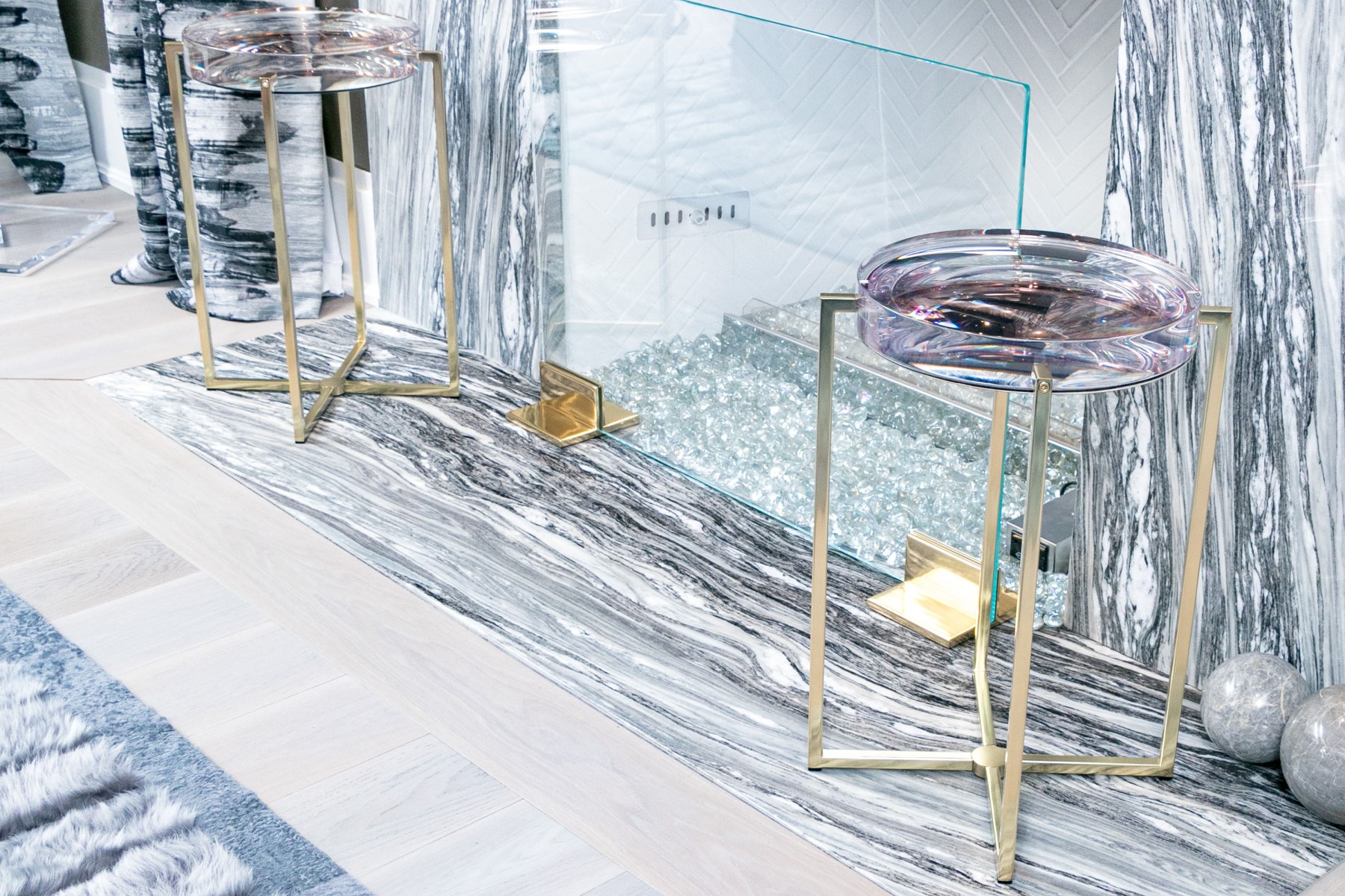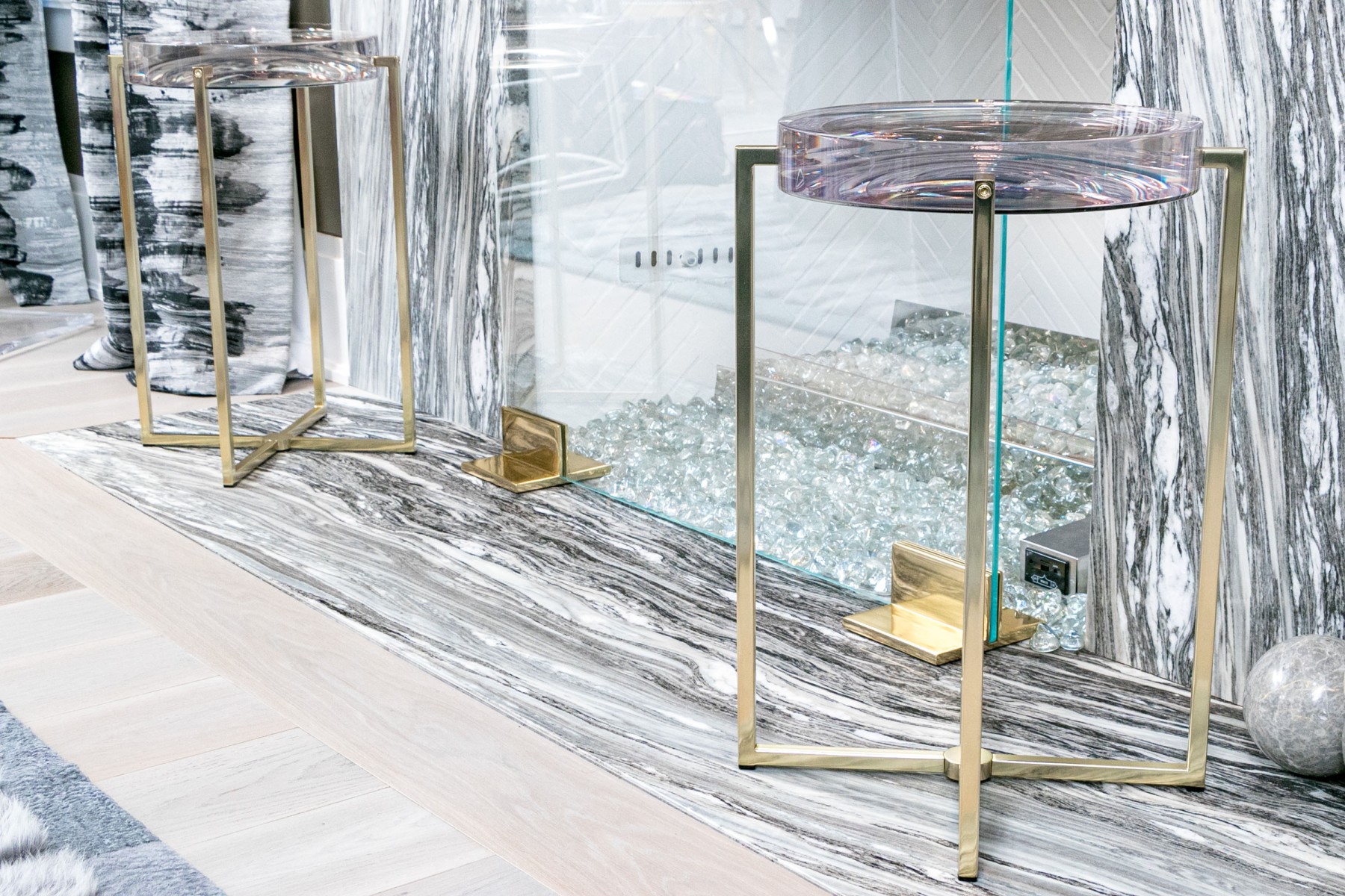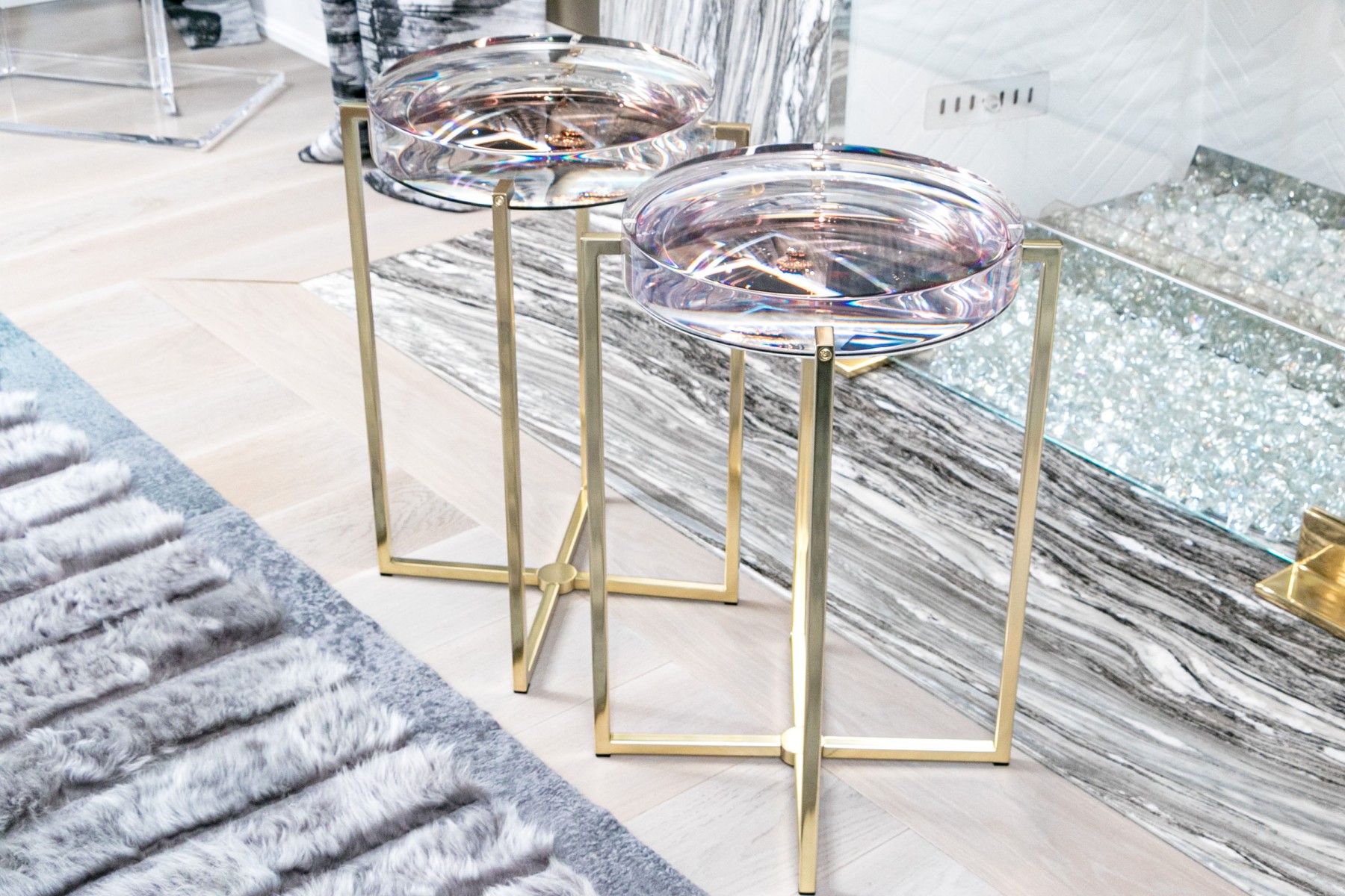 Supported by brass-finished bases, the thick clear resin tops of these McCollin Bryan "Lens" tables captivate with their optical allure. Combining contemporary elegance with functional artistry, these tables are a standout addition to any modern space. Perfect for those who appreciate innovative design and stylish sophistication.