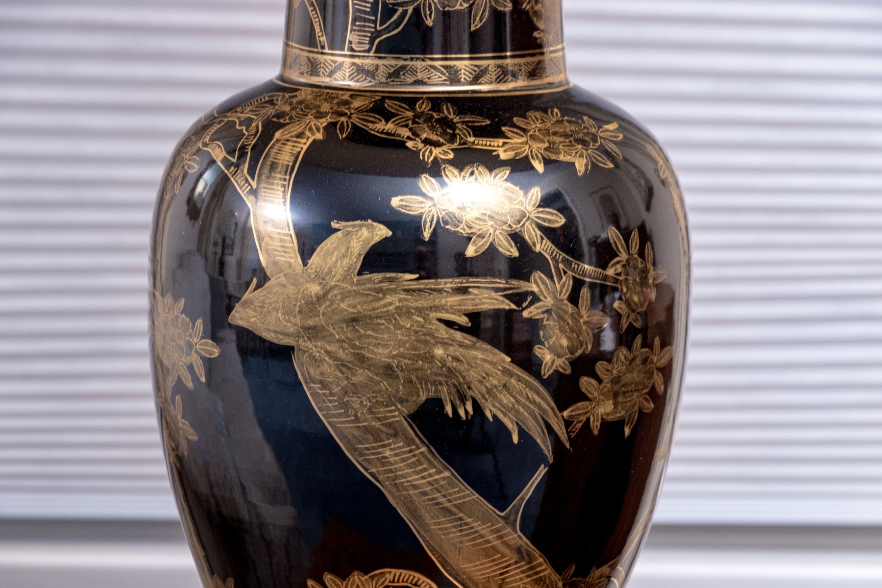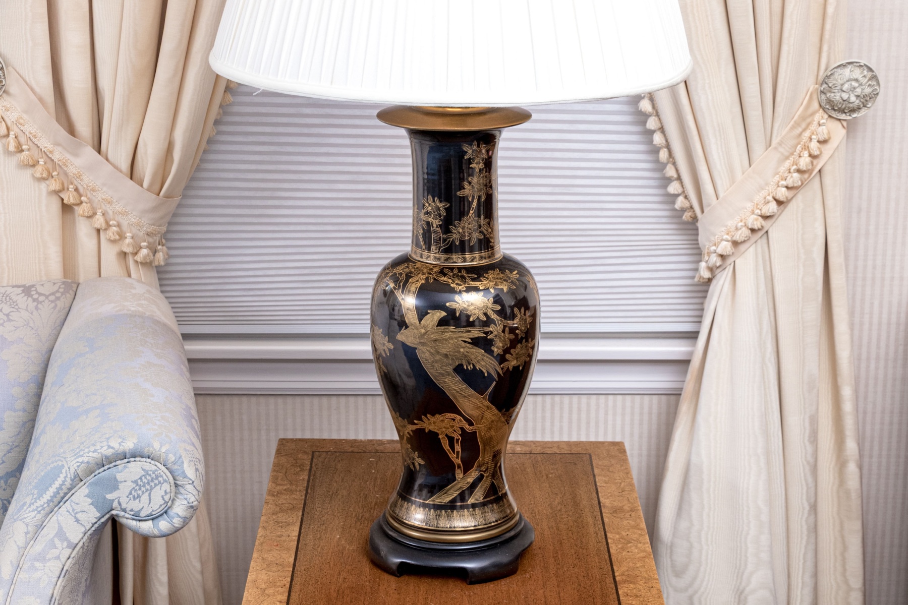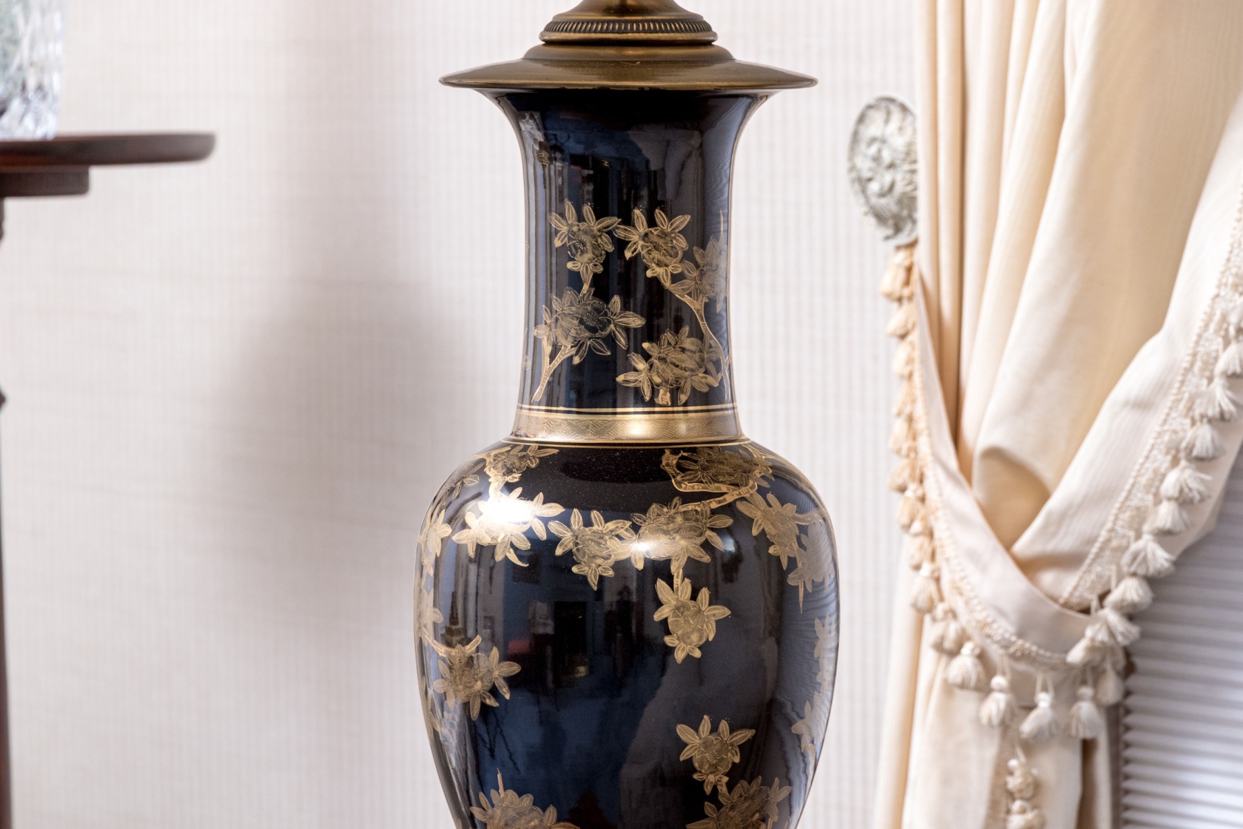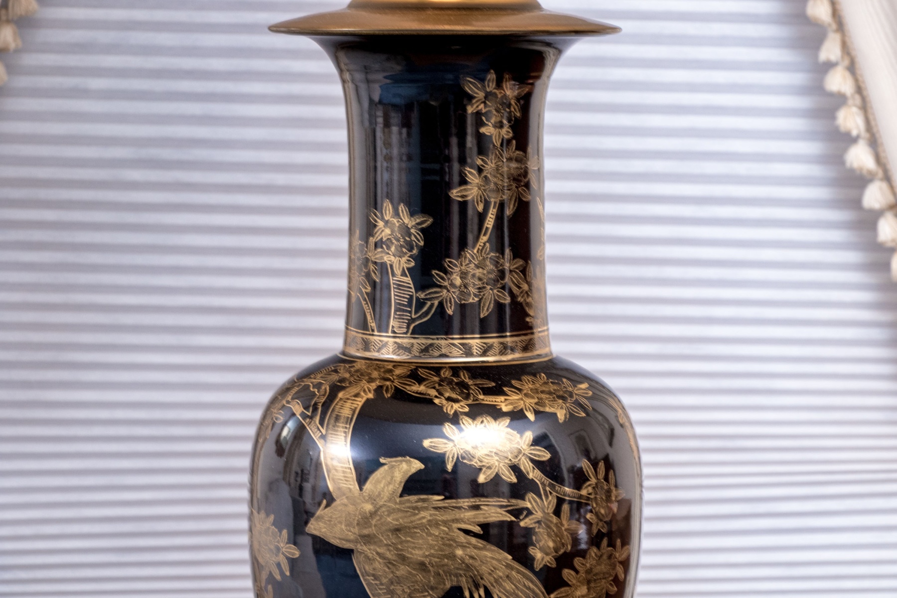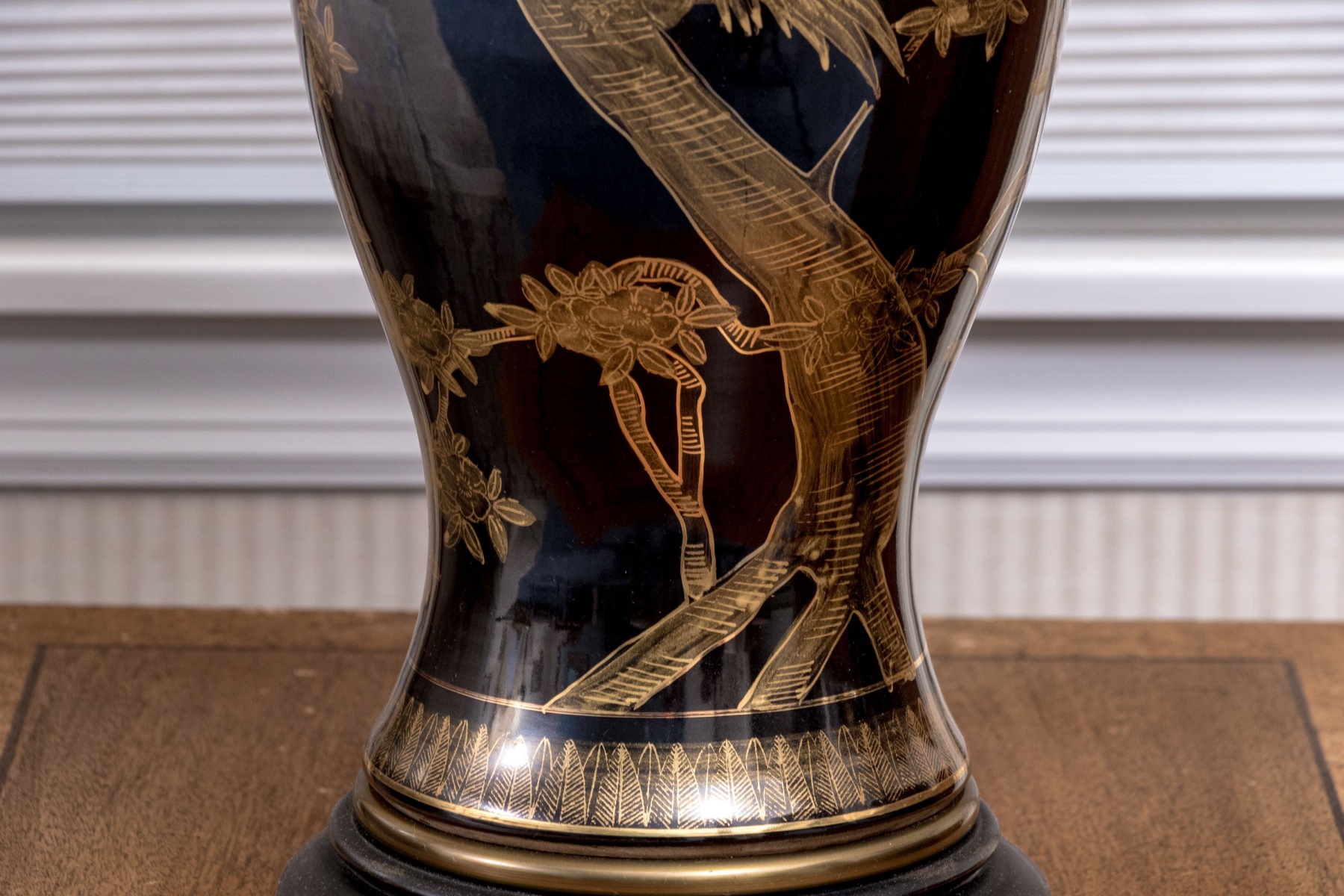 A lavish pair of painted porcelain Yen-Yen form porcelain vases mounted as table lamps. Each vase with baluster form body and trumpet form neck with flared mouth, are affixed to their fitted wood stands and have a dark ground with gilt finished decoration depicting trees with leafy branches. Both lamps with shades and finials.