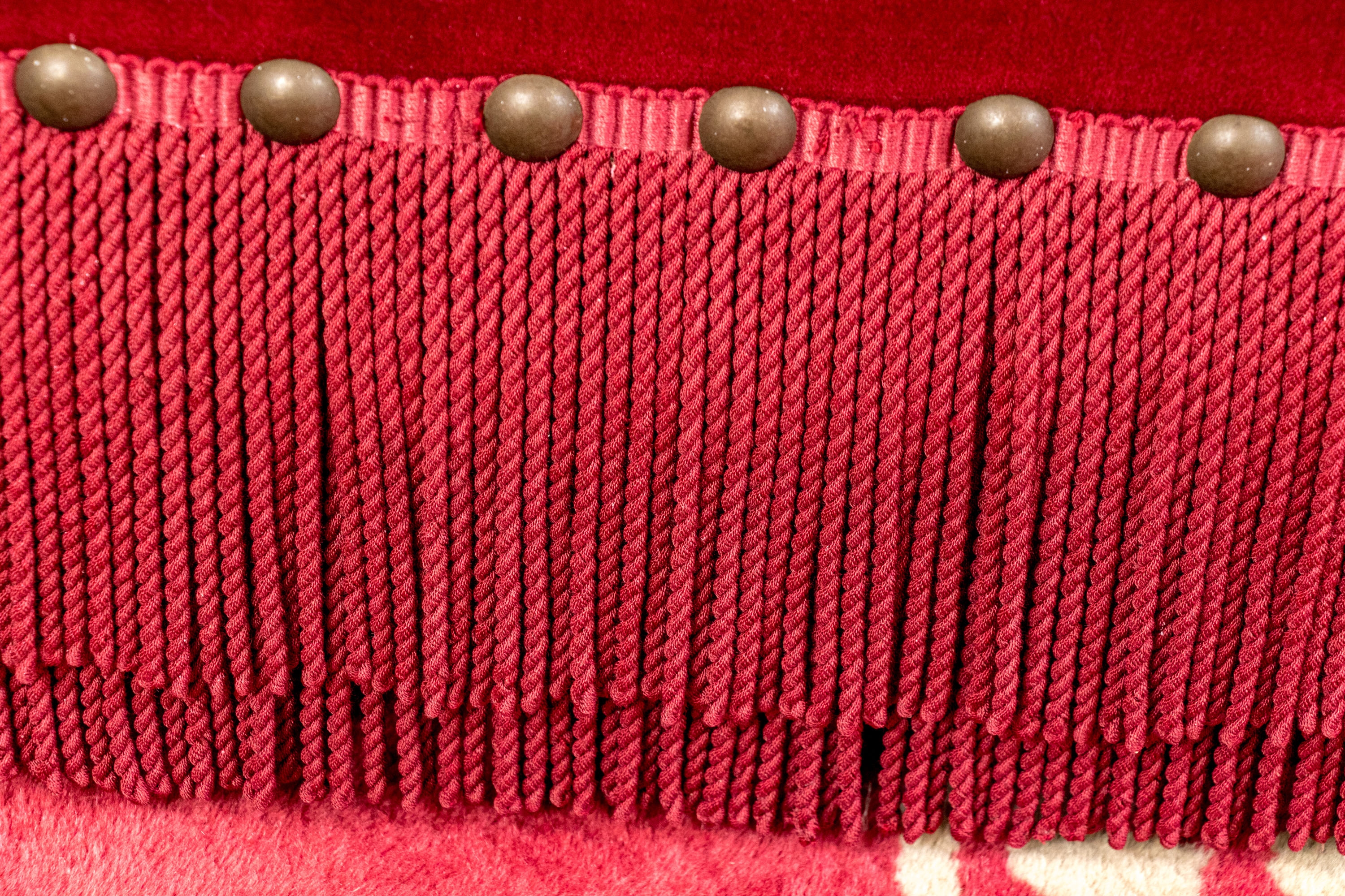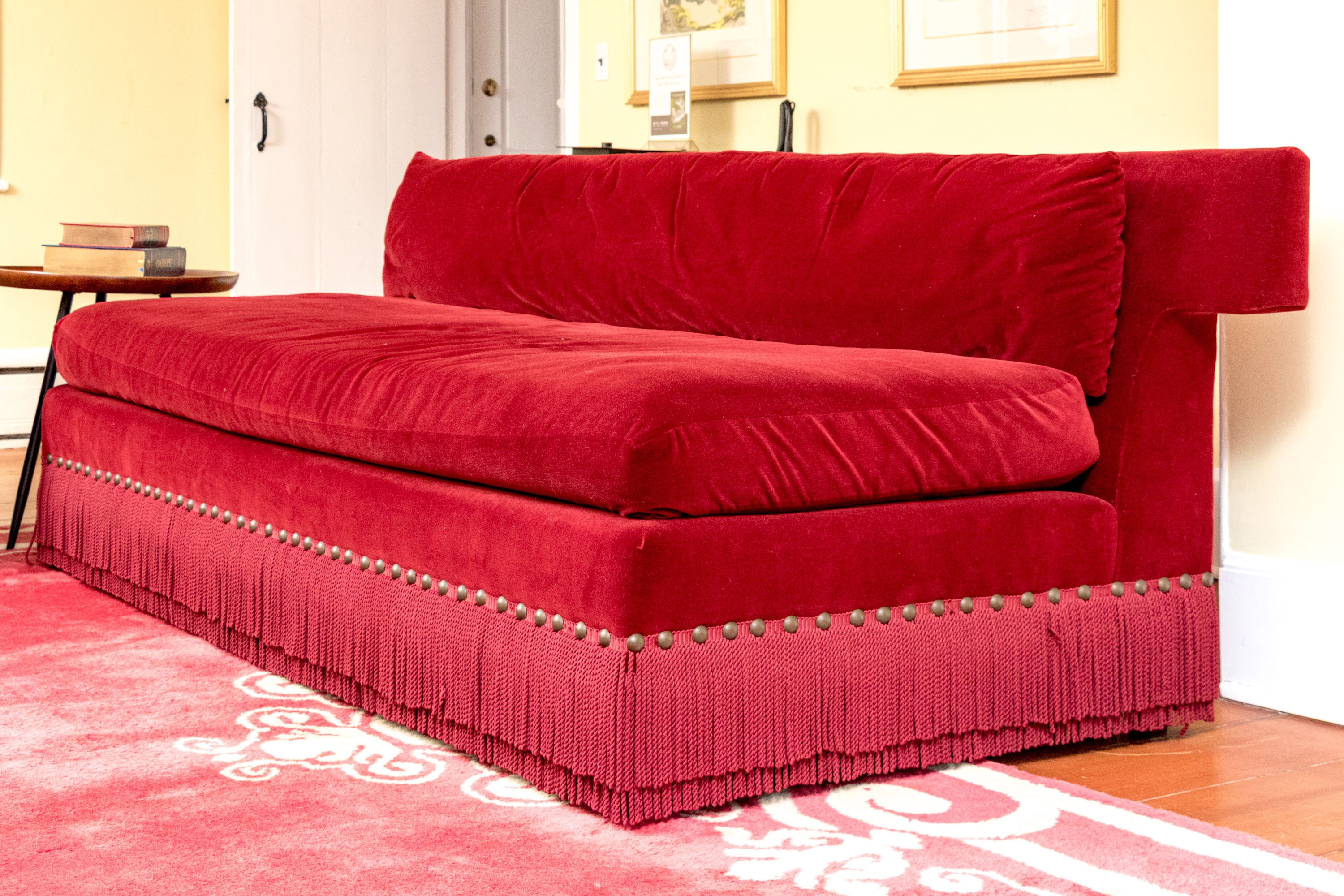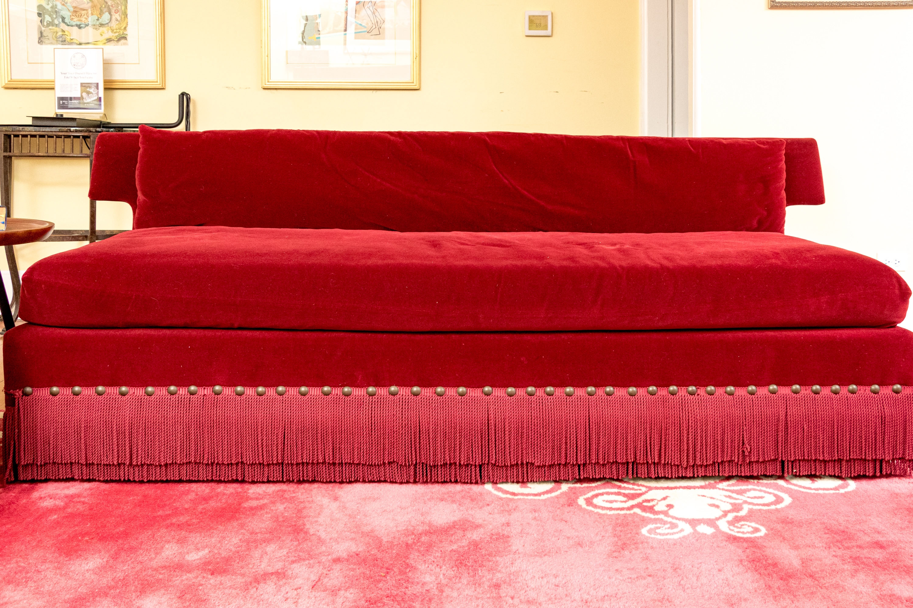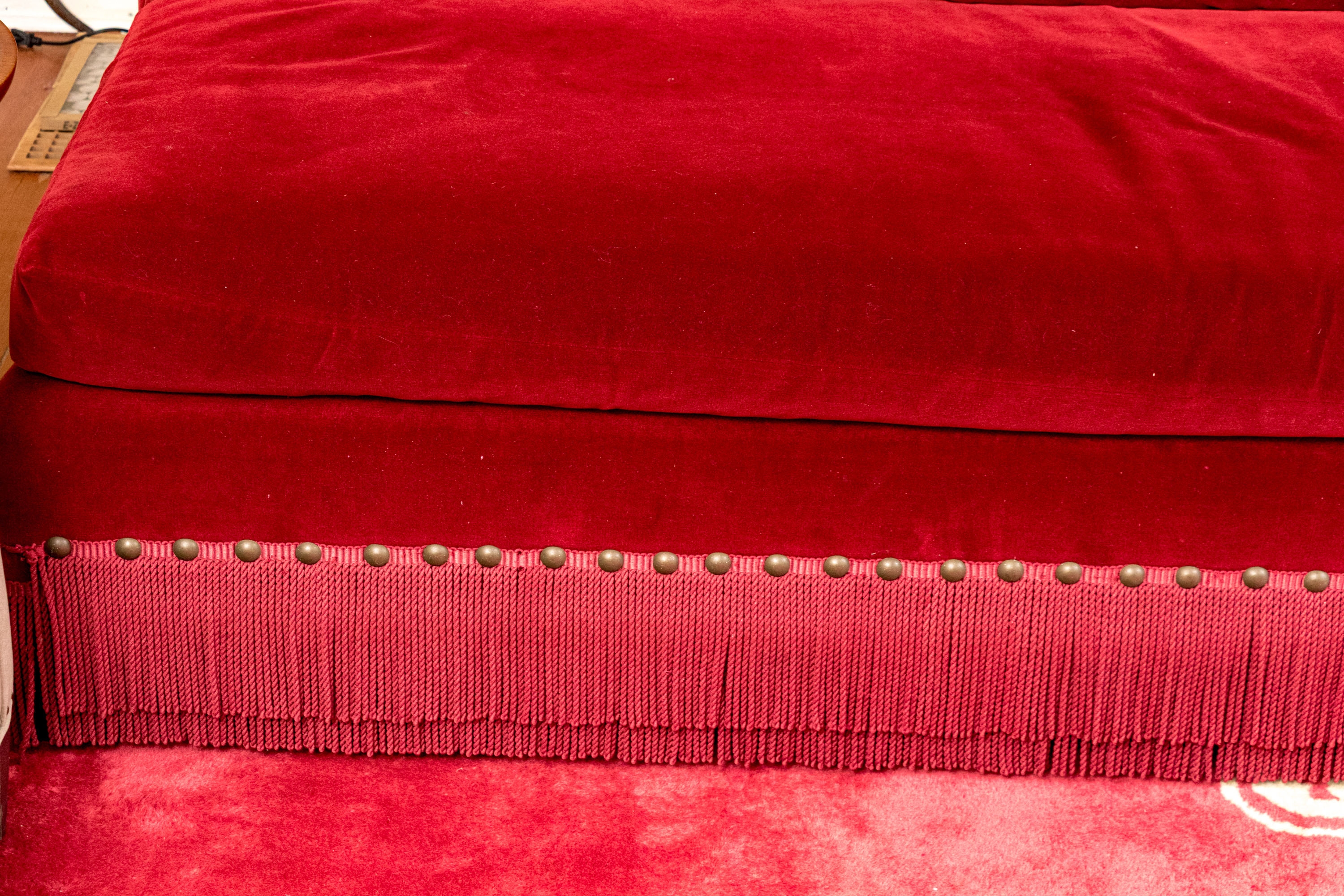 With red fabric upholstered frame with oversize tack nailhead trim with rope twist fringe to conceal the underneath. Single seat cushion with down fill, and a single seat back cushion. Provenance: Purchased at the auction for Gramercy Hotel.