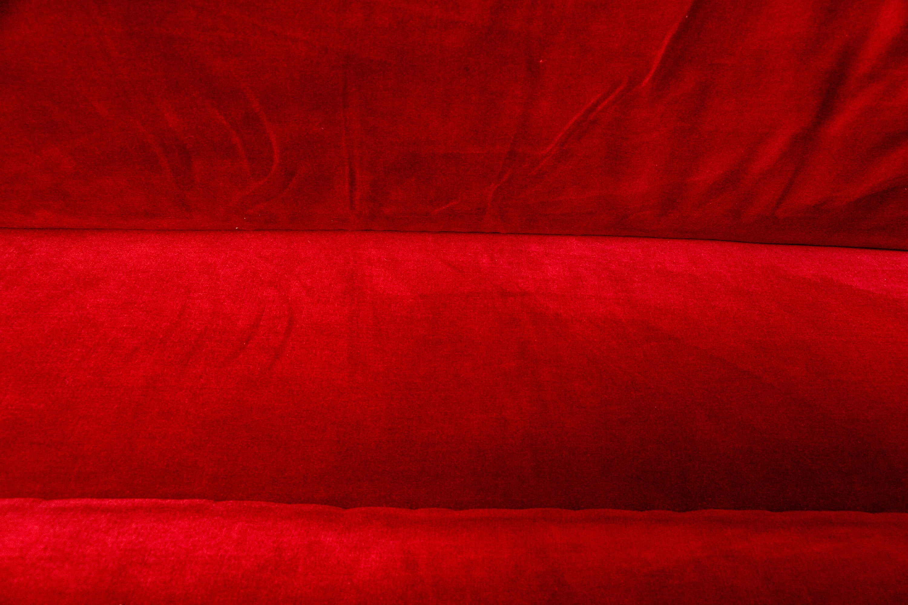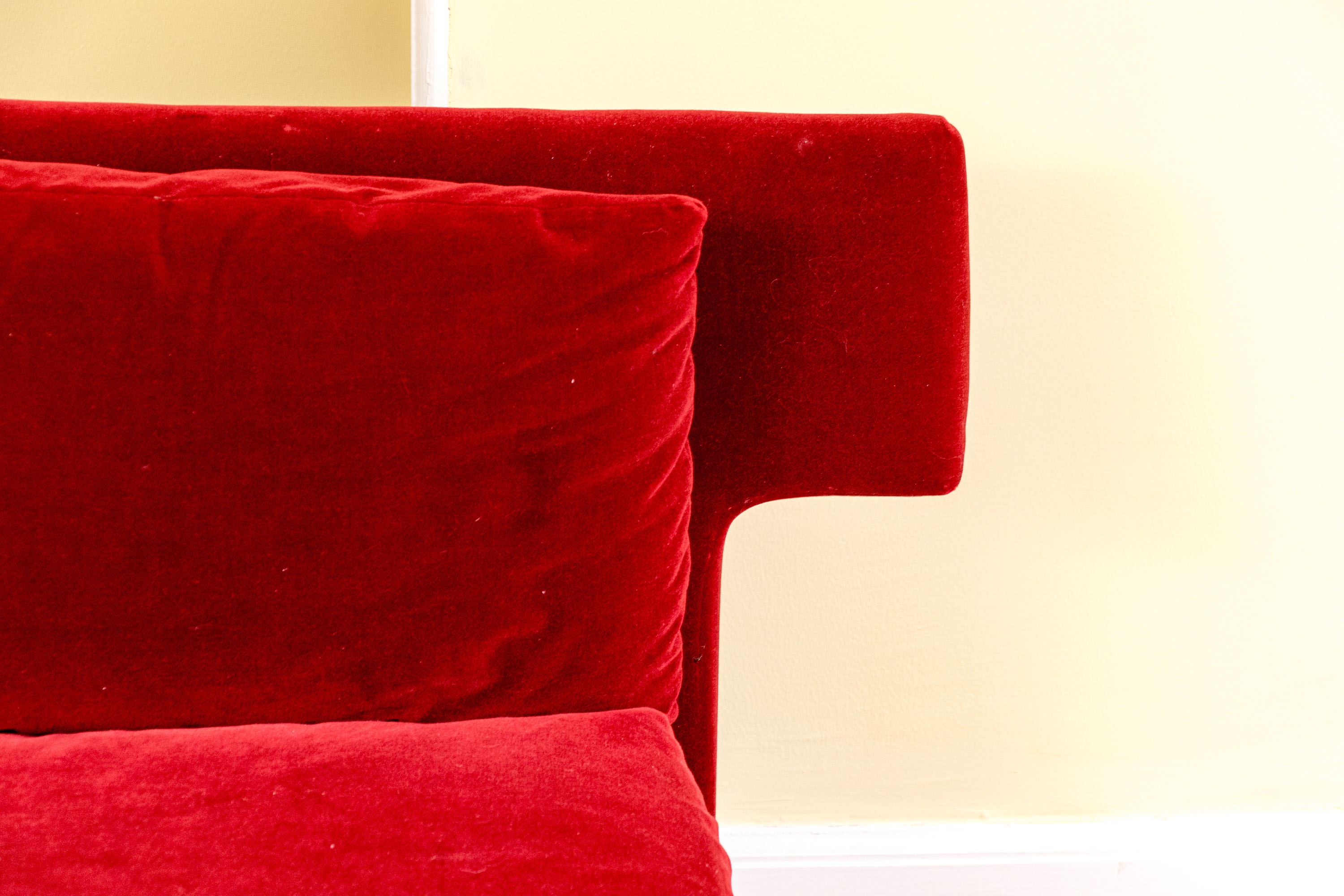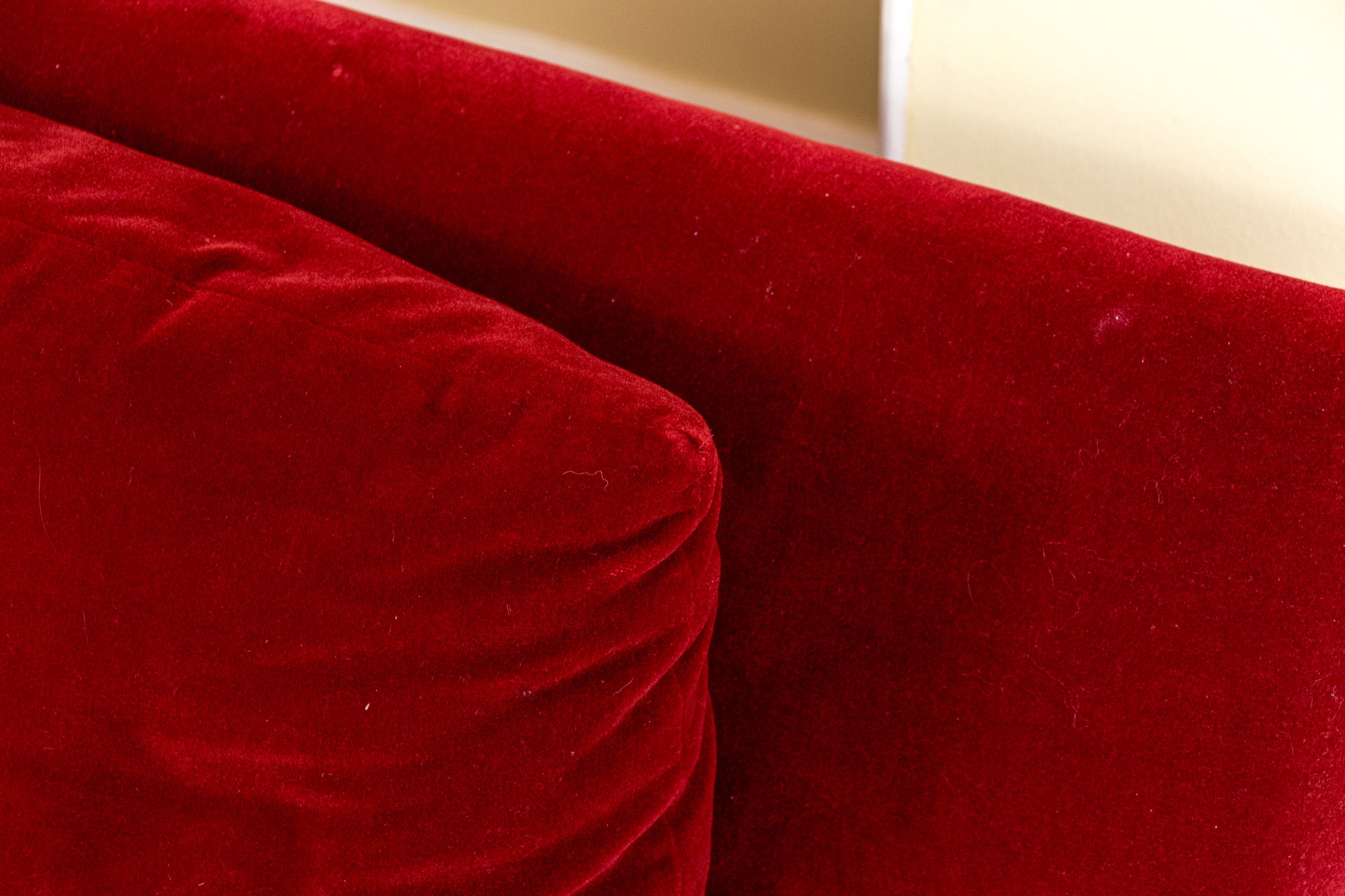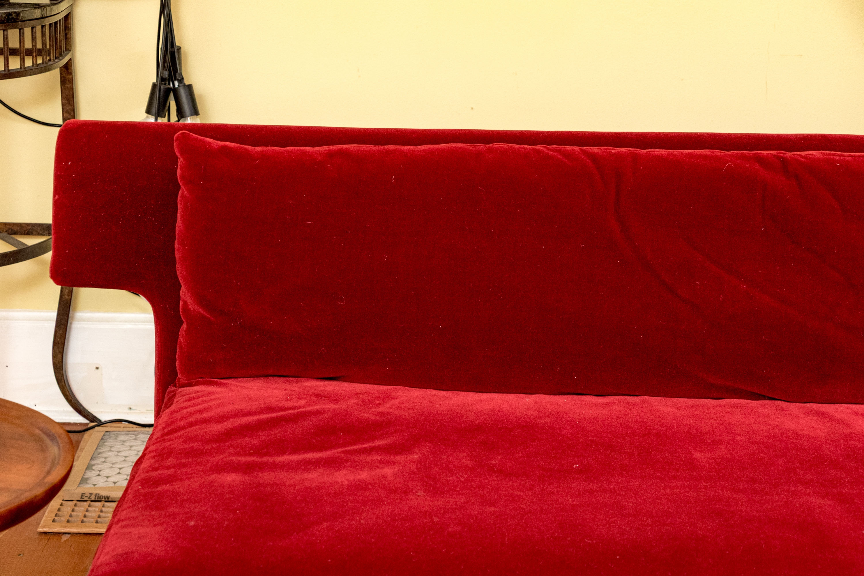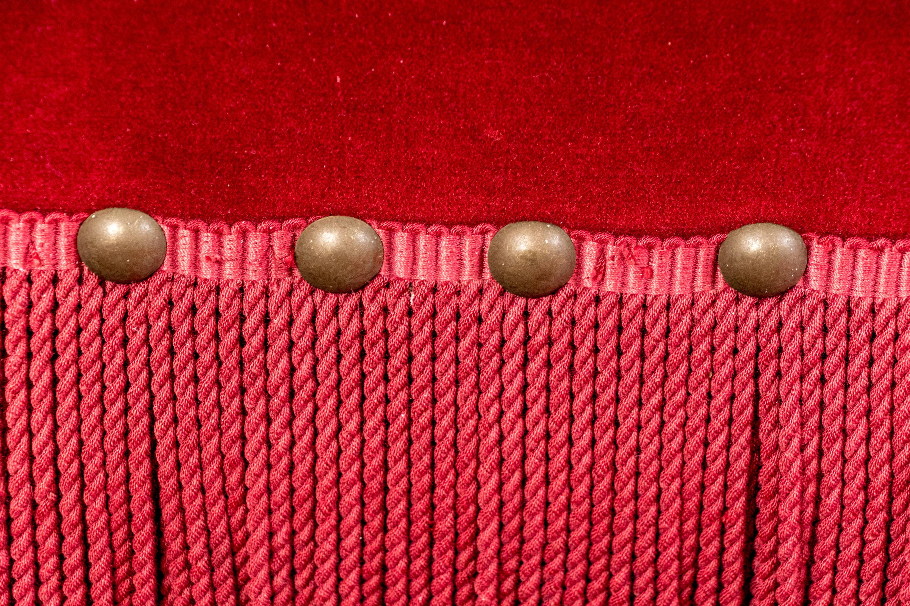 With red fabric upholstered frame with oversize tack nailhead trim with rope twist fringe to conceal the underneath. Single seat cushion with down fill, and a single seat back cushion. Provenance: Purchased at the auction for Gramercy Hotel.