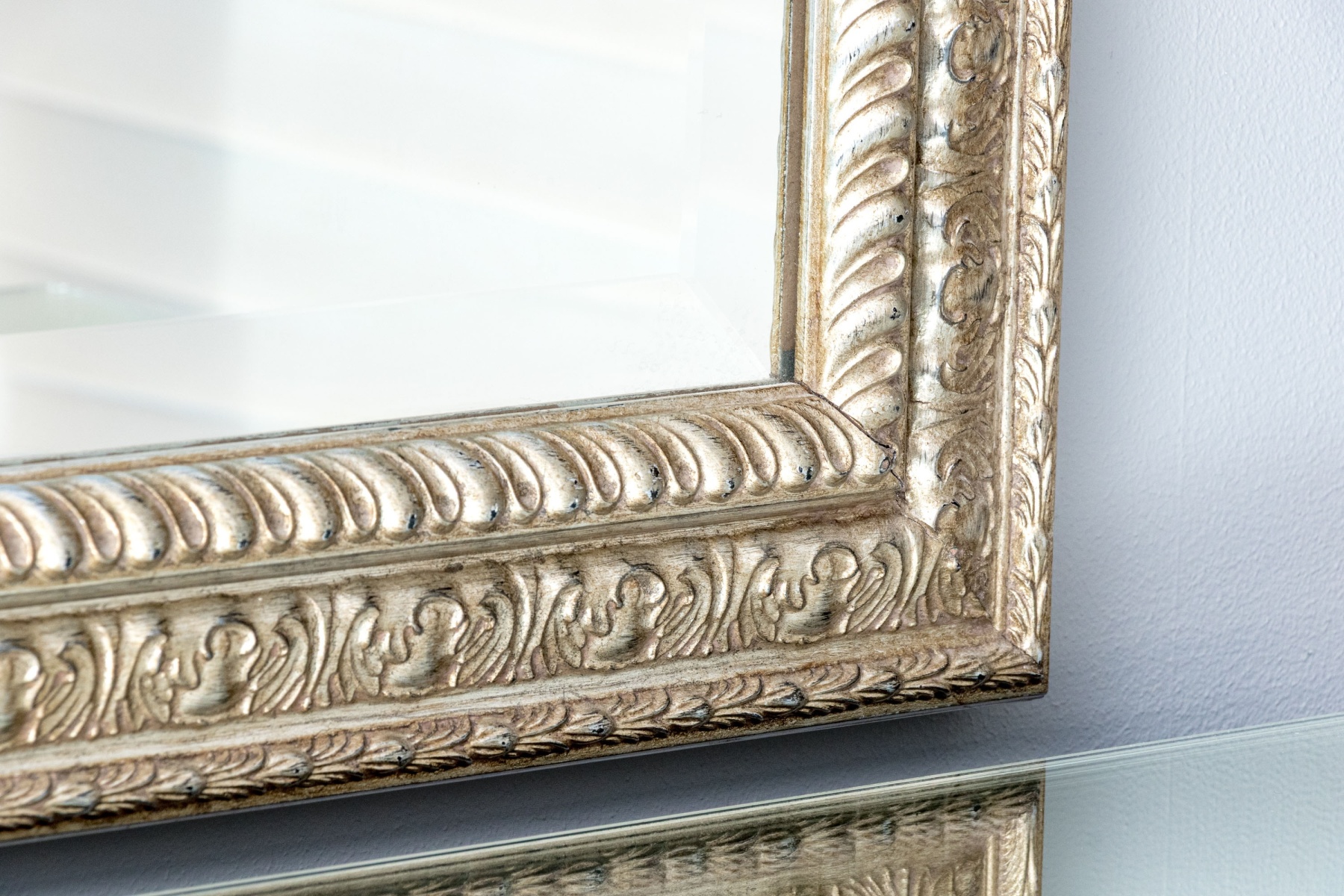 An elegant wall mirror showcasing a tall rectangular beveled plate in a silvered frame with lavishly carved gesso featuring swooping gadroons and foliate relief borders.