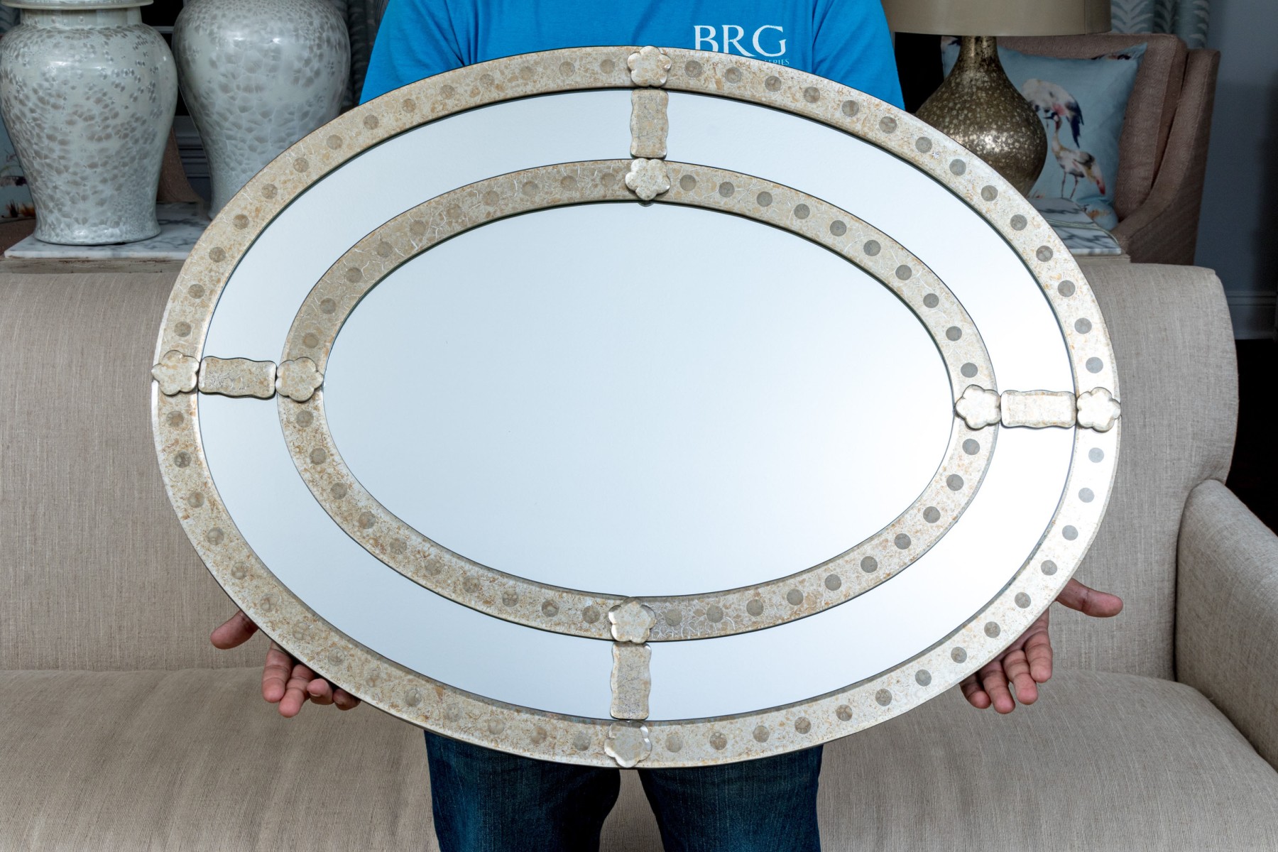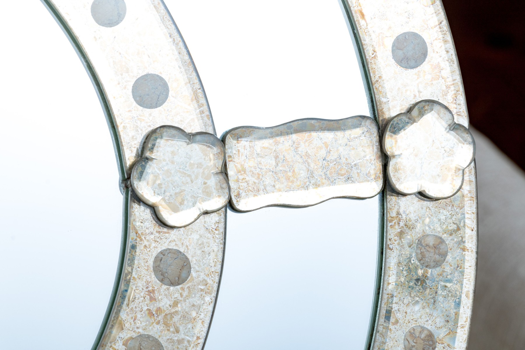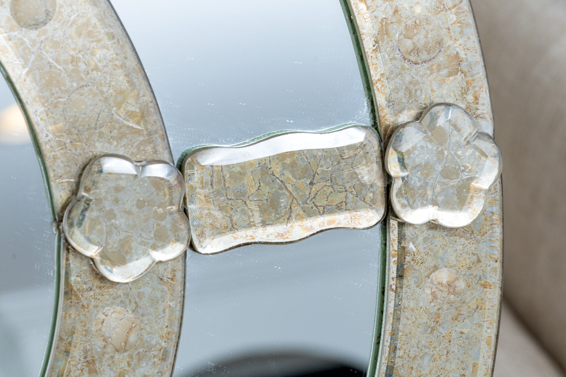 The oval mirror with outer mottled mirror band, along with an inner mottled mirrored band with four connections at each end fitted with floral form mirrored appliqués.