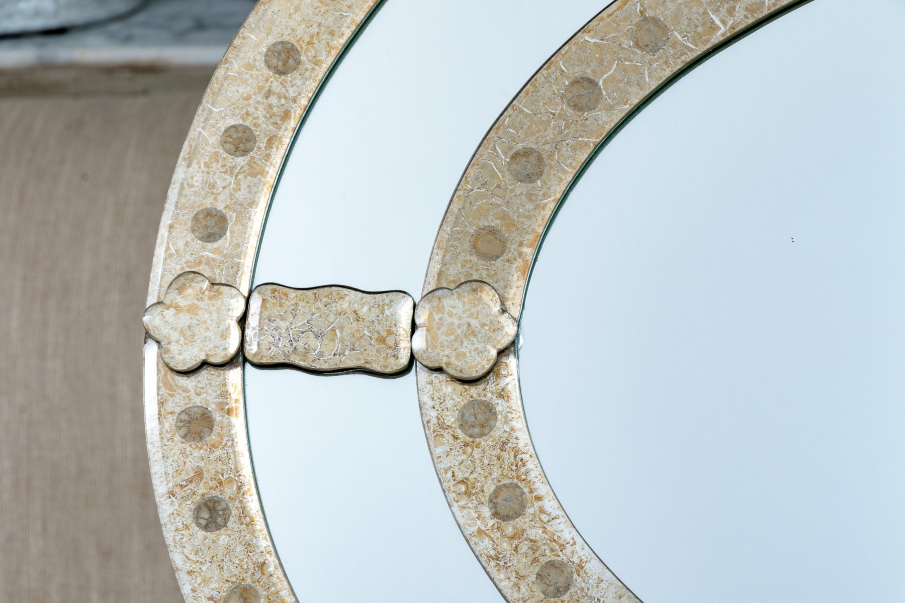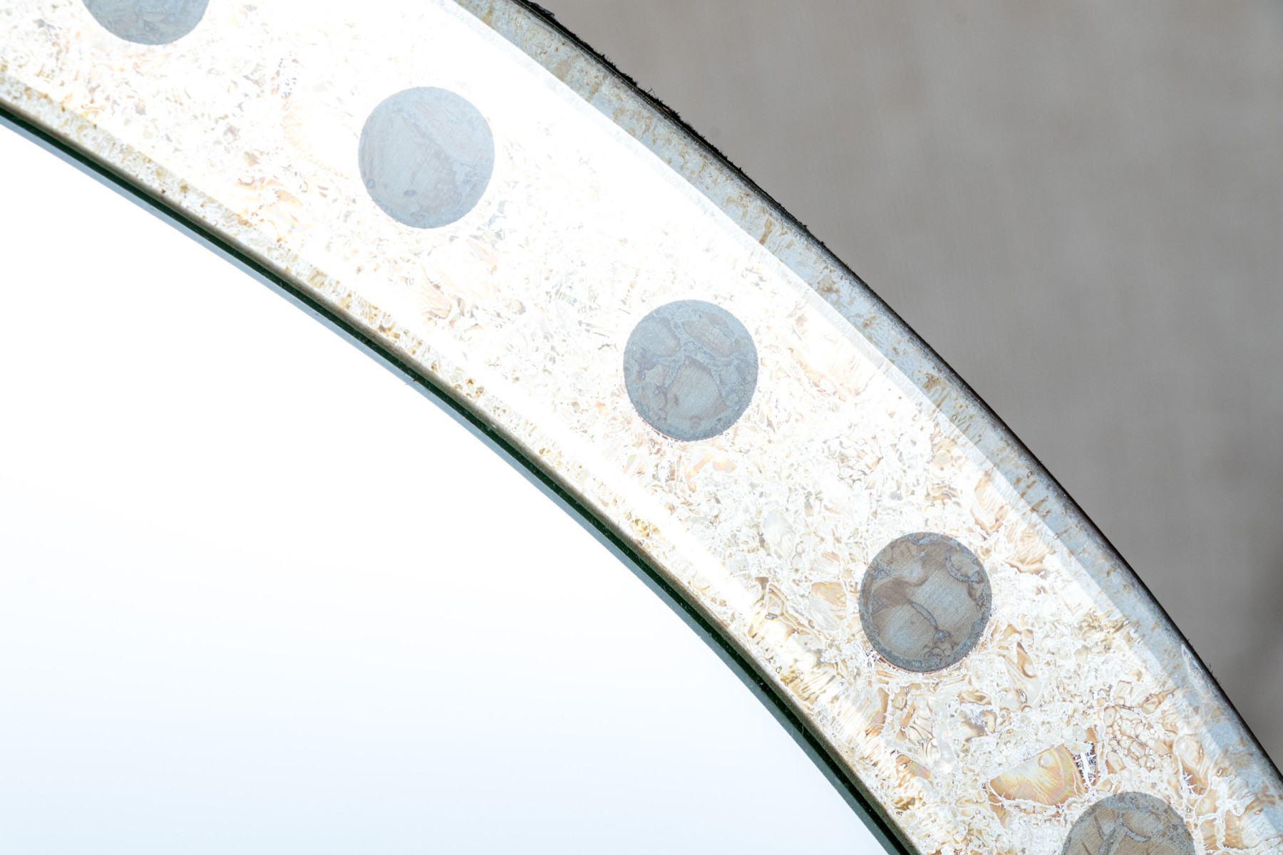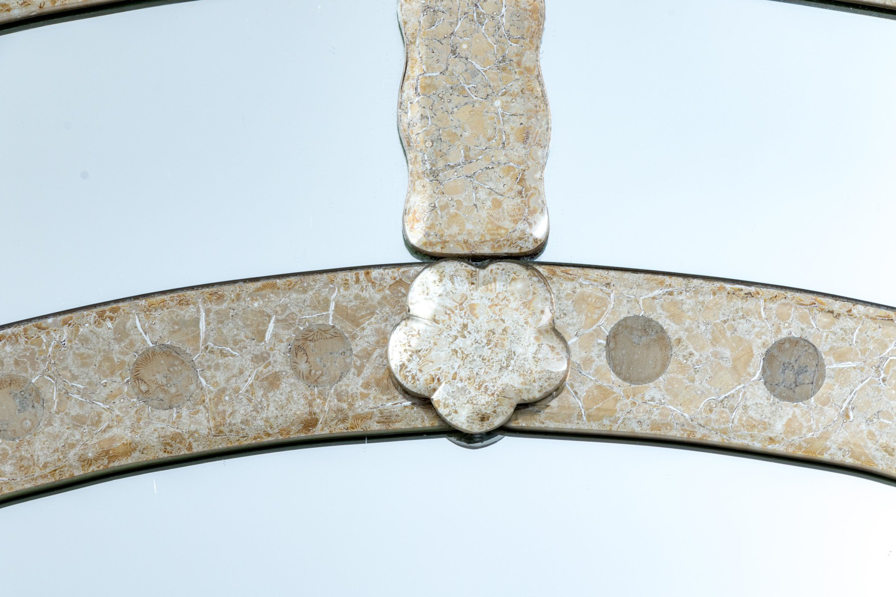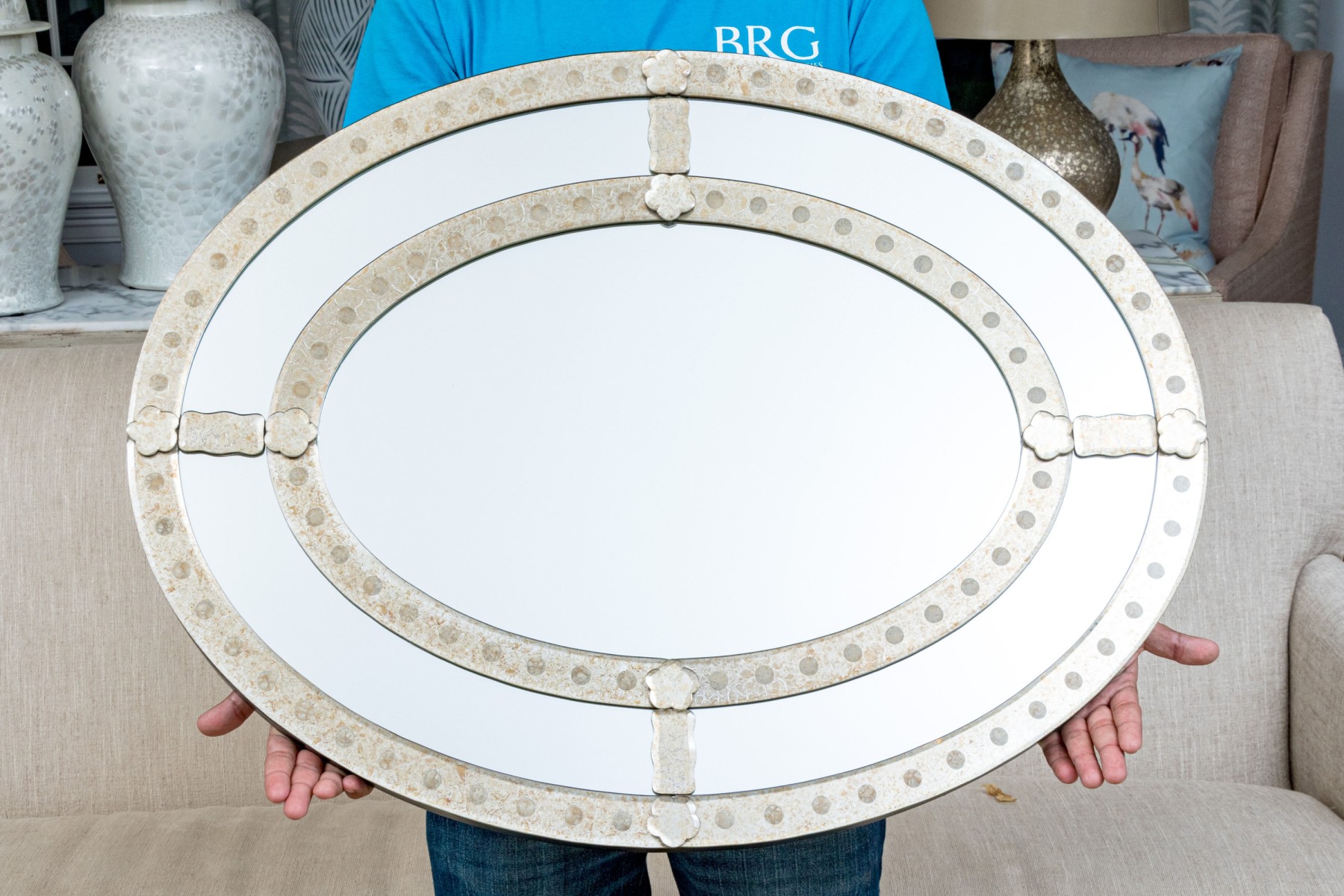 The oval mirror with outer mottled mirror band, along with an inner mottled mirrored band with four connections at each end fitted with floral form mirrored appliqués.