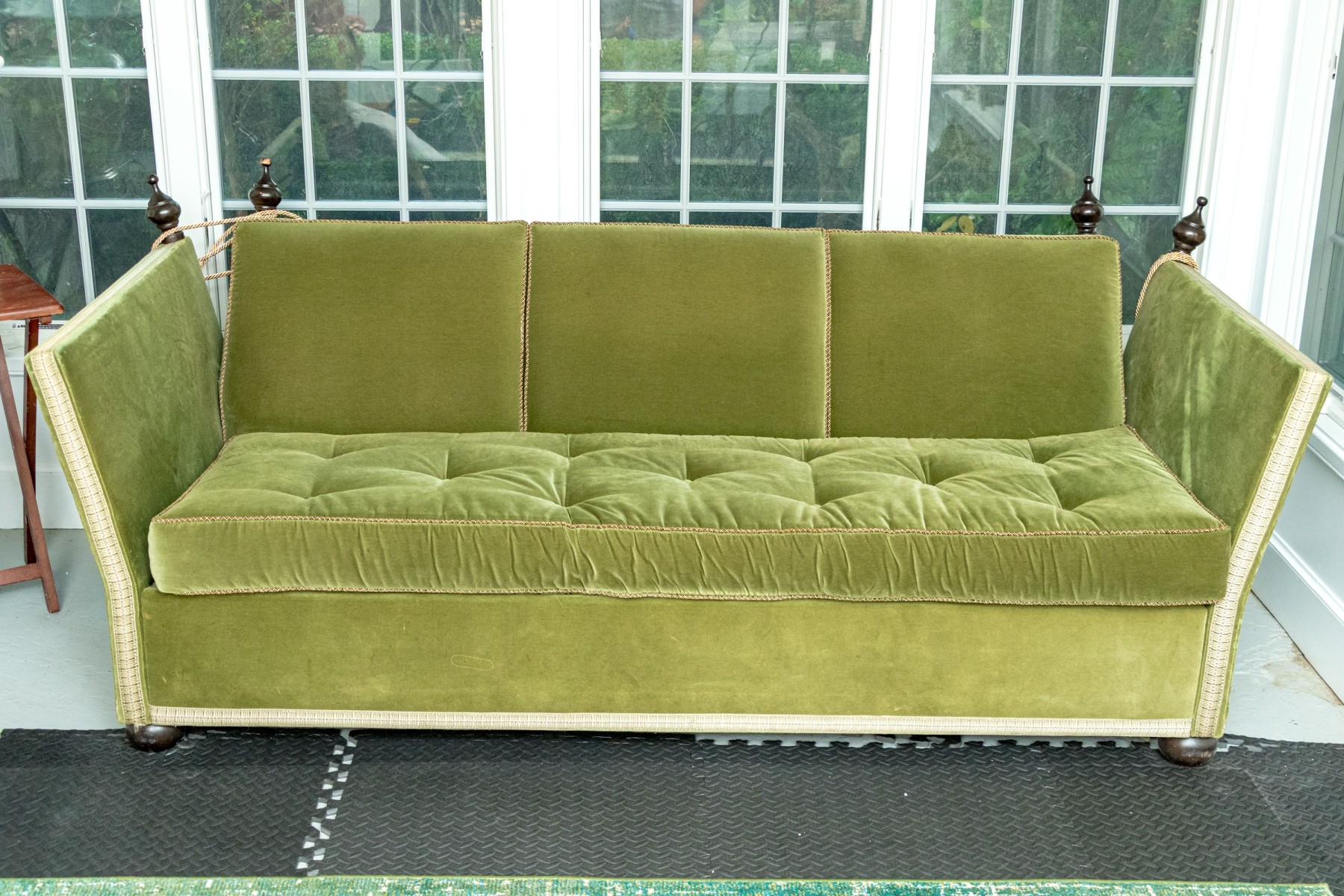 The sofa with four handsomely carved and finished finials which can be screwed in and taken out, the finials can be found to the back of each arm and sides of each end of the seat back top rail, with tassels. Raised on carved and finished bun form feet with accent trim to the base rail and arm fronts. With single loose upholstered seat cushion with piped trim, three loose upholstered seat cushions and pair of accent pillows. A pull out bed folds within.