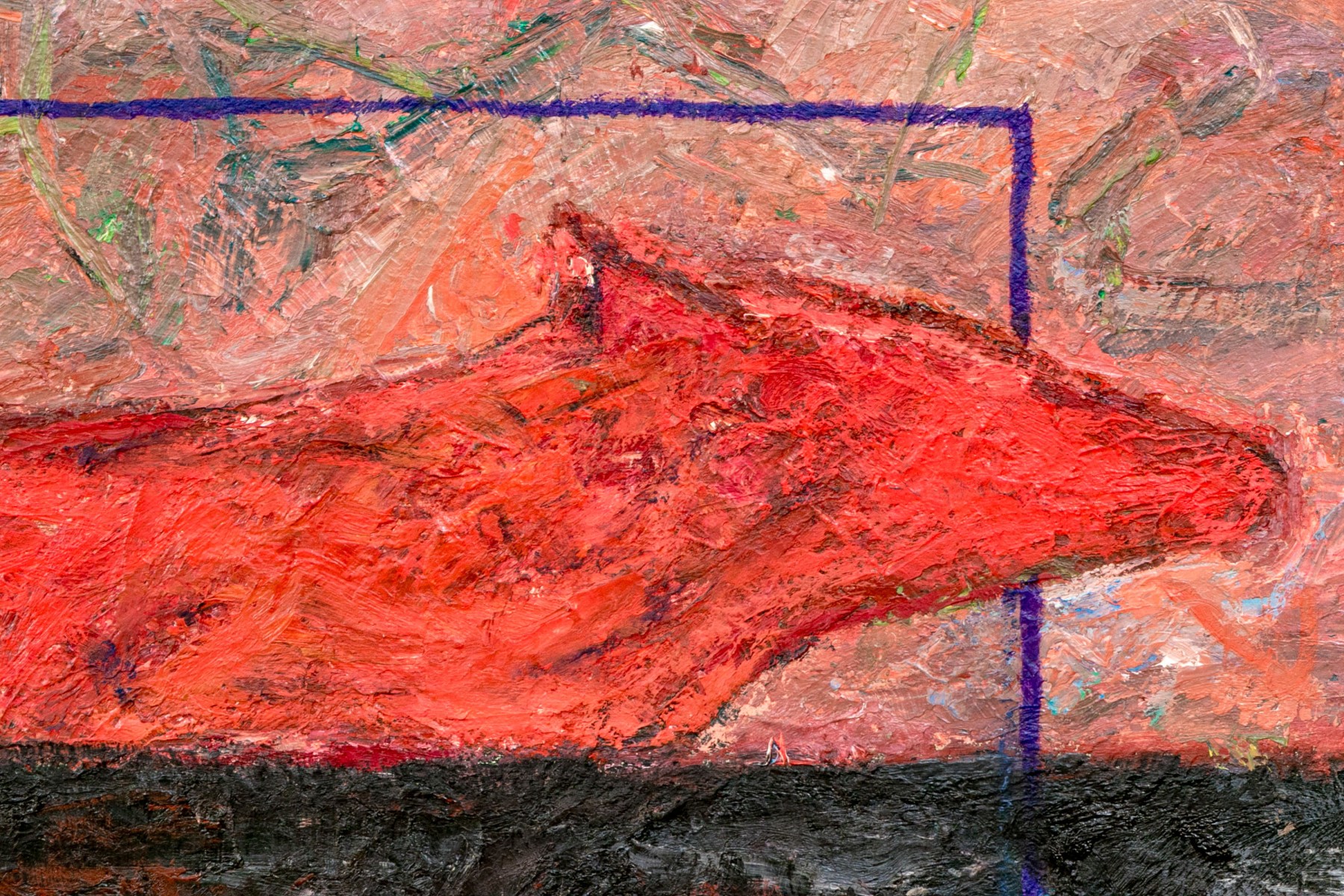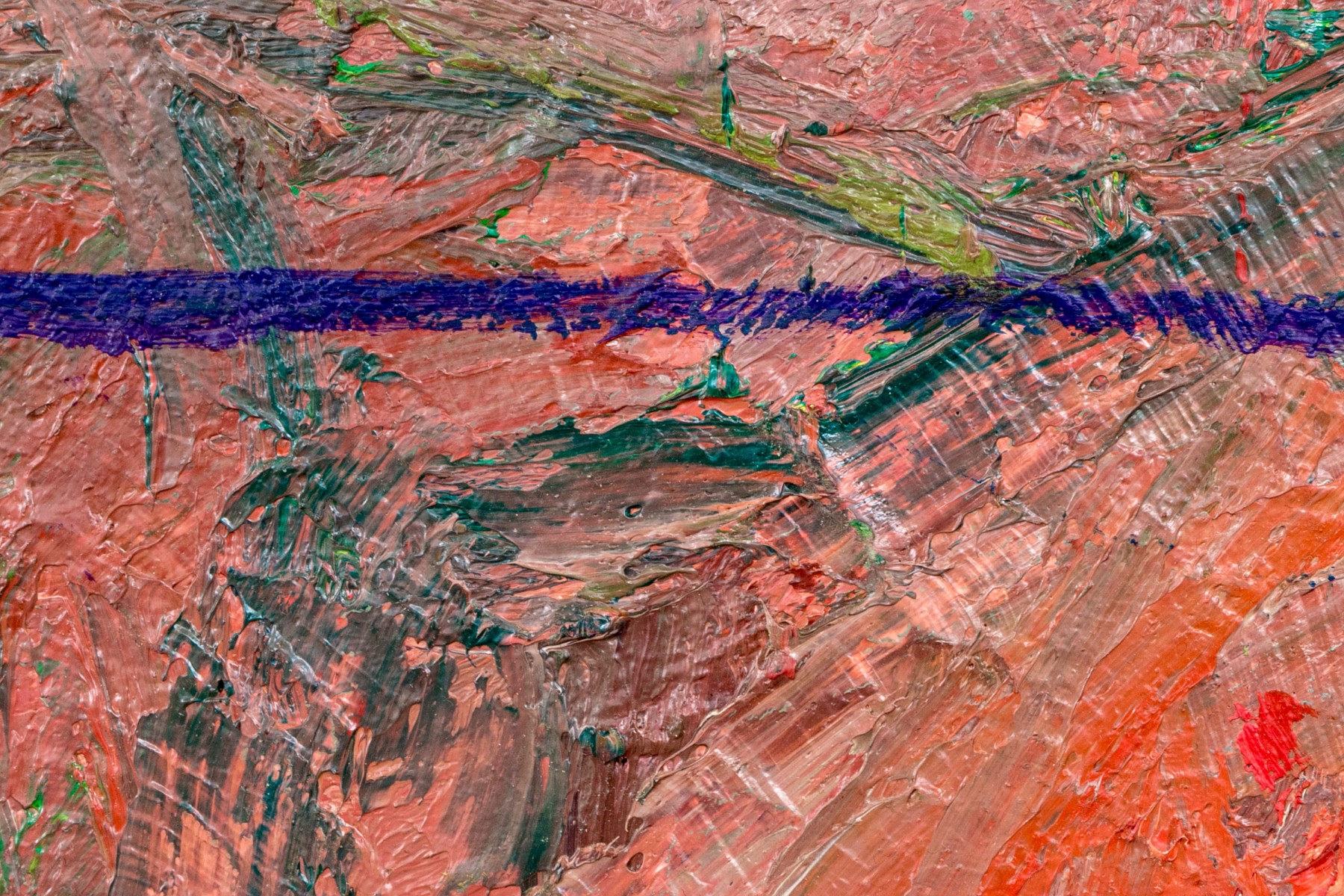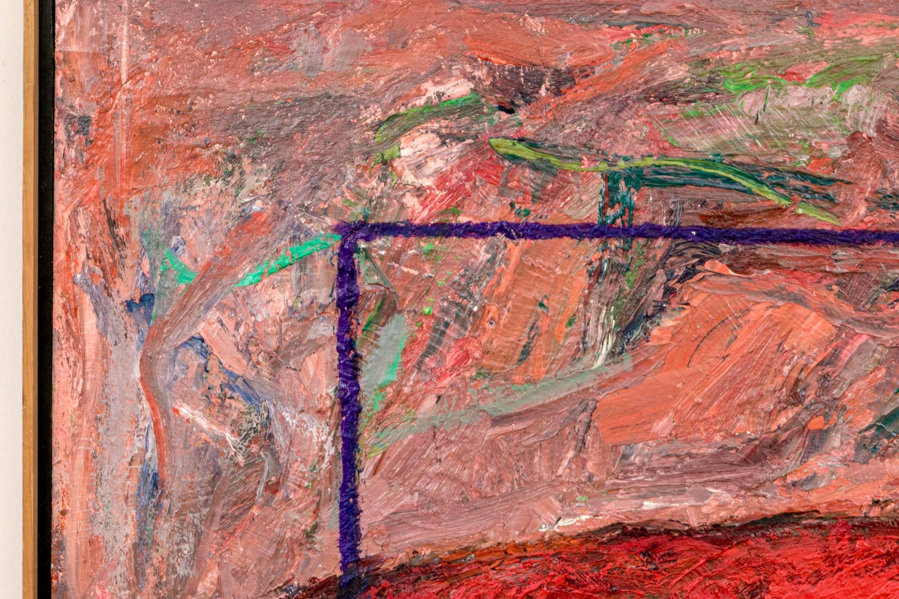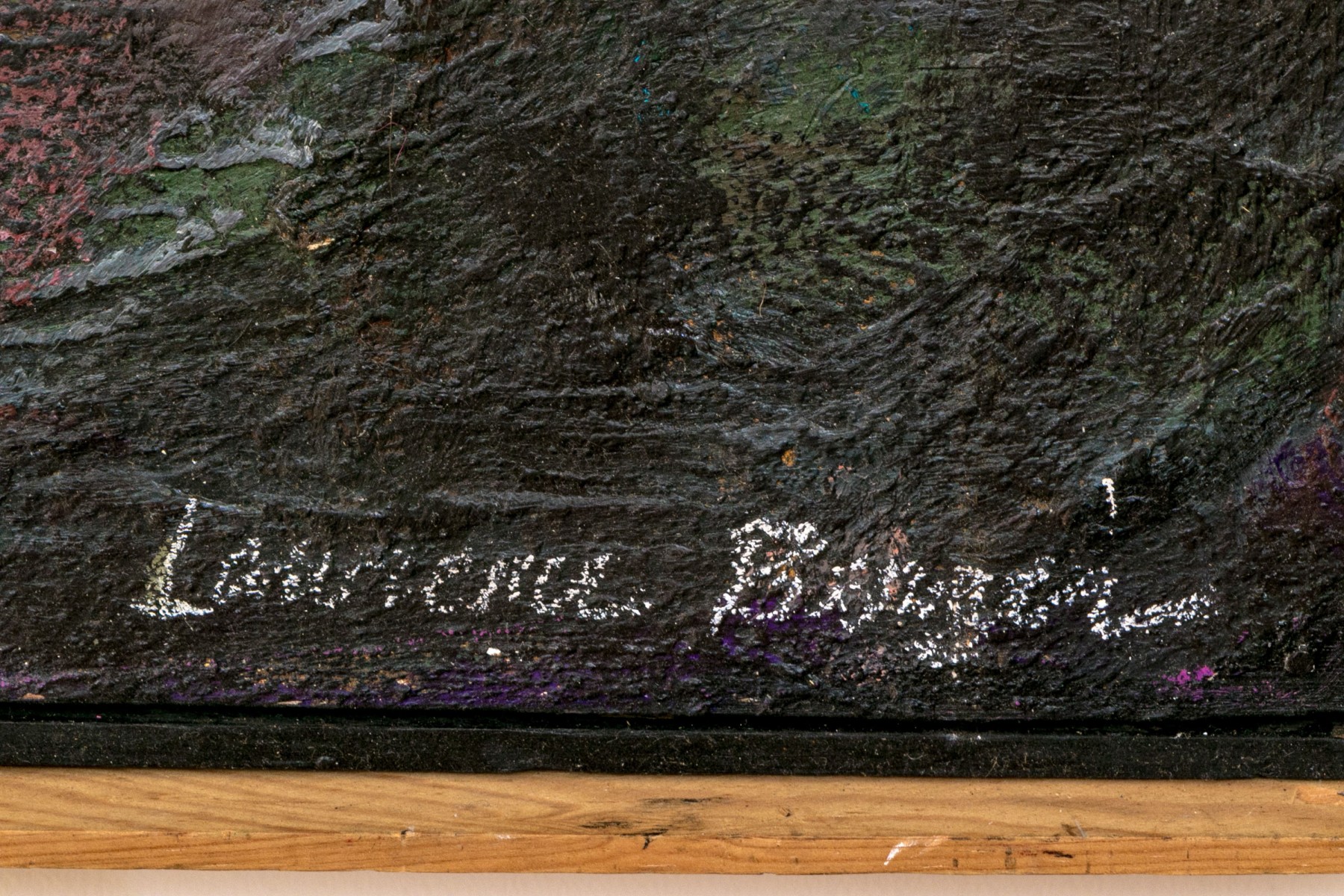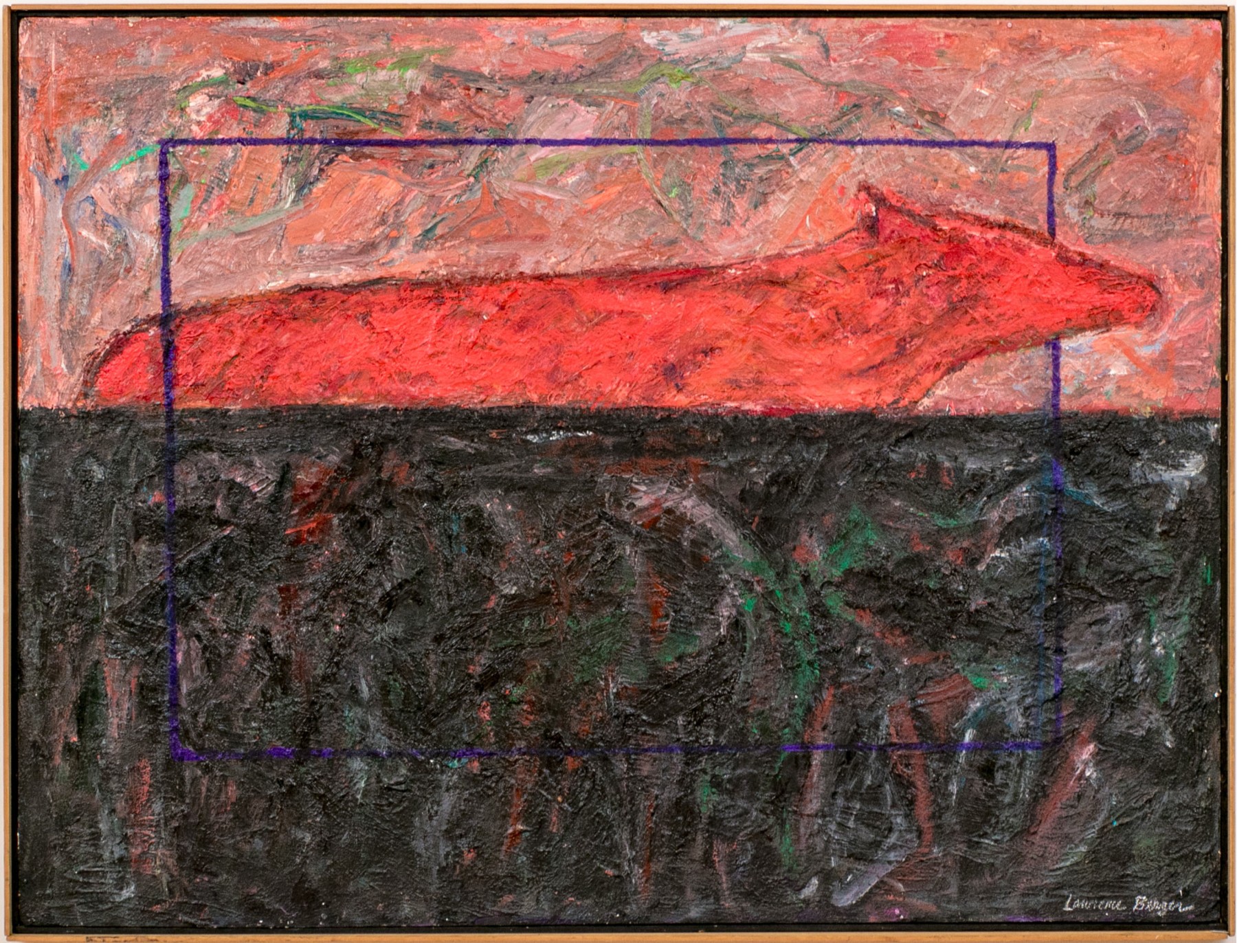 Abstract expressionist painting with heavy impasto lending a textural quality with simple wood frame.
