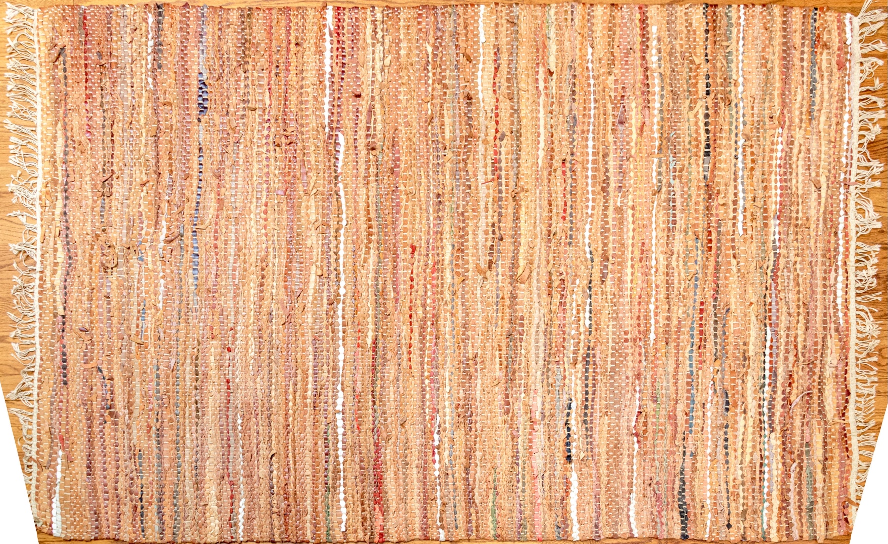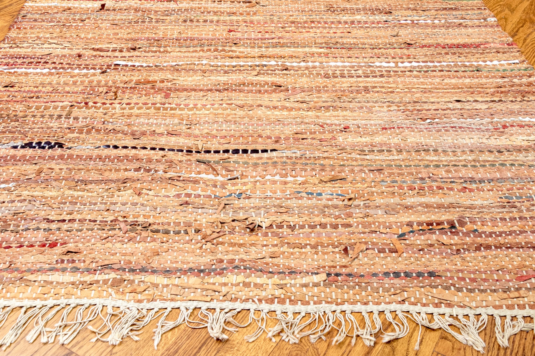 A stylish chindi dhurrie accent rug incorporating strips of colorful fabric and leather in earthy and autumnal hues for great texture and visual interest. Finished with fringes on the short sides.