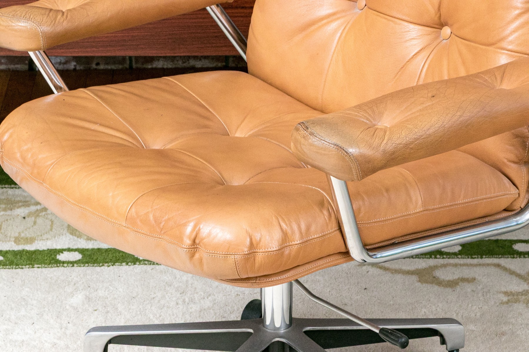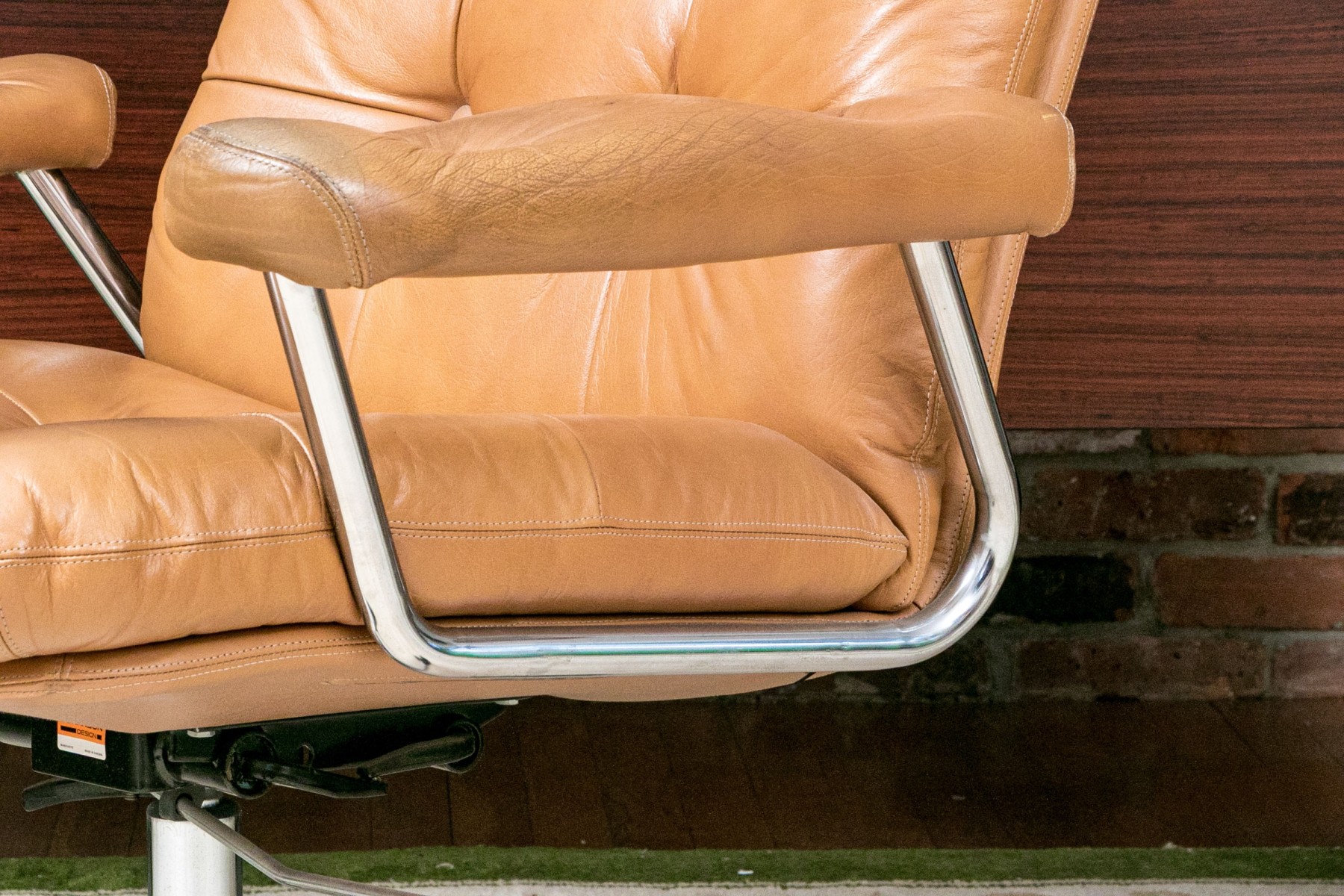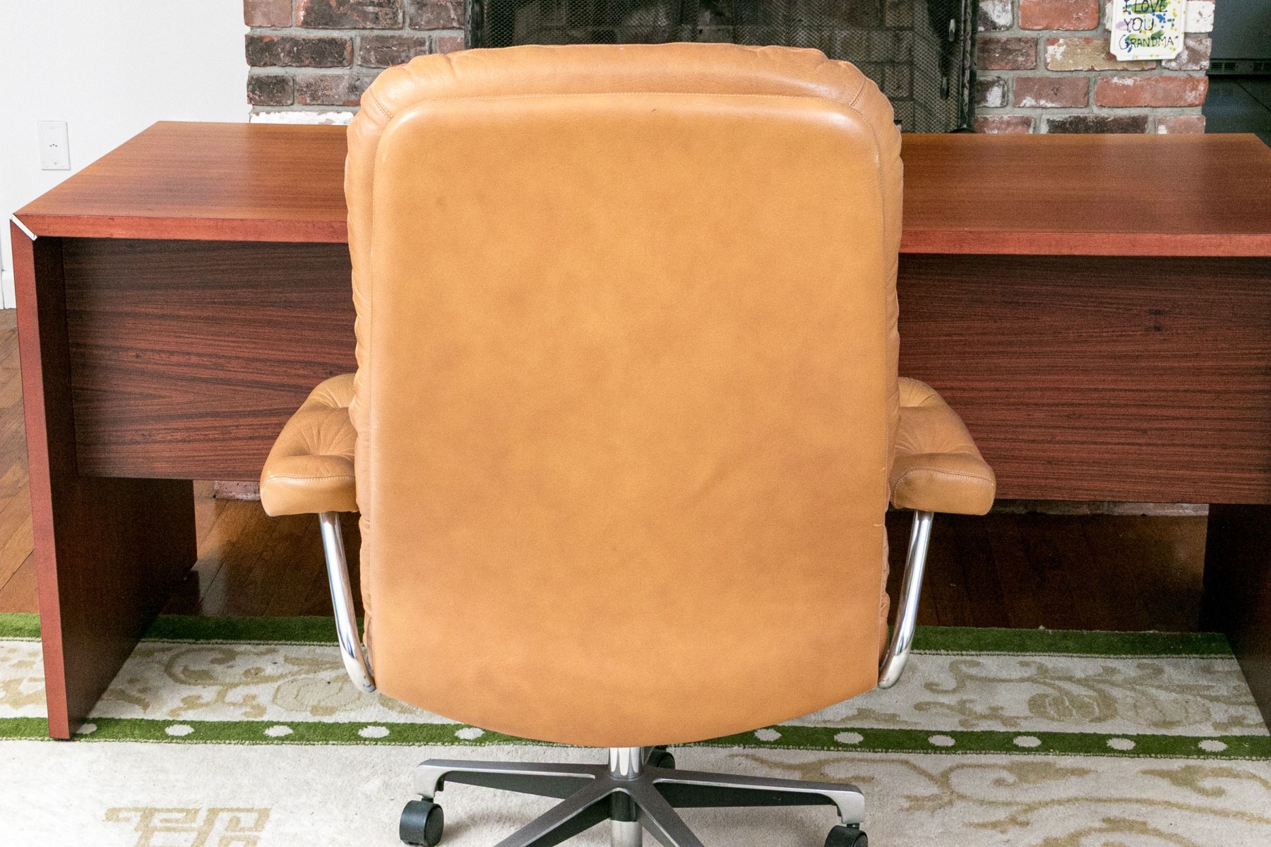 A handsome executive office chair sporting a distinguished mid-century Italian style. The tall, gently reclined back and subtly contoured seat are upholstered in orange-brown leather for a pop of color. Upholstered arms follow suit, supported by chrome rods that compliment an adjustable column on a five-spoked base with casters.