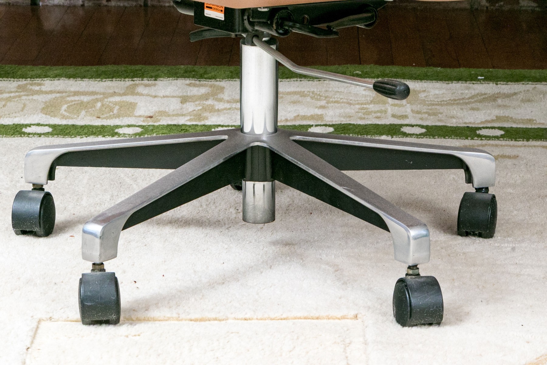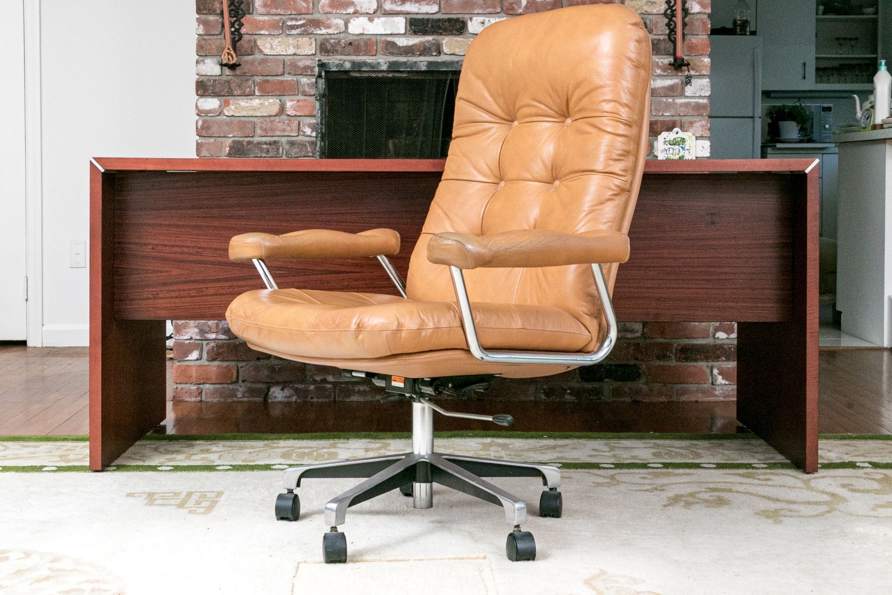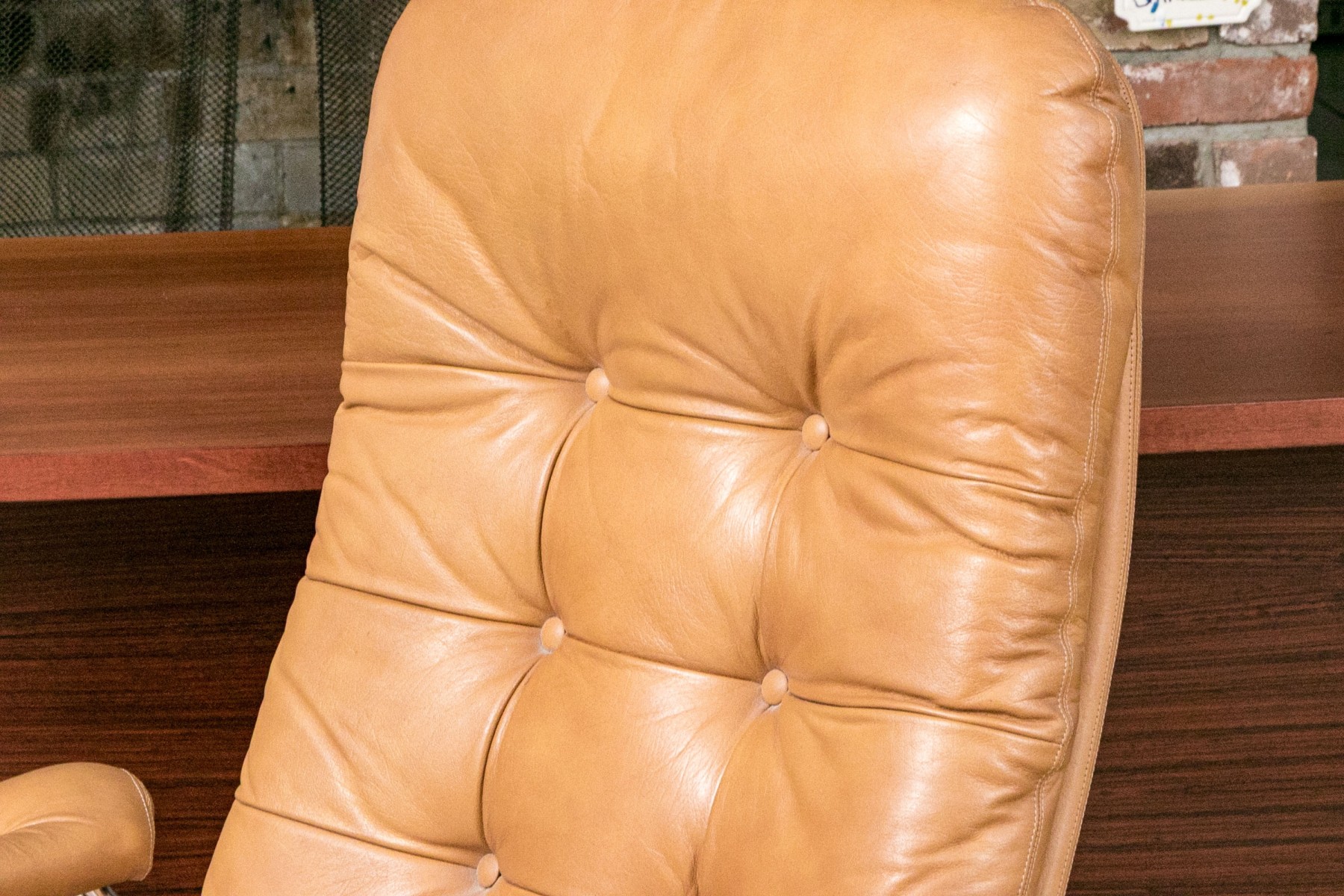 A handsome executive office chair sporting a distinguished mid-century Italian style. The tall, gently reclined back and subtly contoured seat are upholstered in orange-brown leather for a pop of color. Upholstered arms follow suit, supported by chrome rods that compliment an adjustable column on a five-spoked base with casters.