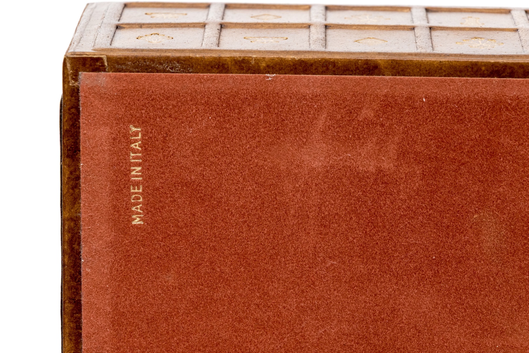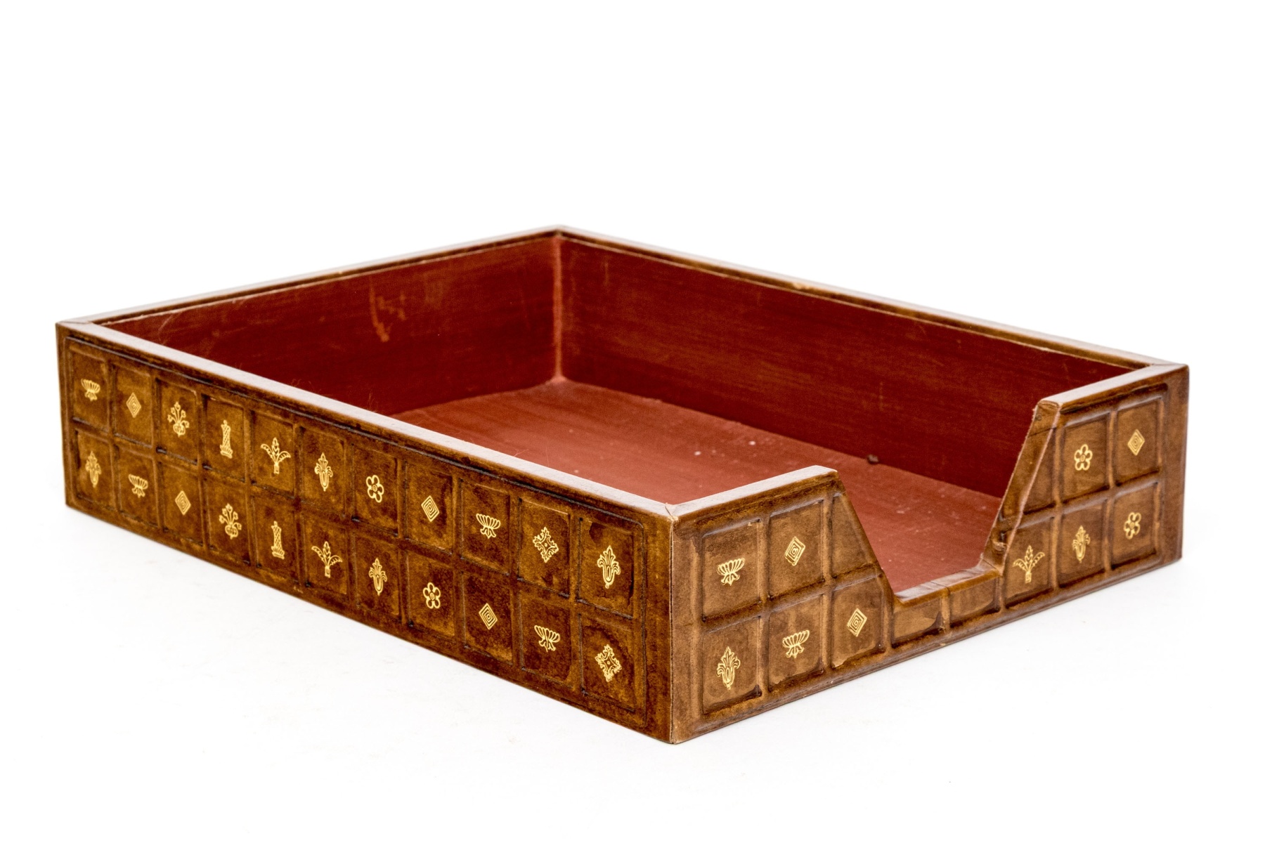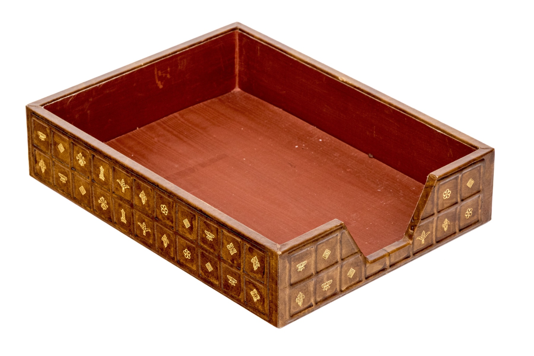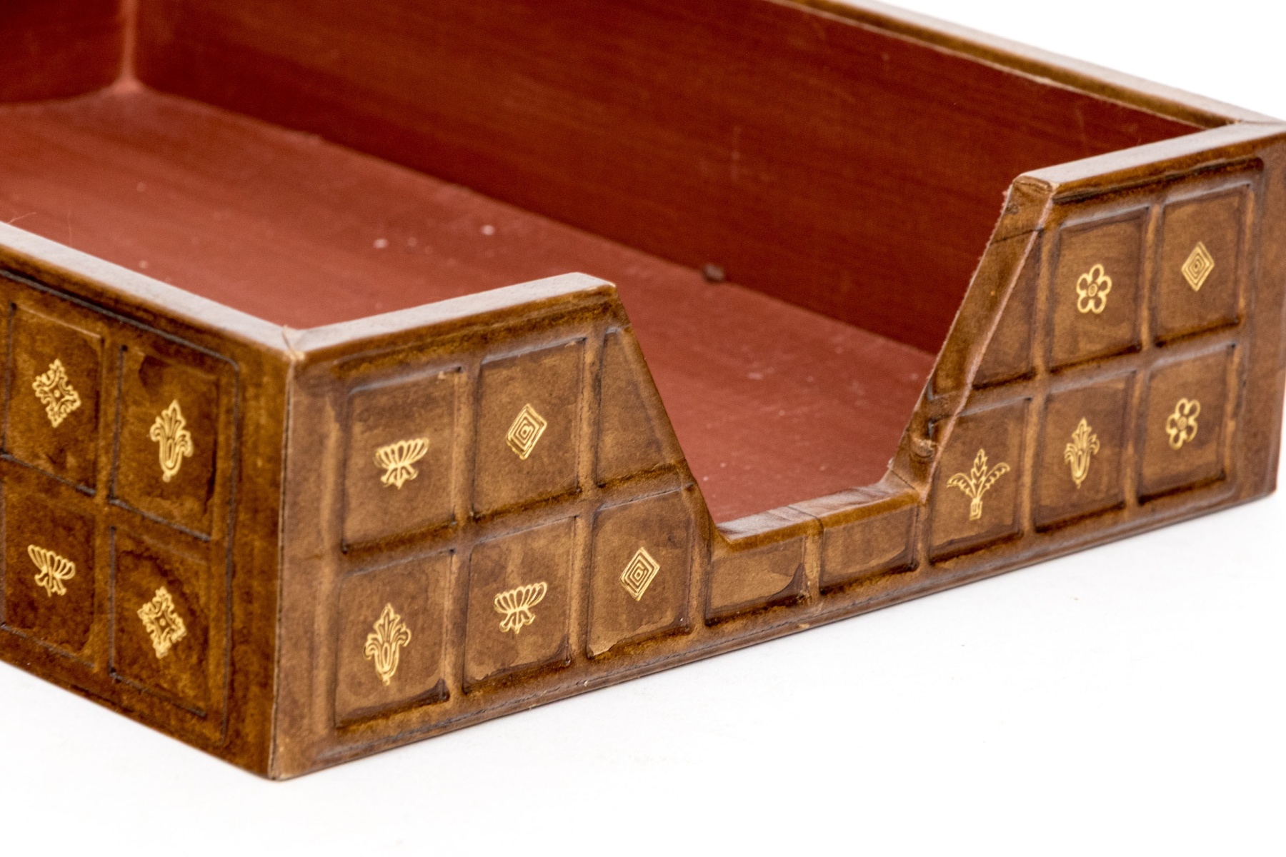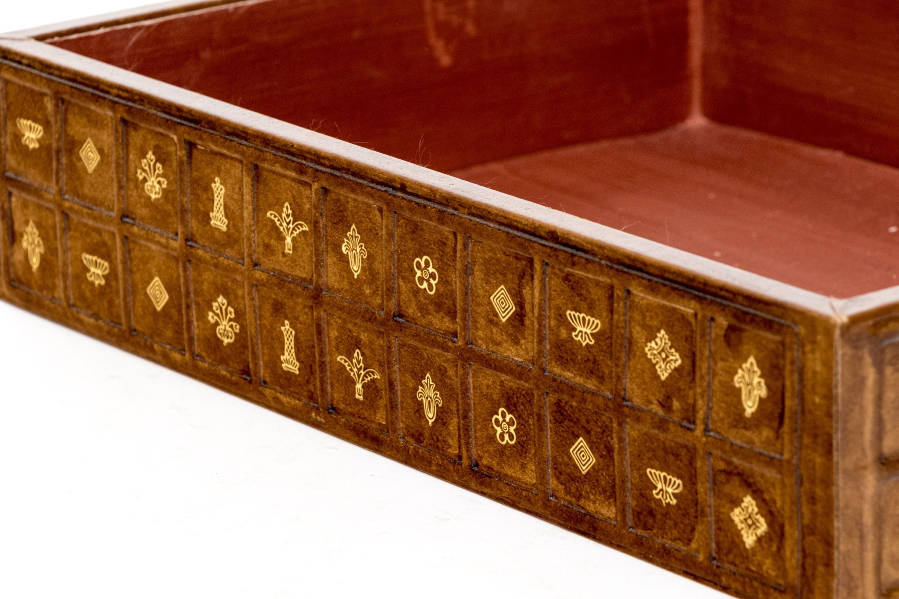 A handsome document box perfect for traditional and stately offices, showcasing a brown leather wrapped exterior with square motifs tooled with gilt symbols. Painted red-brown on the interior.