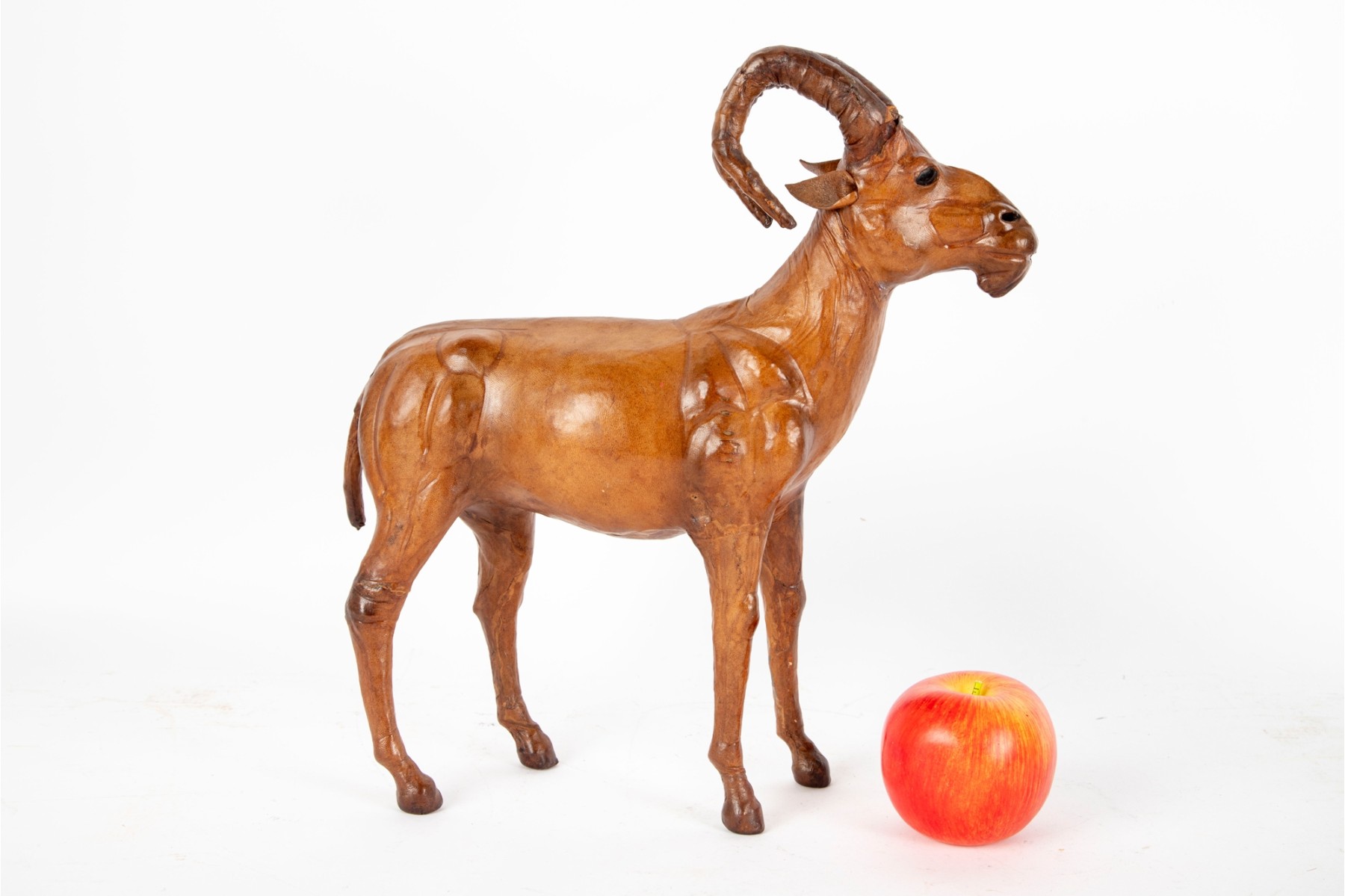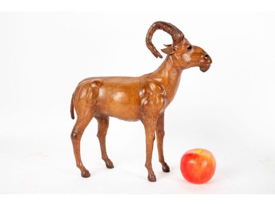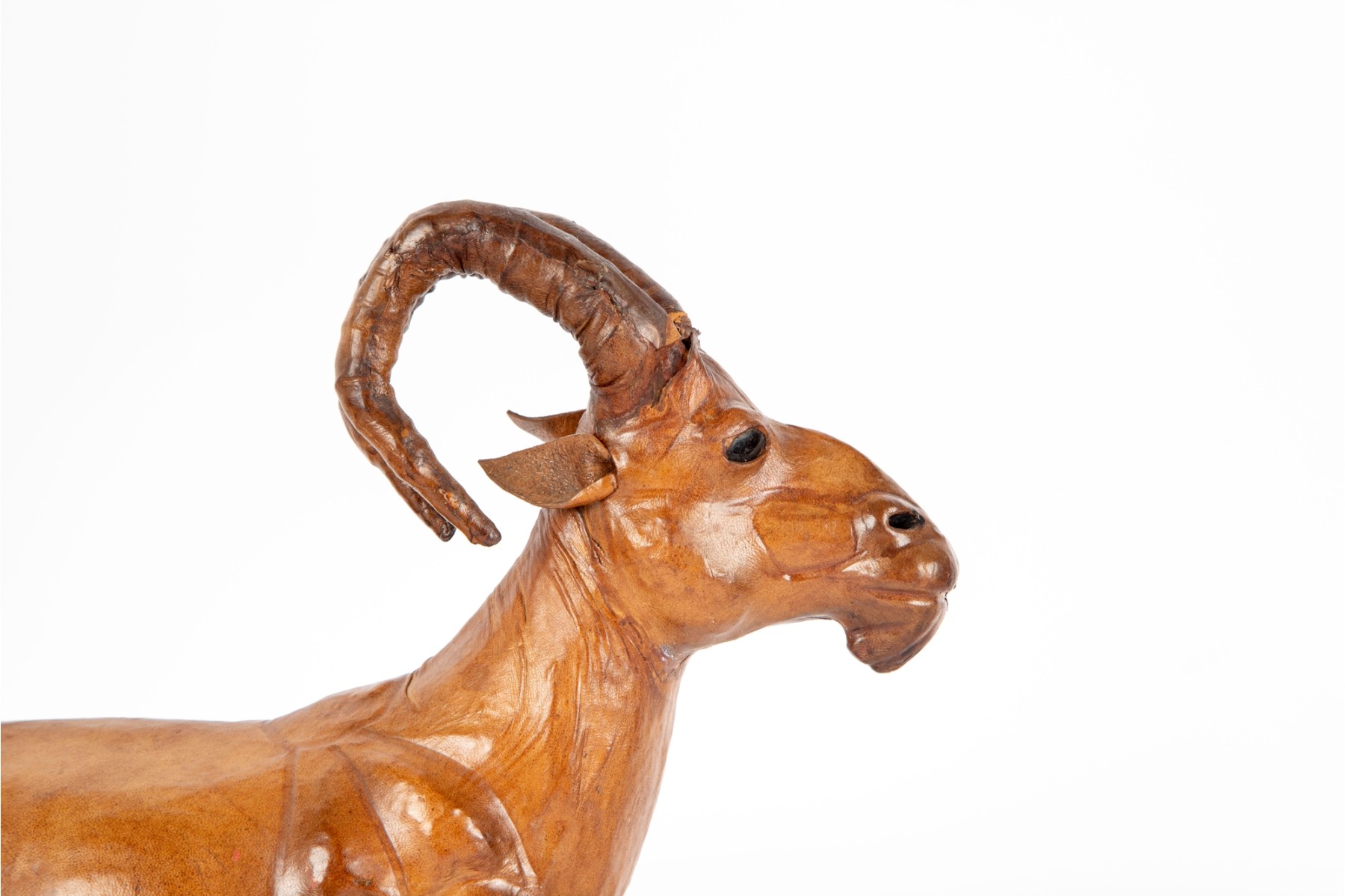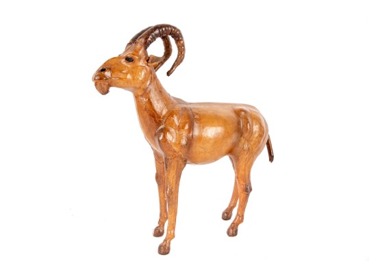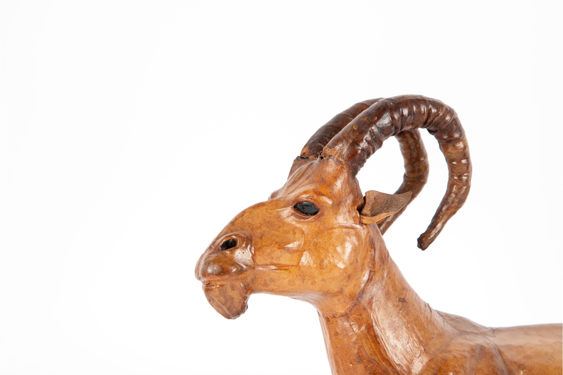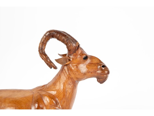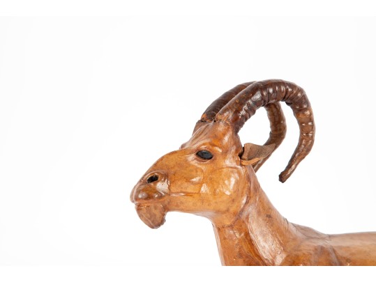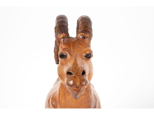 A wonderful leather wrapped figure of a goat with impressive ridged horns curling backwards, nicely detailed throughout the face in a polished warm light brown hue.