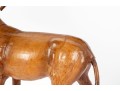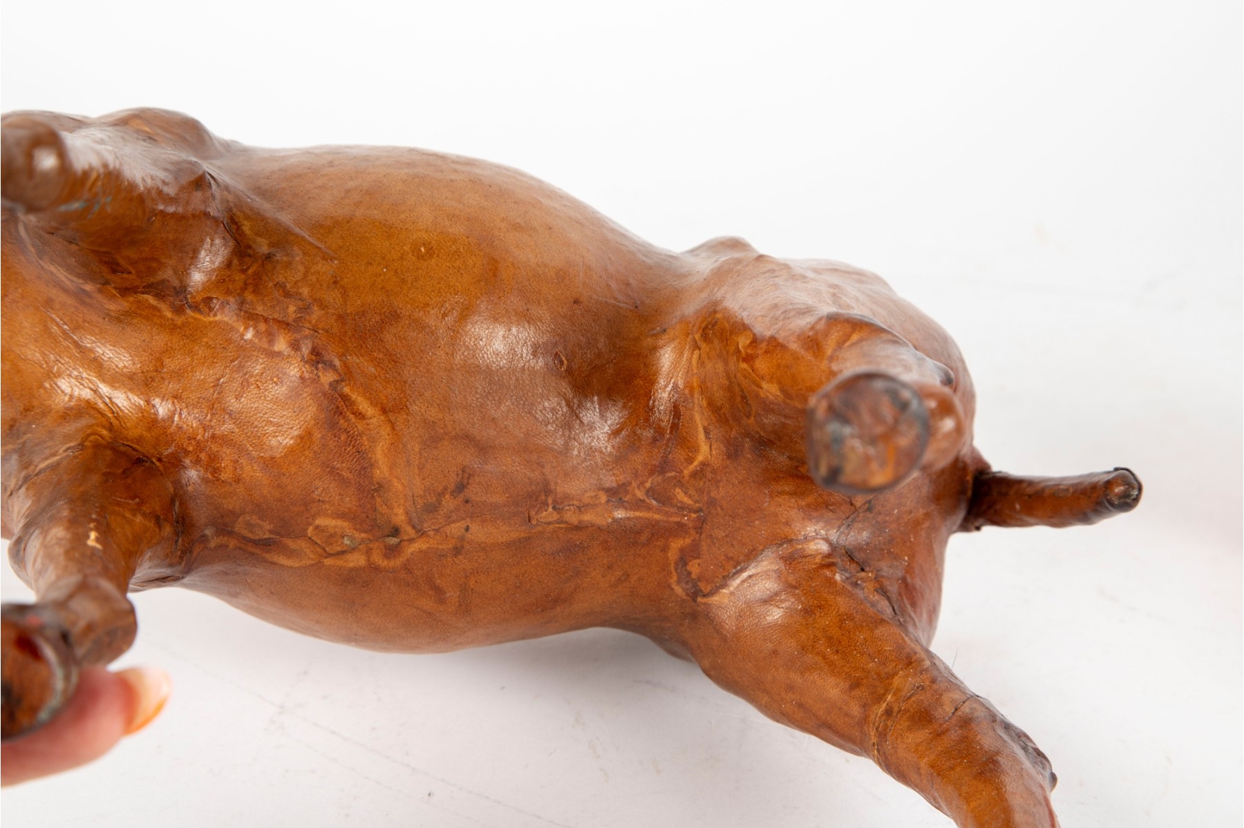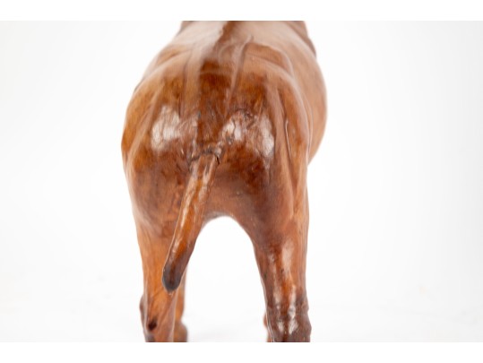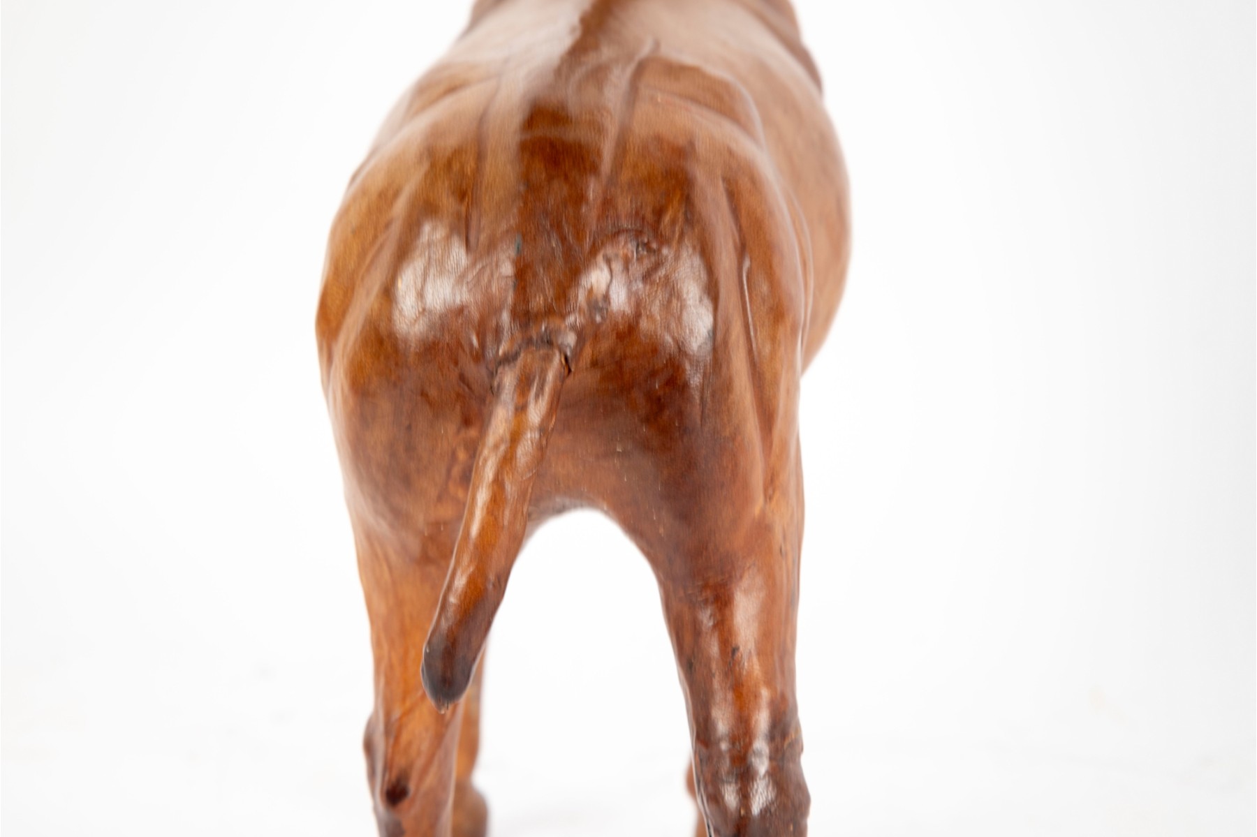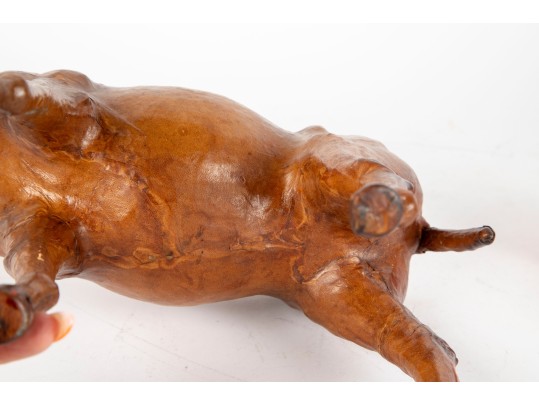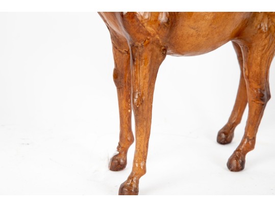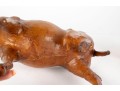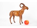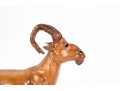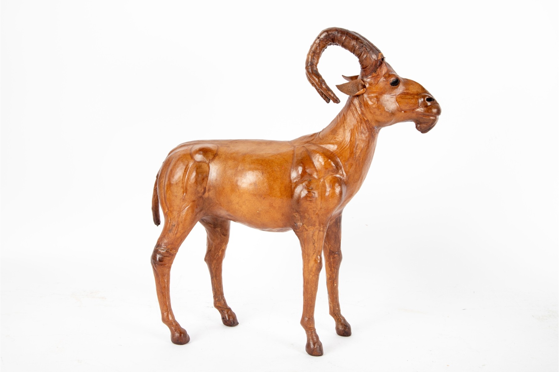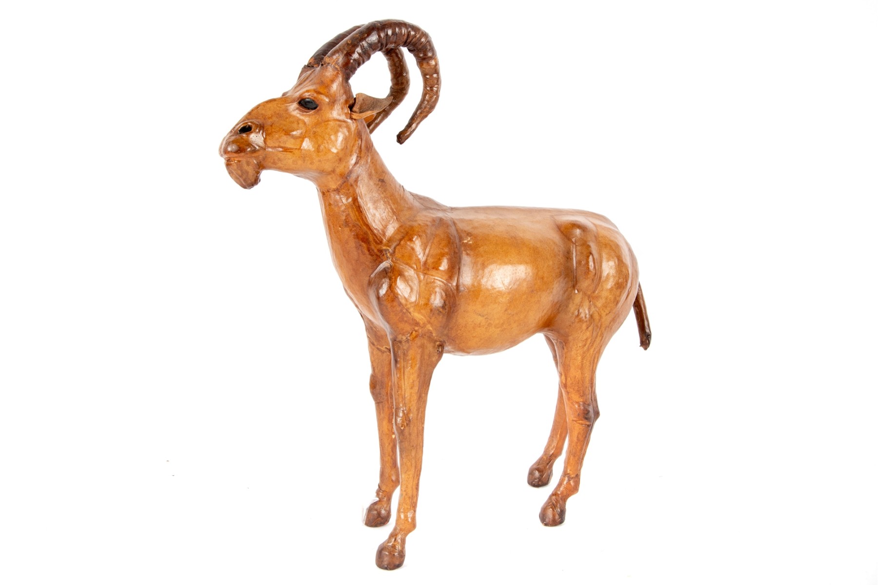 A wonderful leather wrapped figure of a goat with impressive ridged horns curling backwards, nicely detailed throughout the face in a polished warm light brown hue.
