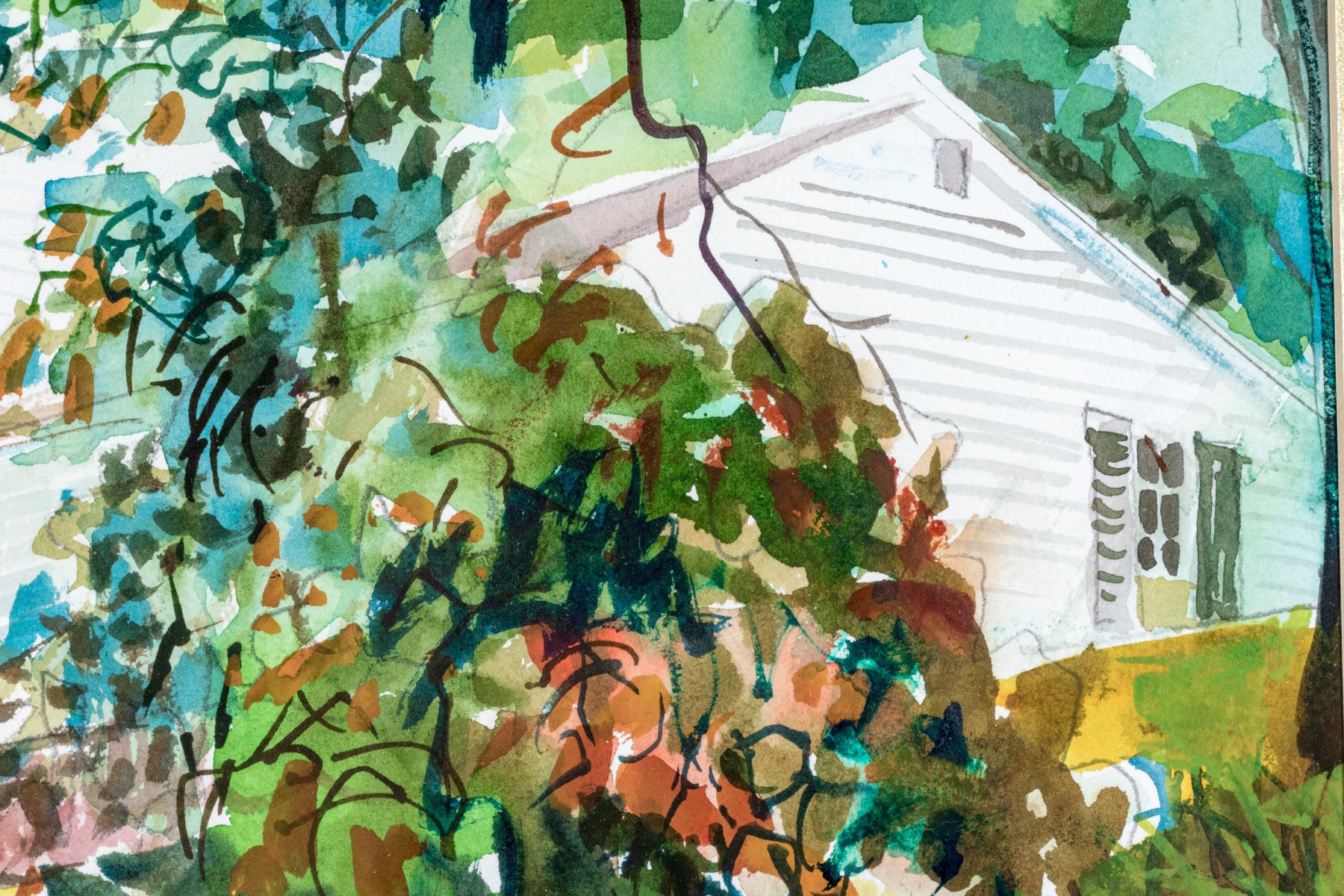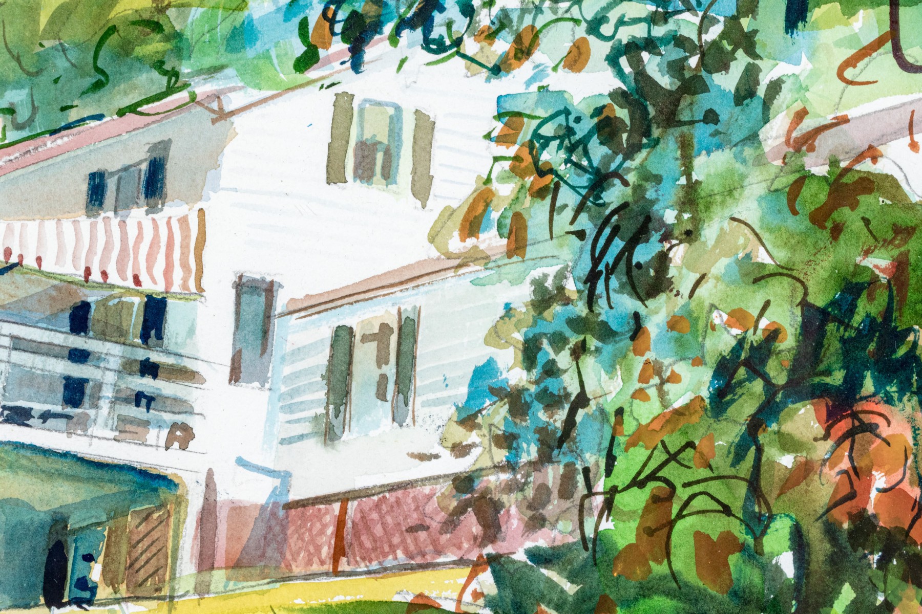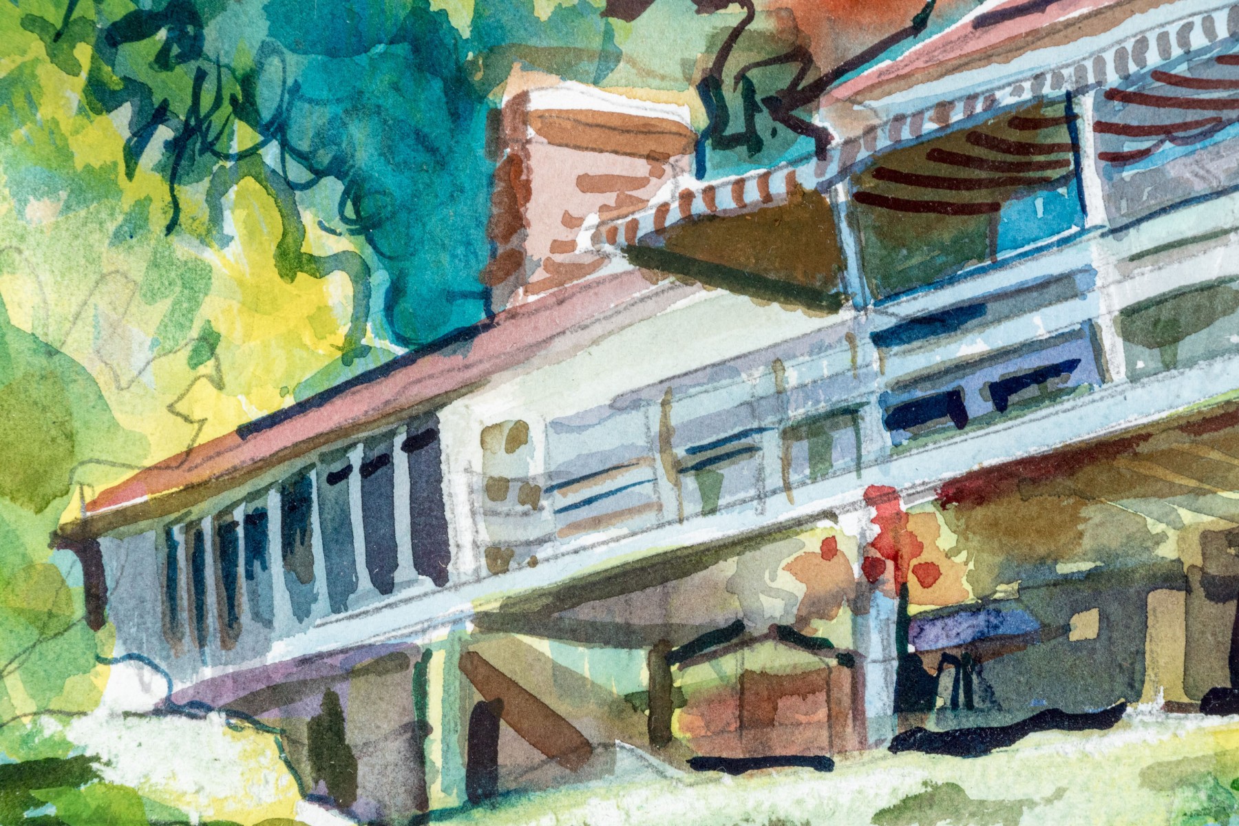 Signed lower right. A large scale white mansion on a hill with lush colorful grounds. Presented in a gilt frame with glass.