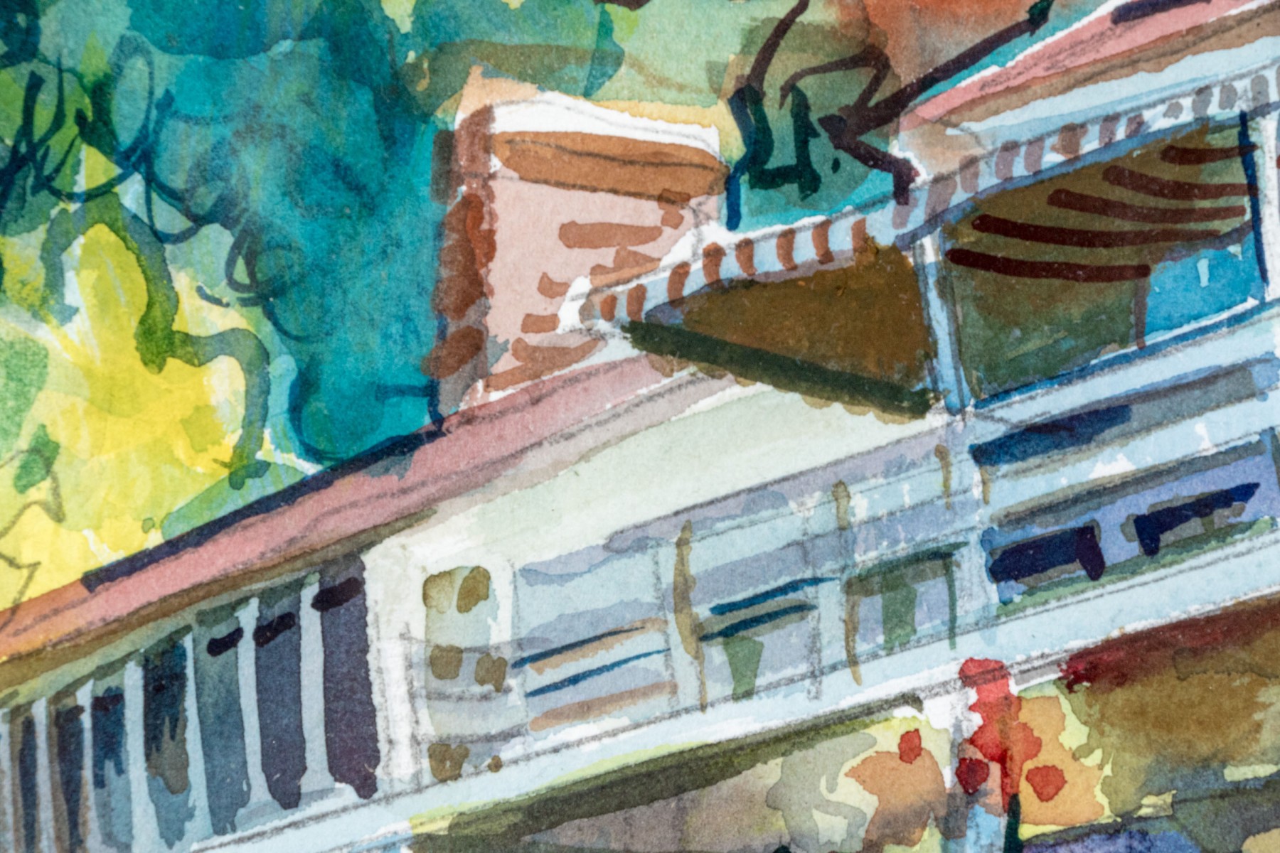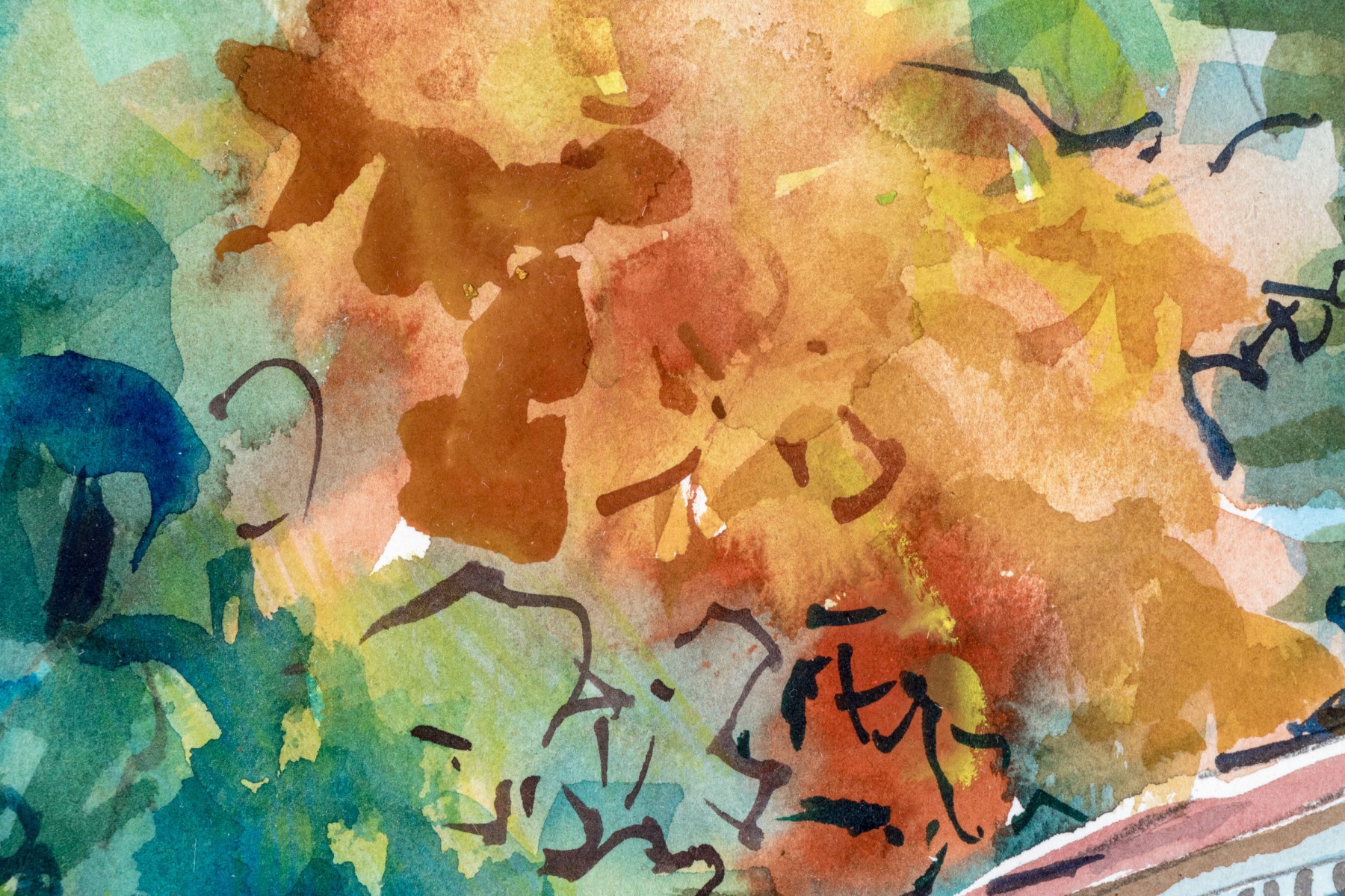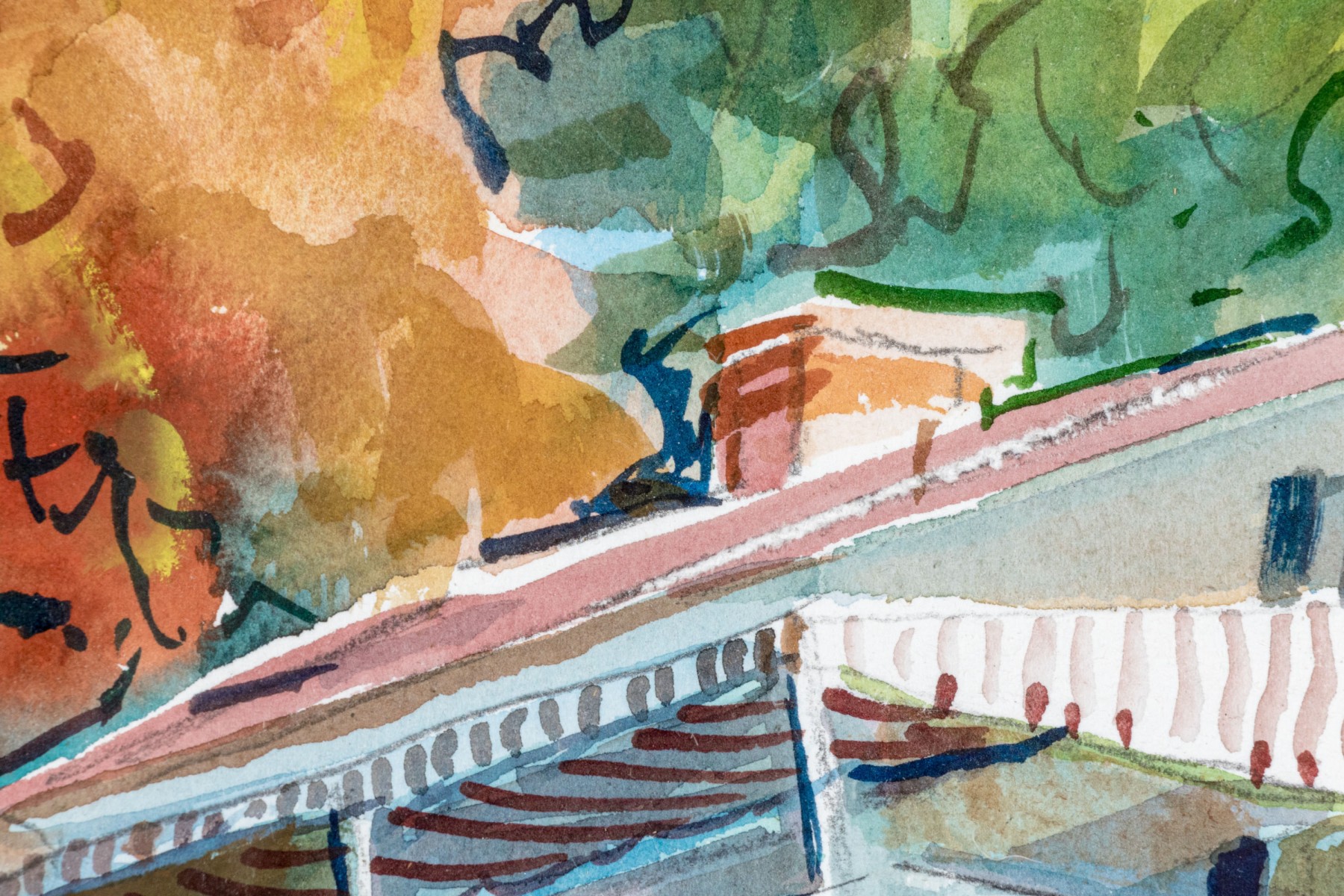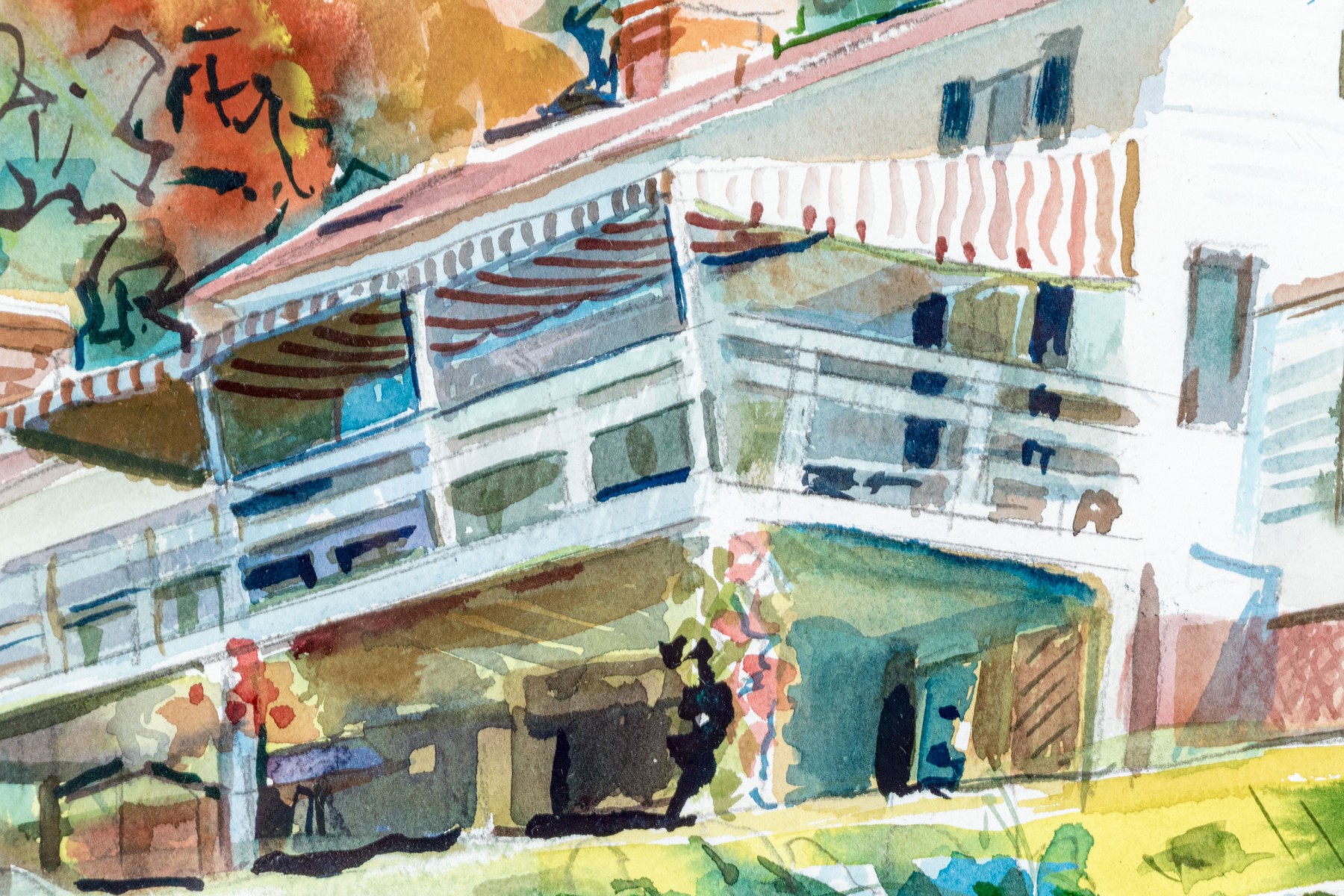Signed lower right. A large scale white mansion on a hill with lush colorful grounds. Presented in a gilt frame with glass.