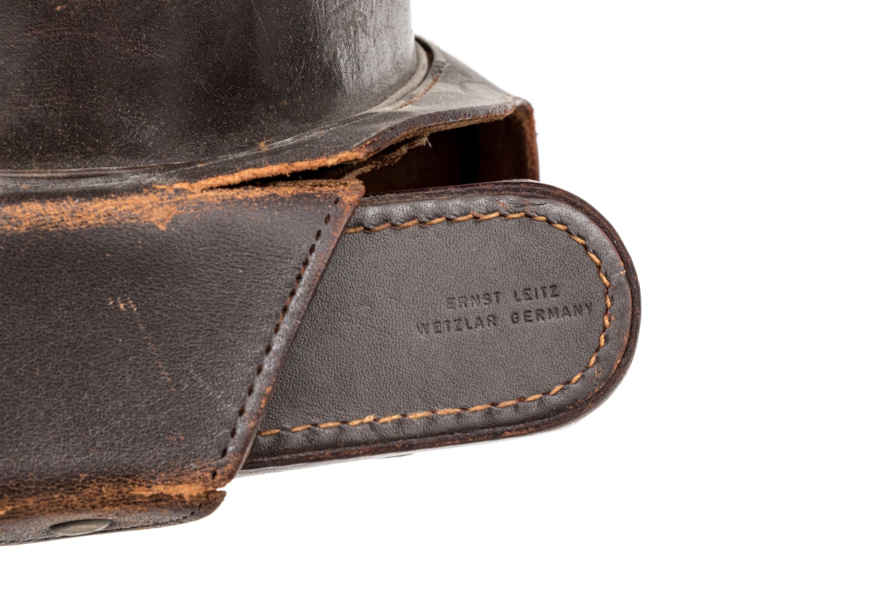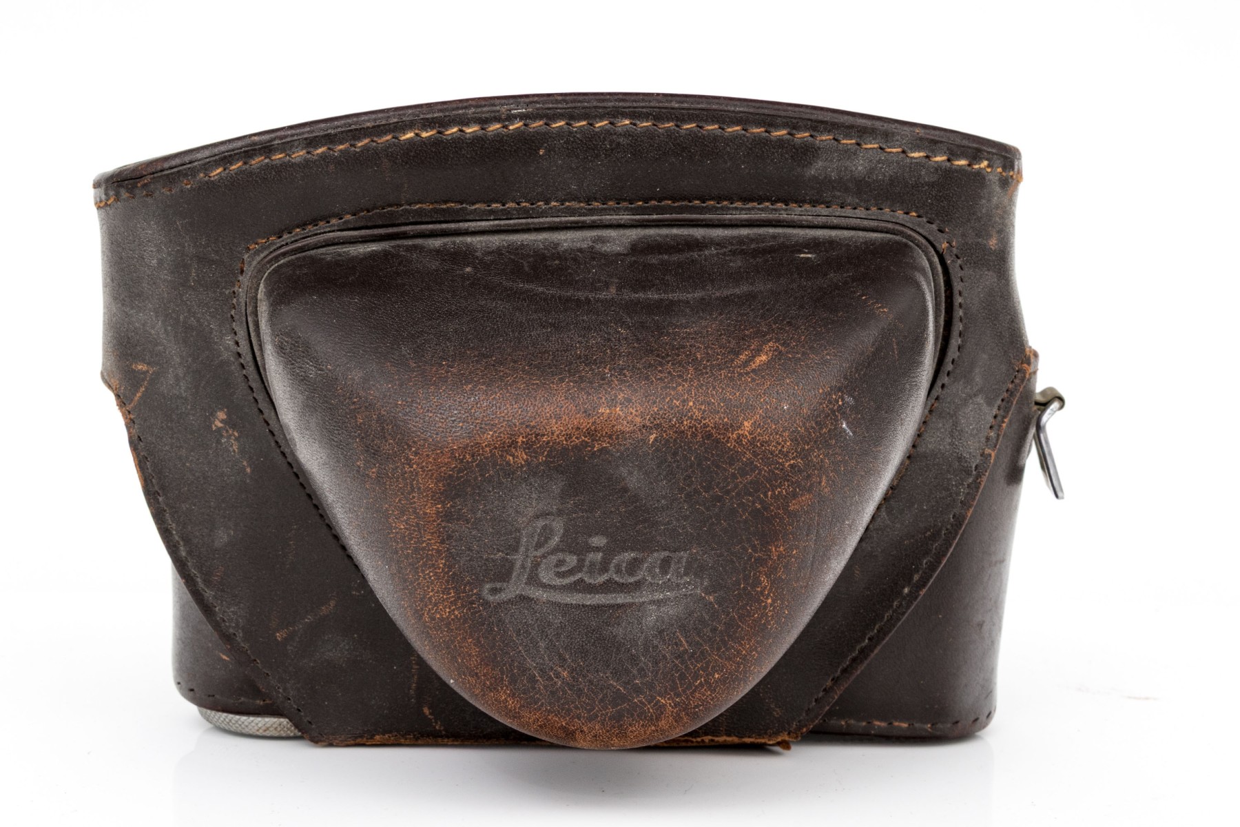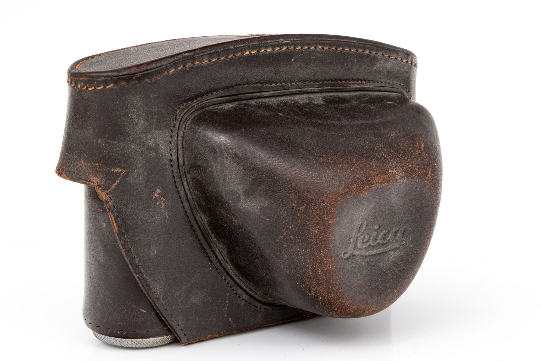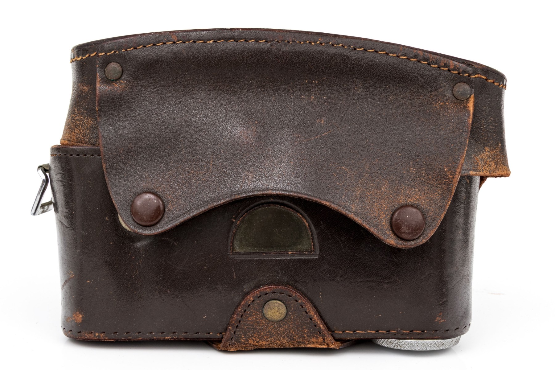 Wear to the leather case with tears and additional losses to the black textural finish to the back of the camera commensuarte with age and handling.