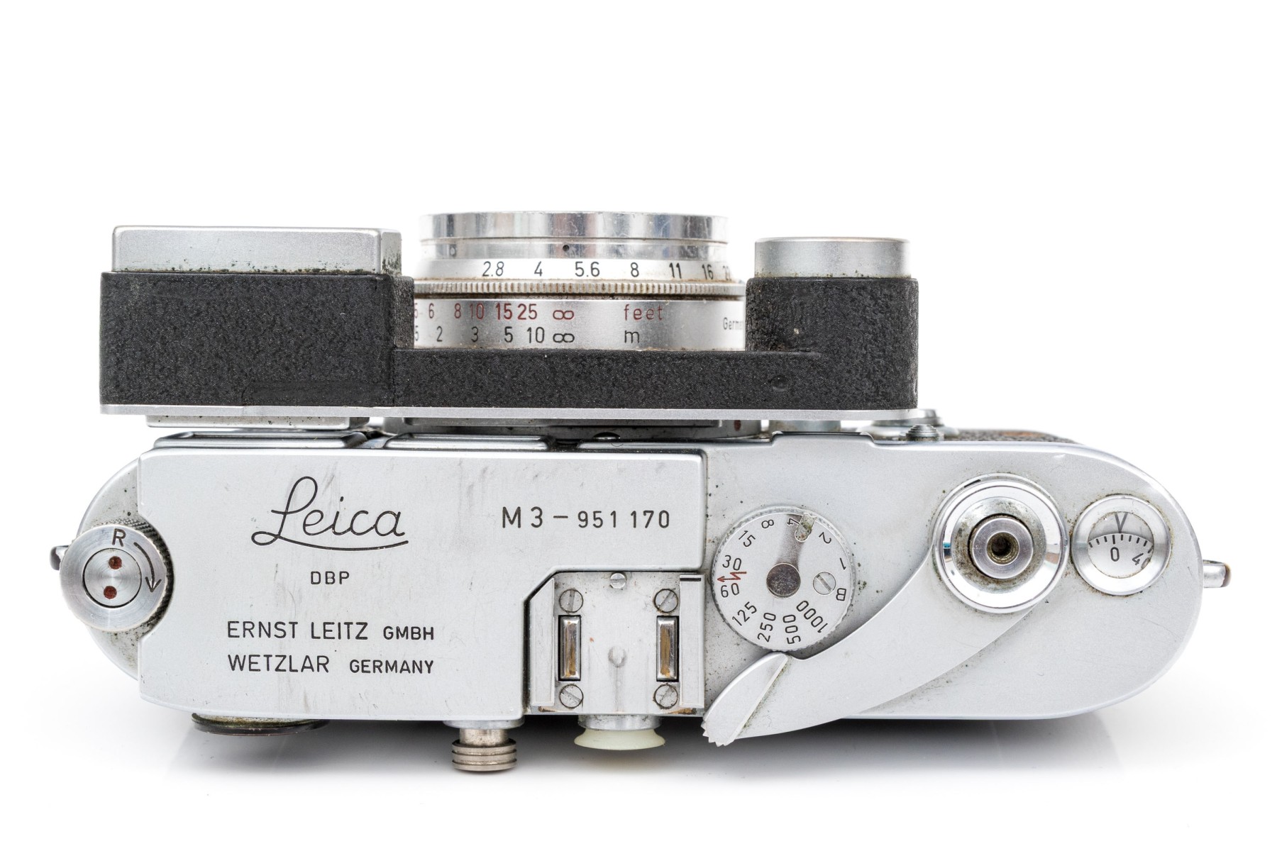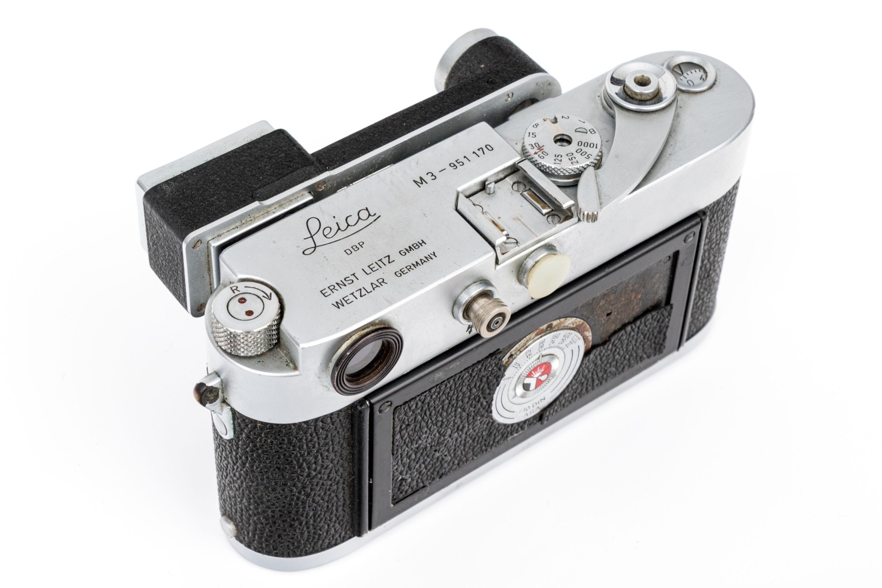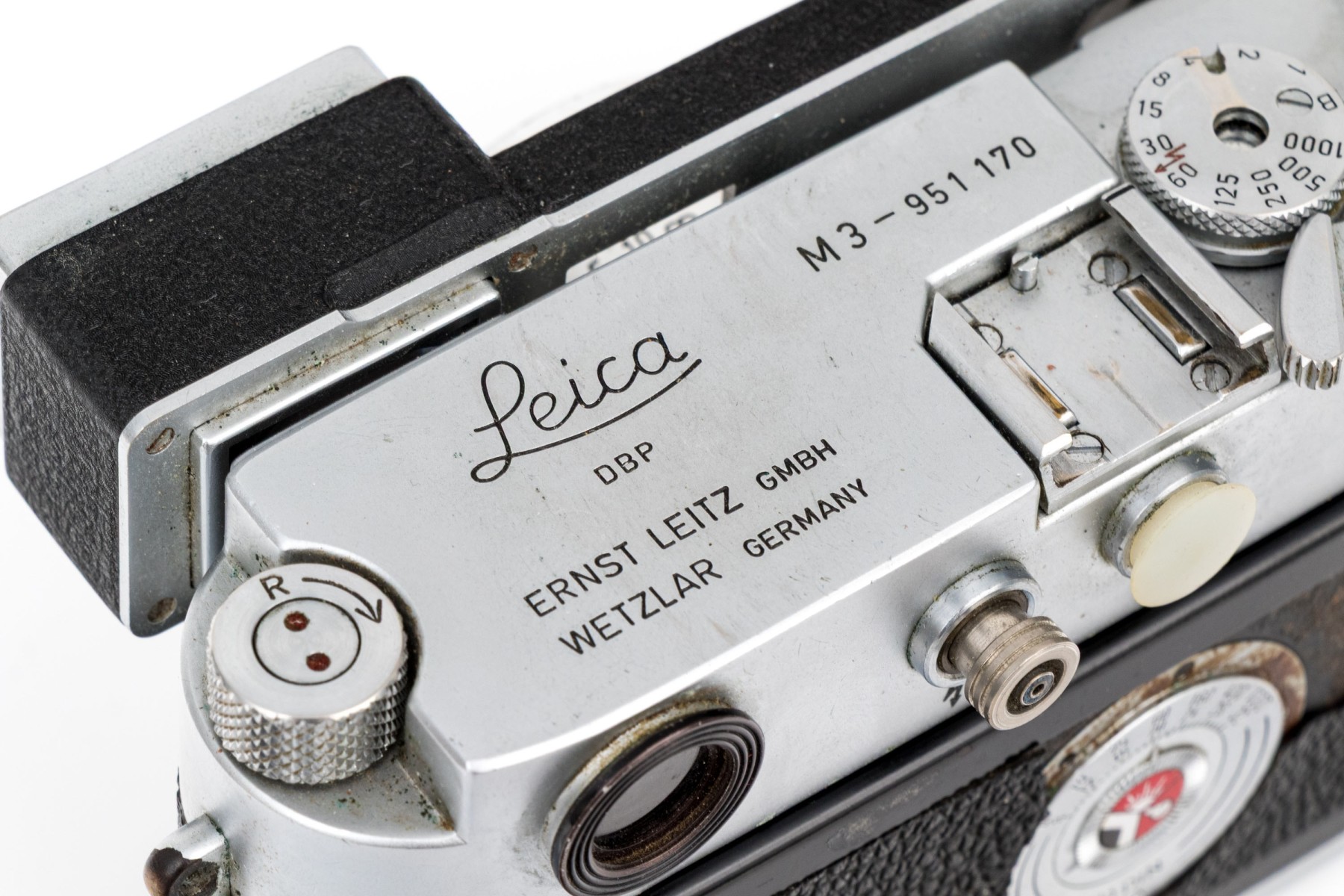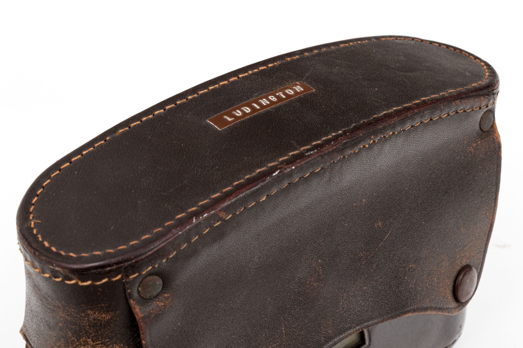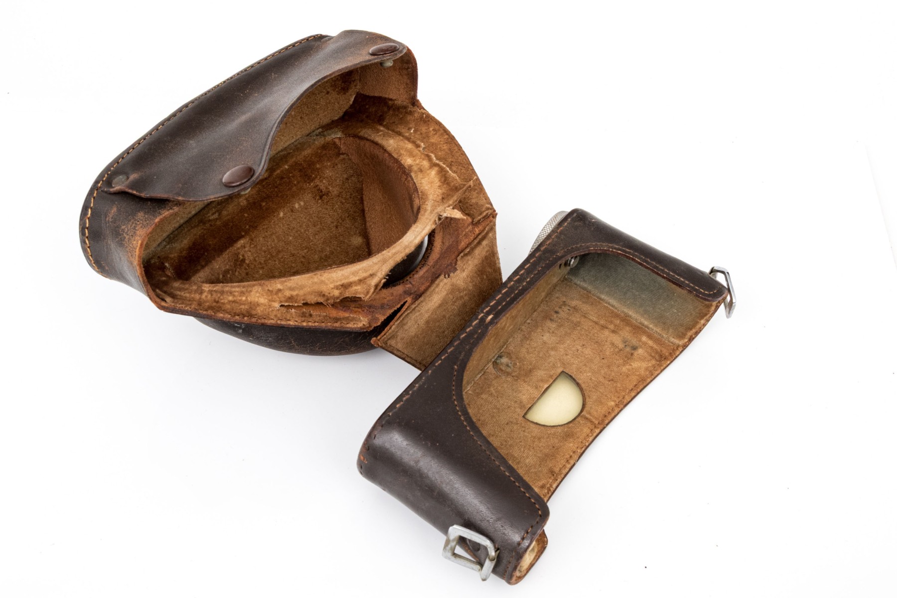 Wear to the leather case with tears and additional losses to the black textural finish to the back of the camera commensuarte with age and handling.