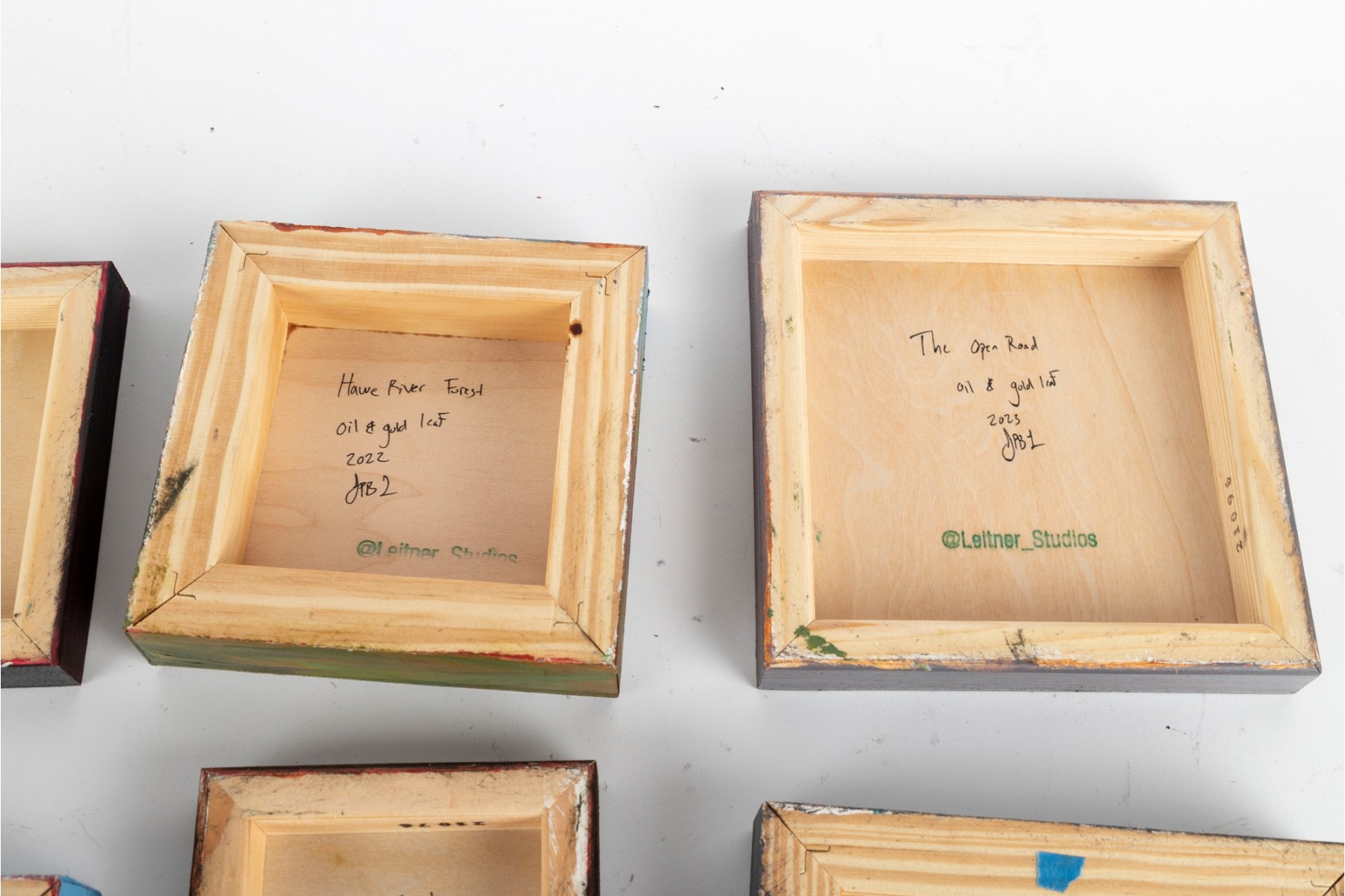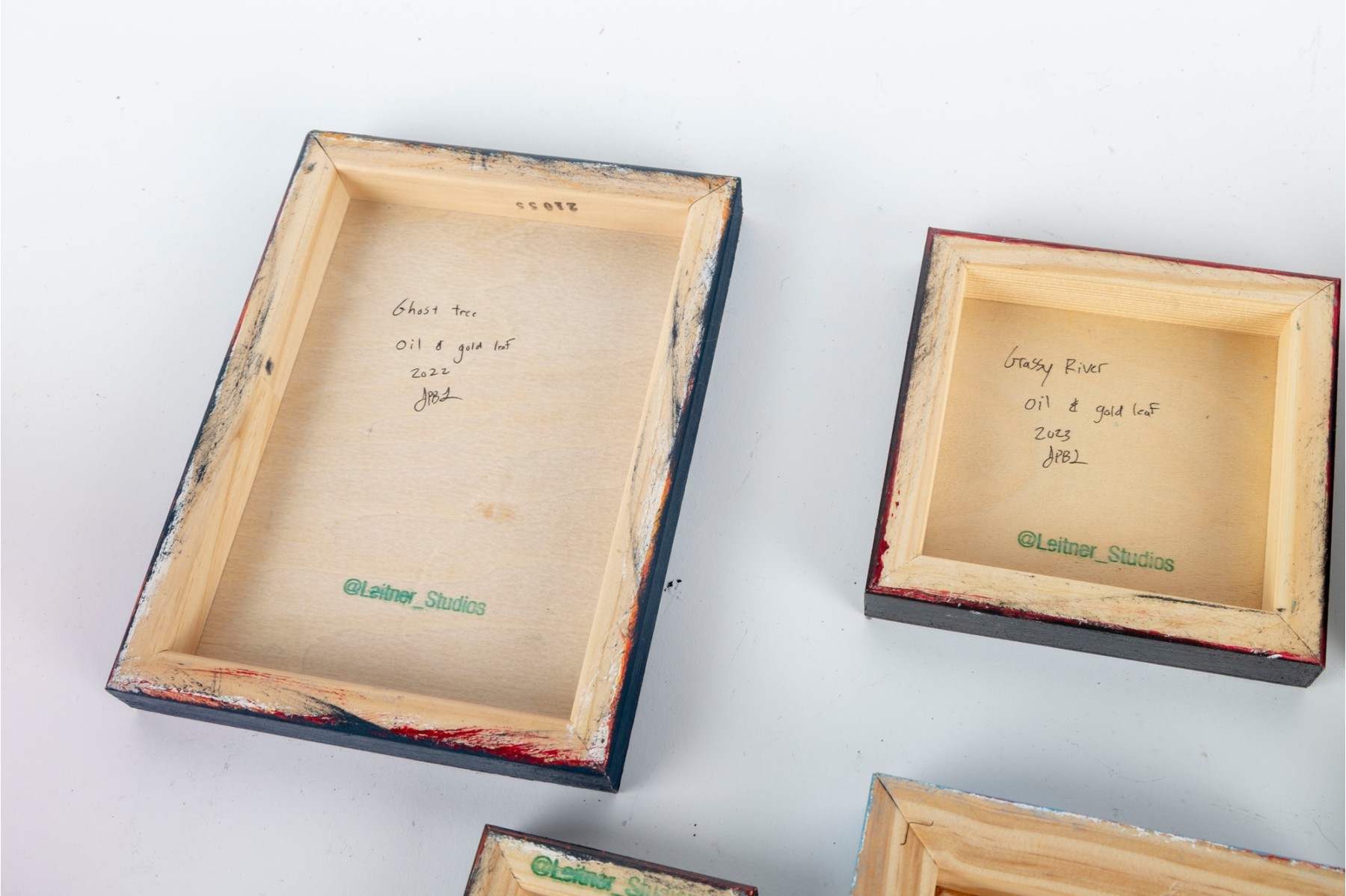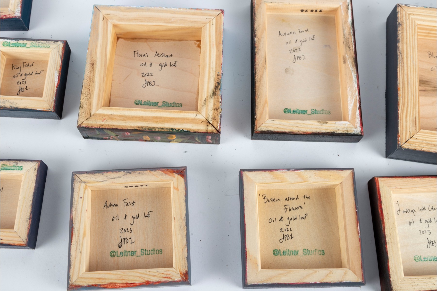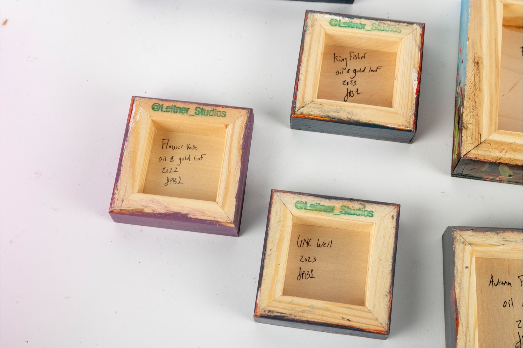 Set of finely detailed miniature oil on board paintings from Leitner Studios, each depicting richly colored and atmospheric scenes that are compact in scale.