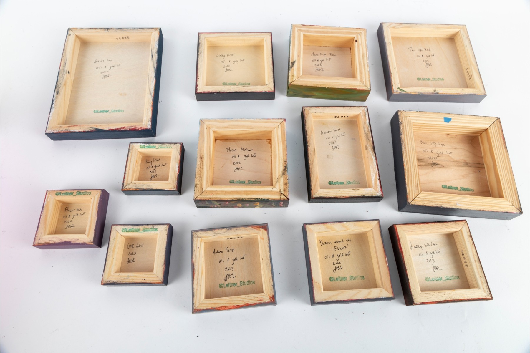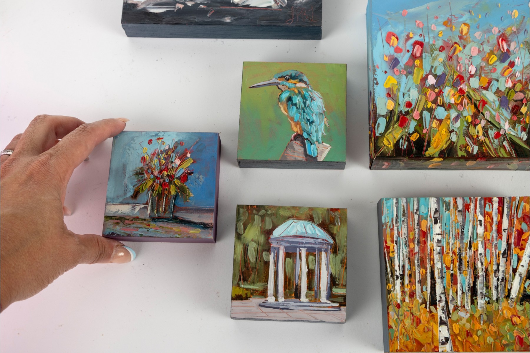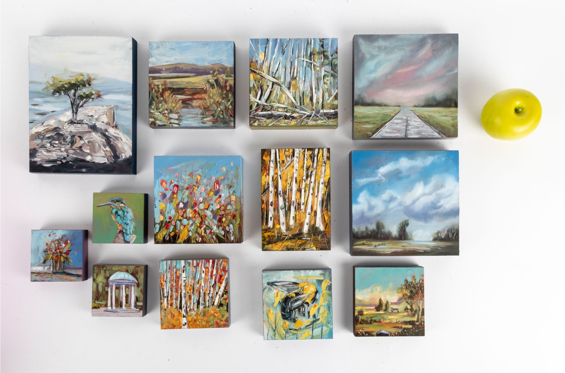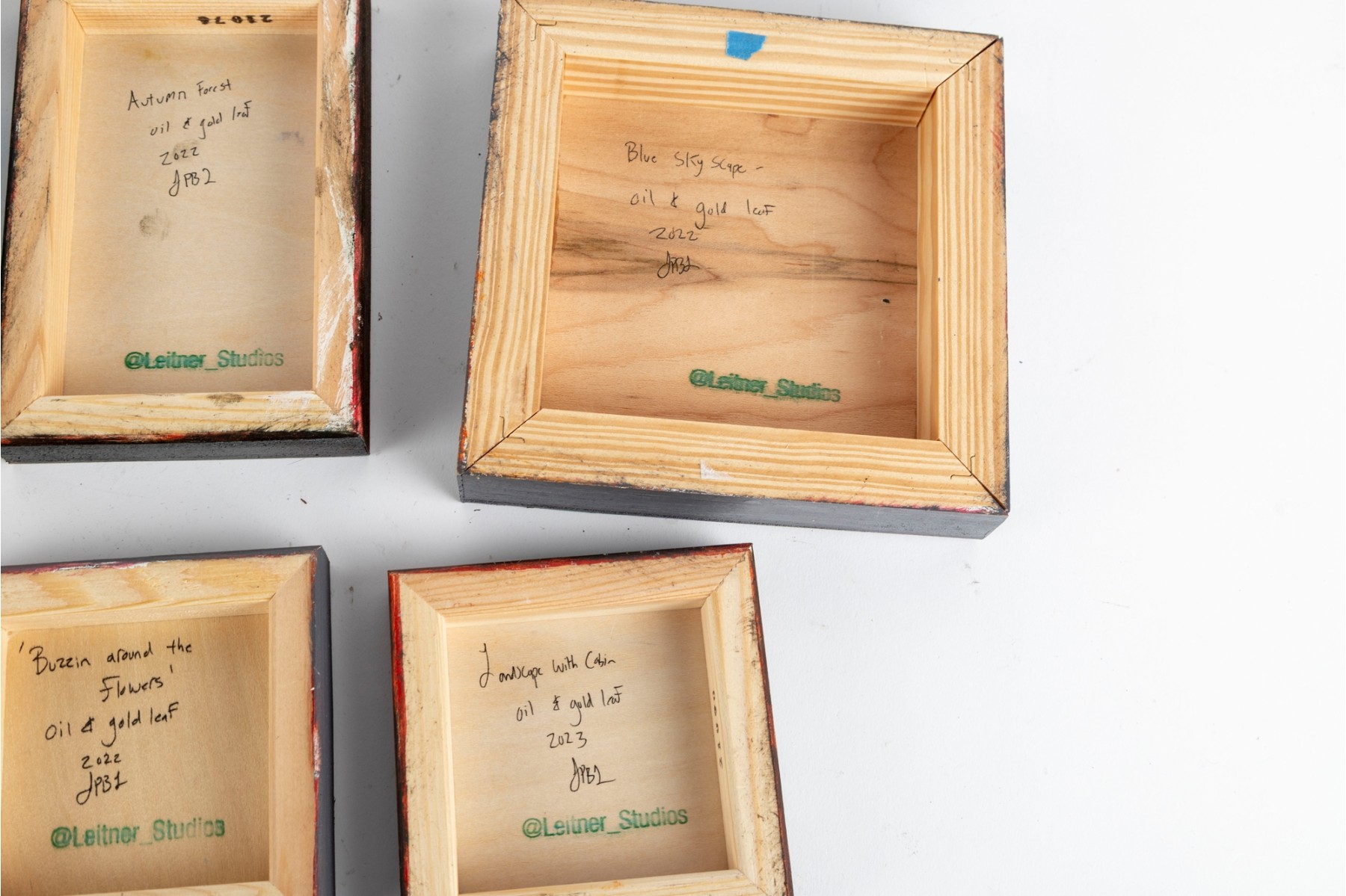 Set of finely detailed miniature oil on board paintings from Leitner Studios, each depicting richly colored and atmospheric scenes that are compact in scale.
