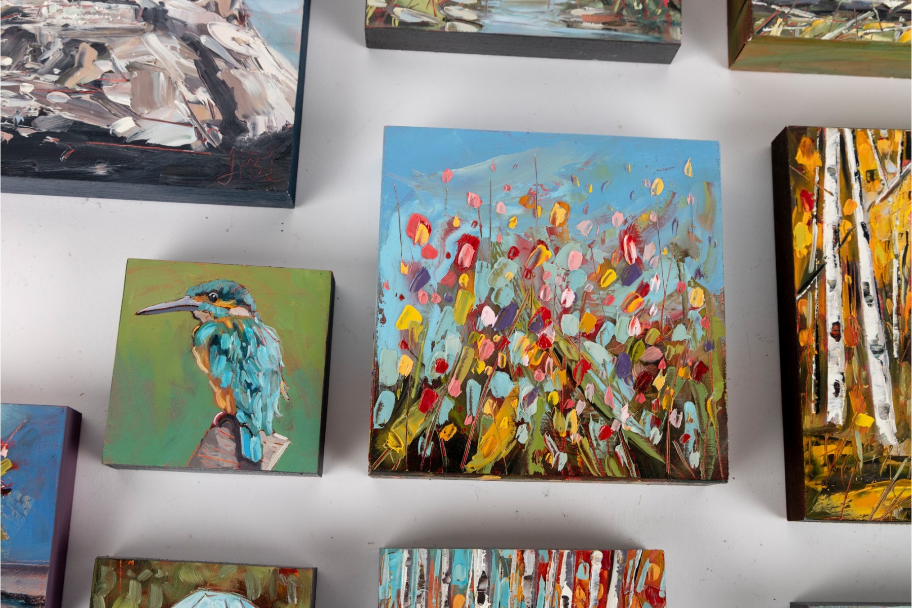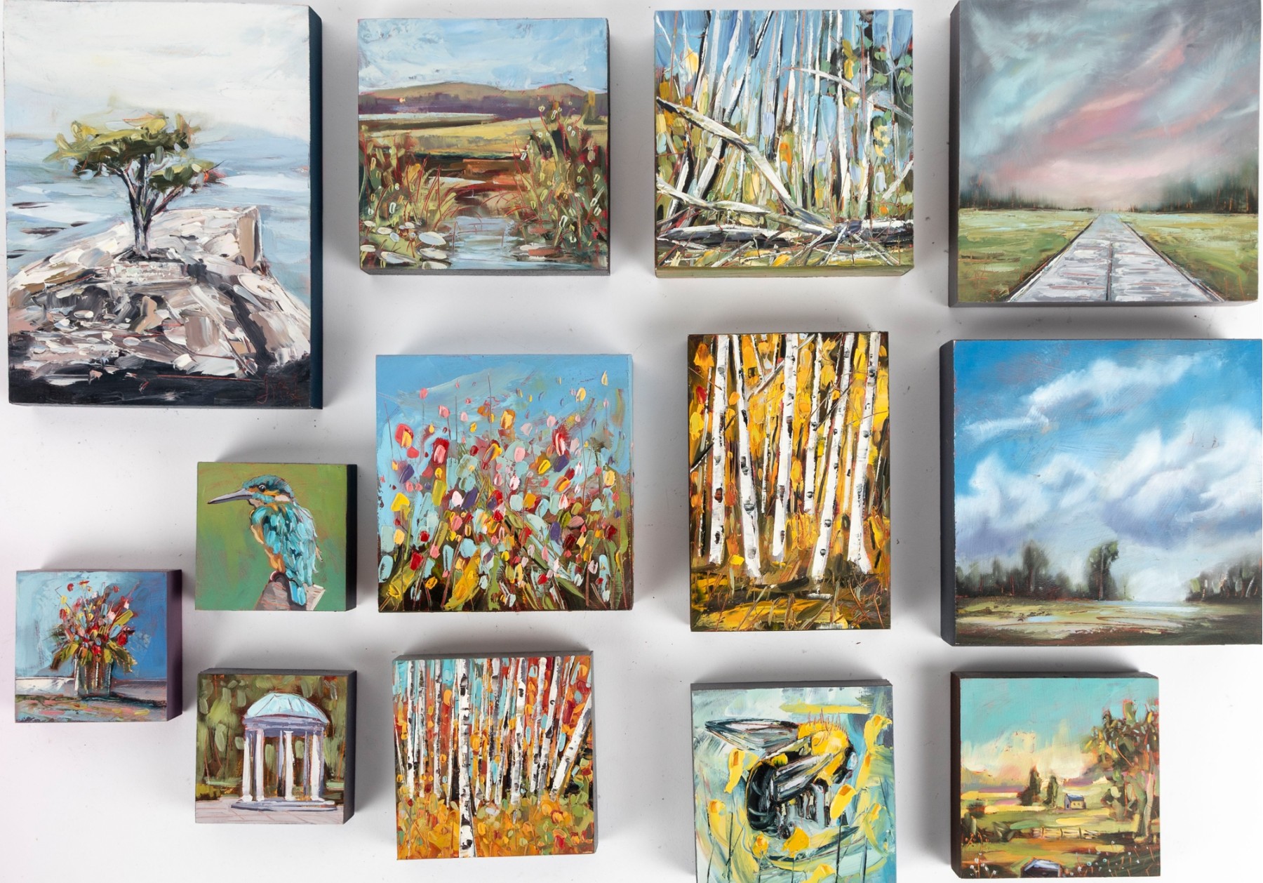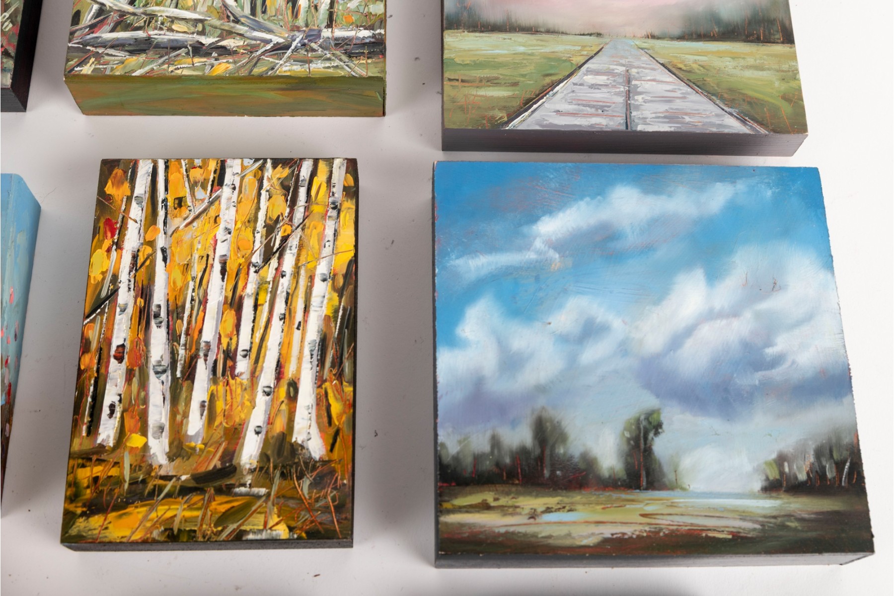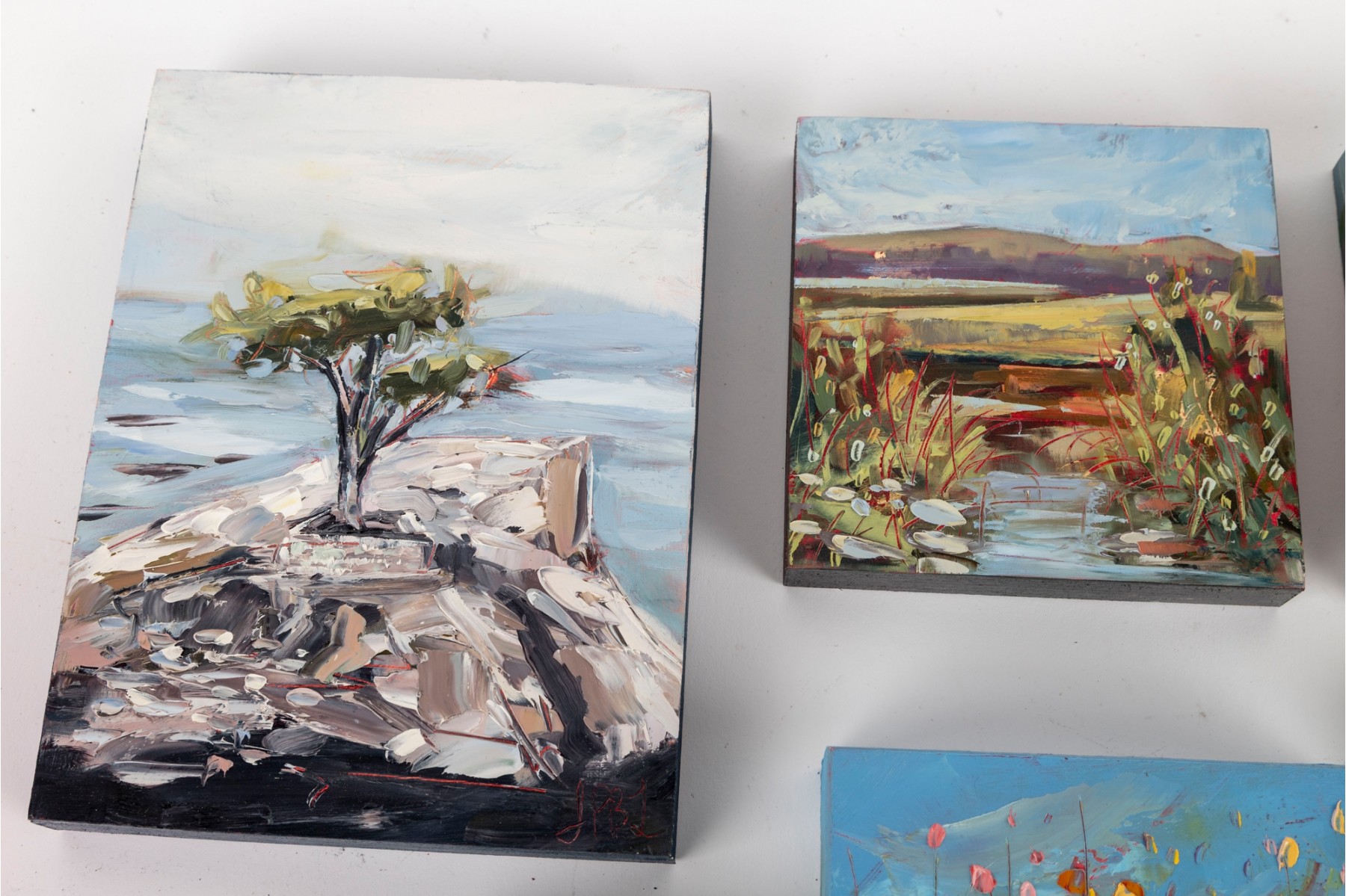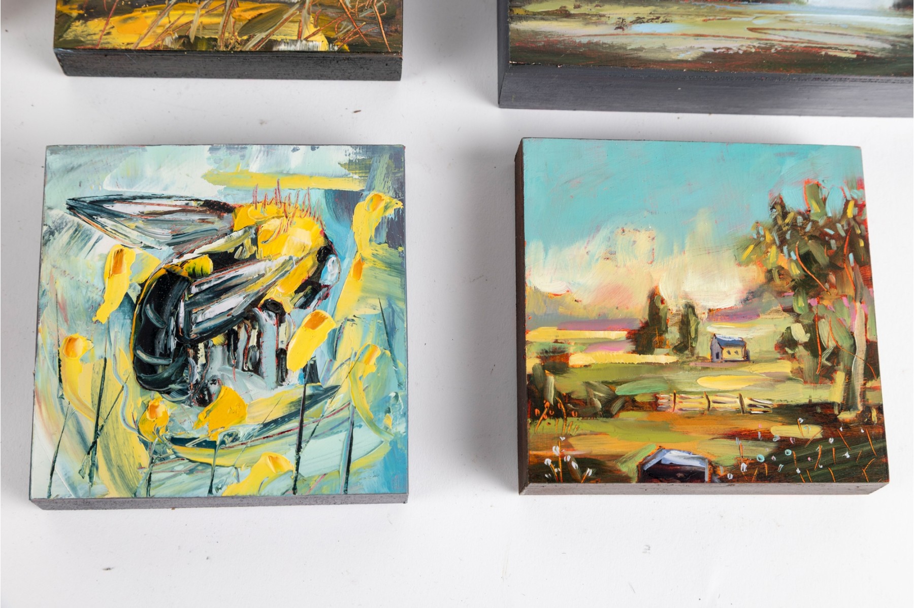 Set of finely detailed miniature oil on board paintings from Leitner Studios, each depicting richly colored and atmospheric scenes that are compact in scale.