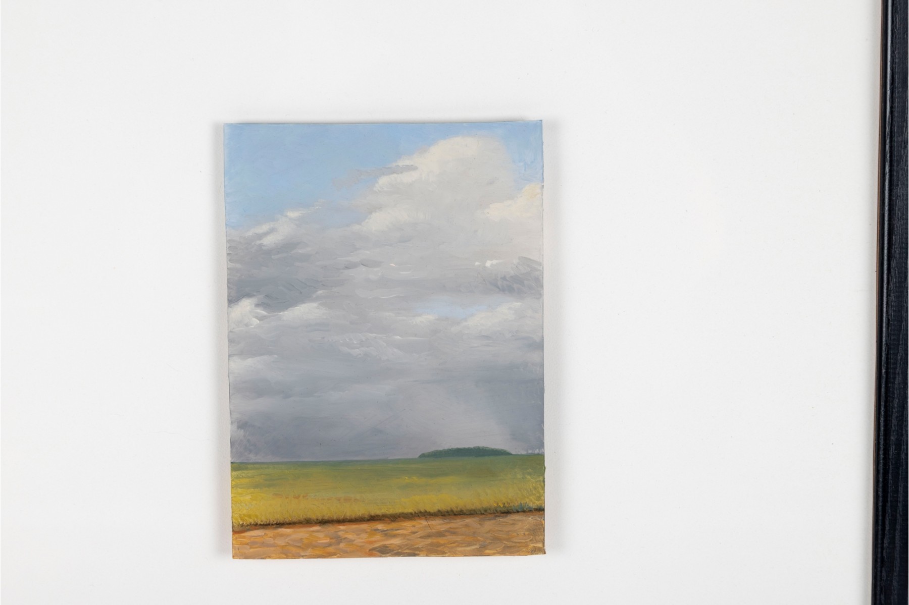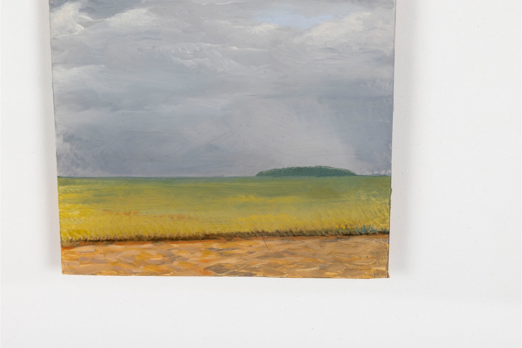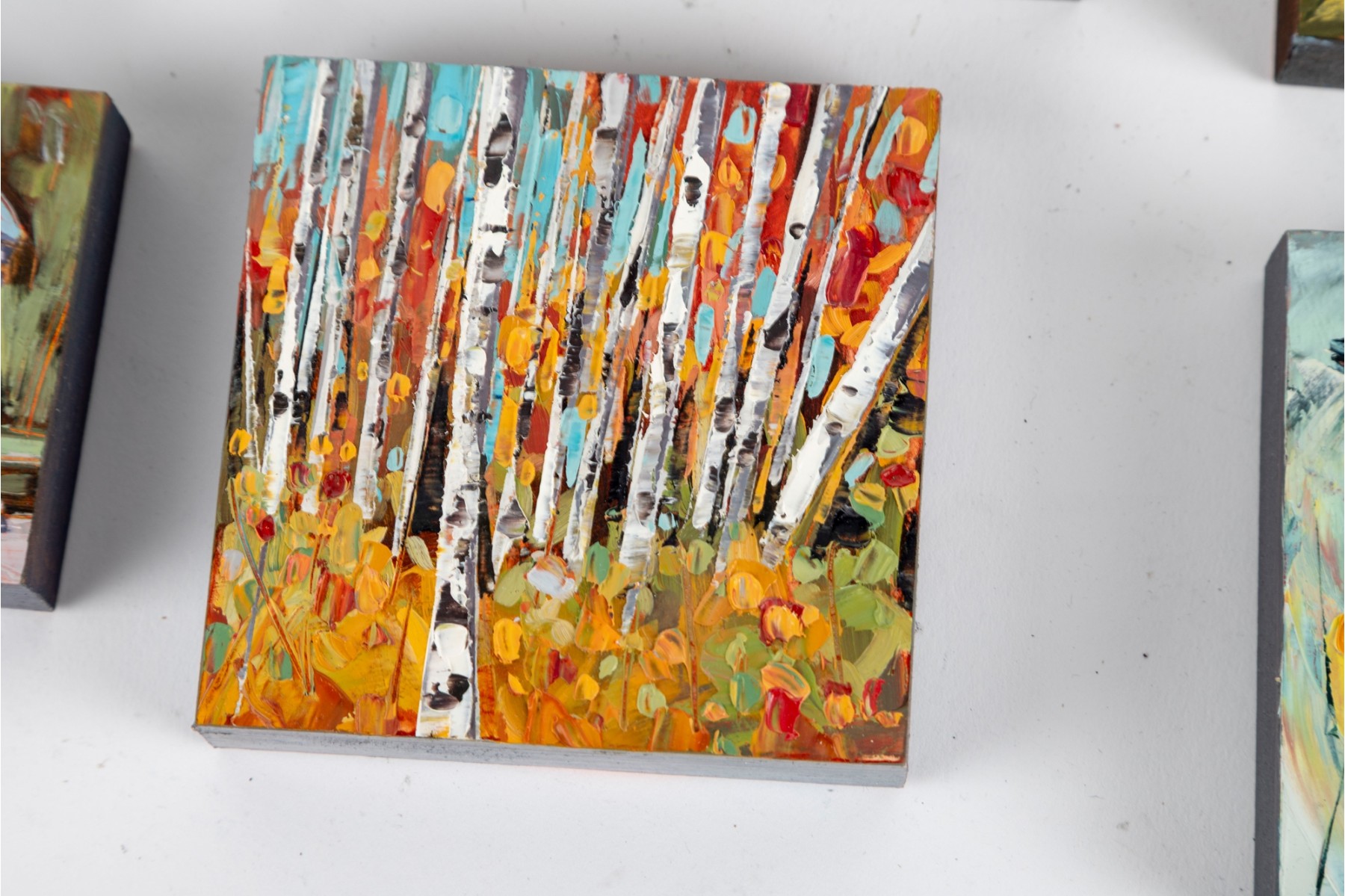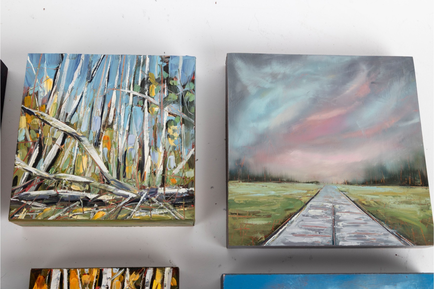 Set of finely detailed miniature oil on board paintings from Leitner Studios, each depicting richly colored and atmospheric scenes that are compact in scale.
