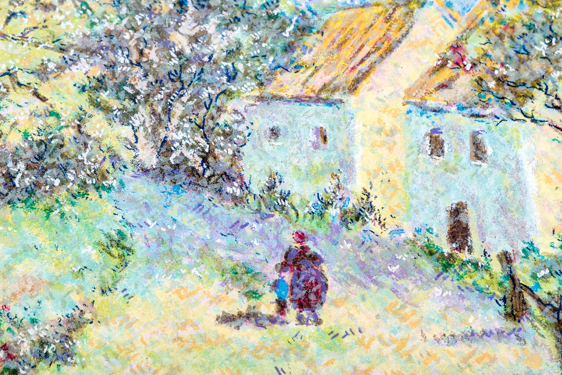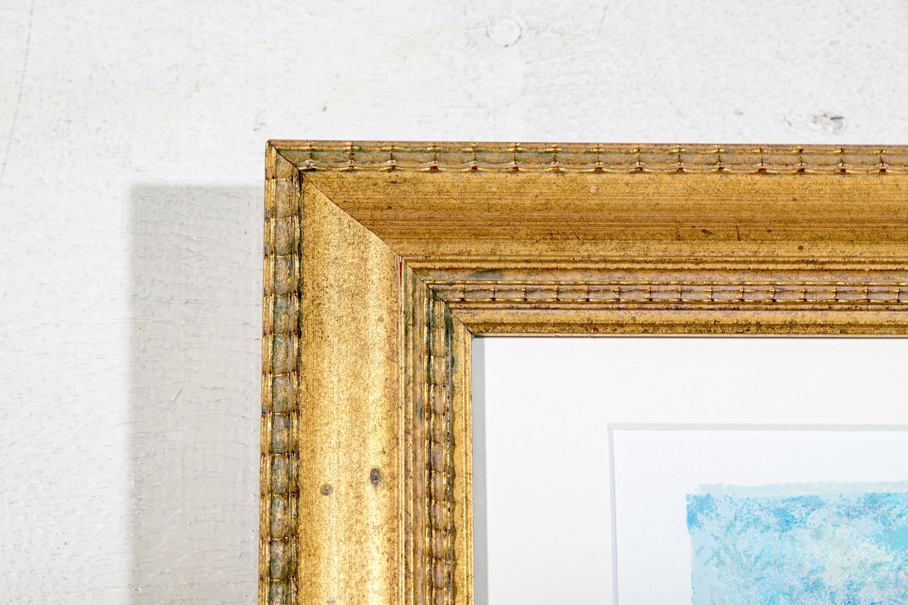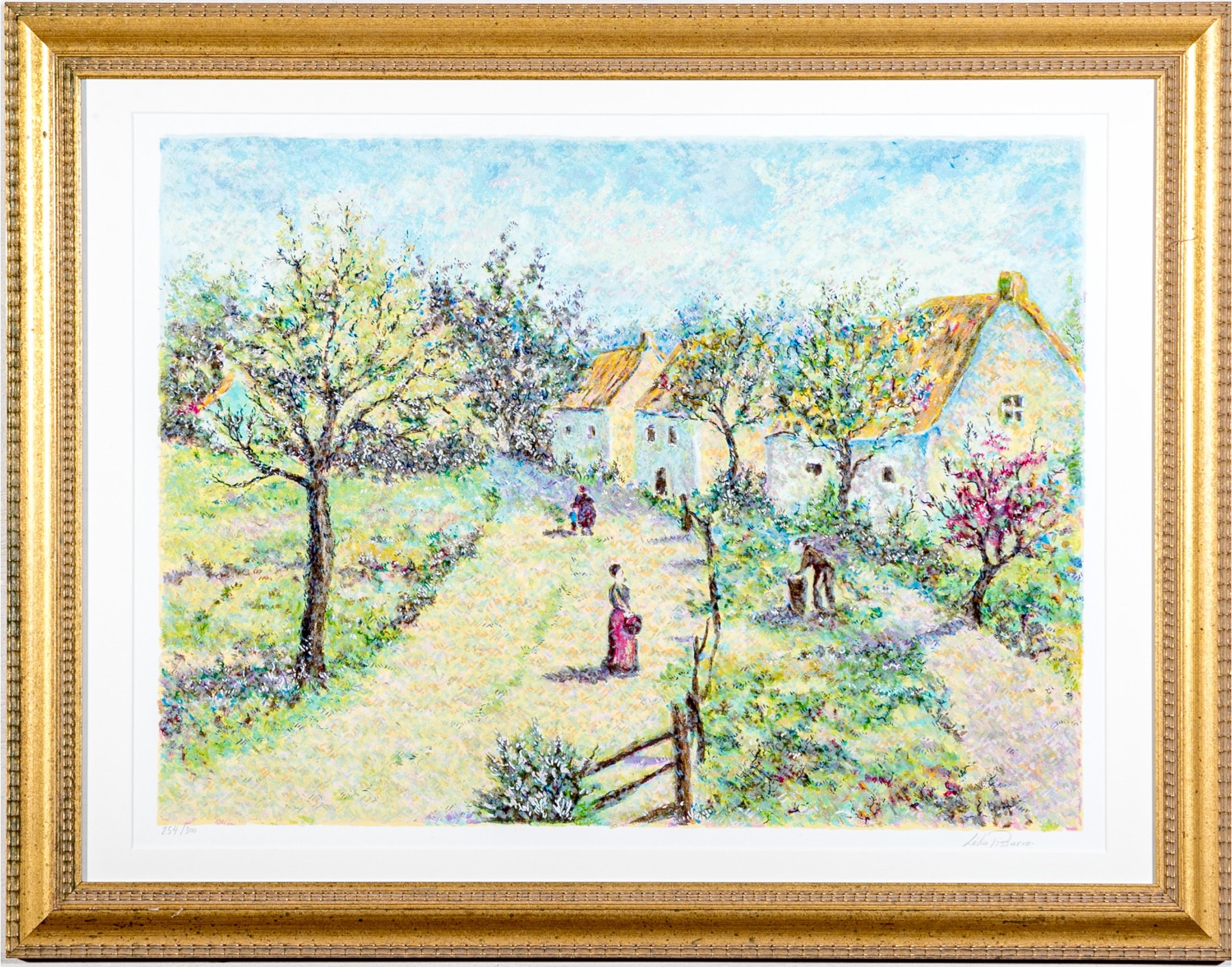 Pencil signed lower right, numbered 254/300 lower left. Bio on verso. A charming street scene in a village with white washed houses and figures at their tasks on the road in autumn. Presented in a fine gilt frame with glass.