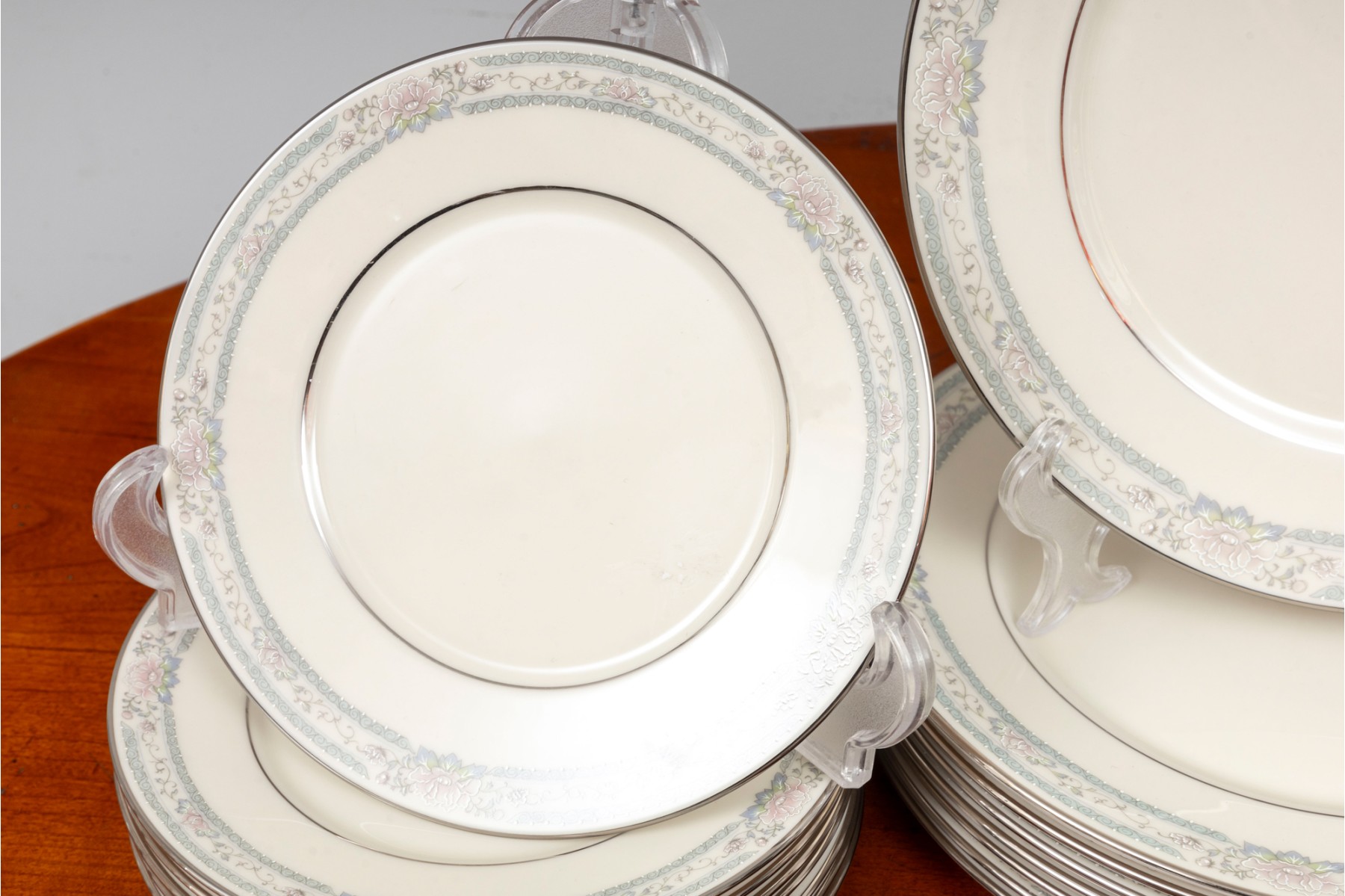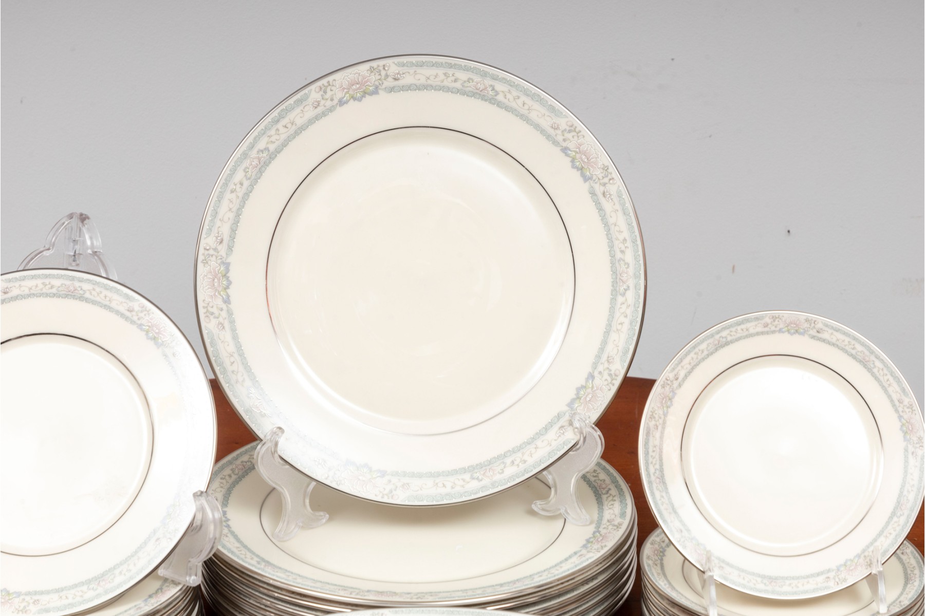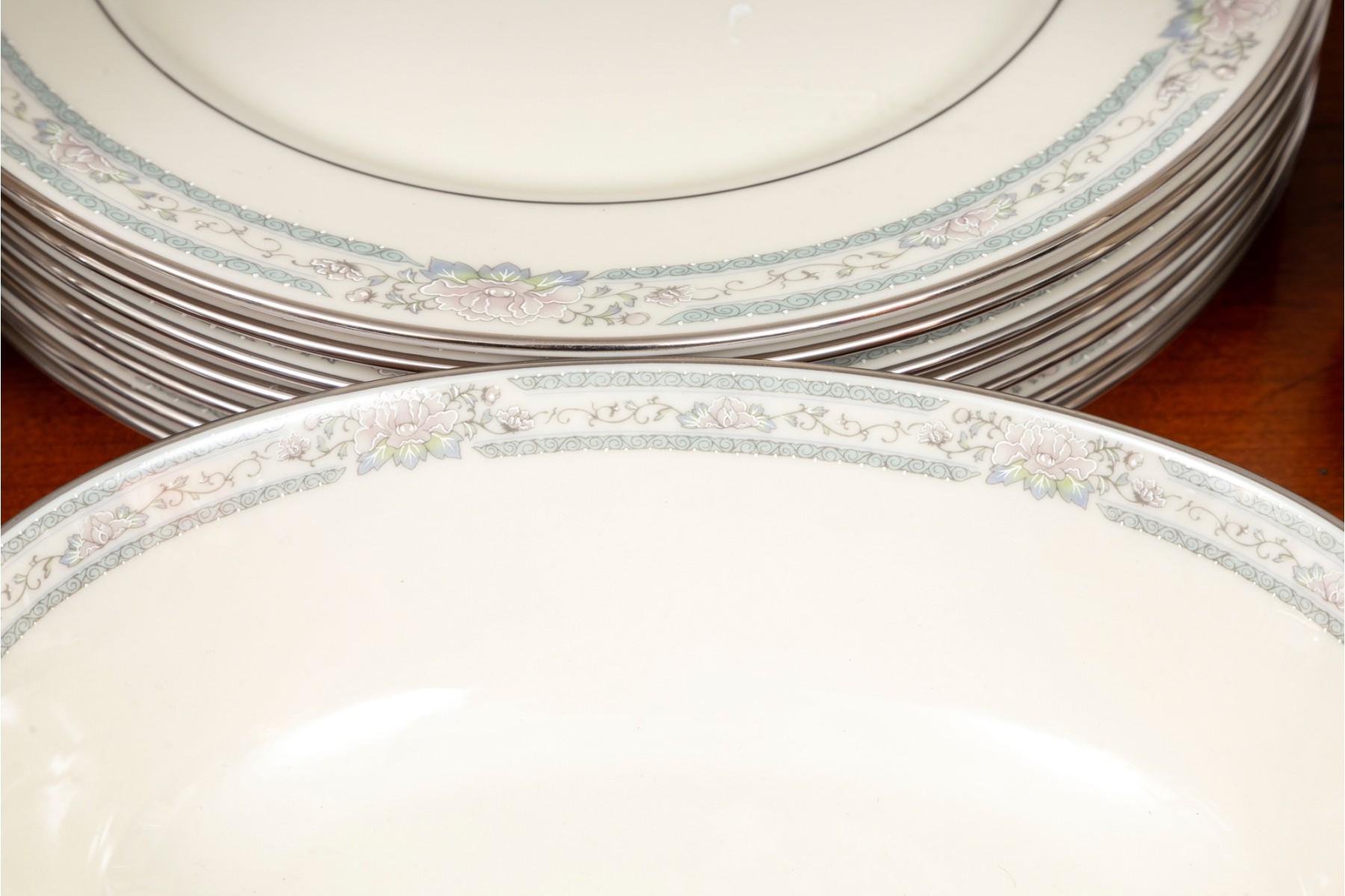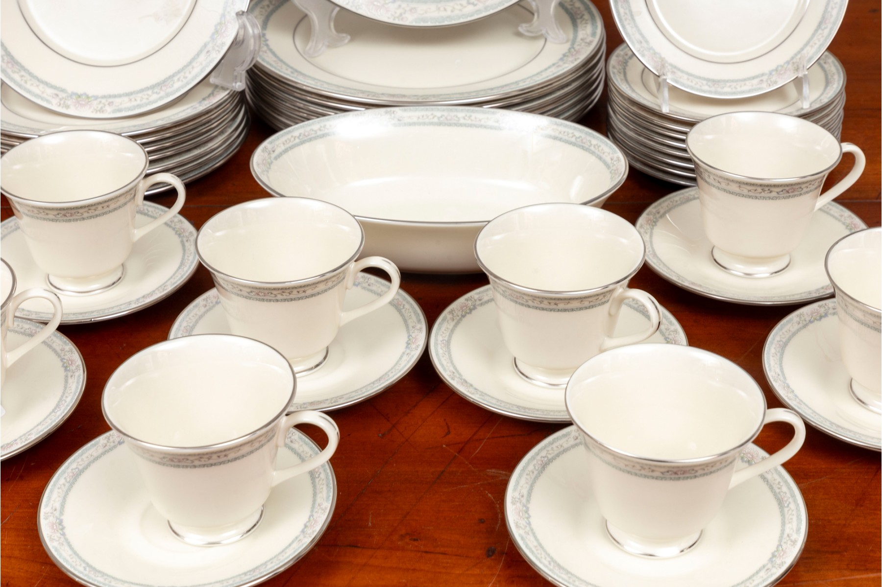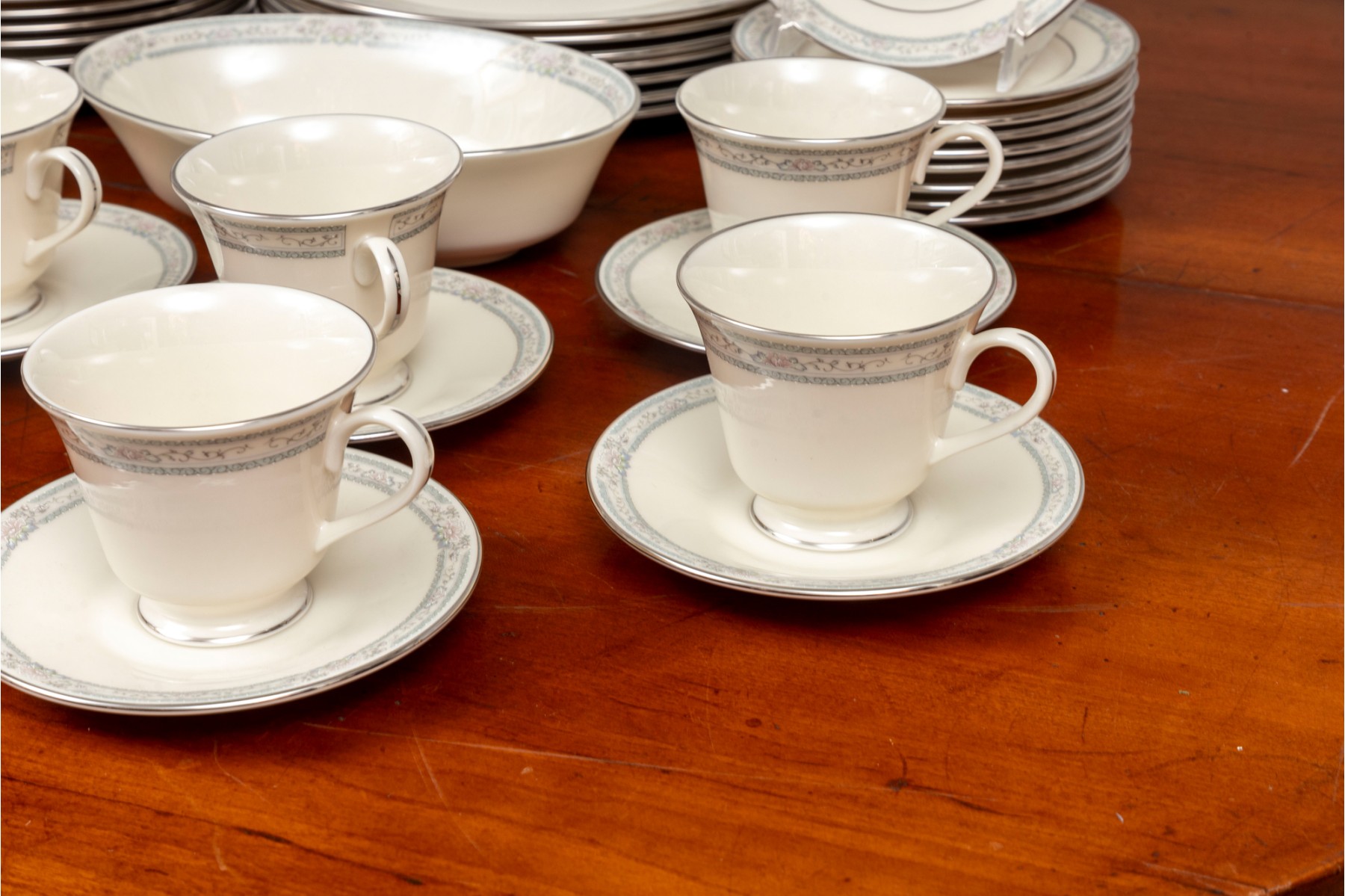 Lenox Cosmopolitan collection "Charleston" pattern China set with platinum trim and floral designs. Service for eight. Refer to photos for details.