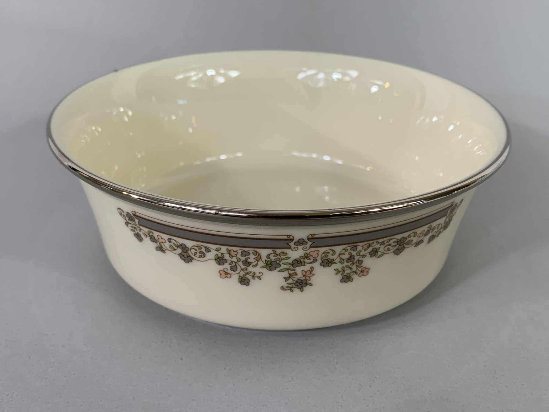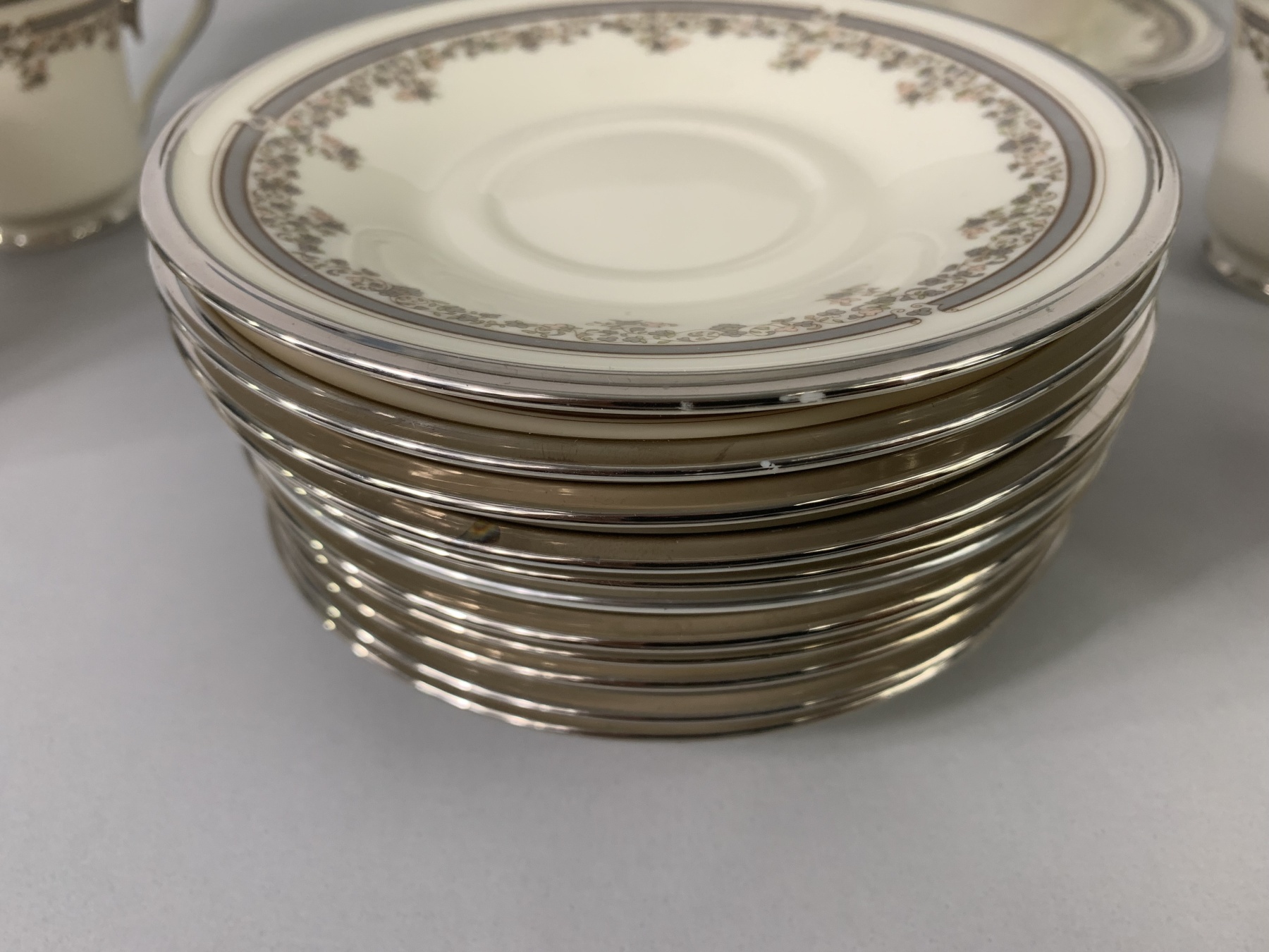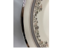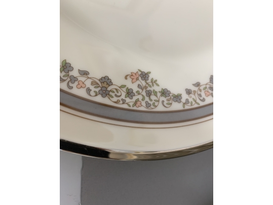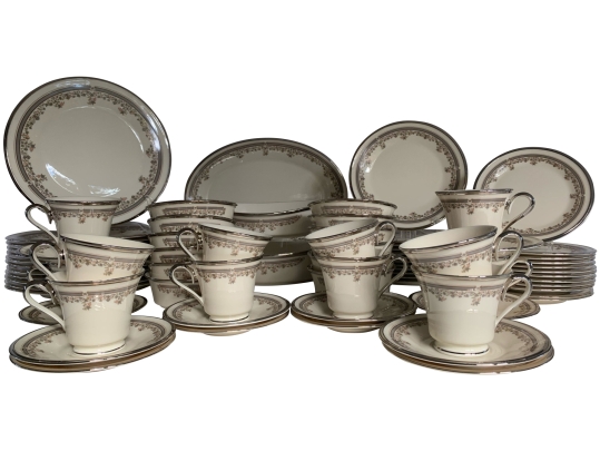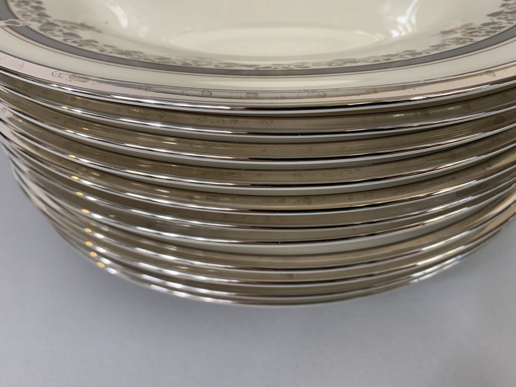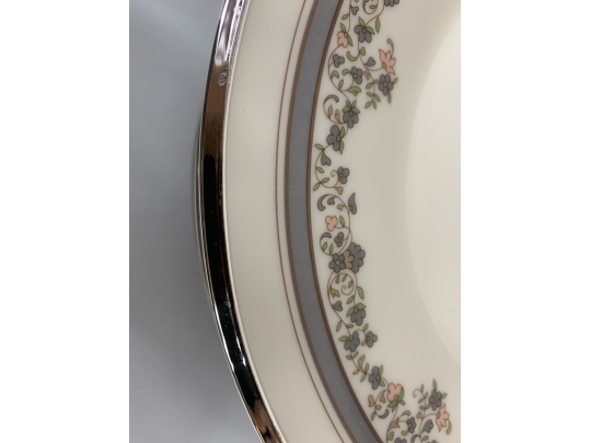 Lenox fine china Lace Point pattern dinnerware with gray & pink flowers, gray band, and platinum trim. Produced by Lenox from 1978 - 1992. Included in this service are: