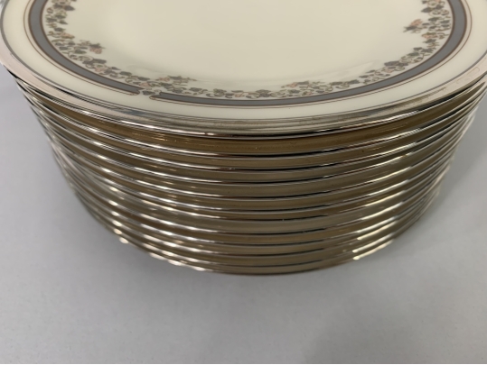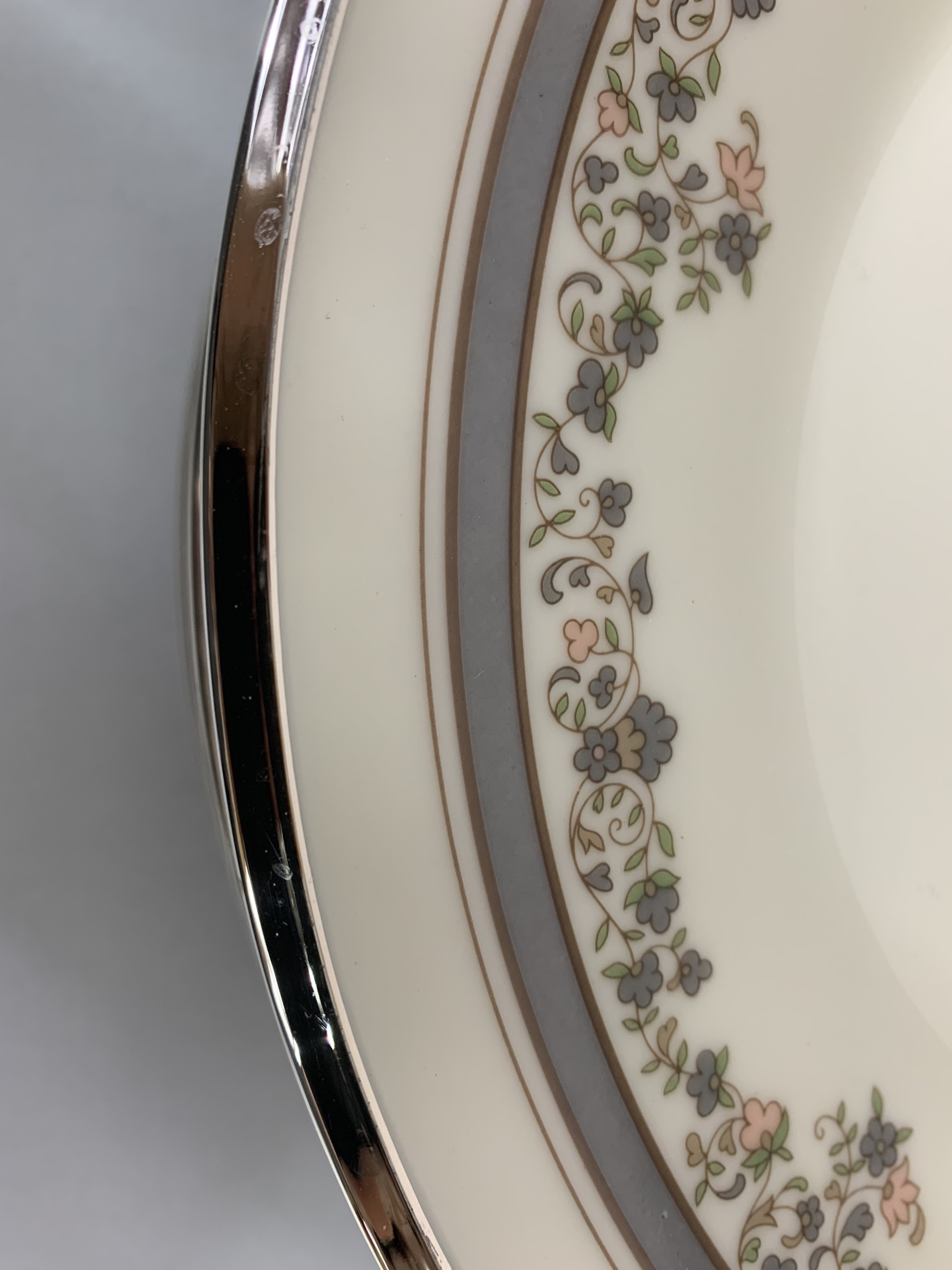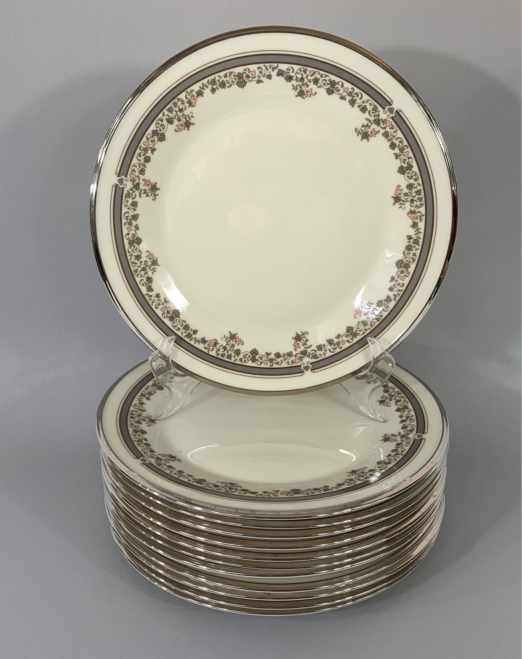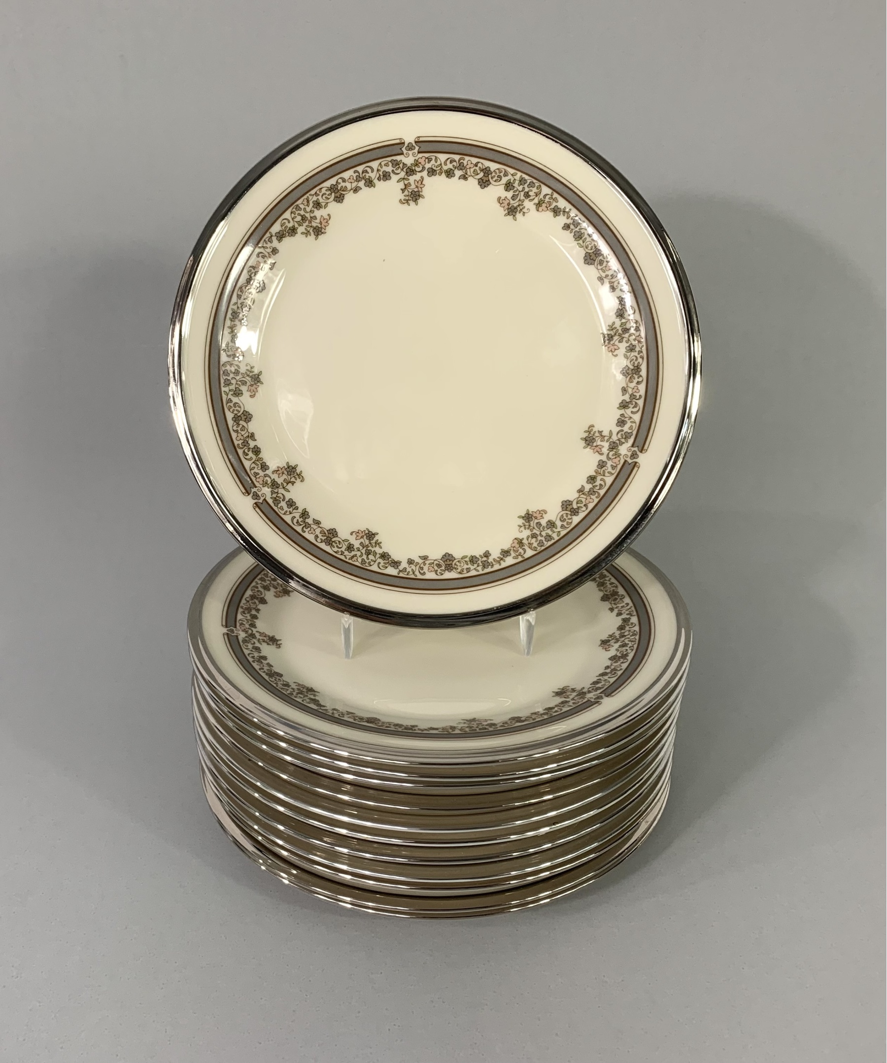 Condition: faint to light service scratches, no chips, no cracks, no crazing. One bread and butter with platinum glaze skip and one with a pin-point flea bite. Sporadic light spotting and oxidation to platinum trim.