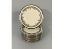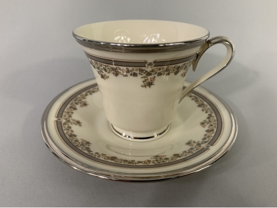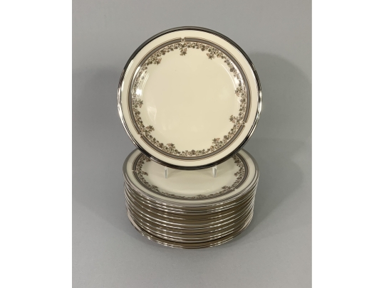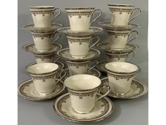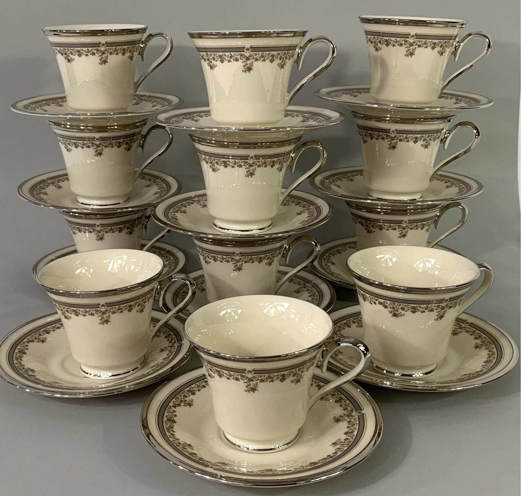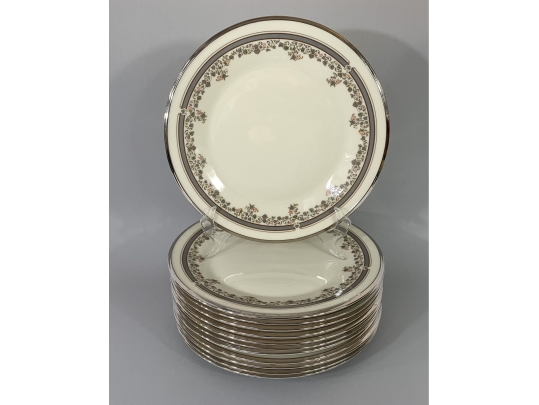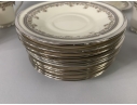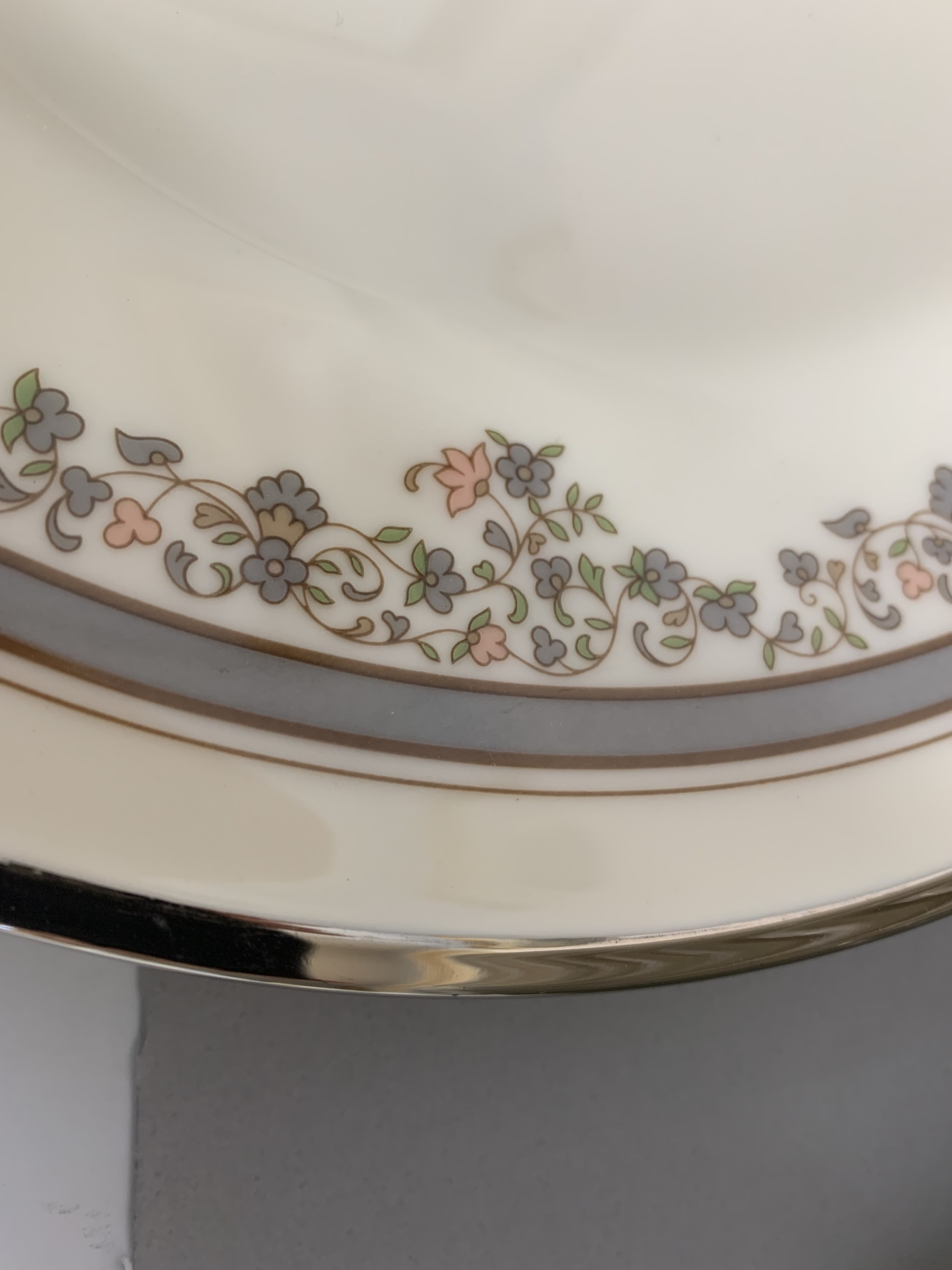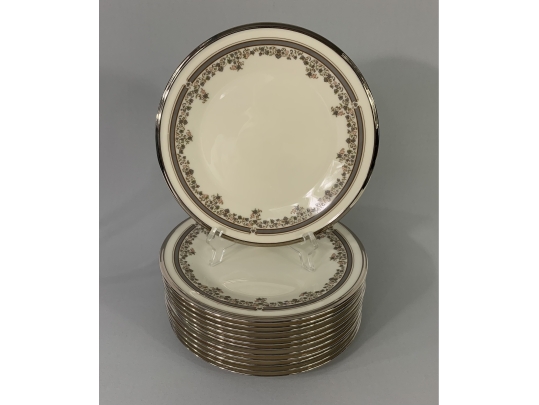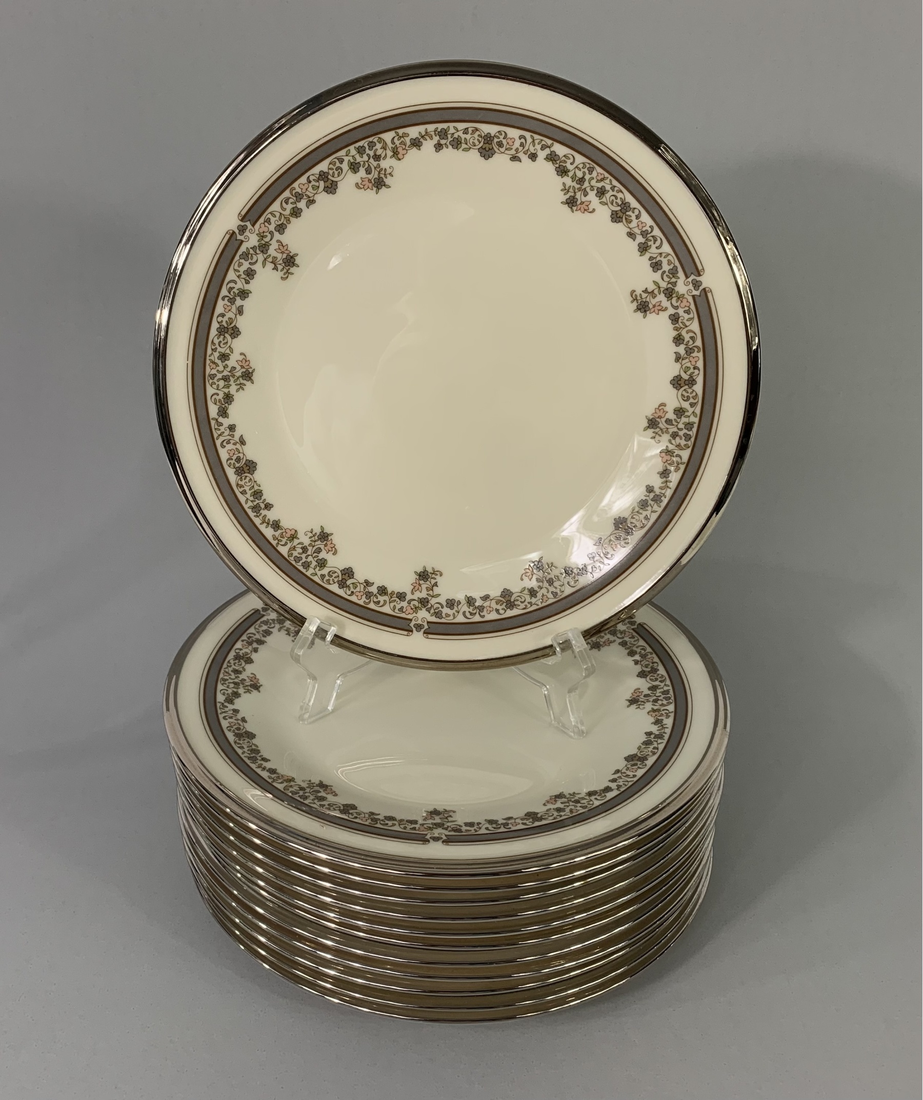 Condition: faint to light service scratches, no chips, no cracks, no crazing. One bread and butter with platinum glaze skip and one with a pin-point flea bite. Sporadic light spotting and oxidation to platinum trim.