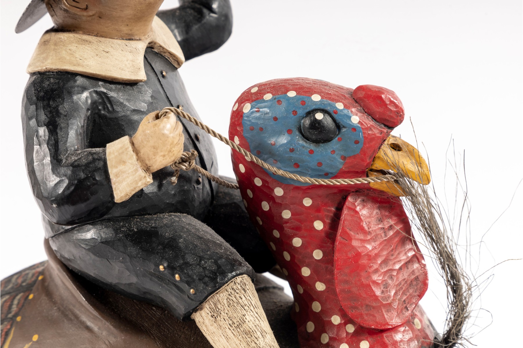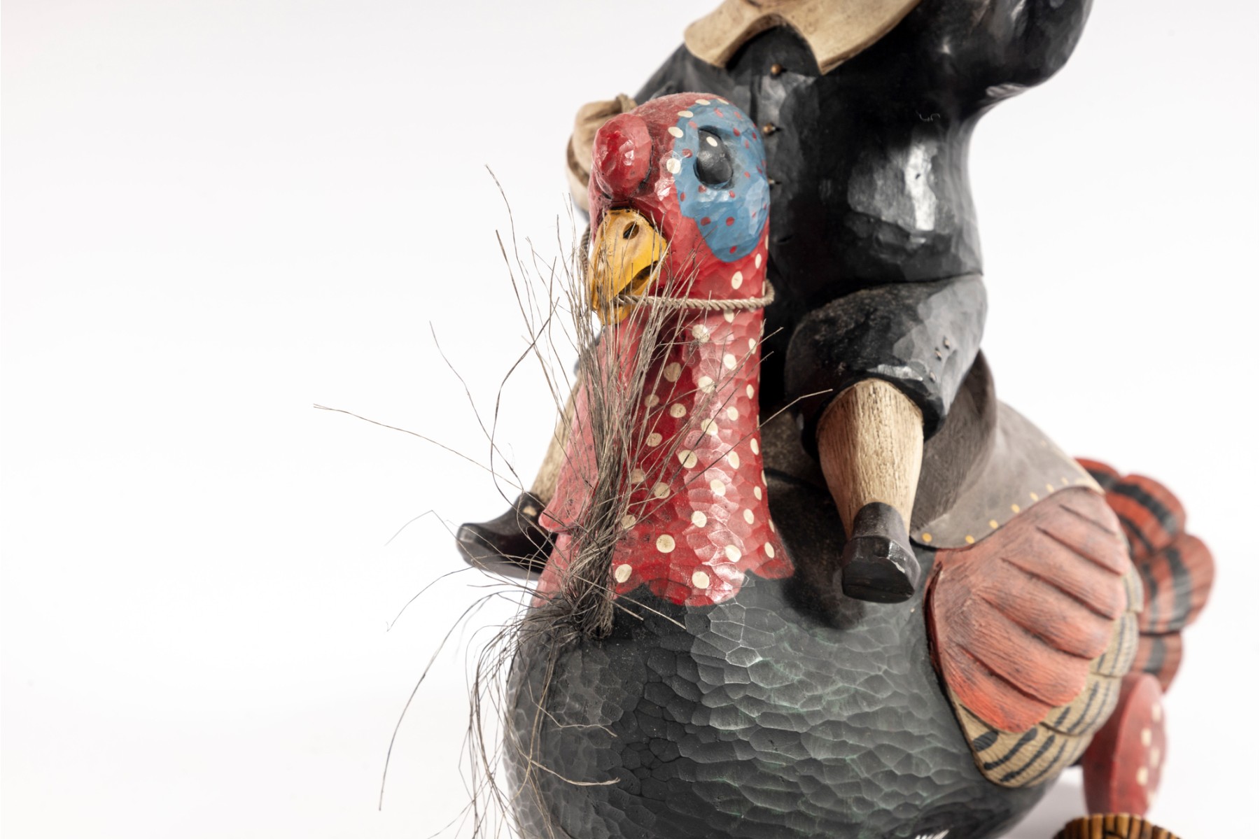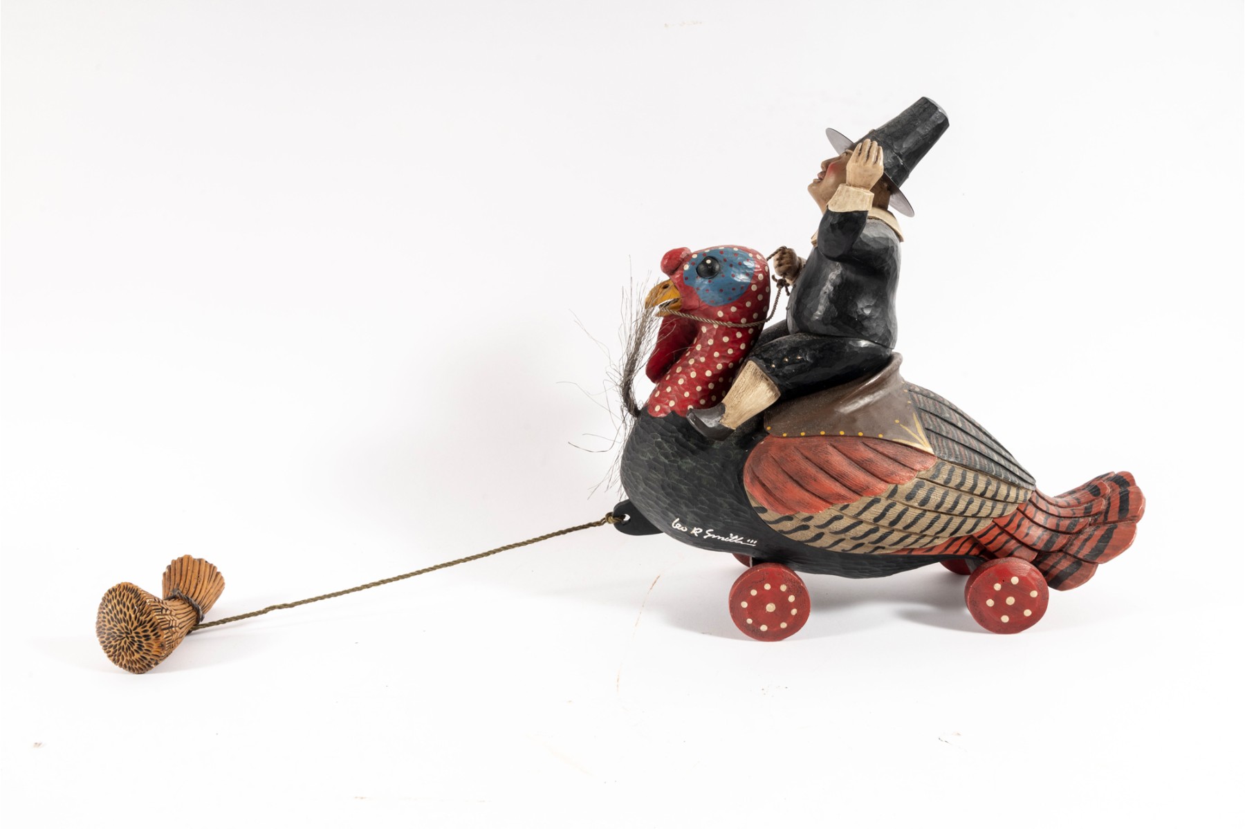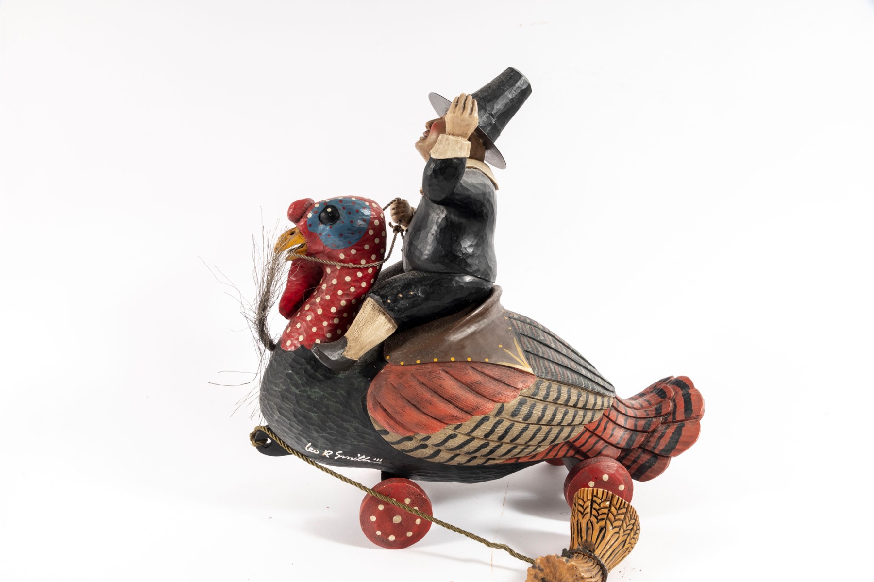 A limited edition Leo R. Smith woodcraft toy sculpture, hand-carved and painted in the form of a Pilgrim riding a turkey. Edition 766 / 5000, signed.