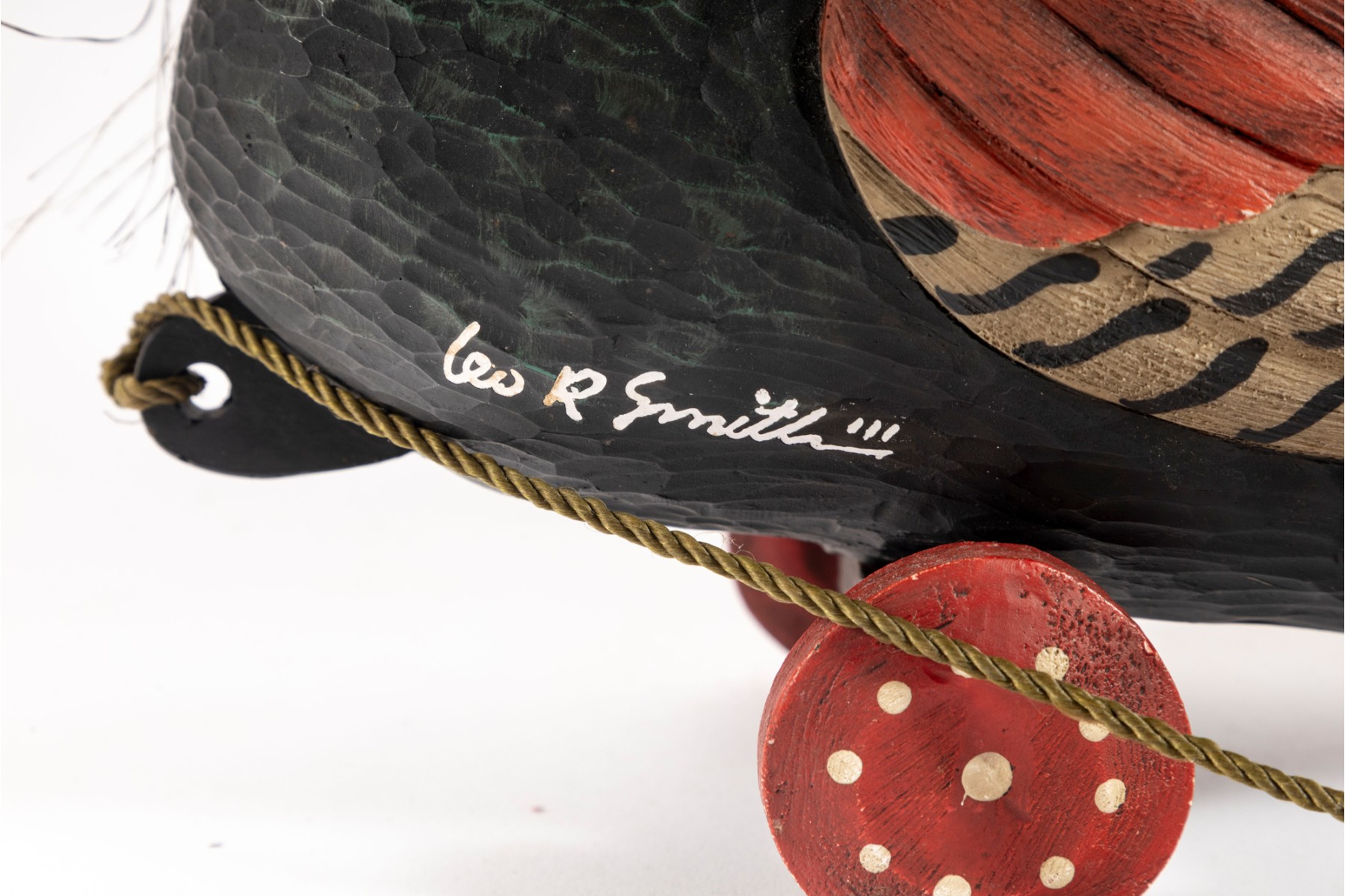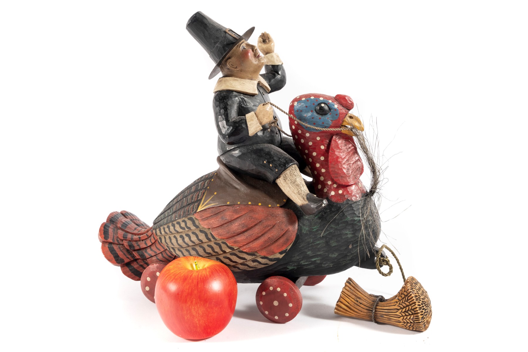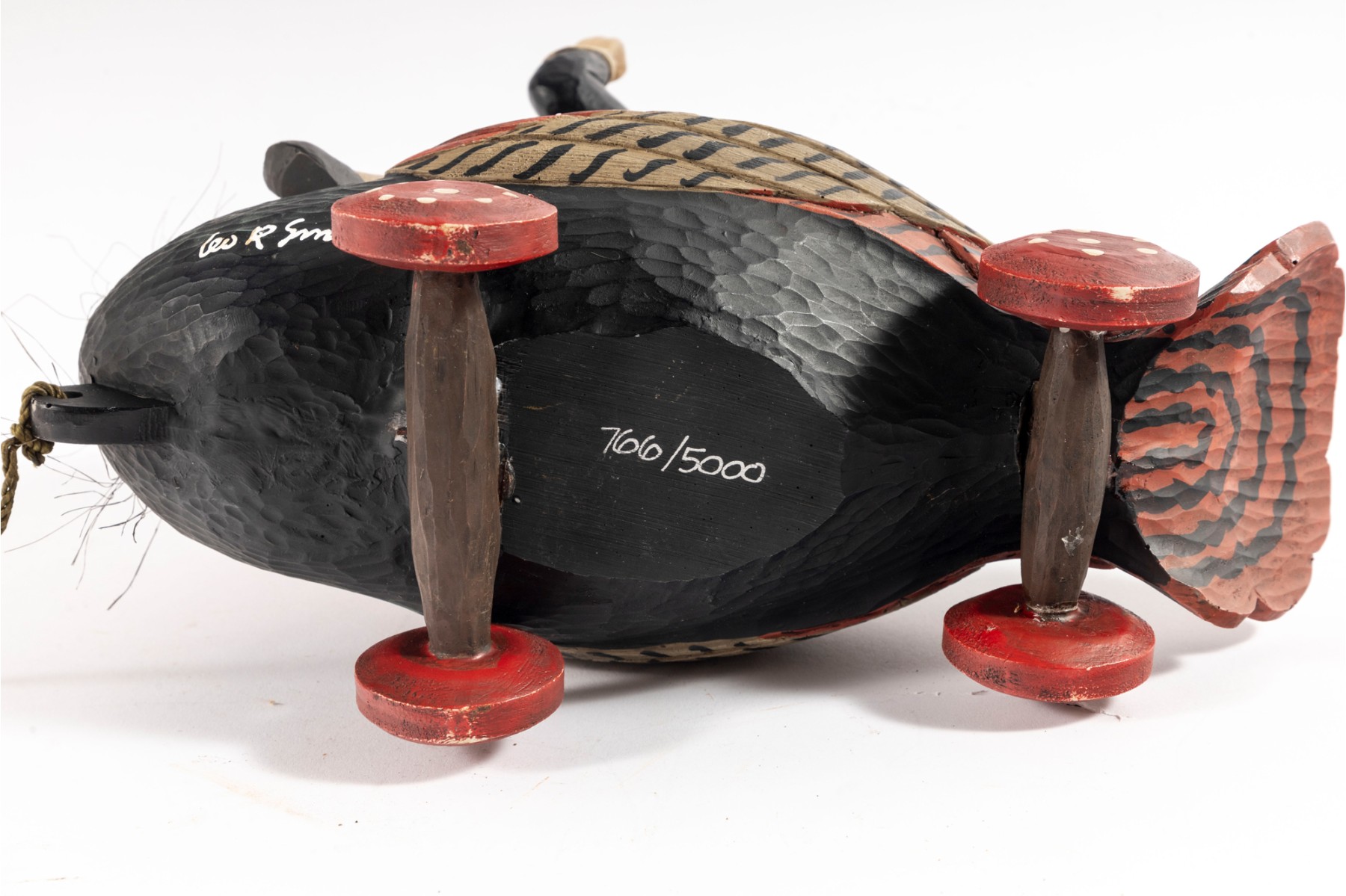 A limited edition Leo R. Smith woodcraft toy sculpture, hand-carved and painted in the form of a Pilgrim riding a turkey. Edition 766 / 5000, signed.