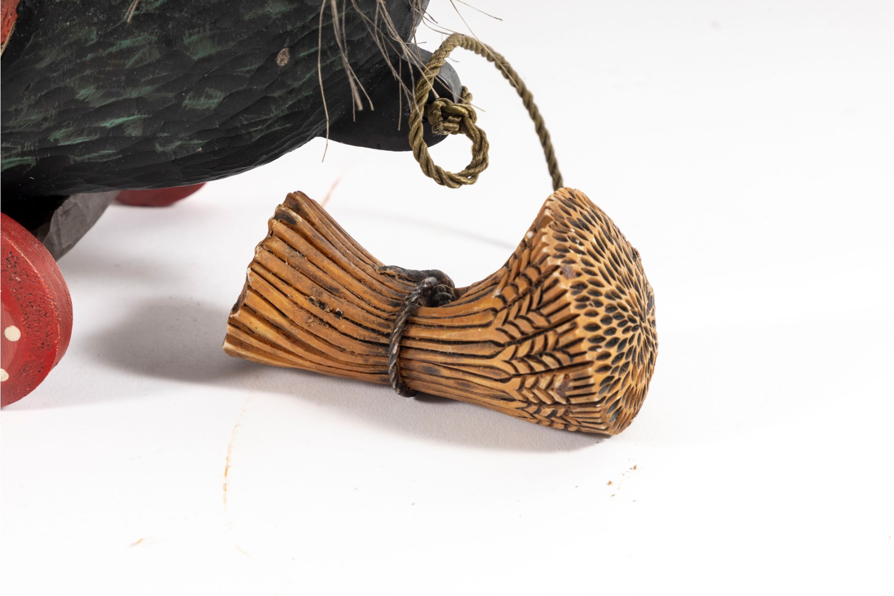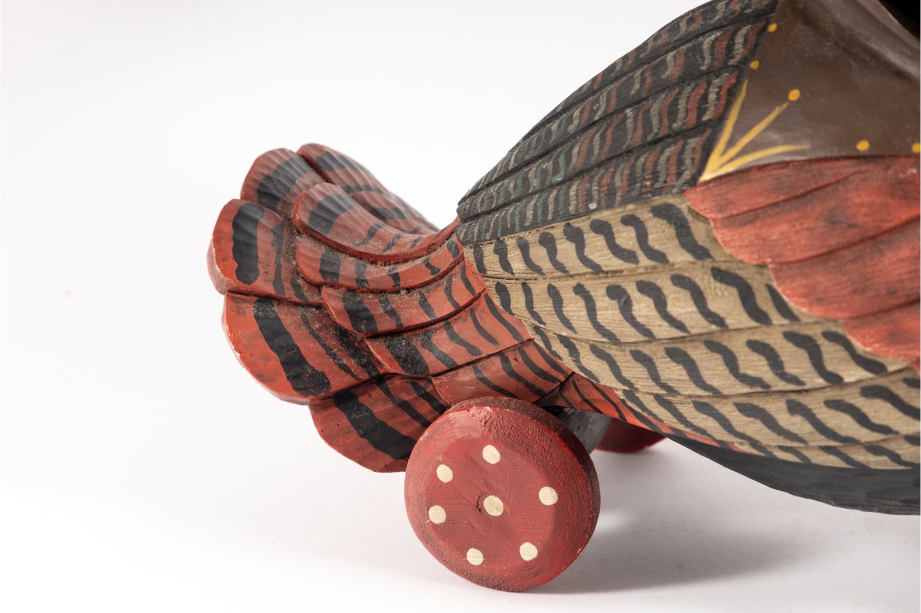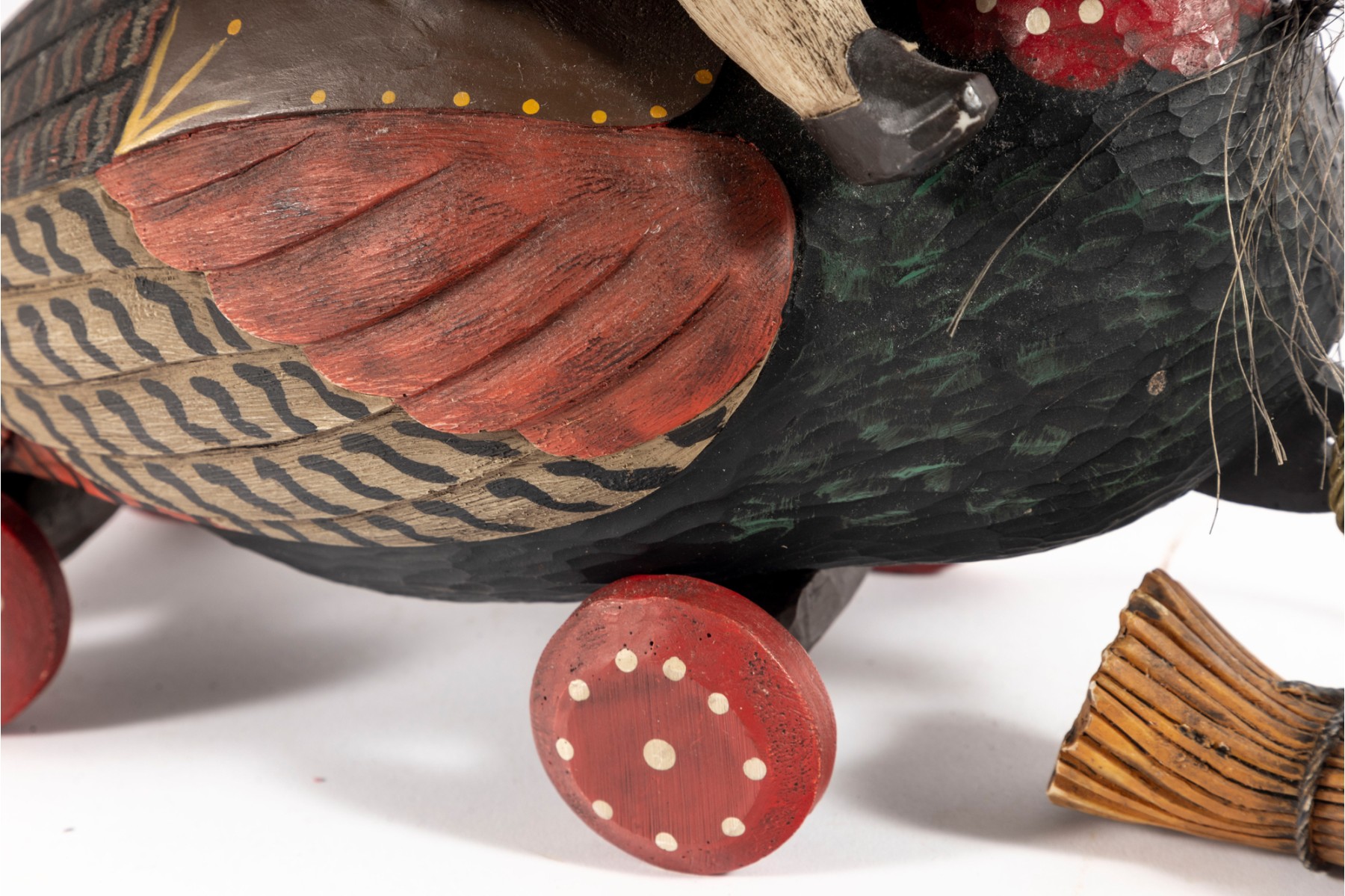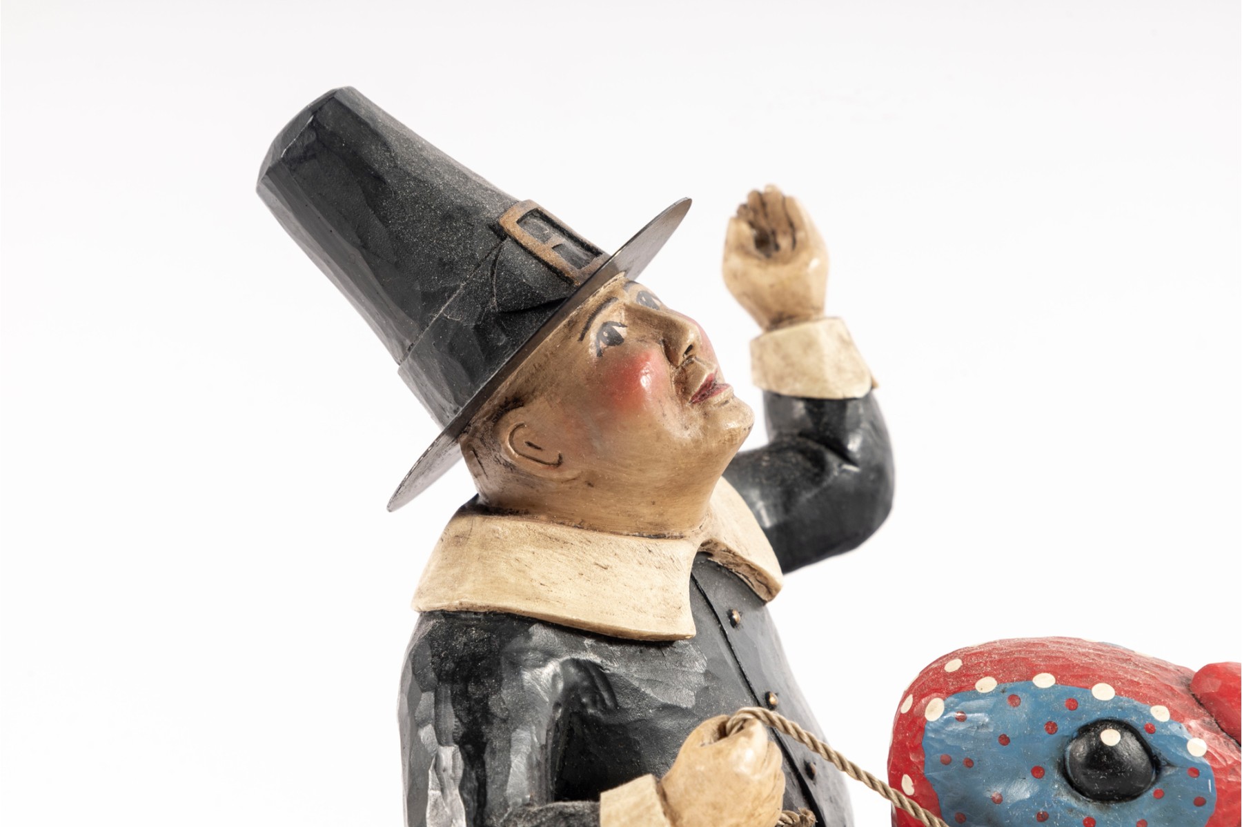 A limited edition Leo R. Smith woodcraft toy sculpture, hand-carved and painted in the form of a Pilgrim riding a turkey. Edition 766 / 5000, signed.
